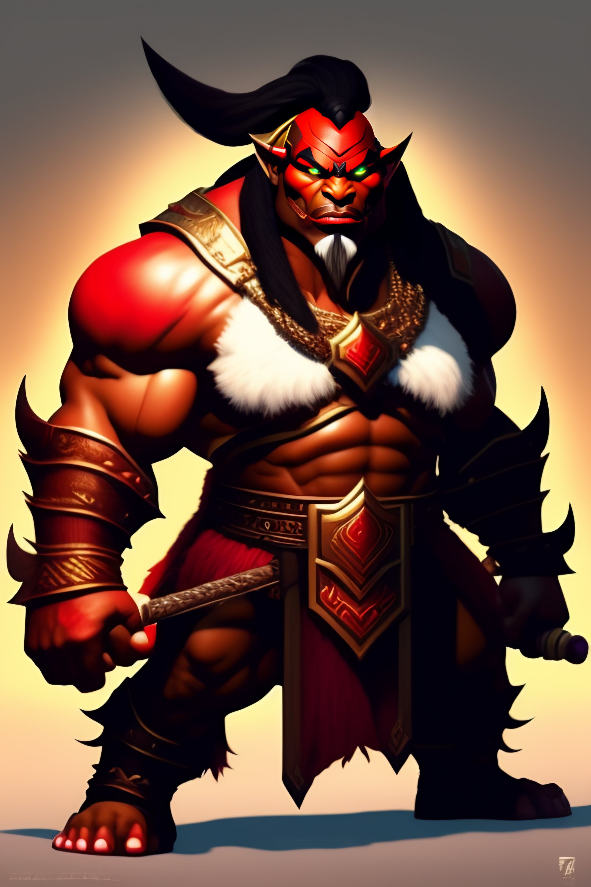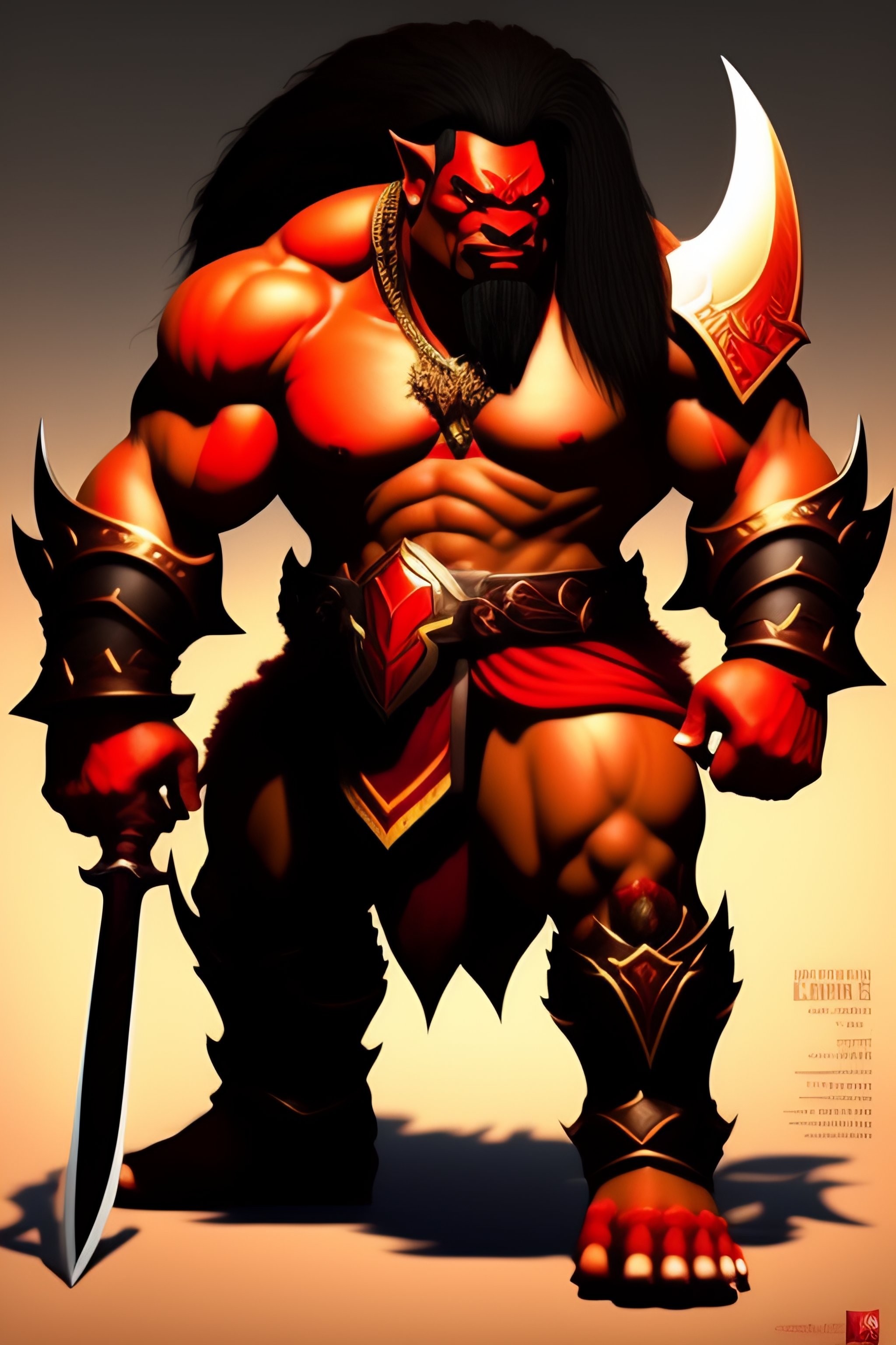 Mogul khan "the axe" from dota 2, a literally crimson red skinned orc like character with black hair wielding a big axe. he is quite top heavy and has small legs