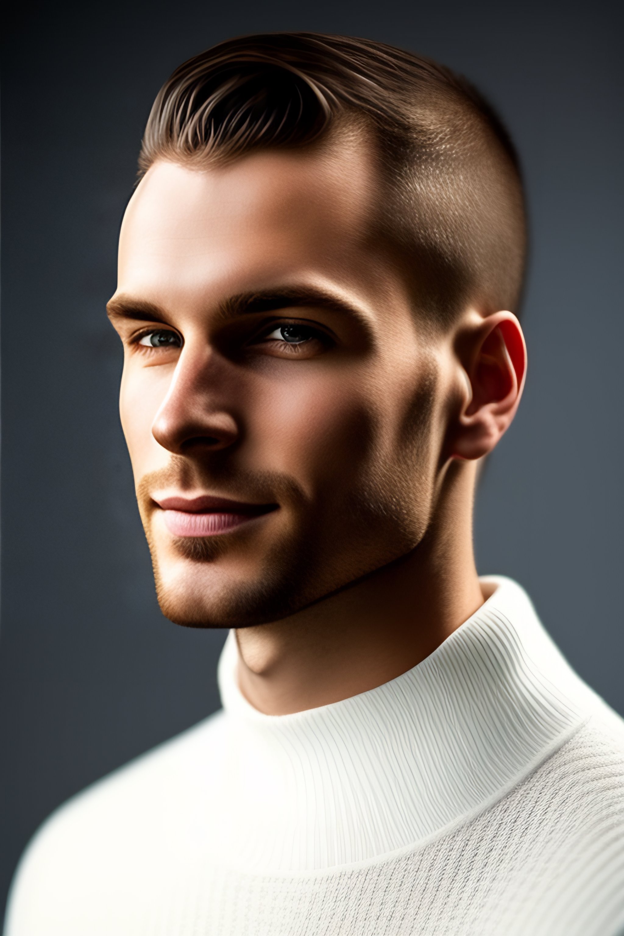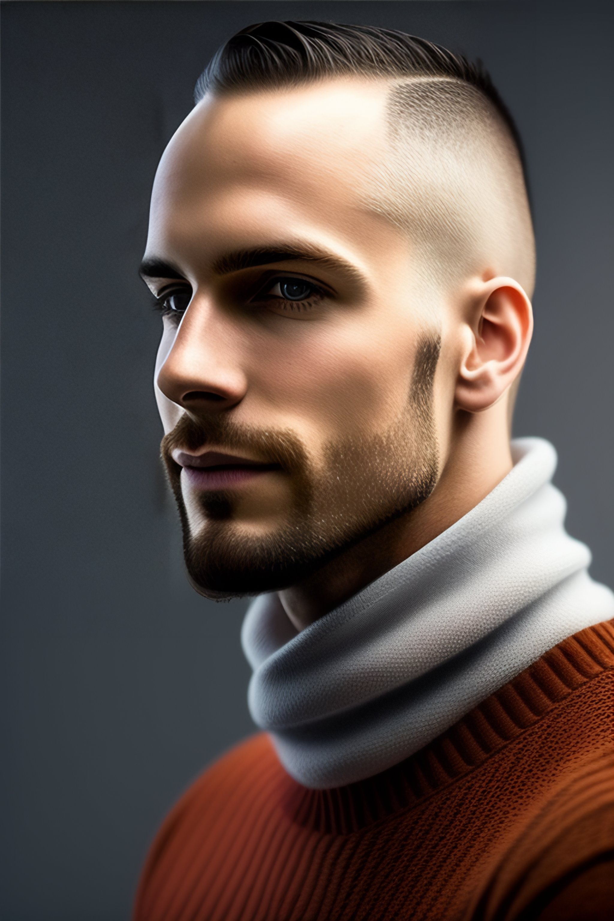 Dutch male software engineer 30 years old completely shaved head slight stubble wearing sweater