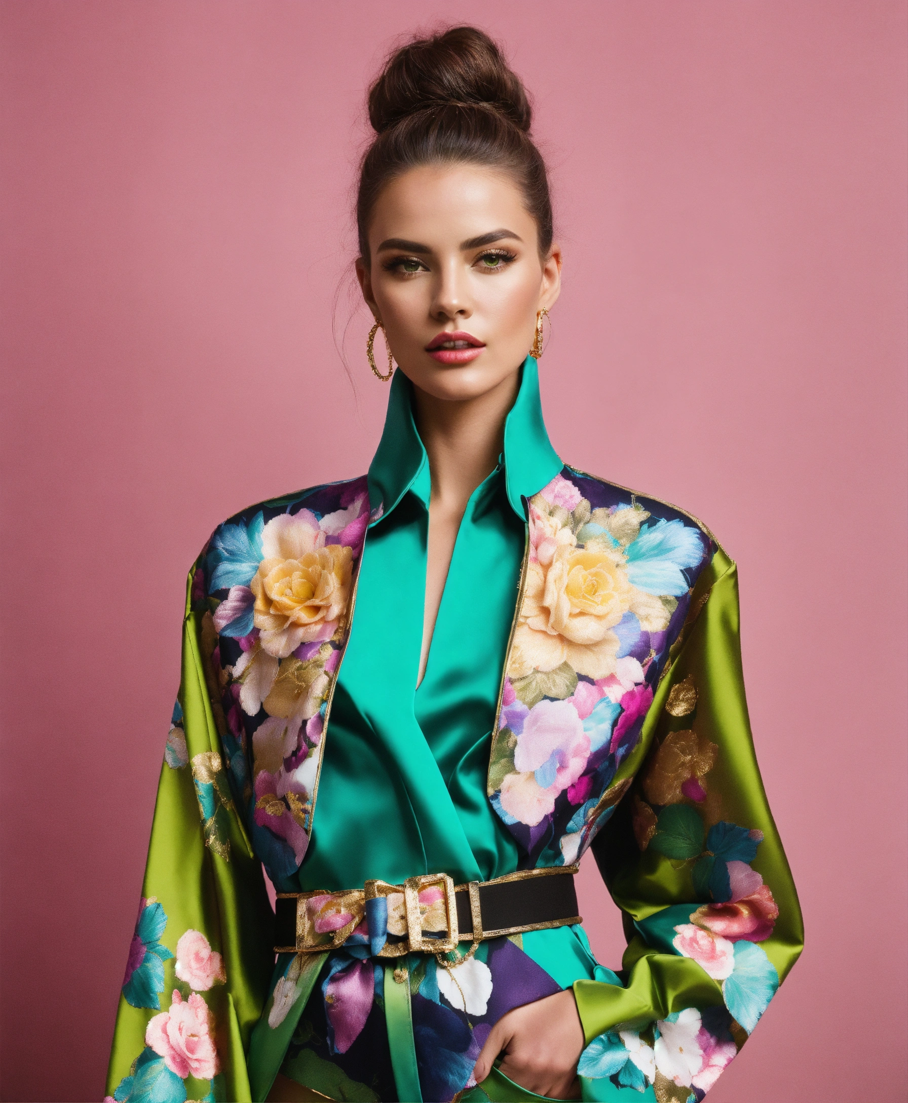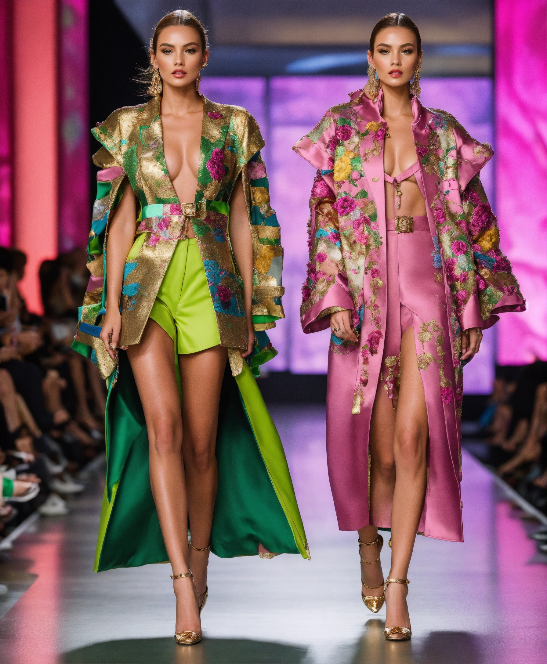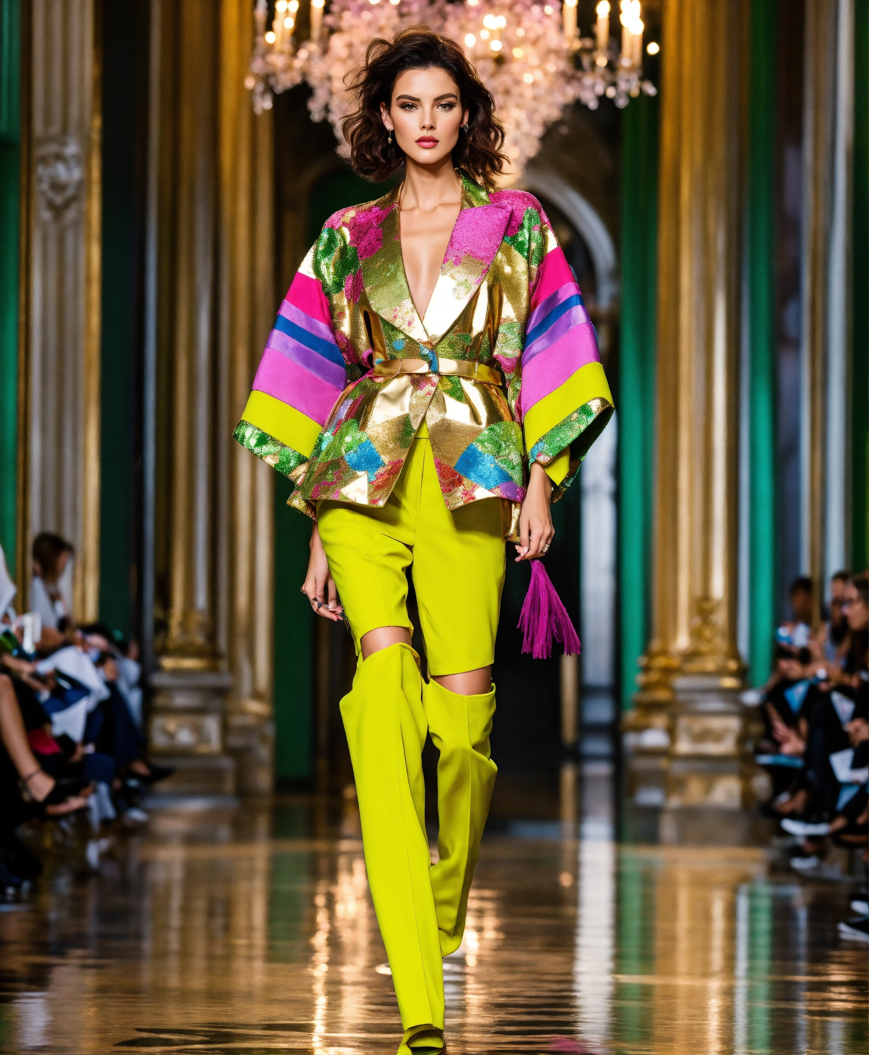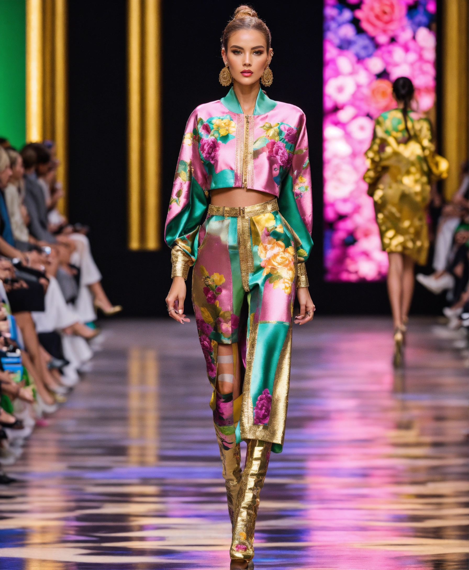Ultra realistic full body photo of a trendy edgy german model walking the runway modeling summer designer novelty interesting complex unusual street sporty classy modern dolman sleeve outfit brave, paris versailles details cutouts and and gold geometric pattern floral structured tailored jacket pink gold green lilac peridot silver magenta lime fuchsia yellow blue black gray copper mauve bronze haute couture ultimate elegance cutouts beautiful luxurious awesome wealthy detailed opulent amazing divine resplendent magnificent sublime 12k