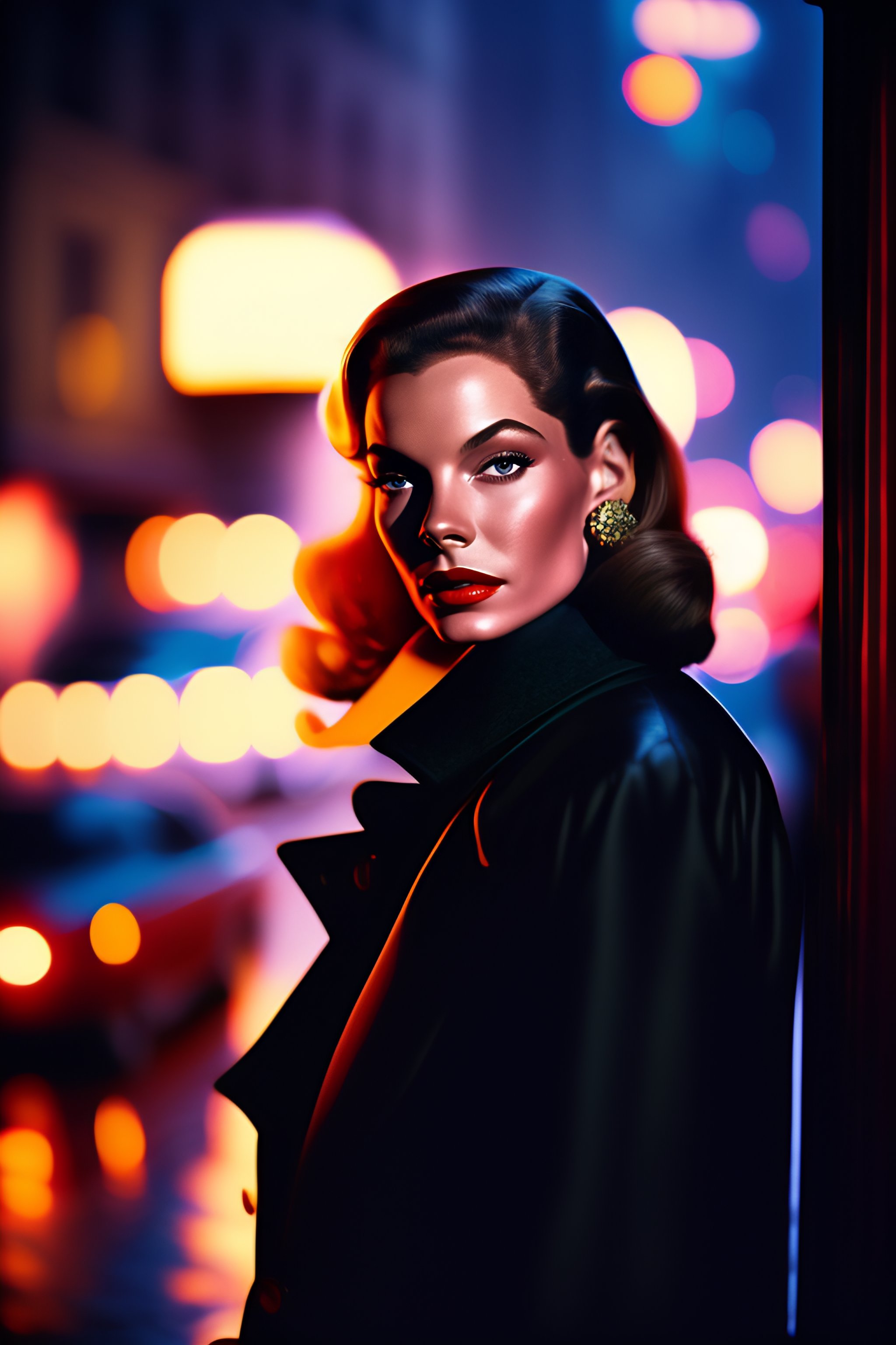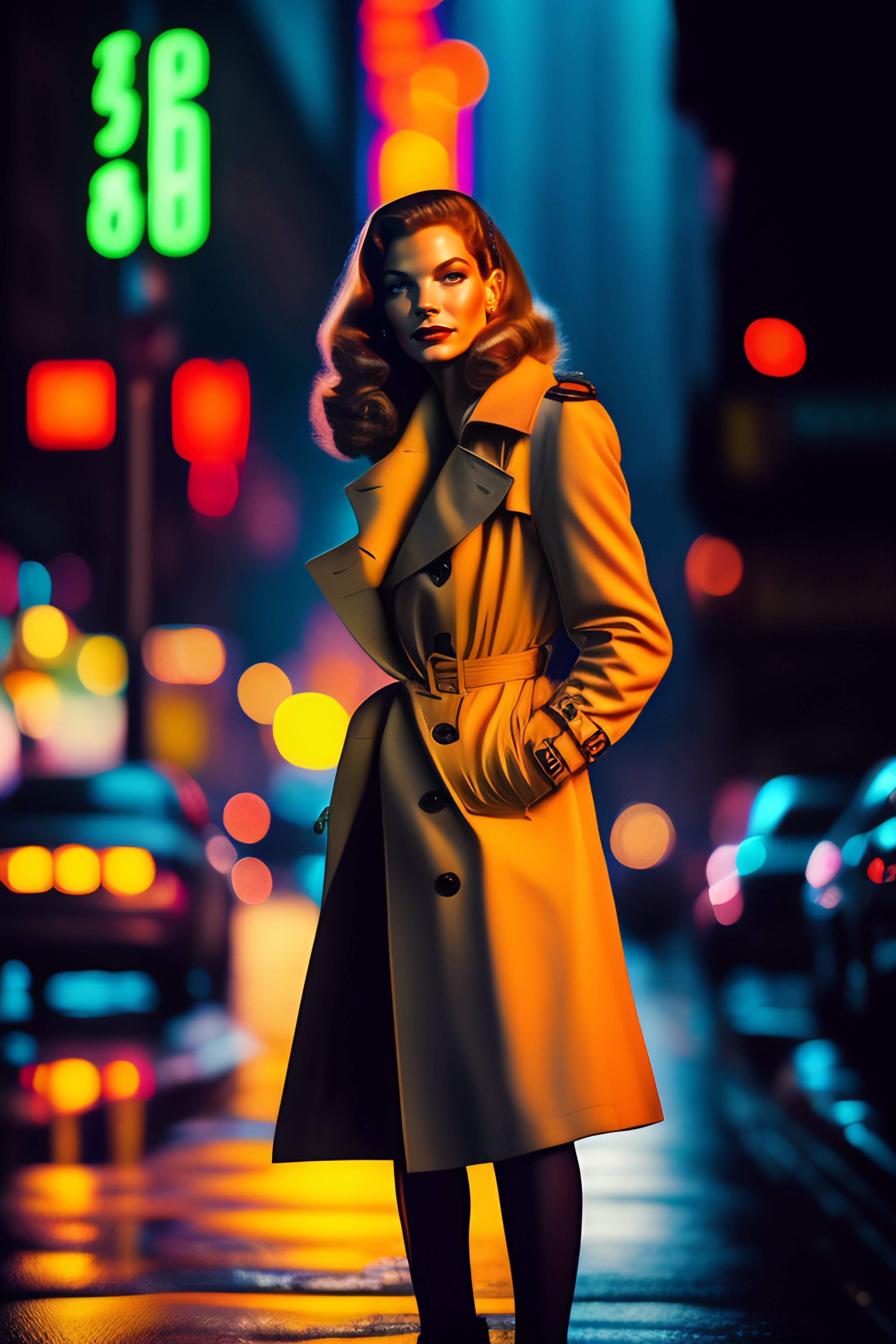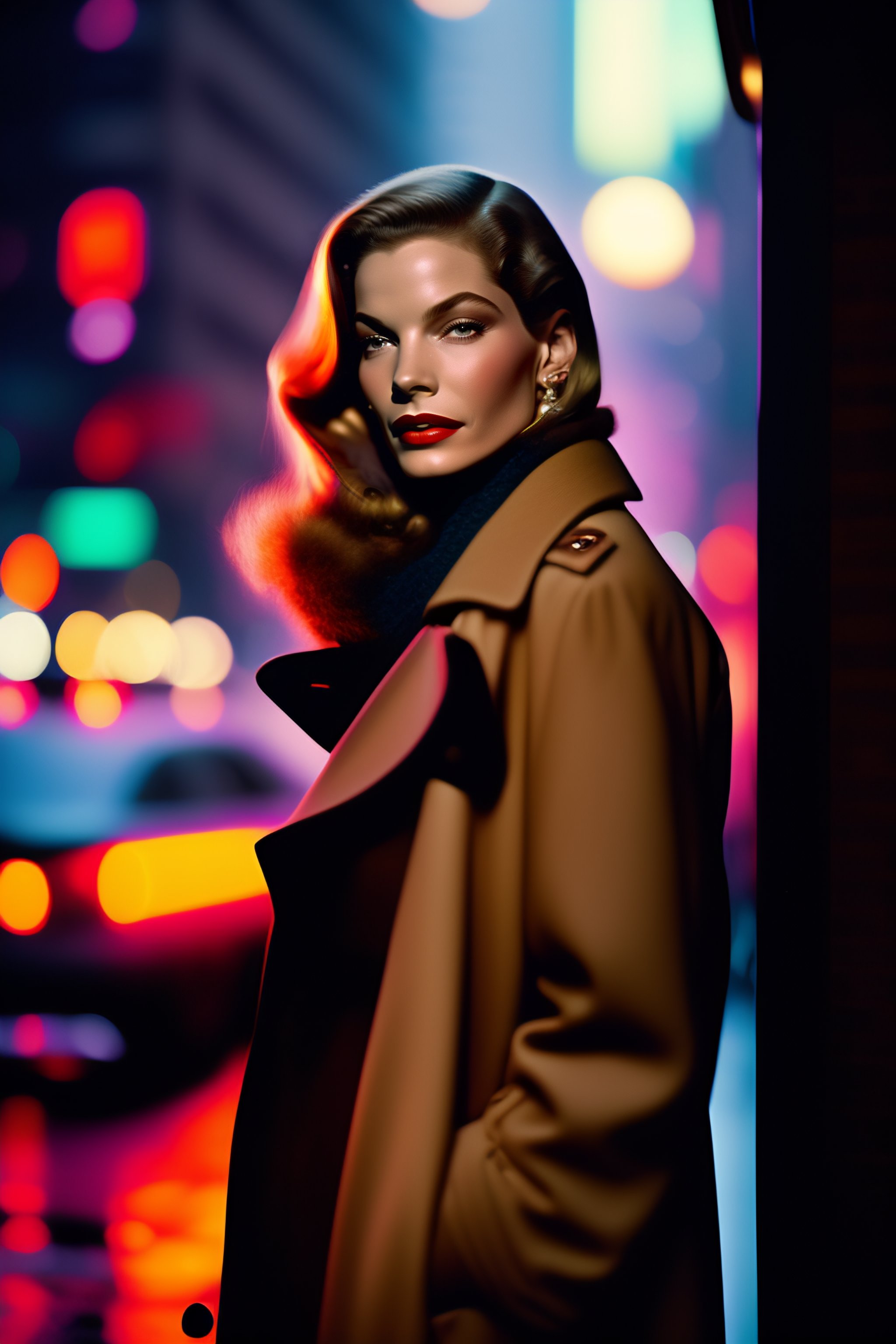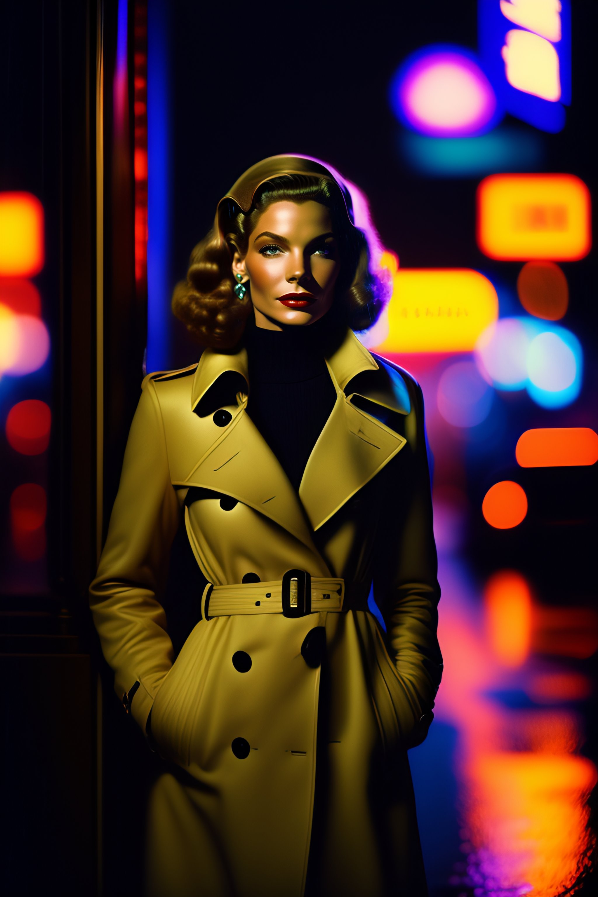 Portrait of a young lauren bacall, 1947, wearing a trench coat on a rainy late night in the city, illuminated only by city lights, neon glow, wet street, neon reflections, 85mm lens