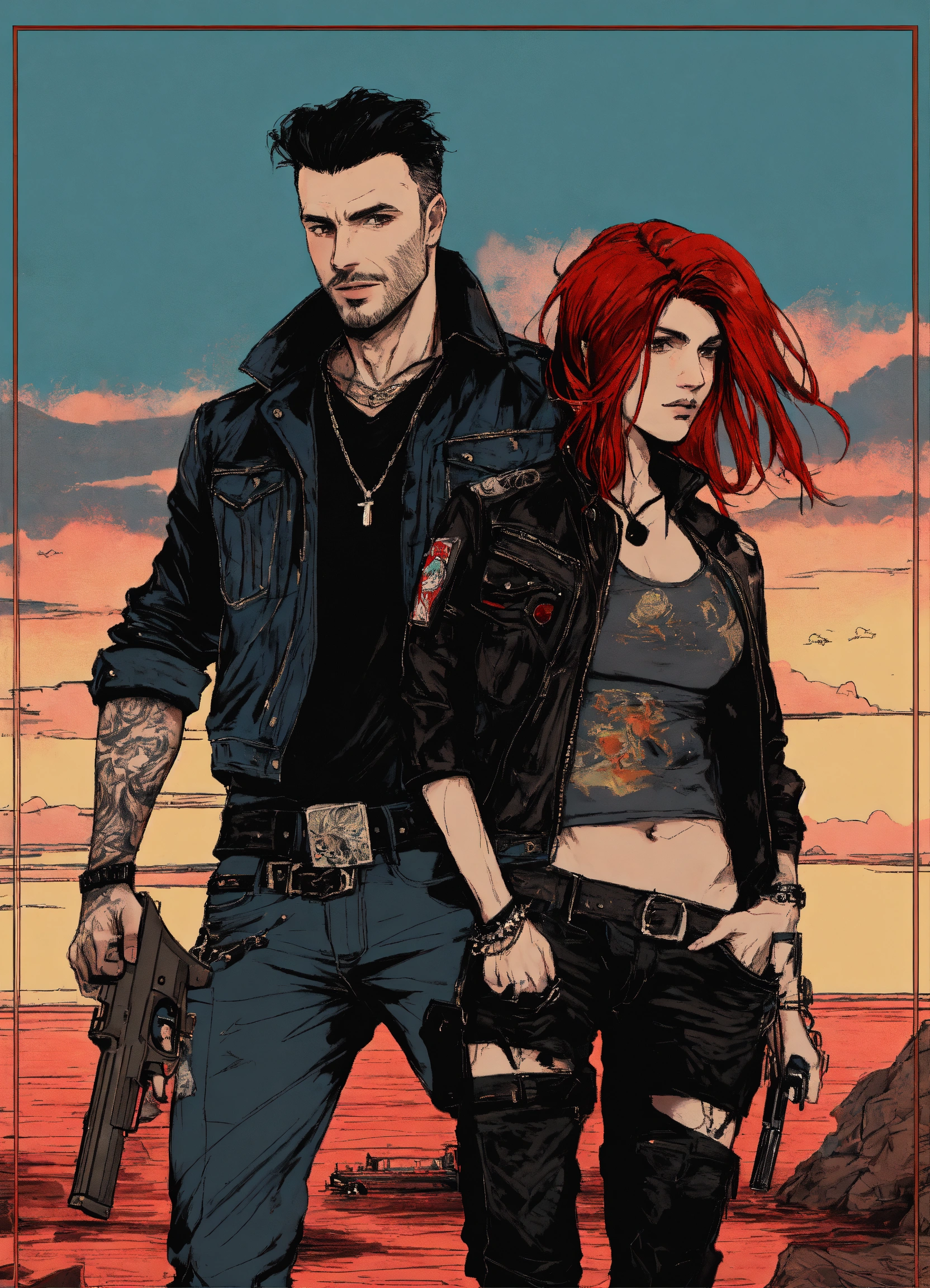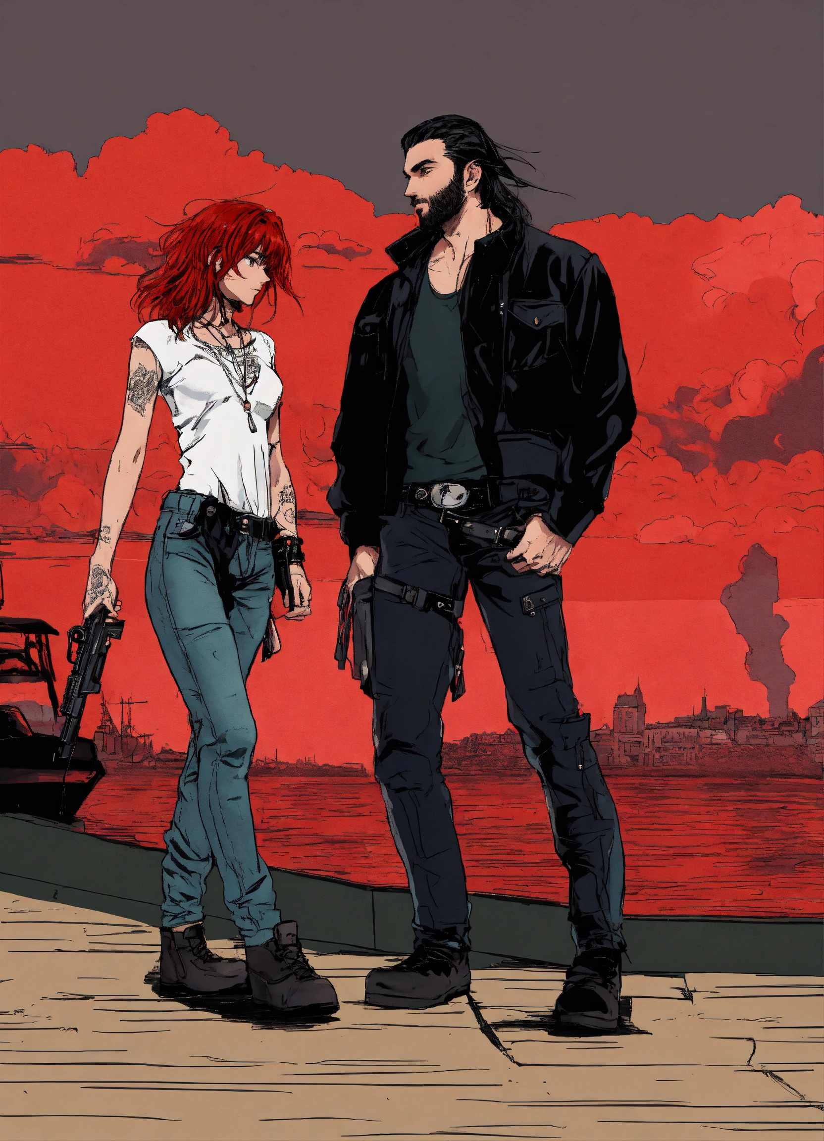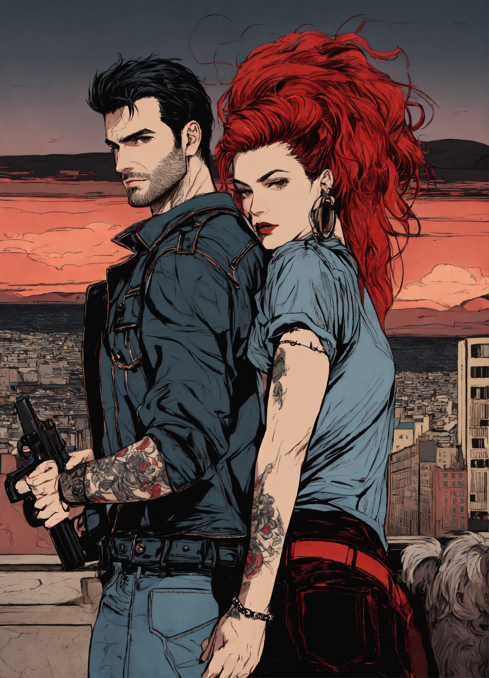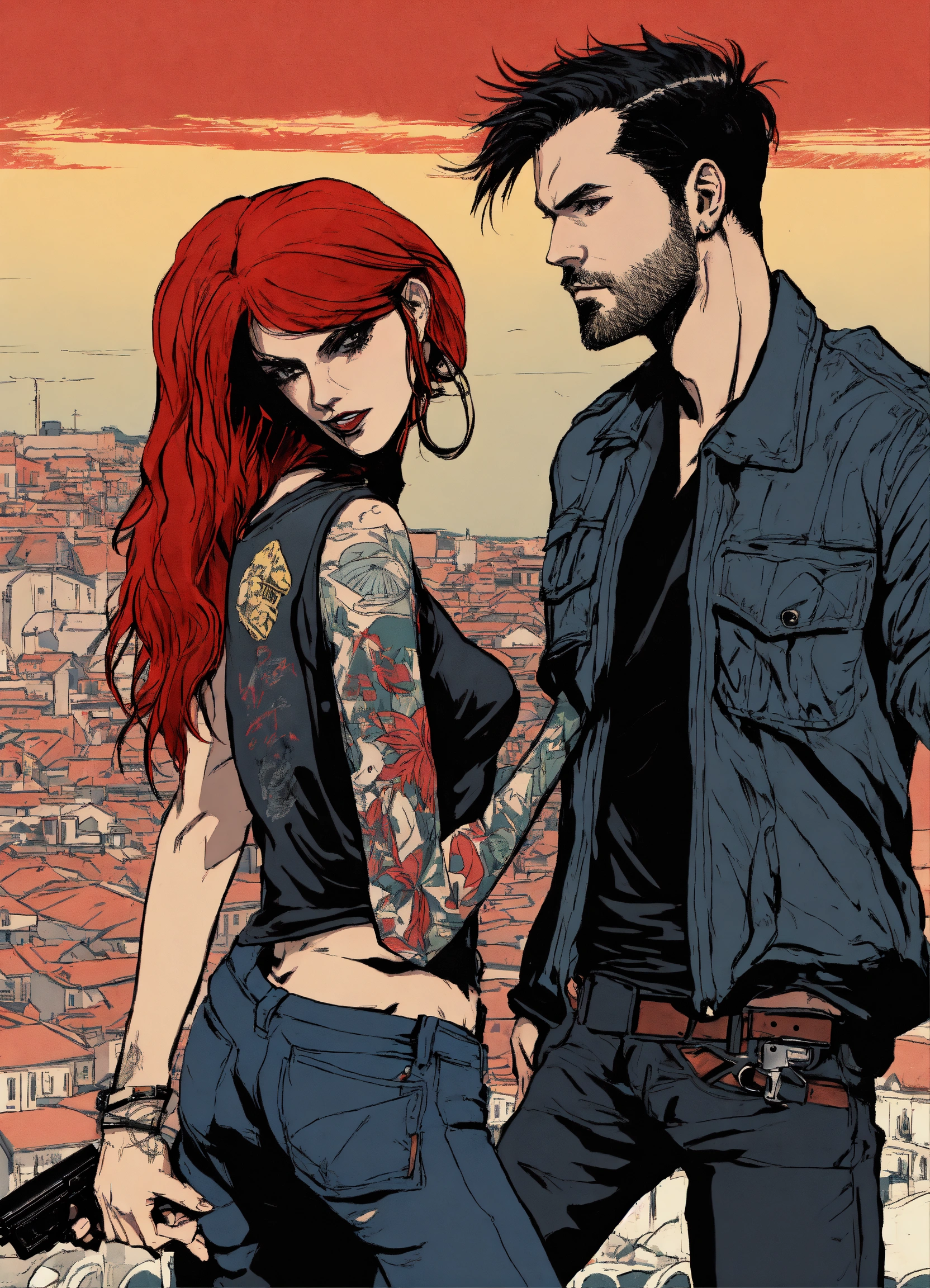 Punk style dark drawing, nice baie des anges in the background and a black hair handsome man in his late thirties is wearing a handgun, and holding the hand of a red hair woman wearing a pair of jeans and a long shirt.