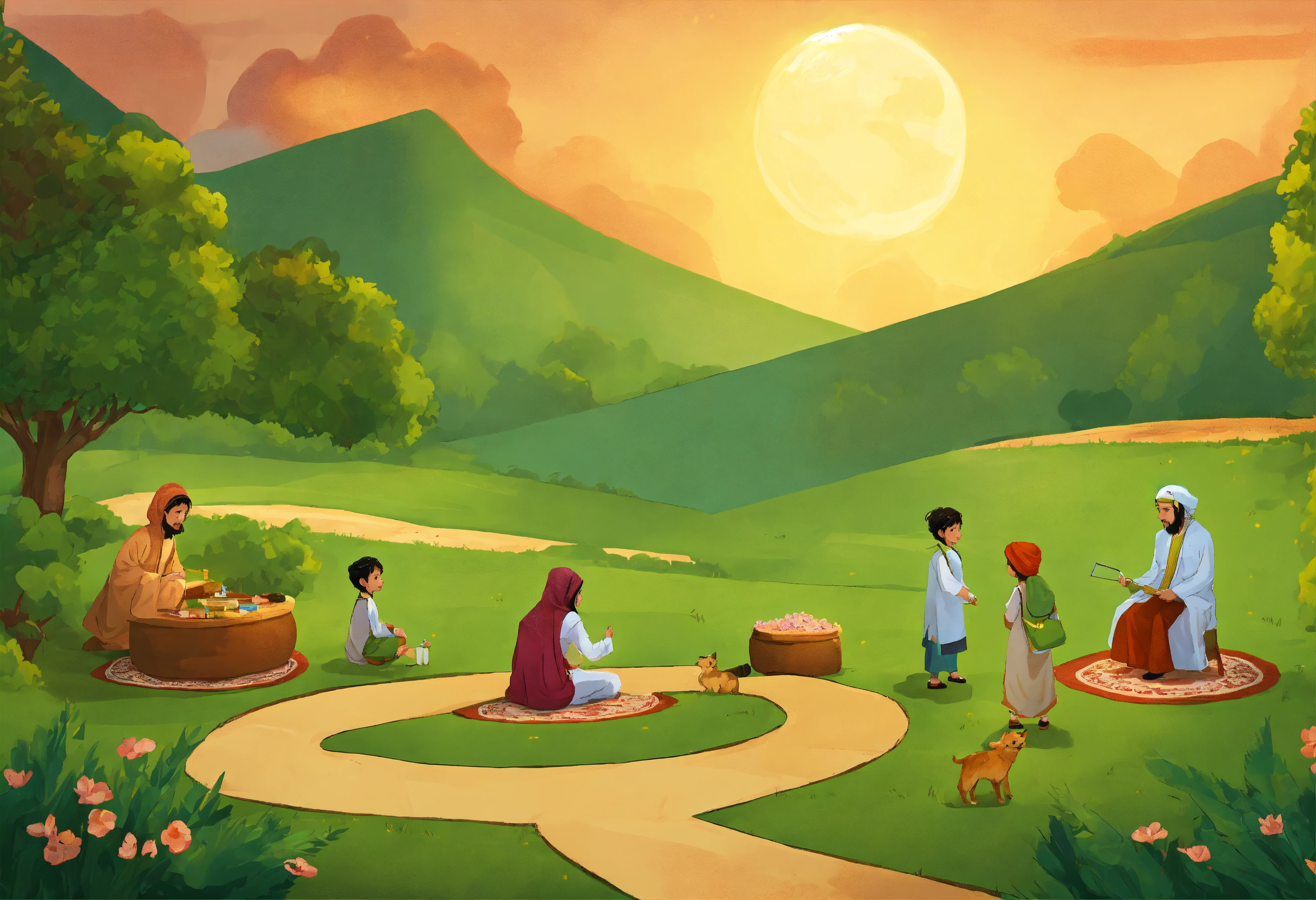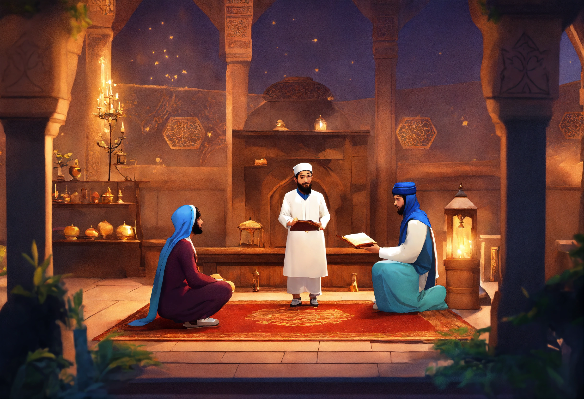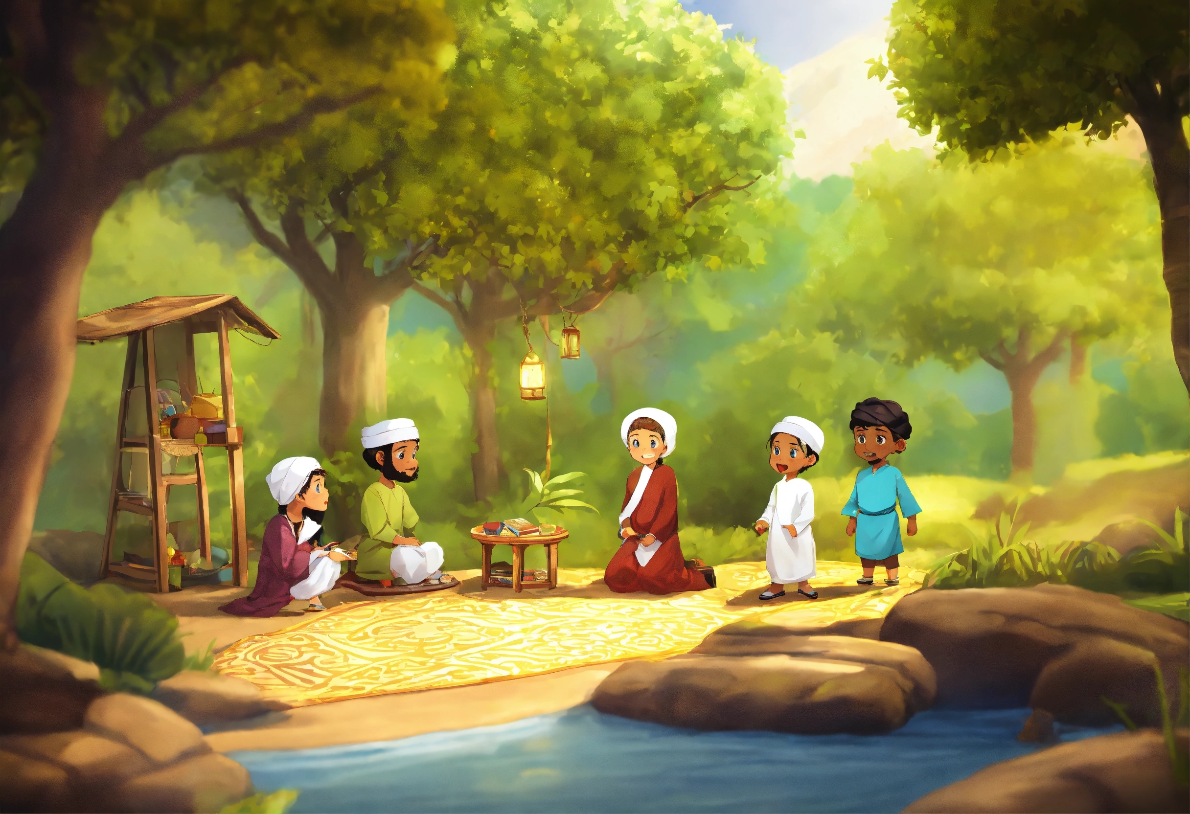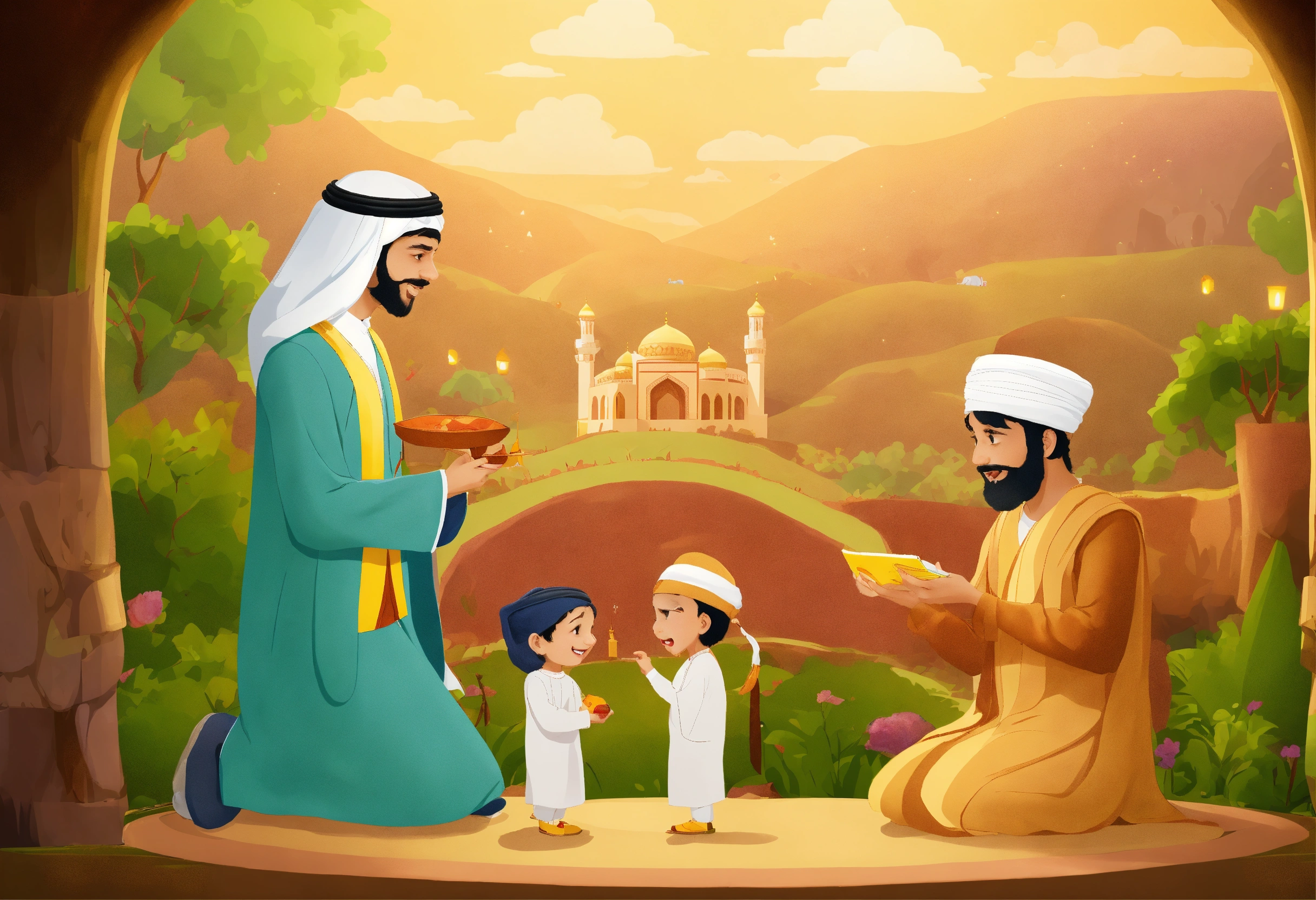 Scene 9 storytelling for moral values prompt create a visual representation of islamic story telling, where stories are shared to teach moral values. show an engaging and captivating story telling setting..