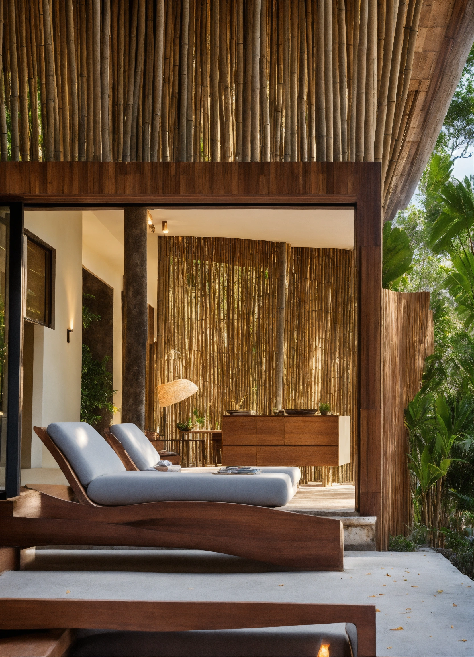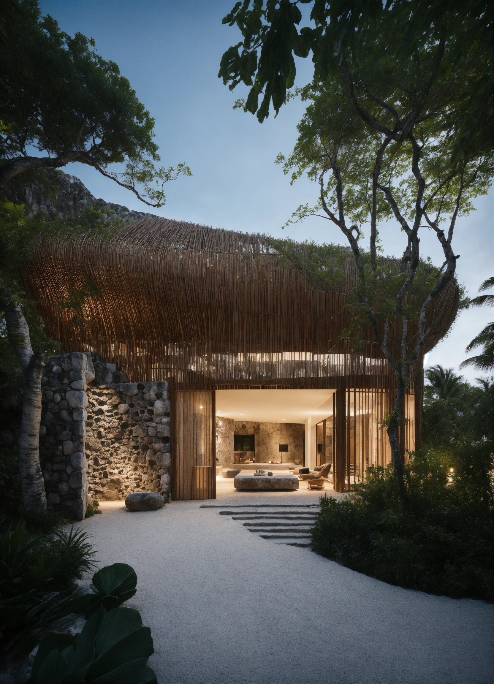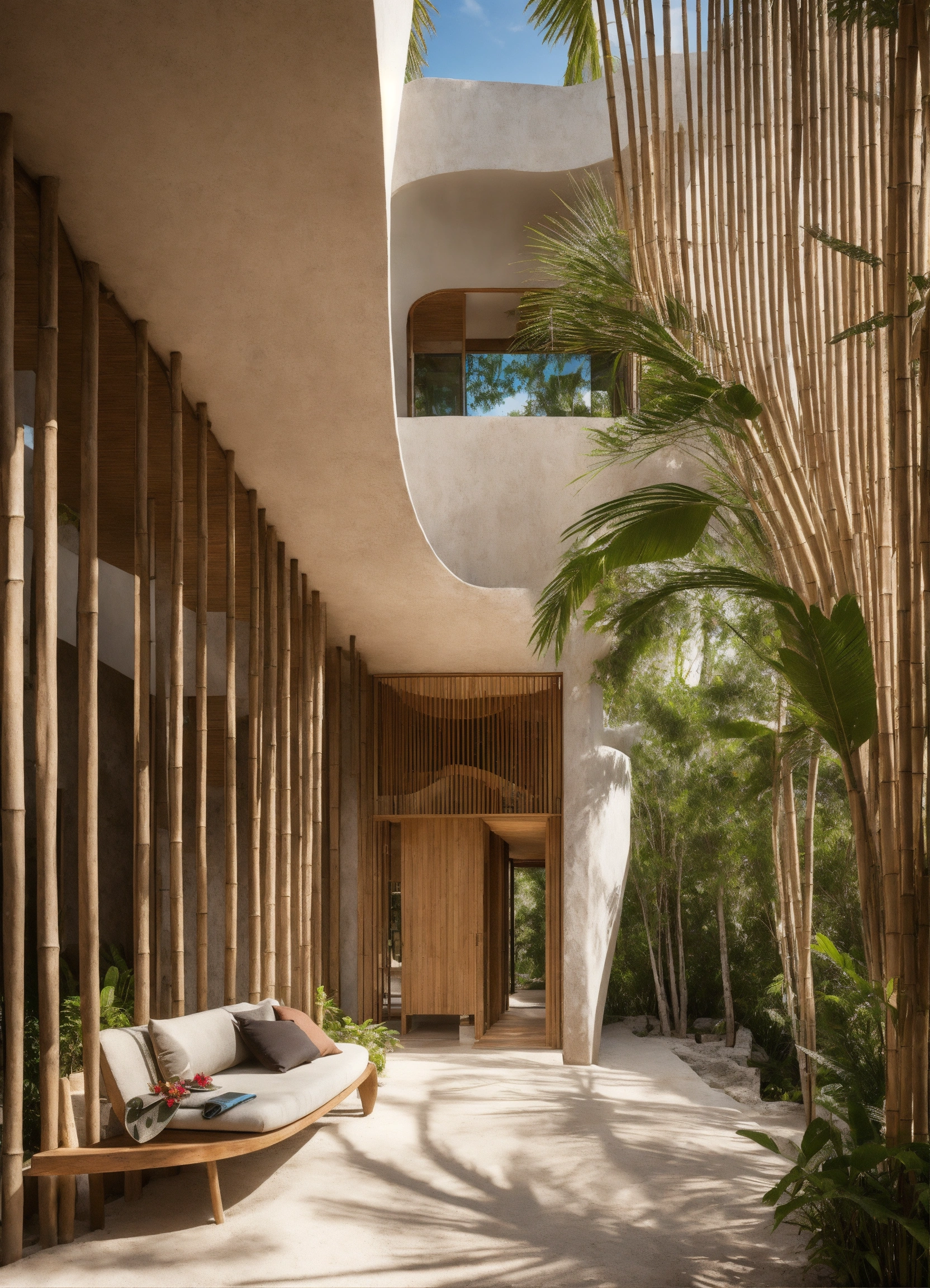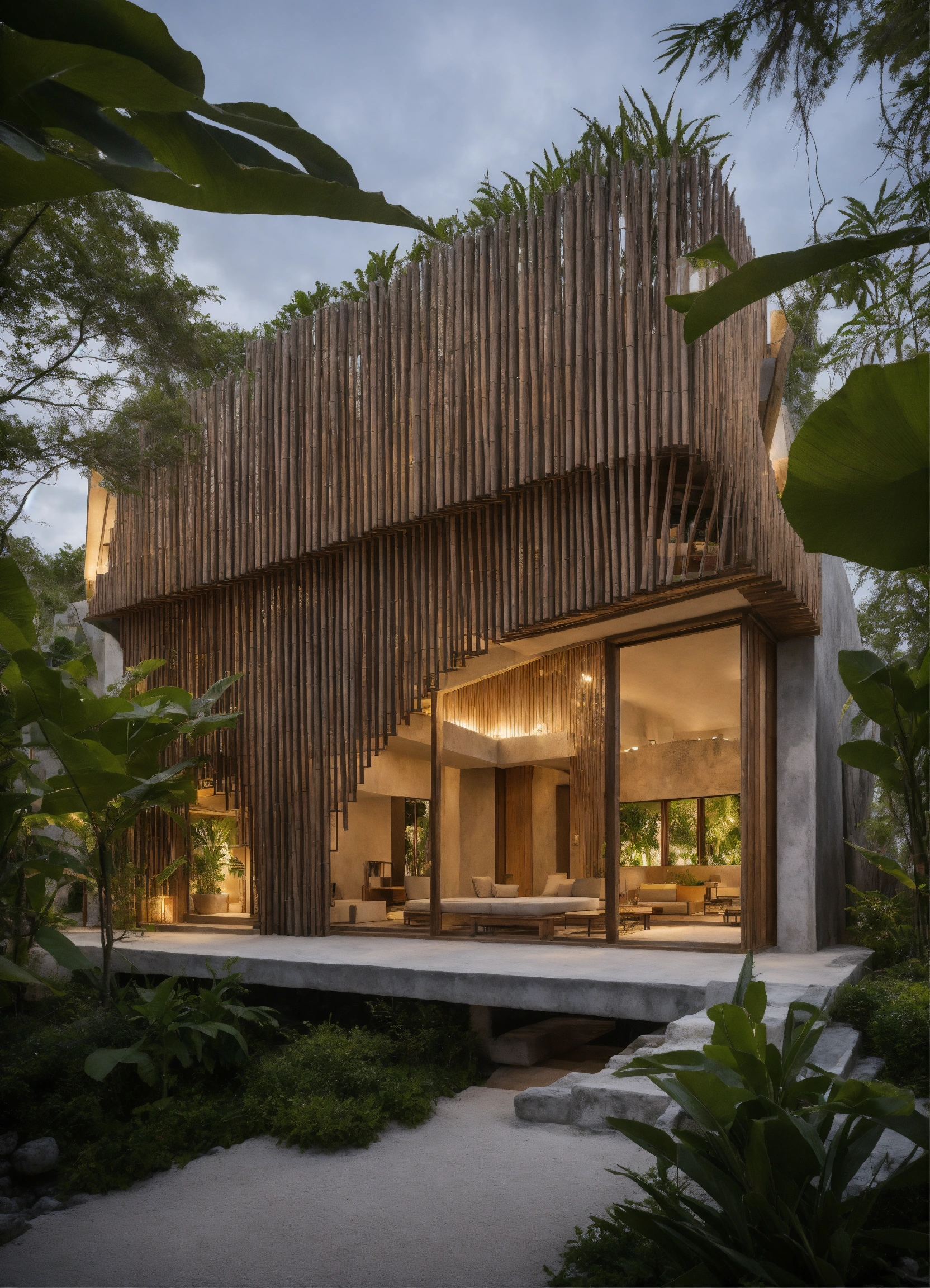 Envision a zaha hadid-styled, environmentally-conscious villa nestled within the bustling modern architecture of tulum, quintana roo. as you approach from the entrance, the street view reveals a facade adorned with a vertical bamboo lattice, gracefully contrasting with the stone finish. large overhangs hint at the interior's coolness, and the surrounding trees whisper tales of nature's embrace.