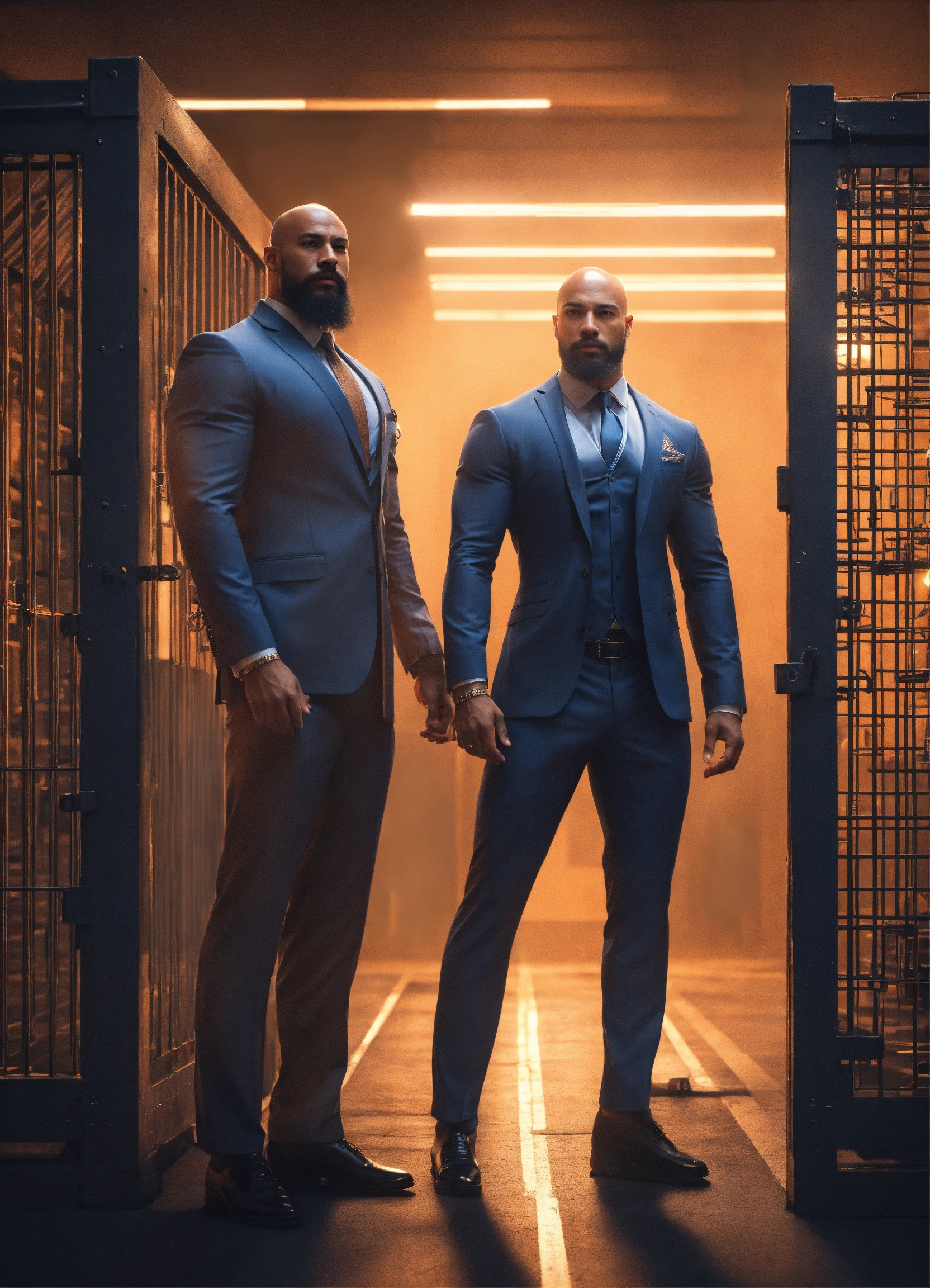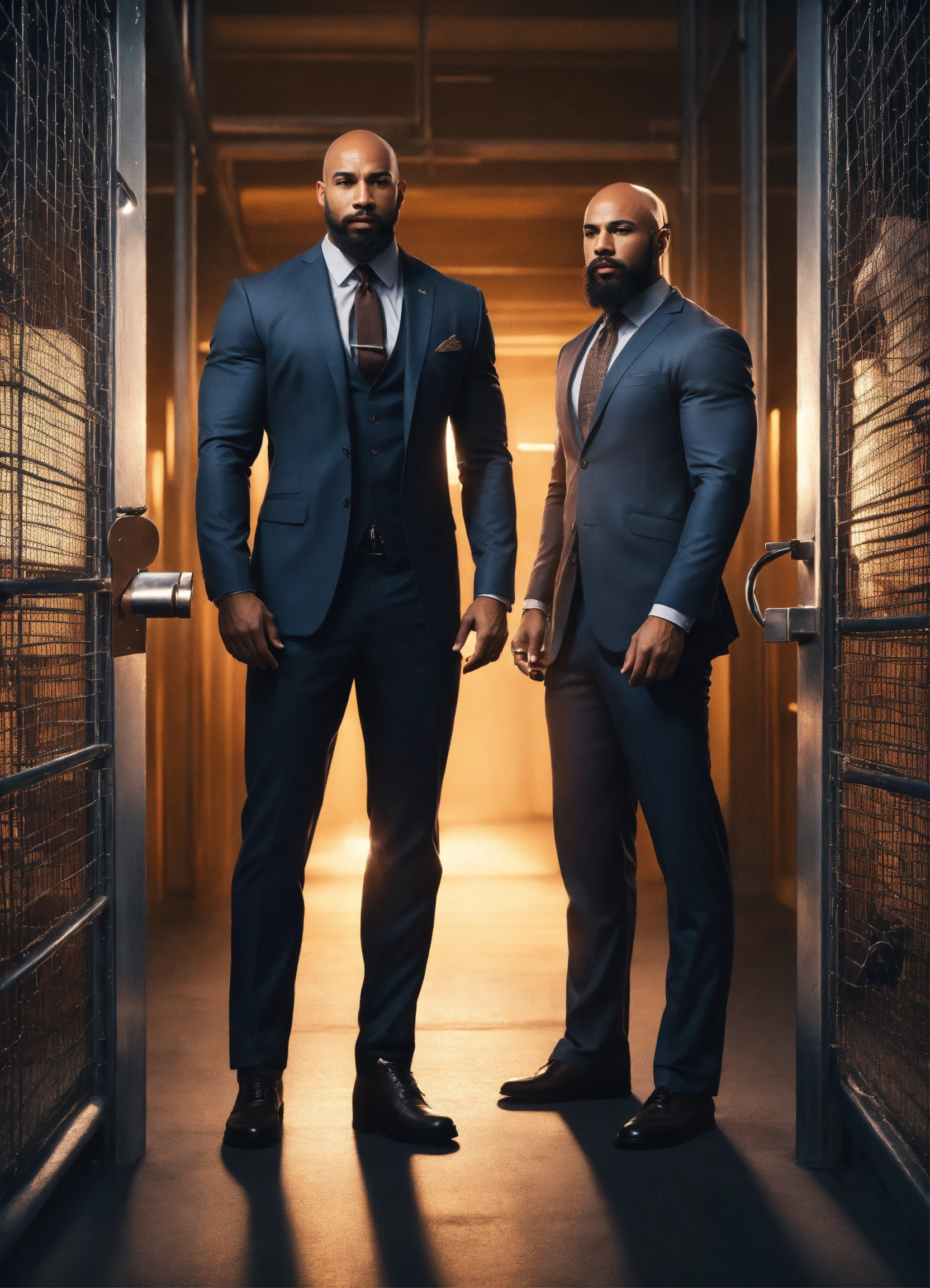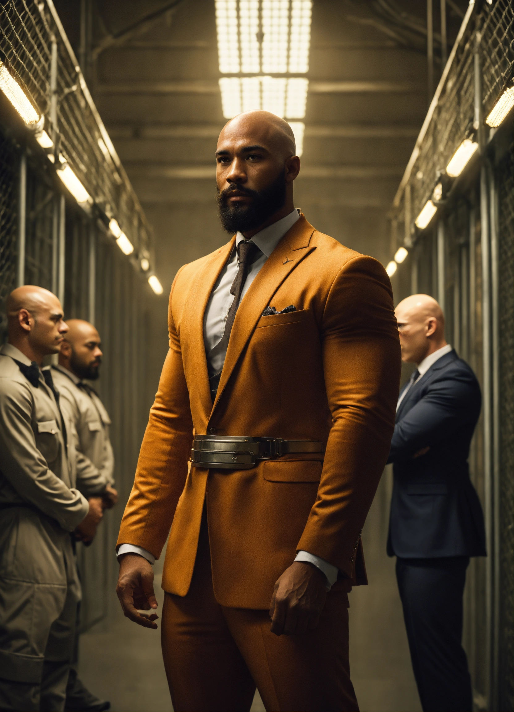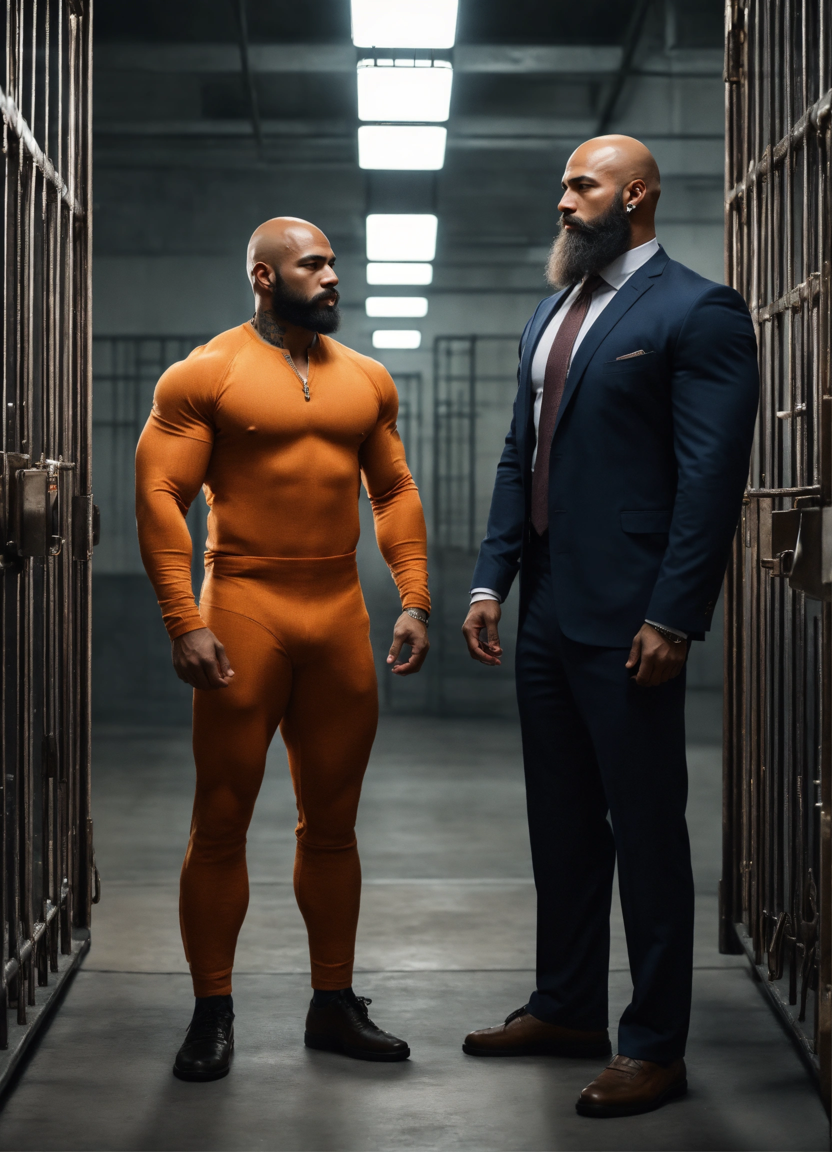 Bald well groomed bearded man, a strong muscular handsome mixed race black god wizard with light brown skin, a strong handsome god with a bald head and short beard, muscular physique wearing a business suit, standing next to a handcuffed male prisoner in a futuristic prison resolution 8k, insanely detailed