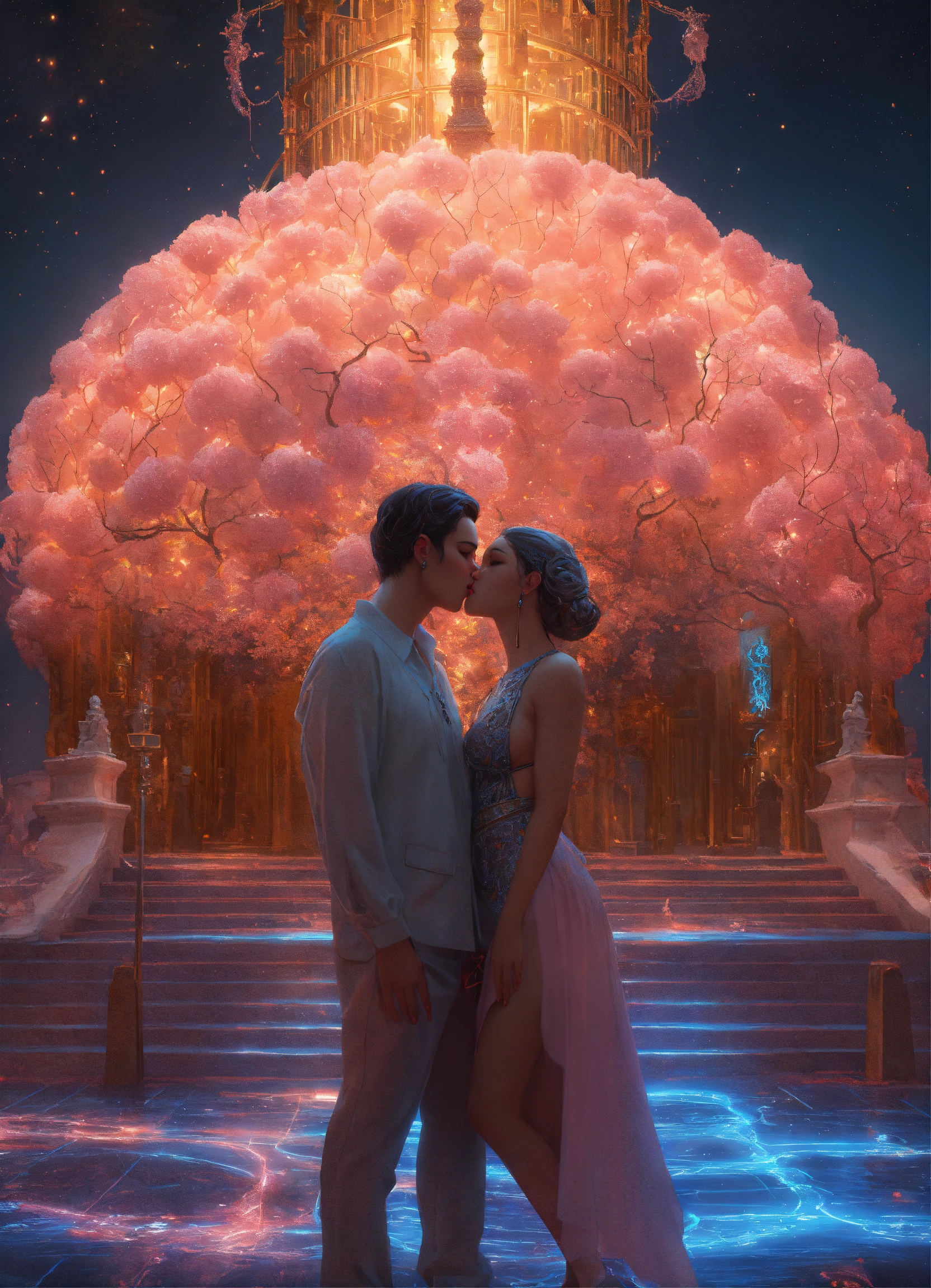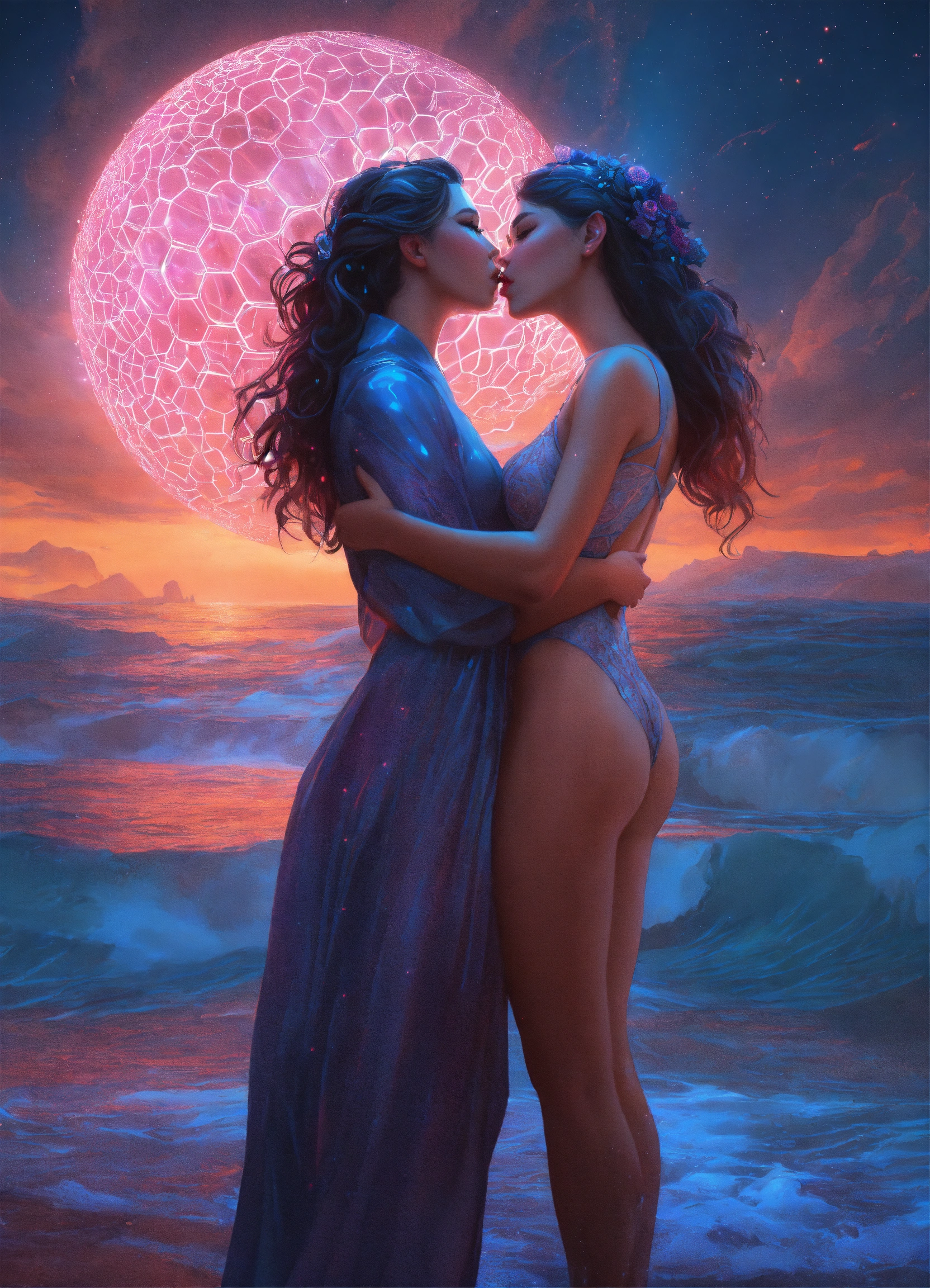 Lesbian kiss, tower goddess, two, intricate fashion, primordial, by wlop and mandy jurgens, surrounded by the night sky, universe, intricate, elegant, scenic, hyper-realistic, 8k resolution, maximalist intricate, sci-fi, 3d render, ethereal, divine starry jellyfish, starlight, mythical, gorgeous fantasy, intricate and ornate details, full body, realistic, digital painting, artrender, intricate dreamy artwork, hyperwave, concept art portrait by casey weldon, fantasy concept art, 8k resolution, bioluminiscent, intricate artwork by tooth wu and wlop and beeple. octane render, greg rutkowski, very coherent symmetrical artwork, cinematic, diversity, mythology, soft kiss