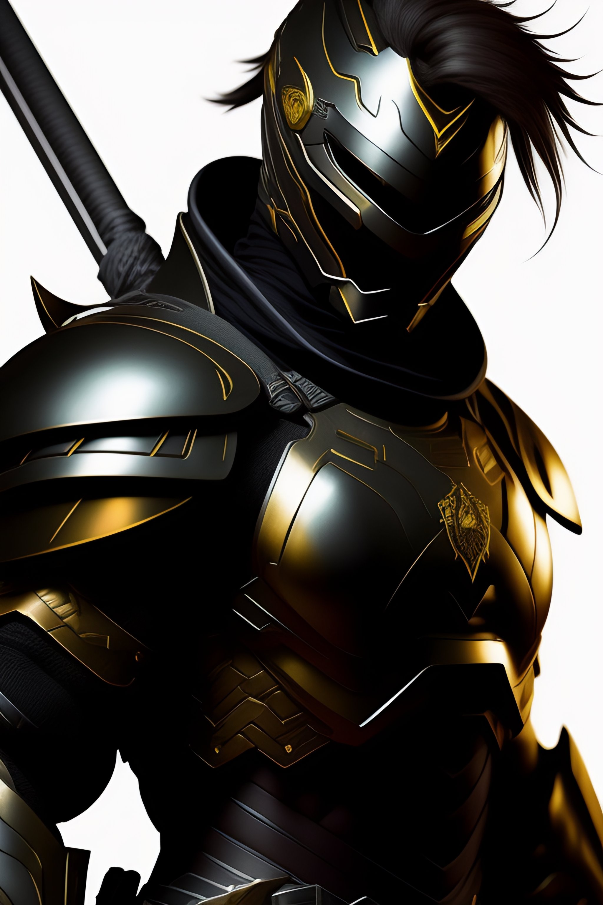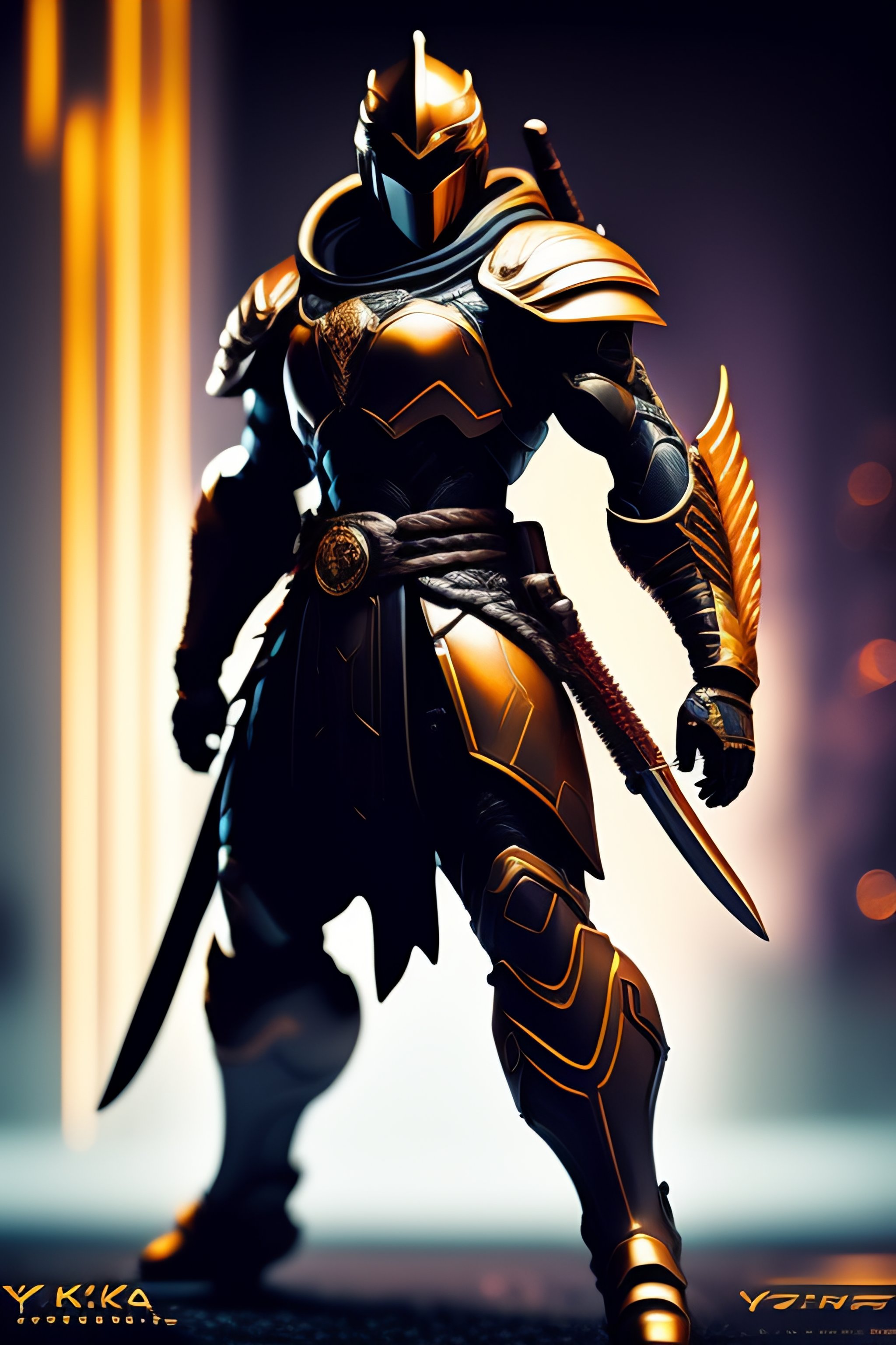 In the style of yoji shinkawa male cyborg ninja with spartan helmet with long katana