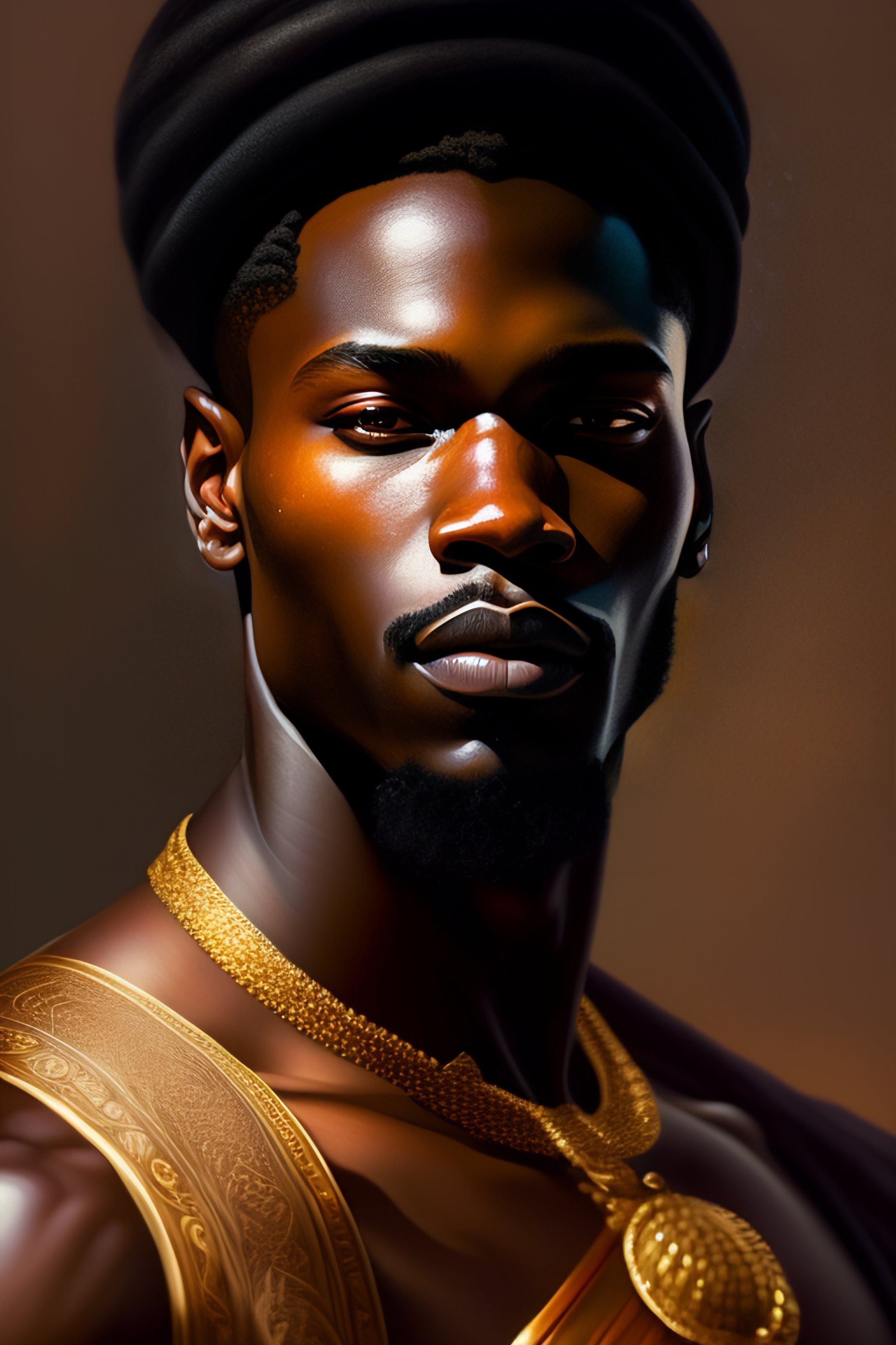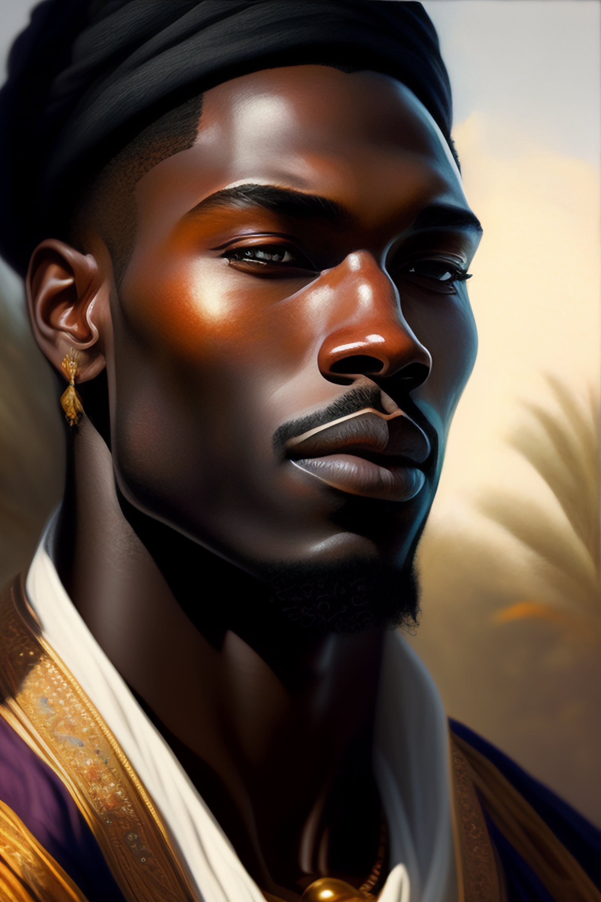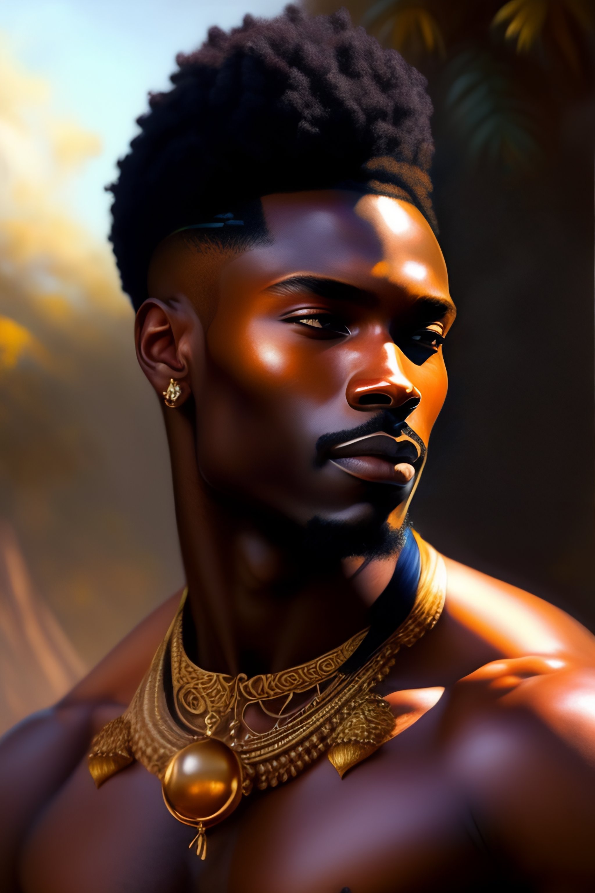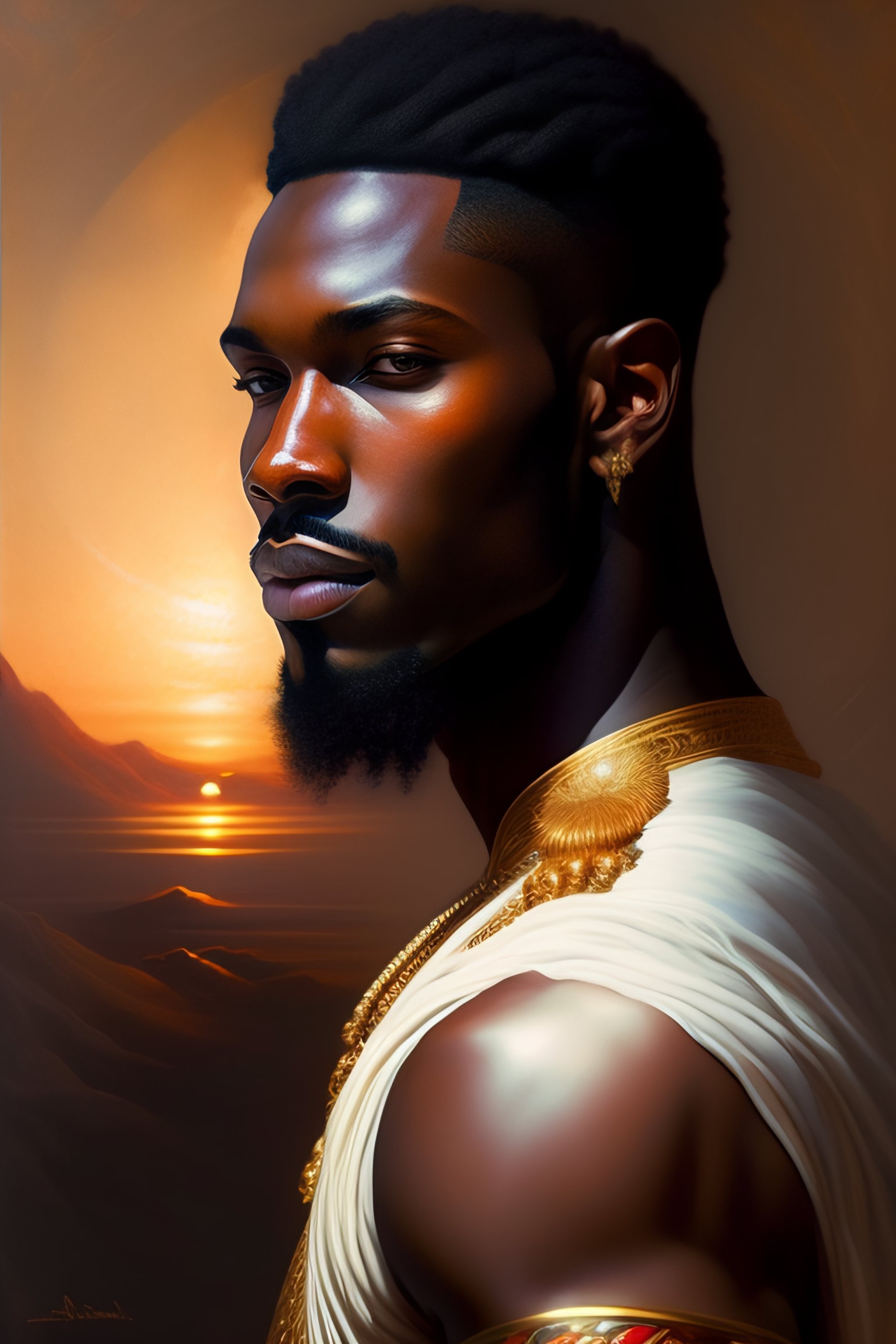 A painting depicting a beautiful african man, god like, by greg rutkowski and albert bierstadt and leonardo da vinci, beautiful, intricate, ultra realistic, fantasy, sharp focus, elegant, detailed scene, art by artgerm
