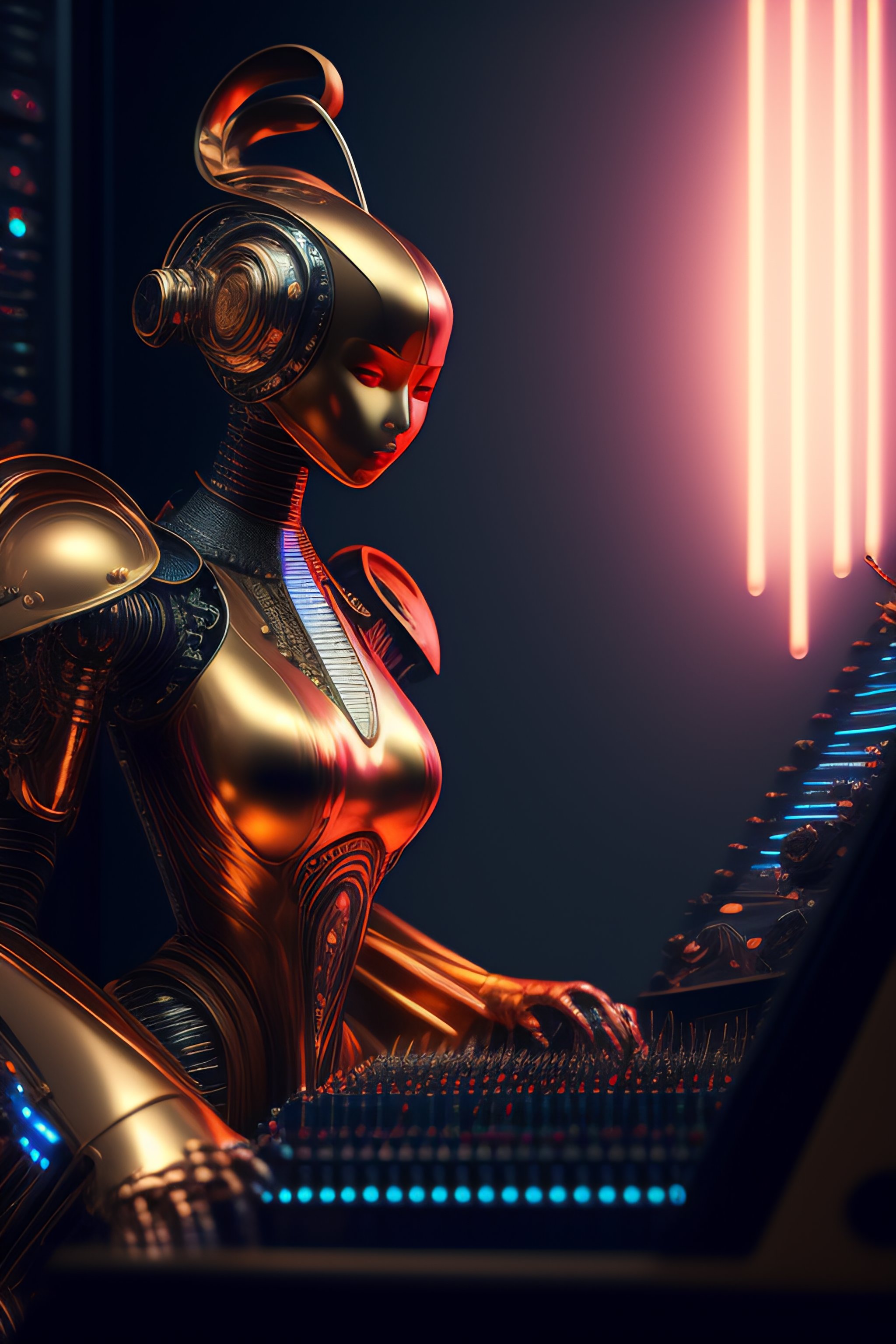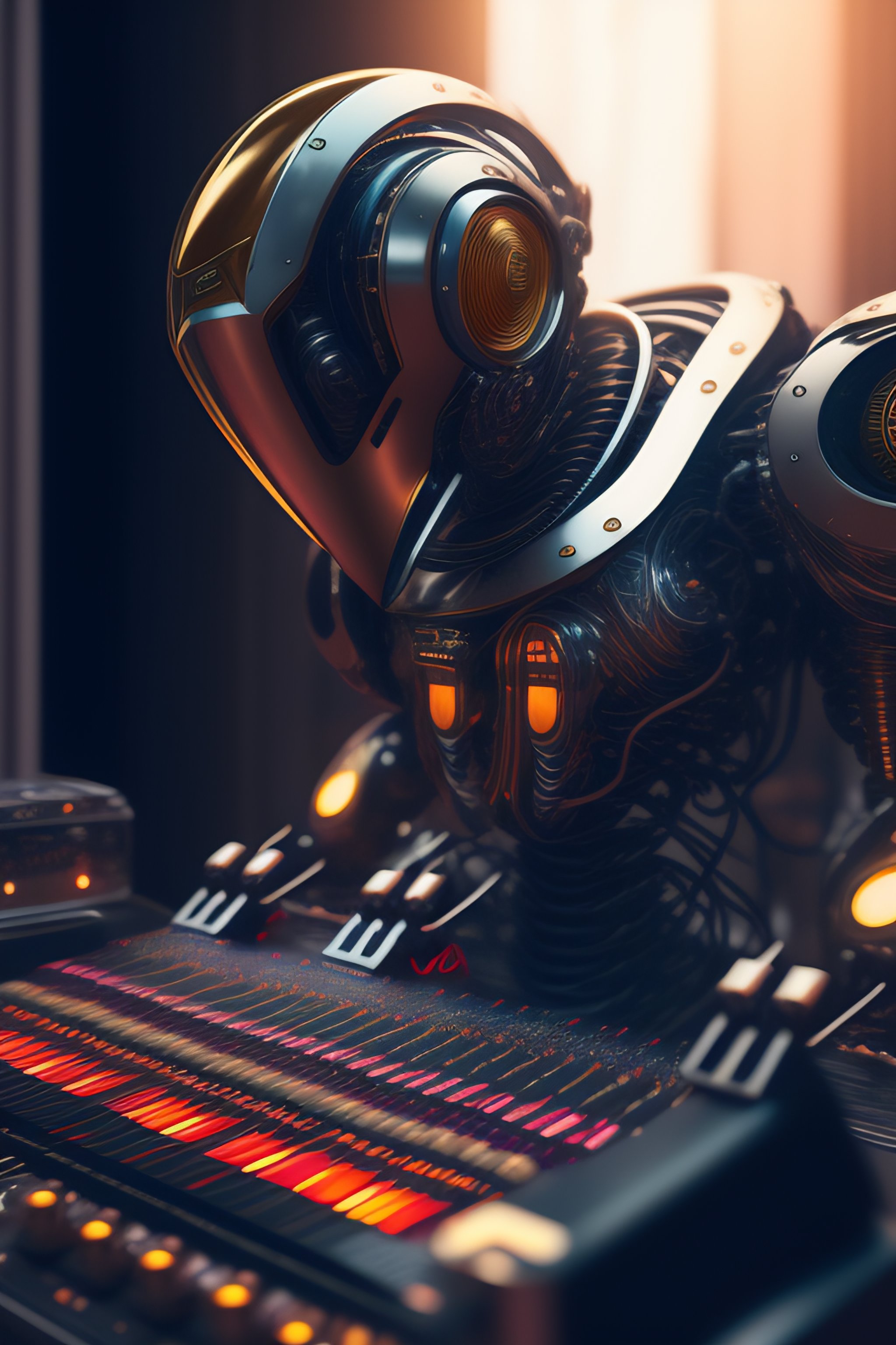 Robot making analog synth music, art by wagner kuroiwa tristan eaton, stanley artgermm, tom bagshaw, greg rutkowski, carne griffiths, ayami kojima, beksinski, giger, trending on deviantart, photorealistic, vray, hdr, hyper detailed, dramatic lighting, octane render, weta digital, 3 d sculpture