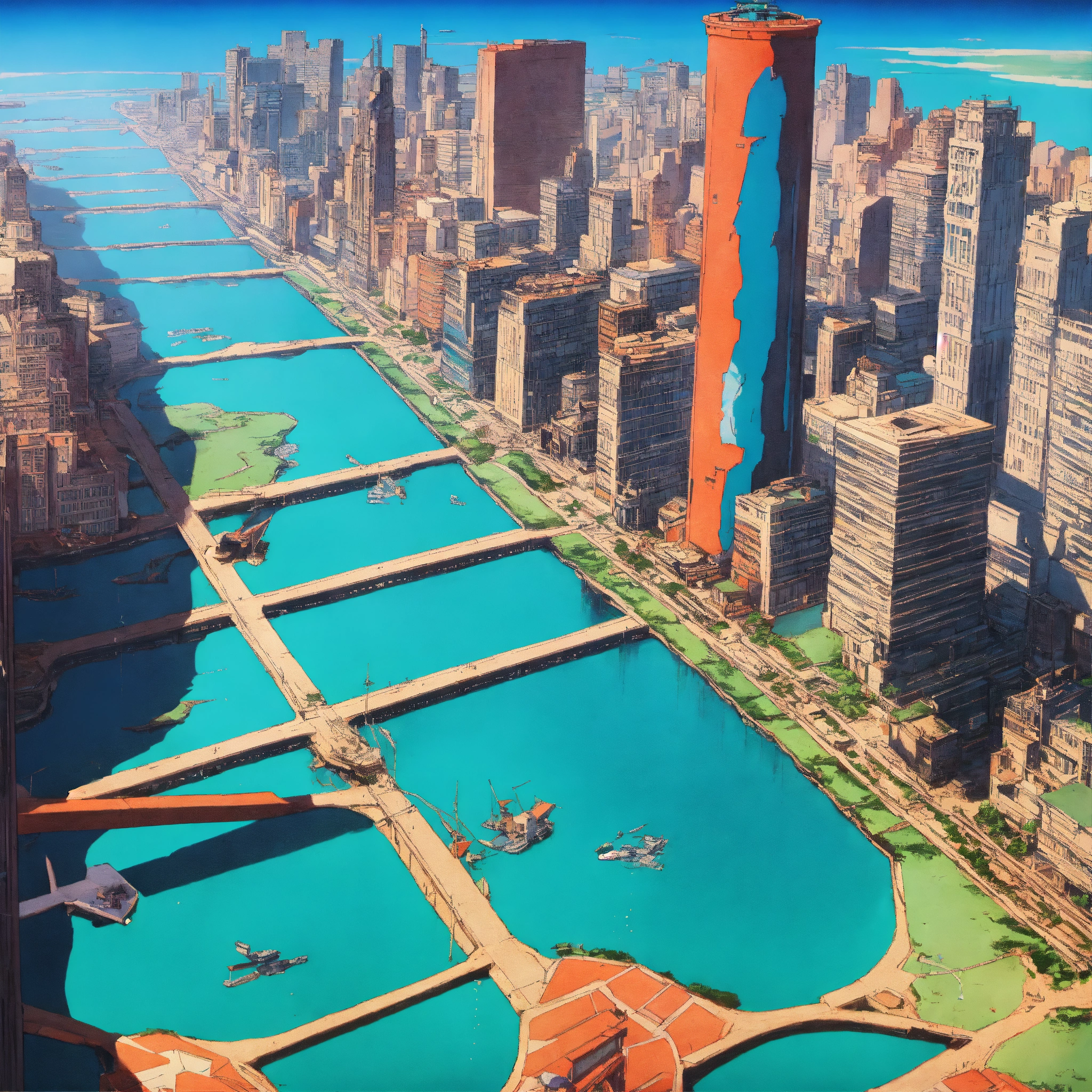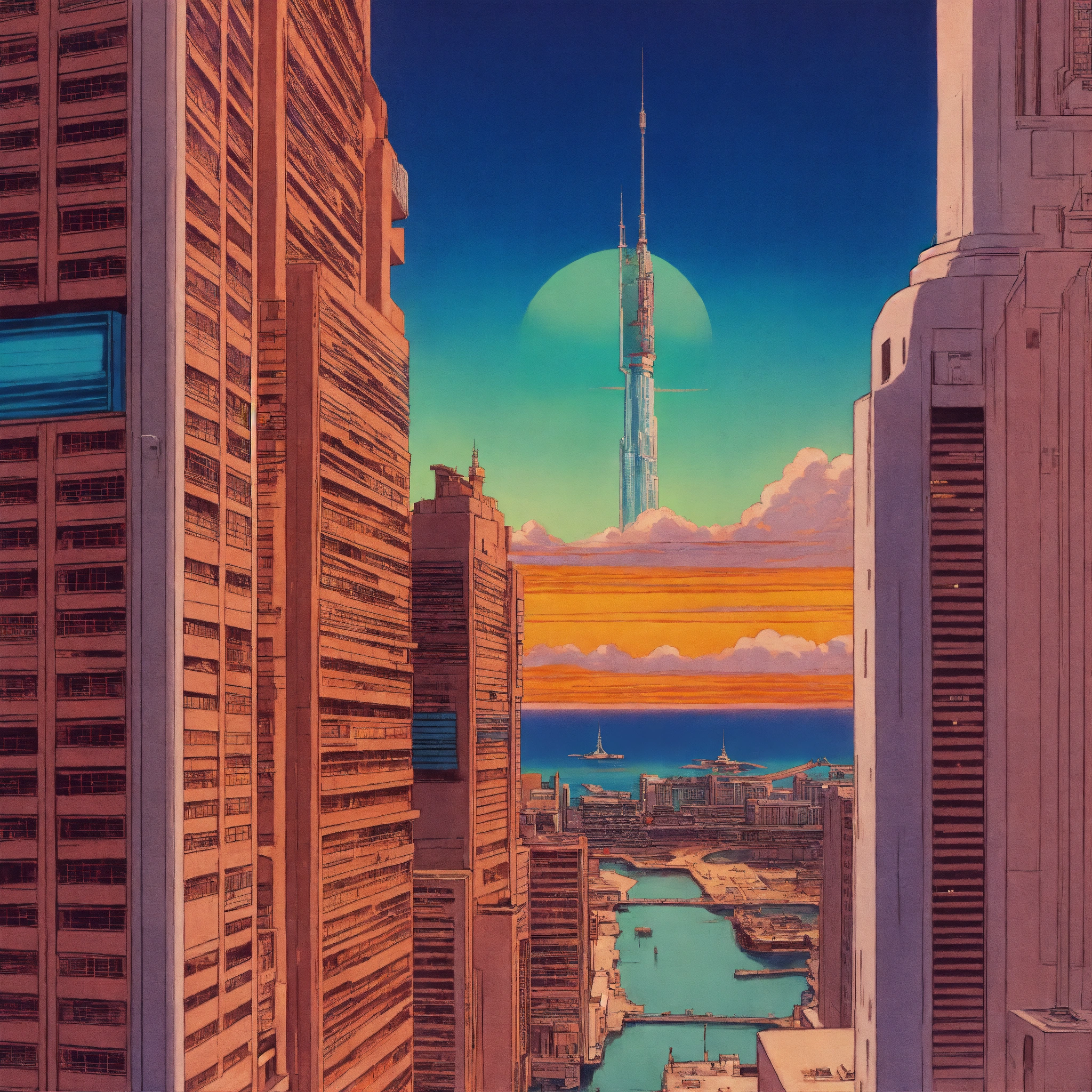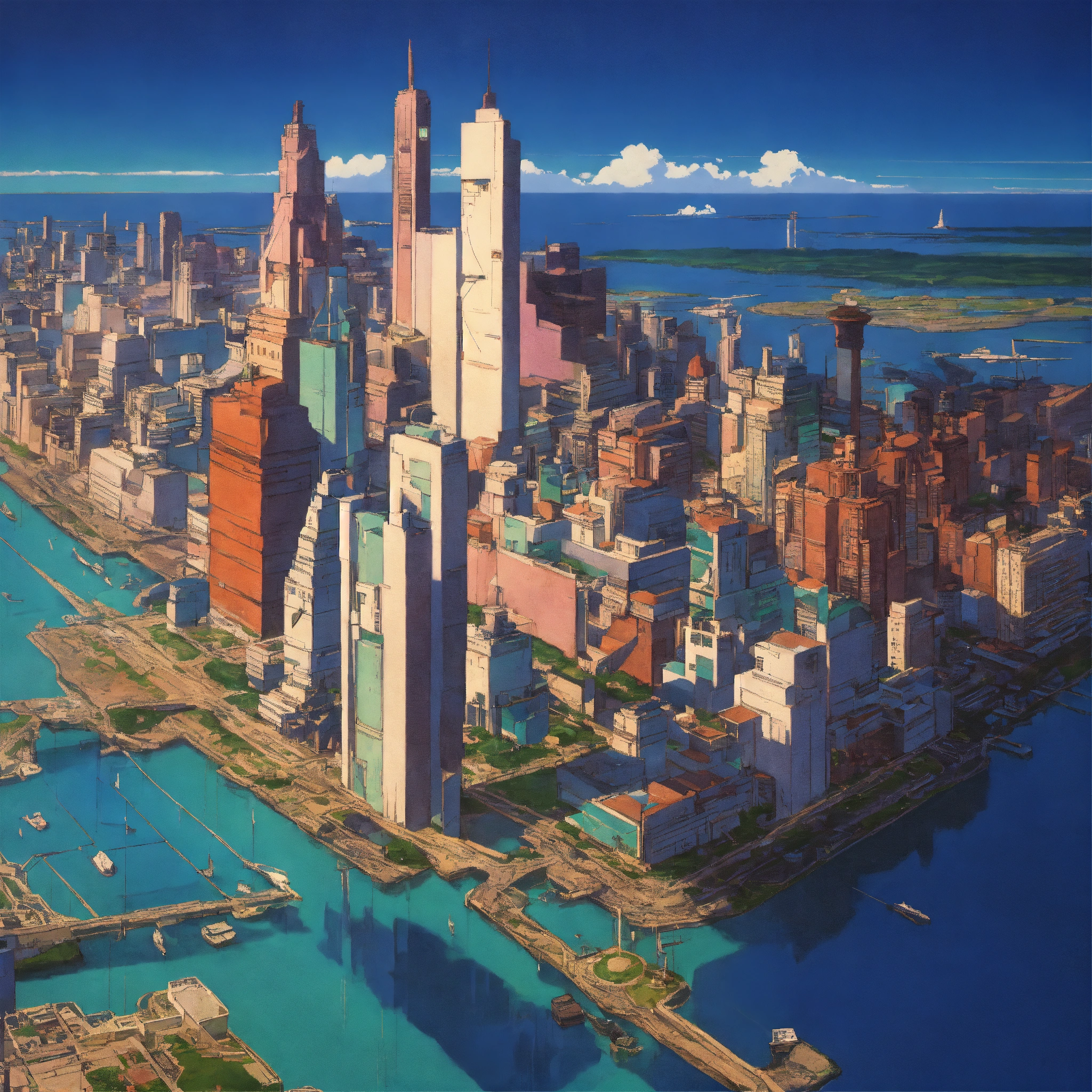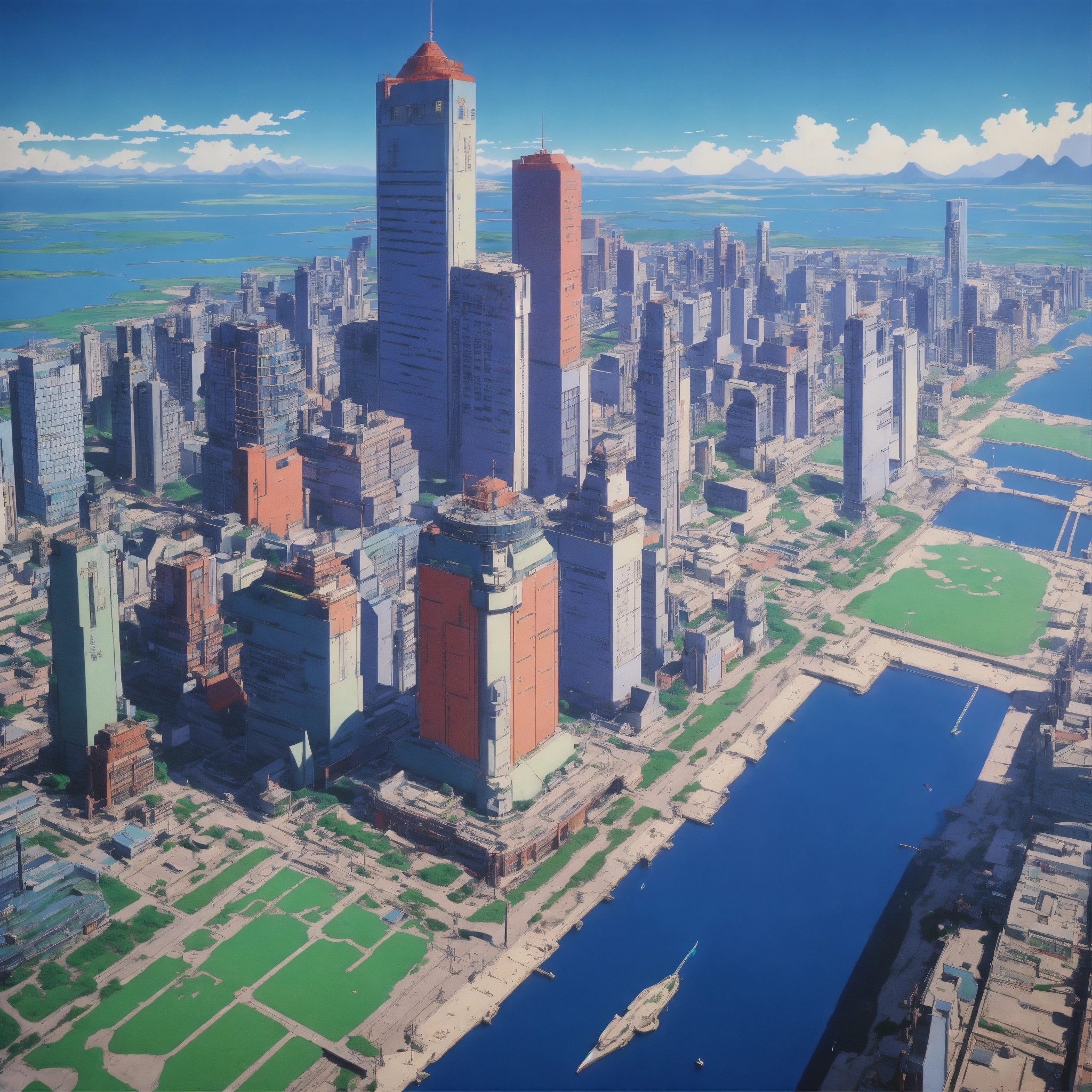 The city of atlantis but with futuristic vibes in a vintage anime screenshot from evangelion, a 90's anime. sleek modernism. bird's eye view.