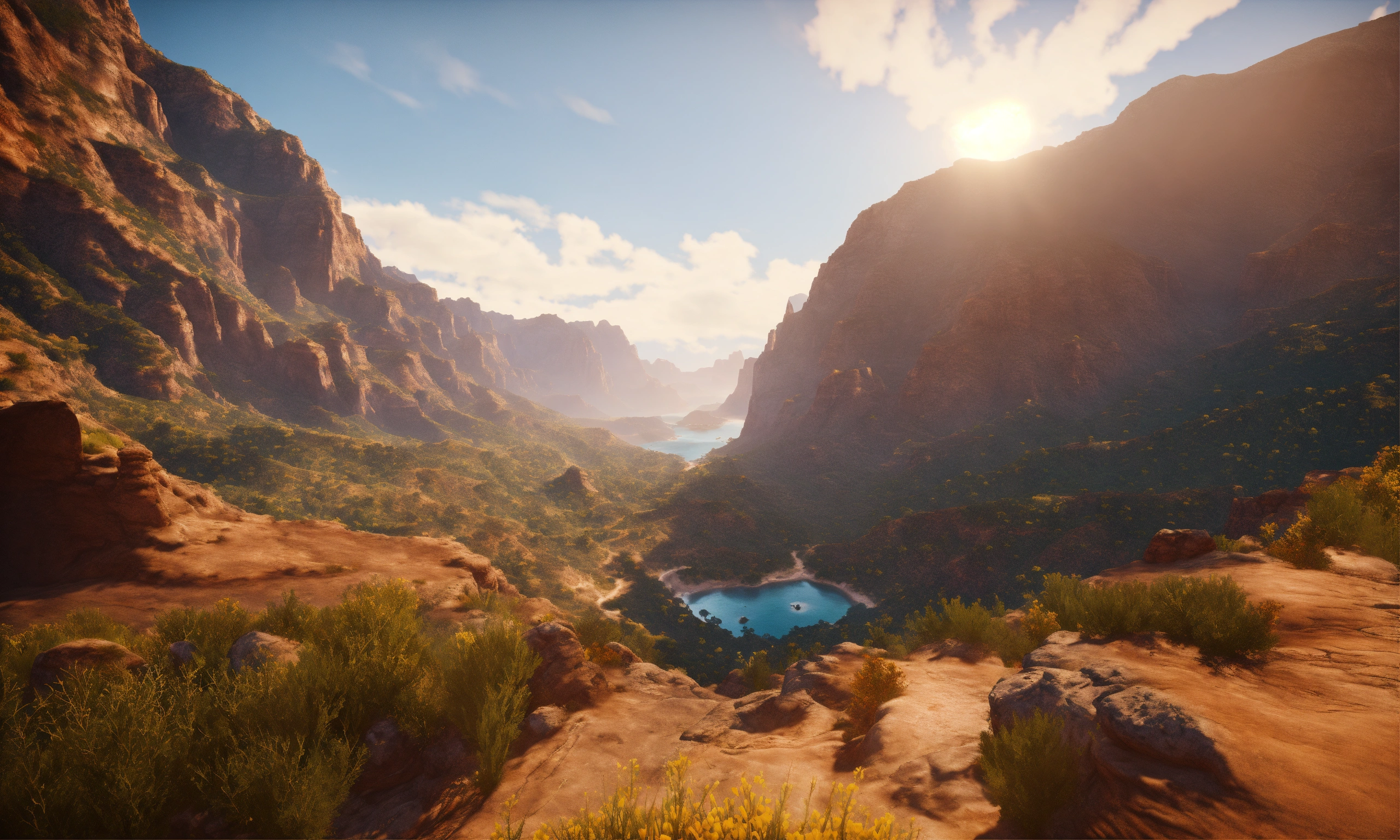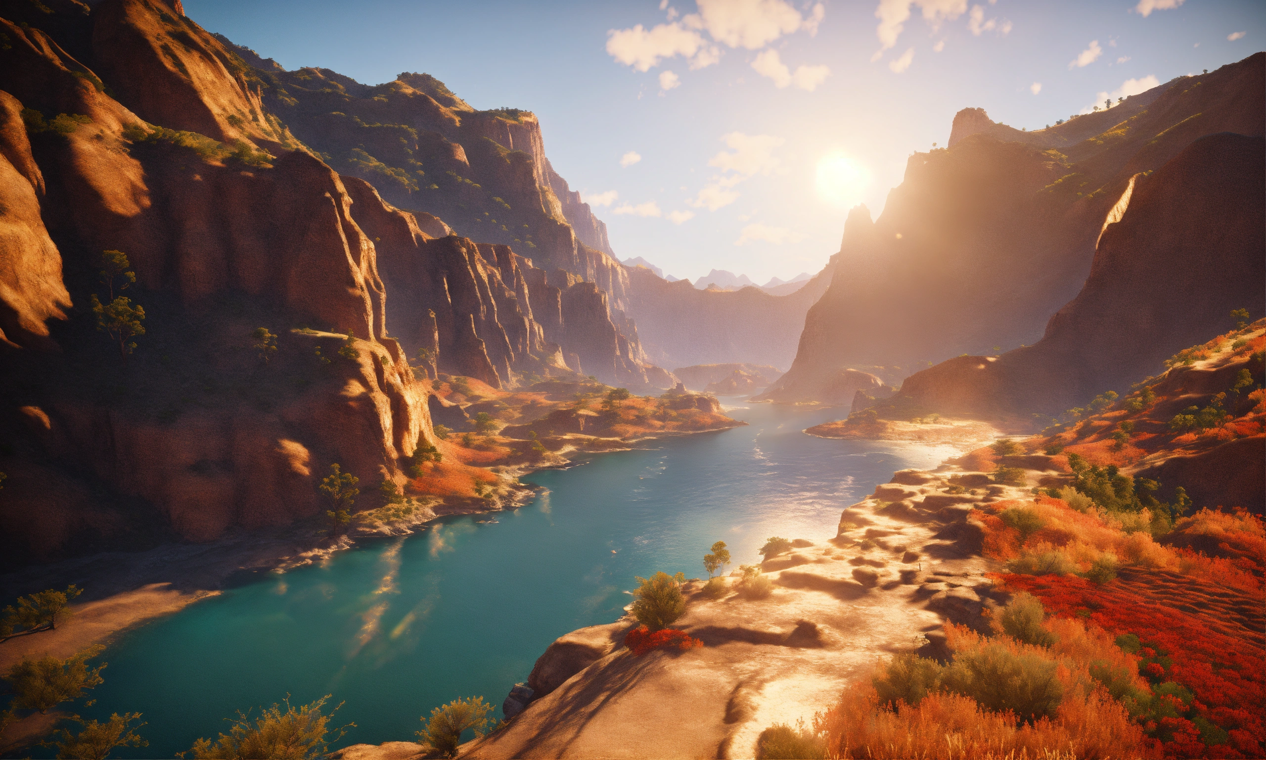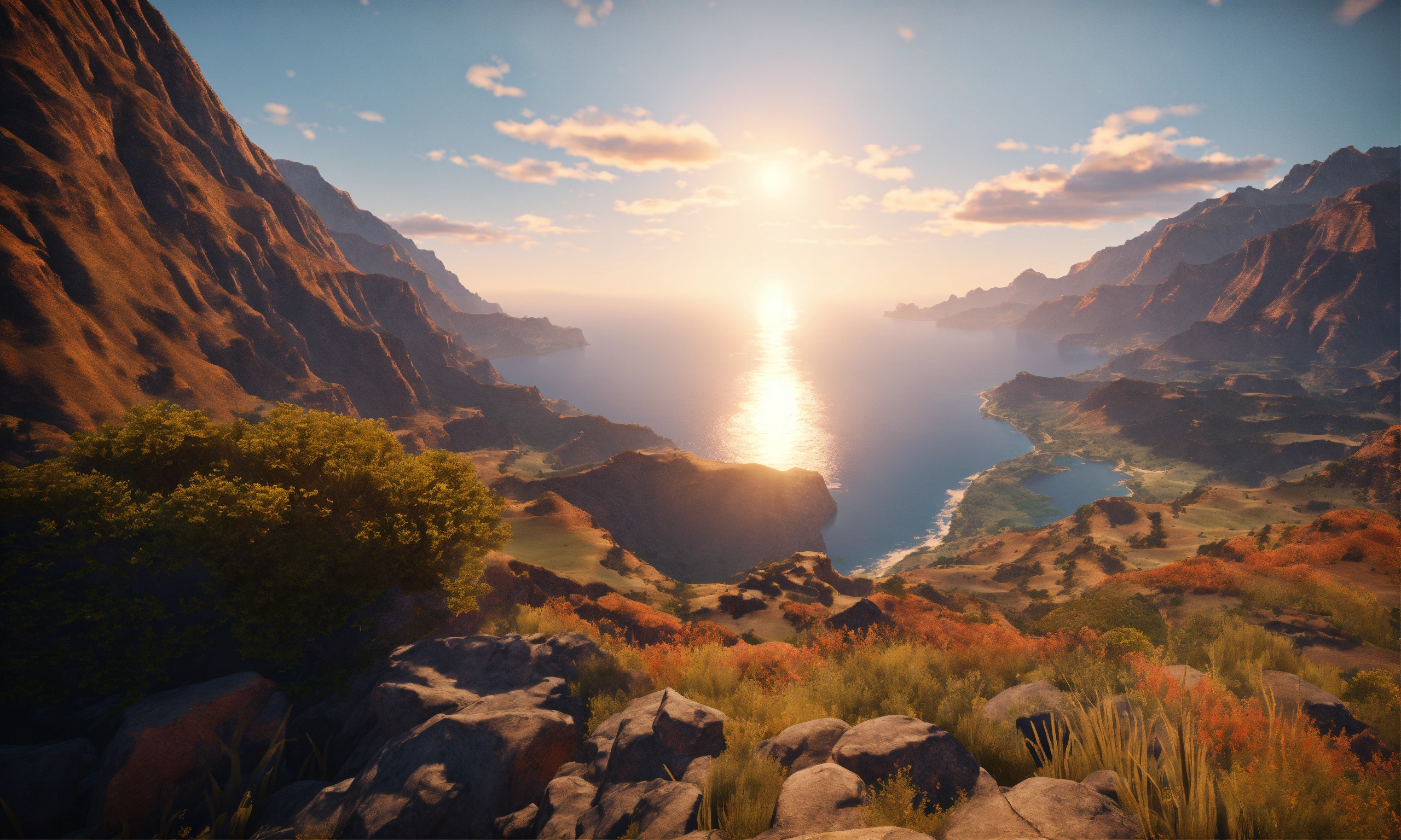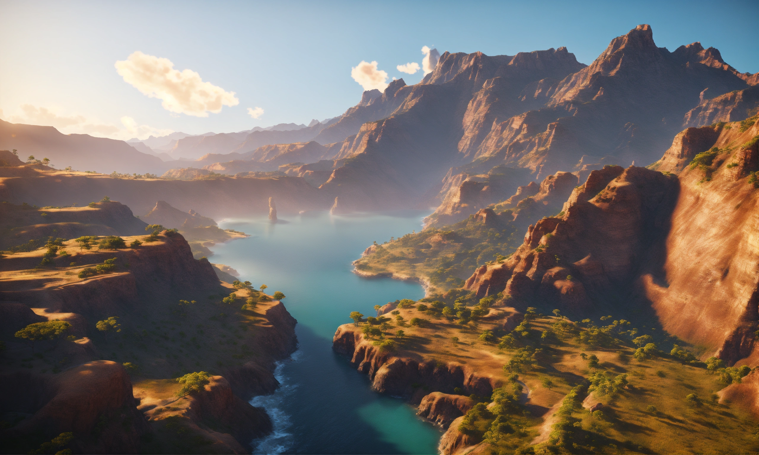 Unreal engine 8k full background of heaven surrounded by big beautiful mountain canyons and the ocean view during the morning when the sun is shining