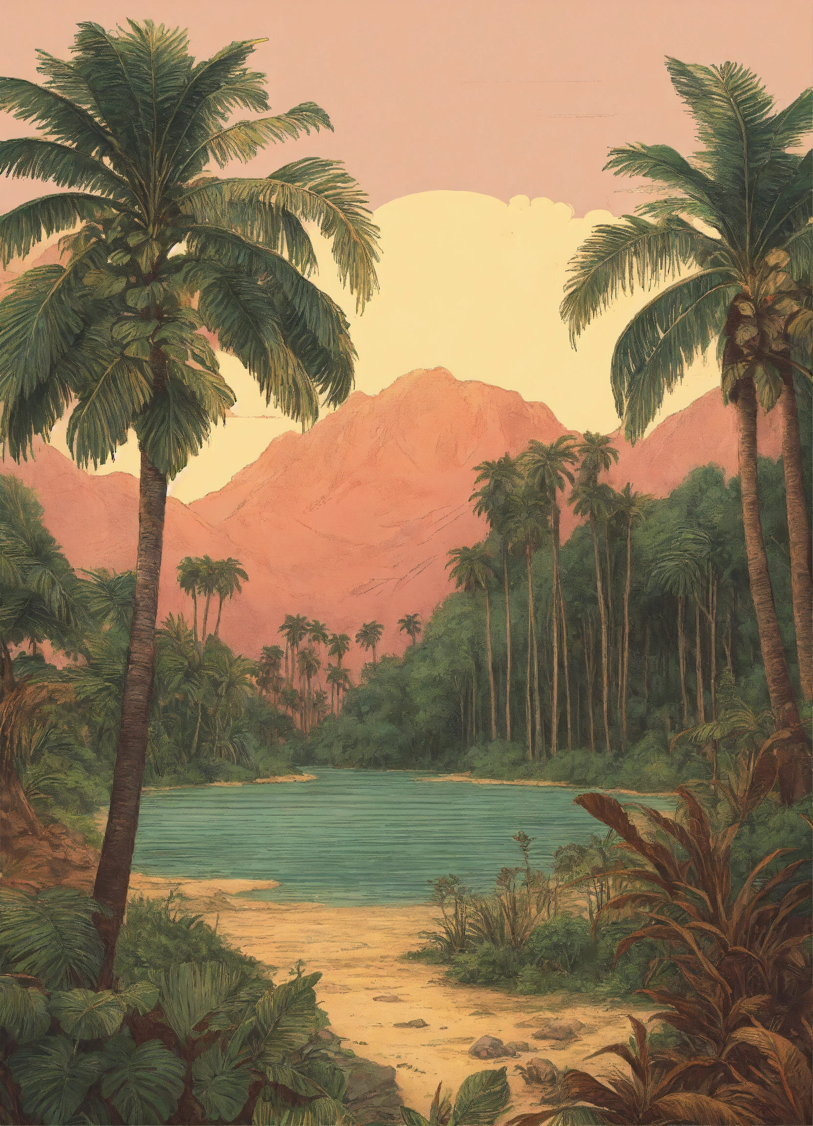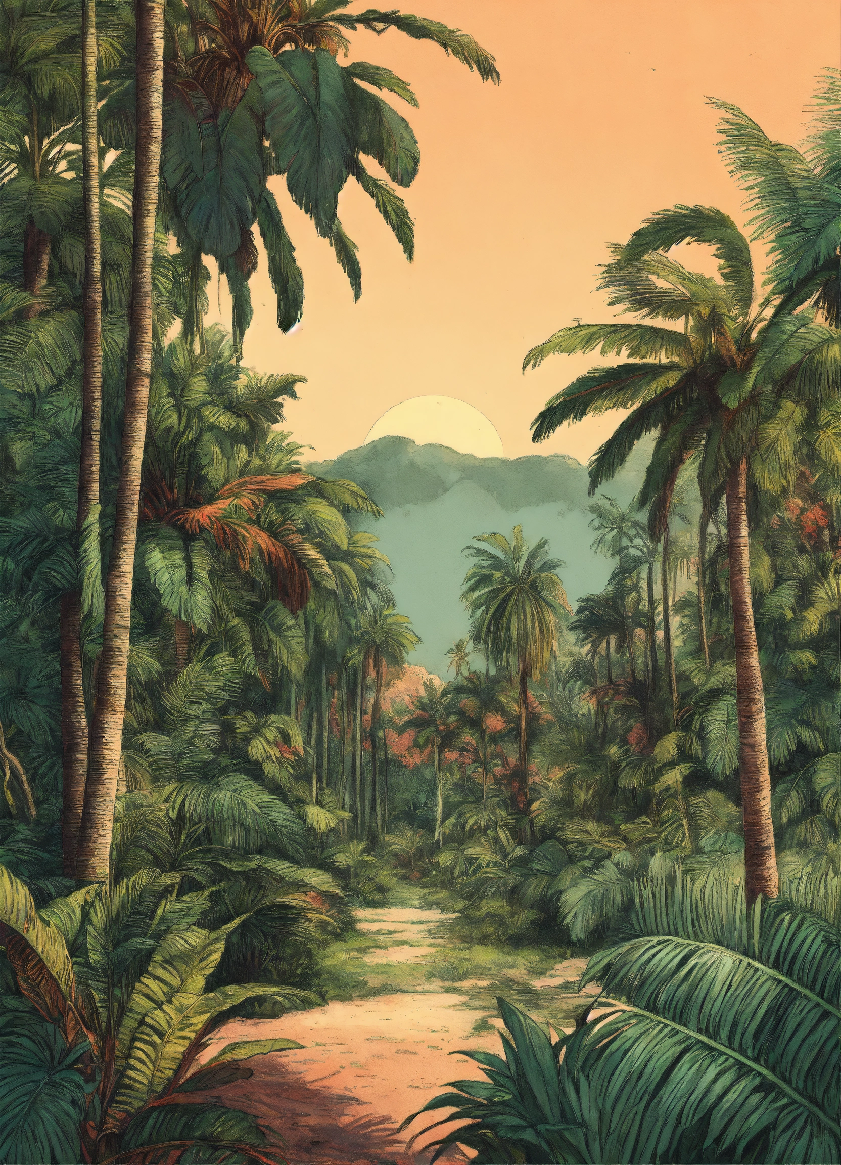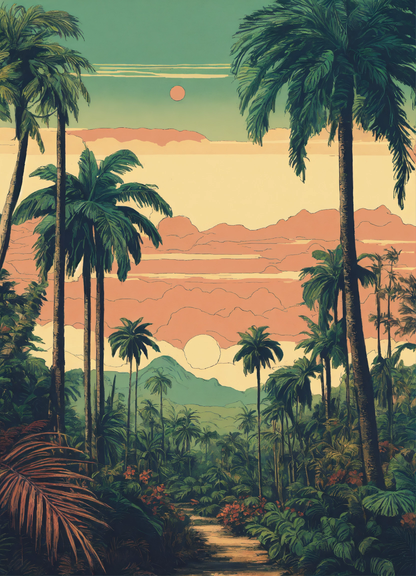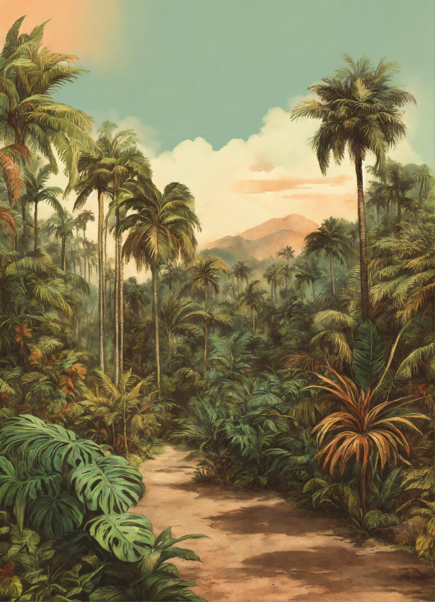 Vintage, palm tree forest, vintage colors, illustration, detailed monstera plants, detailed jungle plants