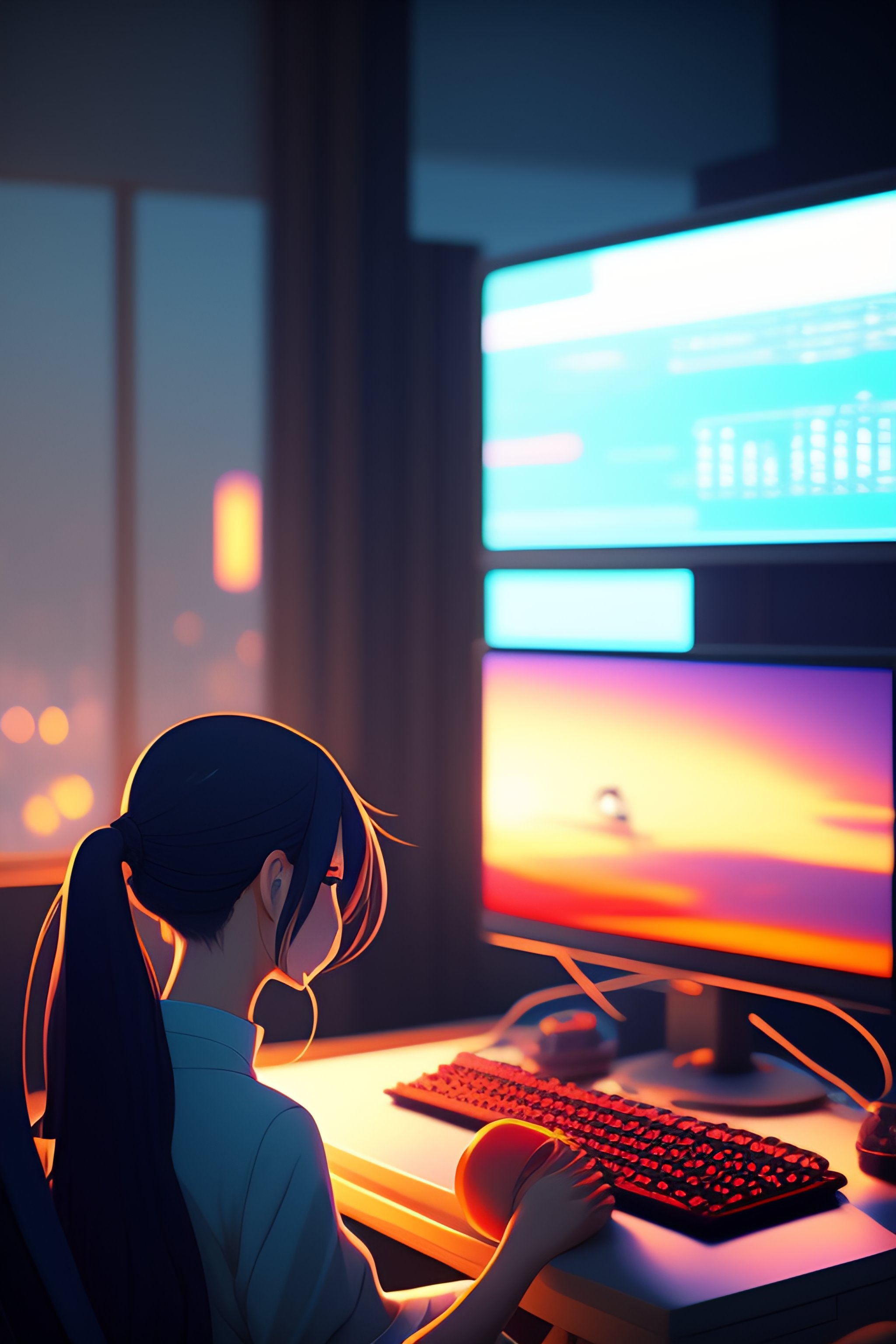 Create a high resolution artwork of anime girl is programming at a laptop in a room, web developer, by makoto shinkai and ghibli studio, outlined silhouettes, dramatic lighting, highly detailed, incredible quality, trending on artstation, masterpiece, 8k