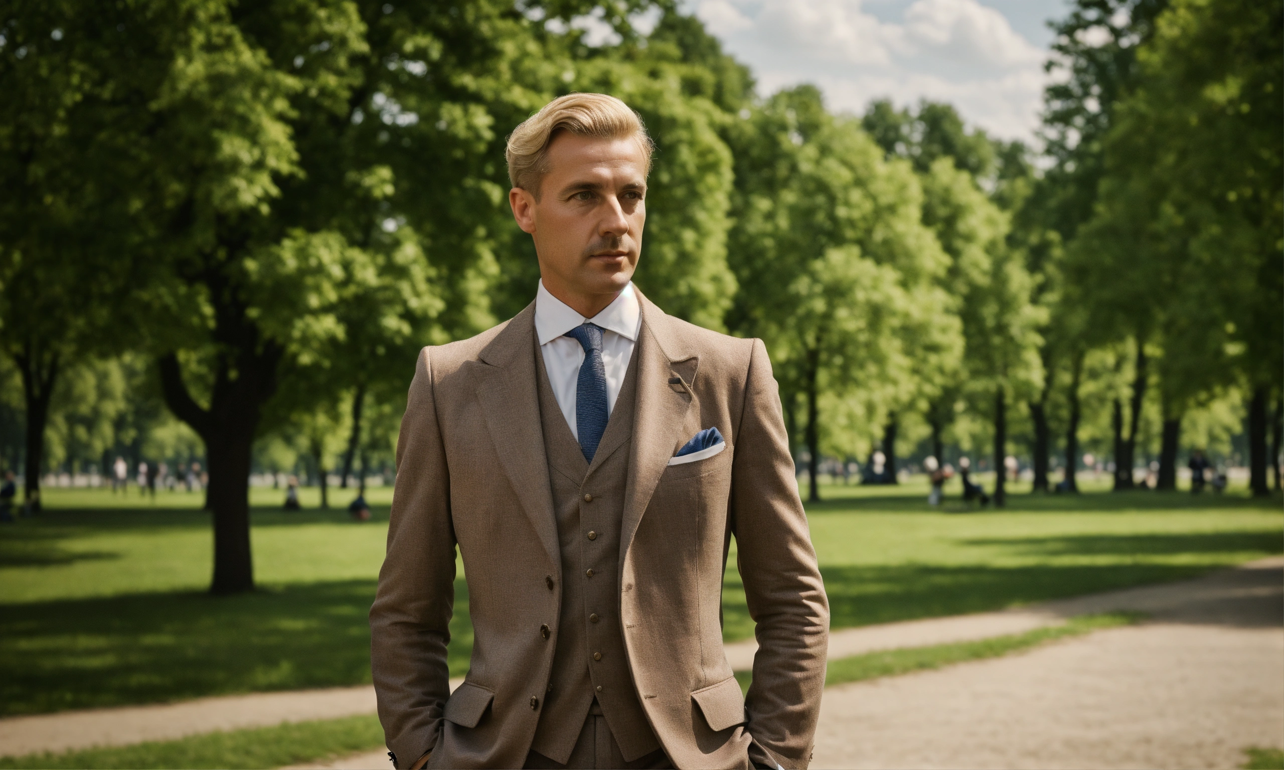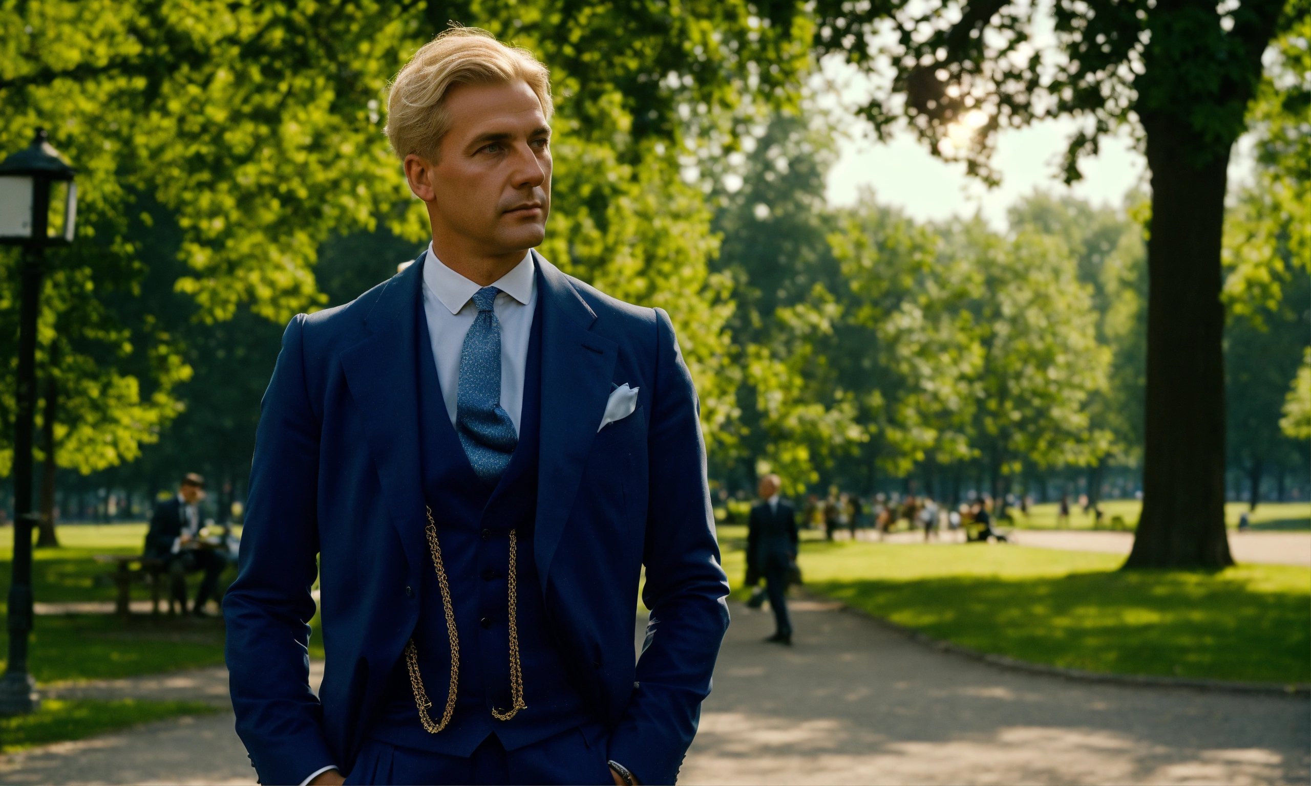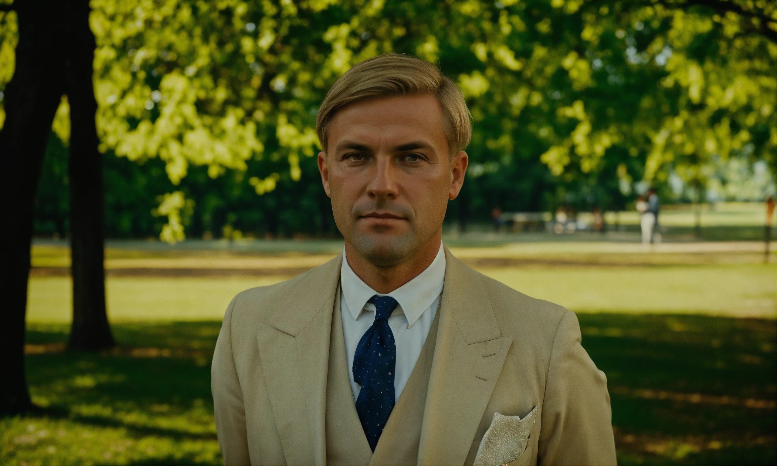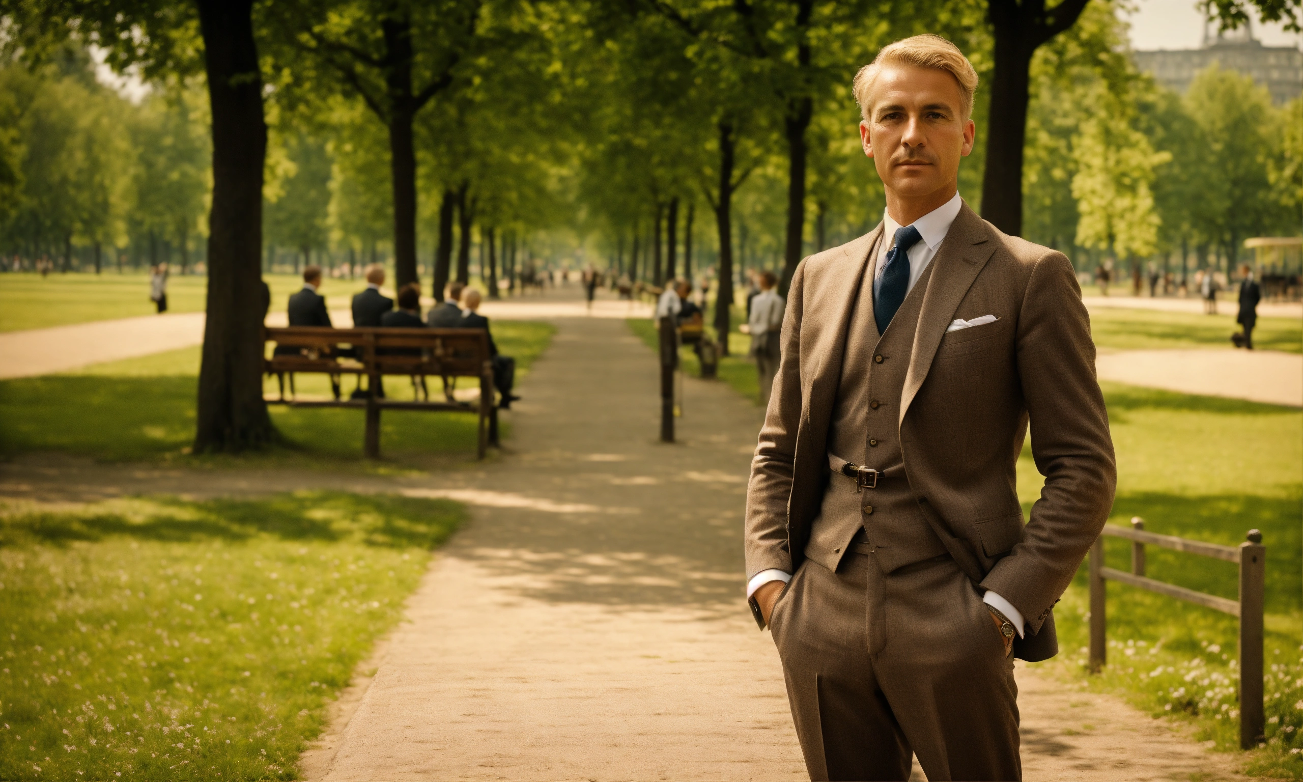 Warszawa 1920-1930, european age 40, in a park, looks at the camera at full height, blonde hair, business suit. full height, summer. retro style.