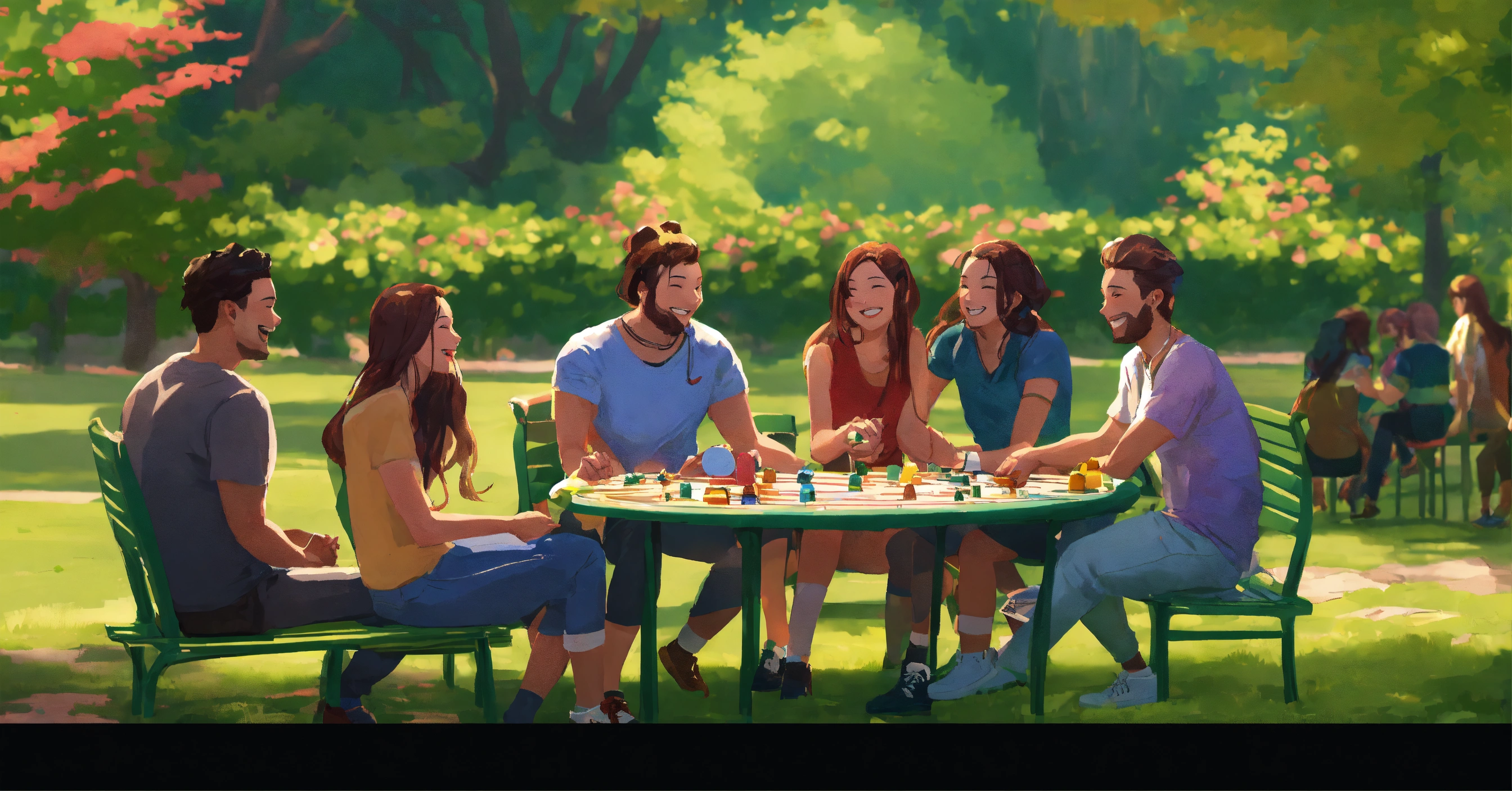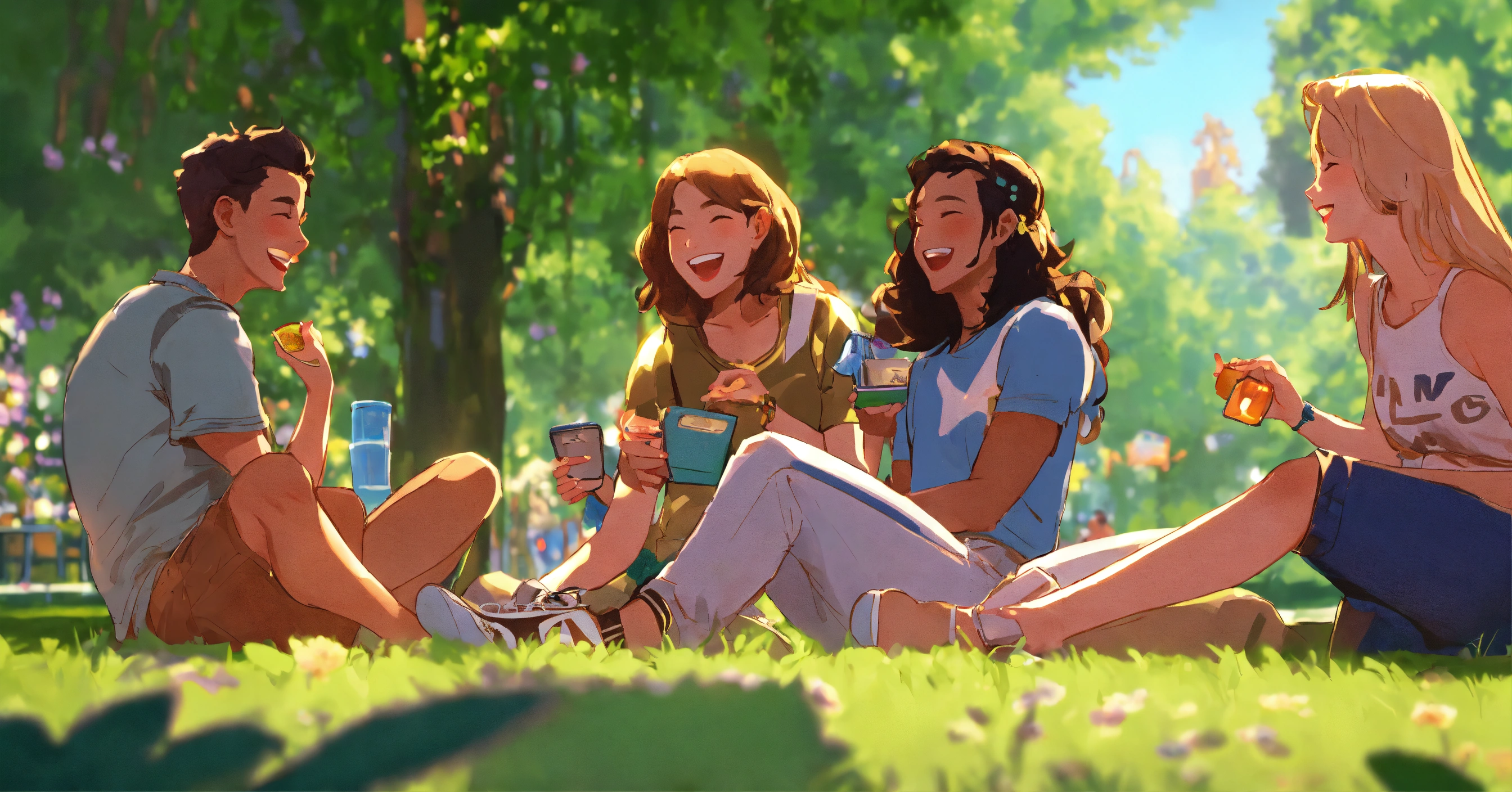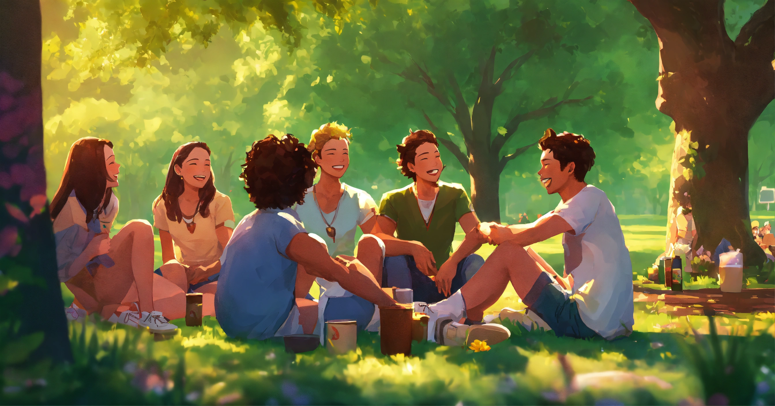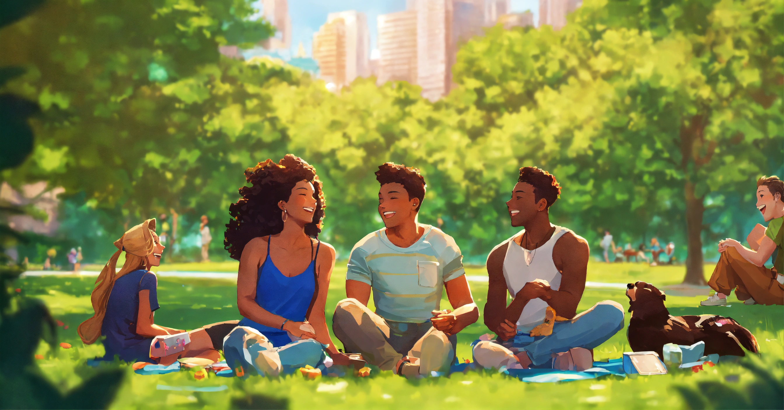 5 friends sitting down, facing one another in a green luscious park, laughing and holding hands. the background has a few folks playing other games evoking a lively and neighorbly park