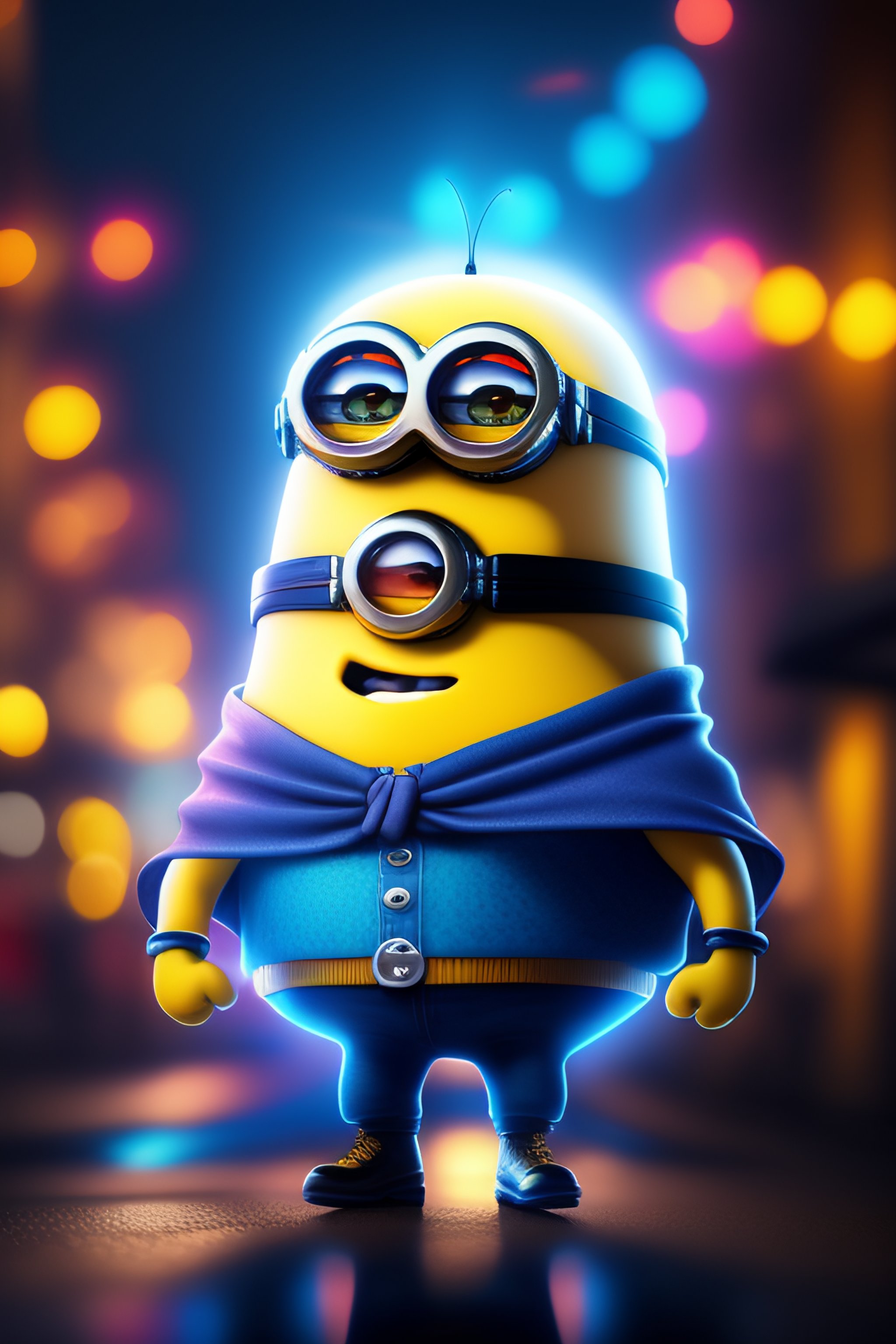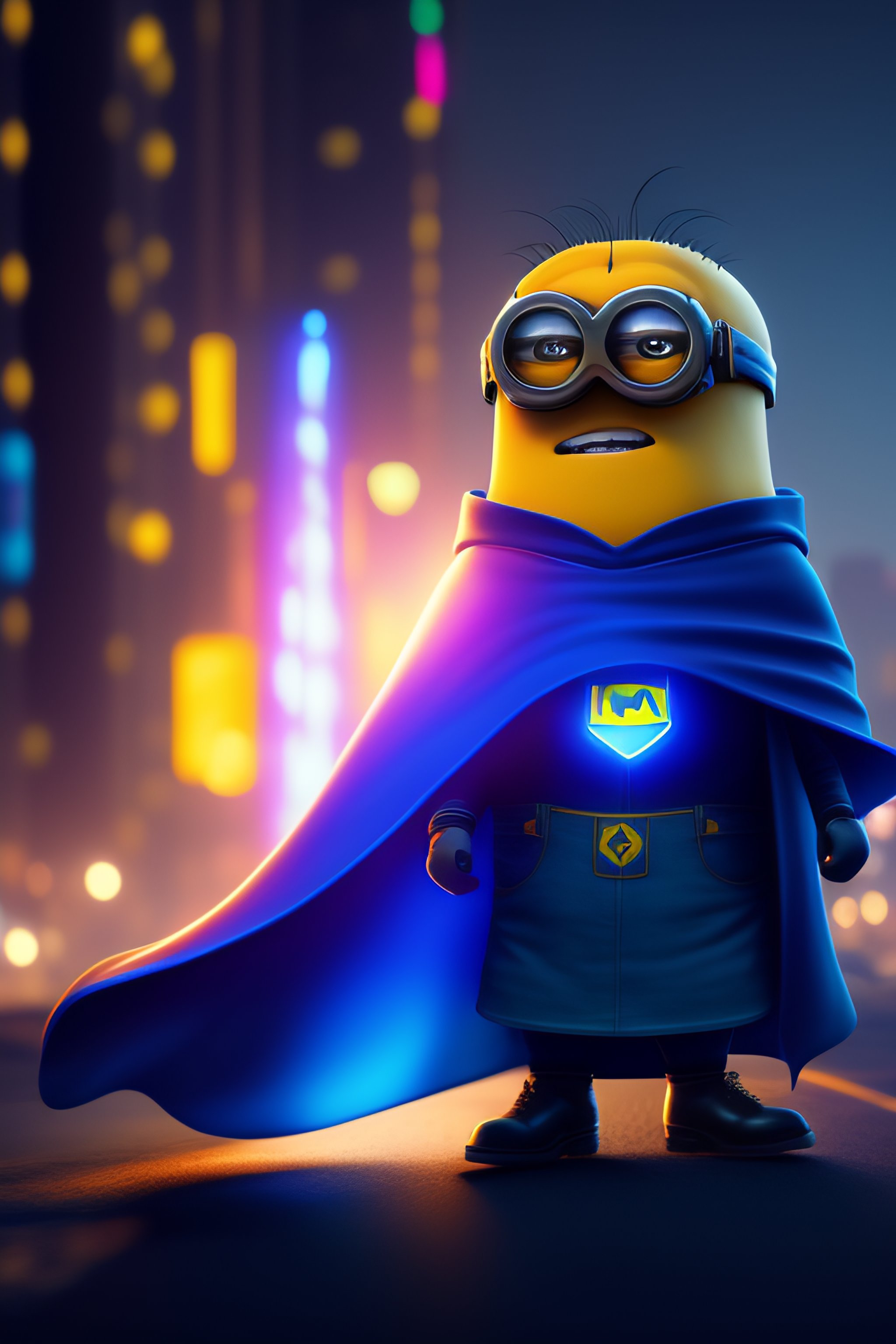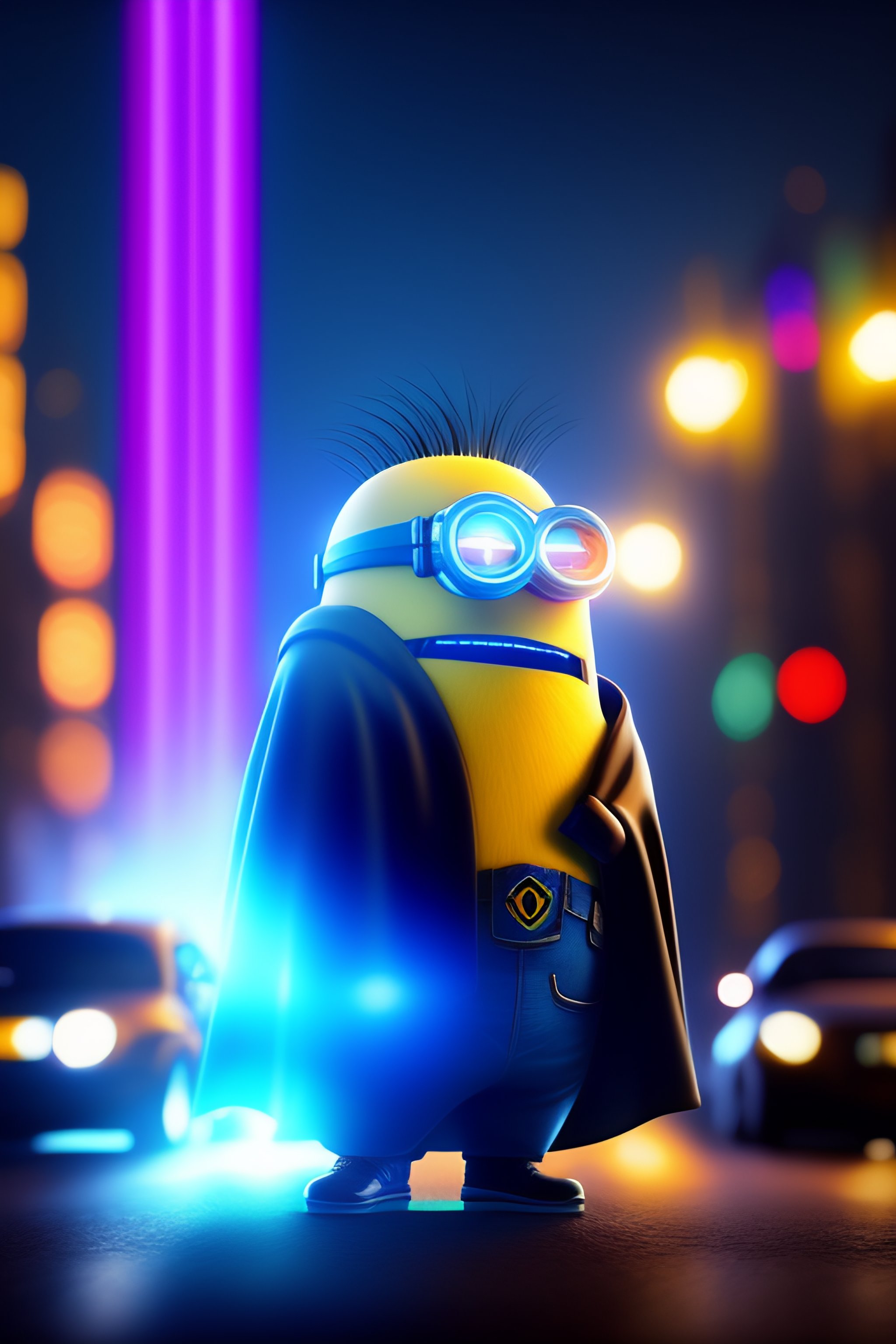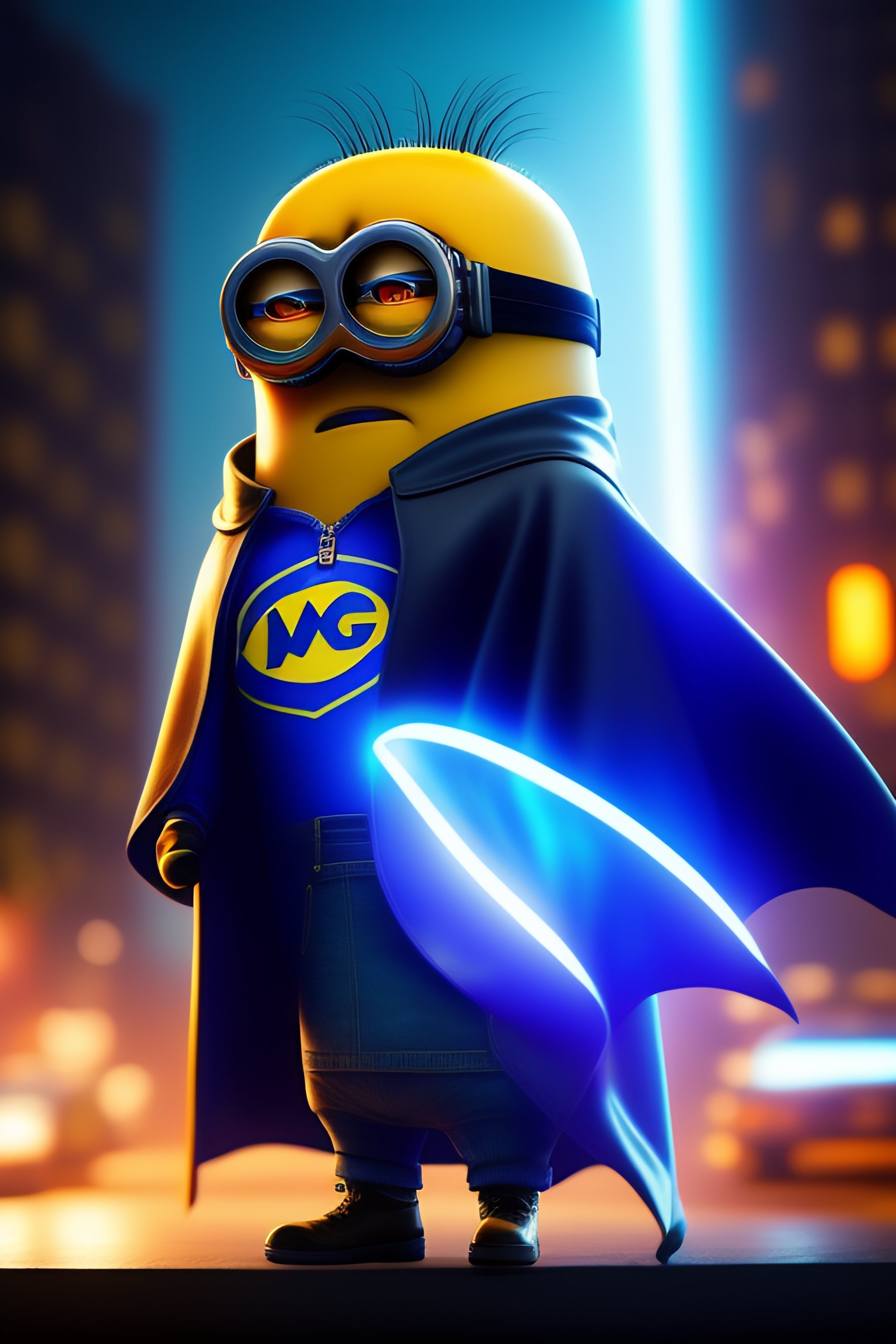 Strong minion eats cake in a cape in a cyberpunk city, and a blue beam of light shines on a minion, gta v style