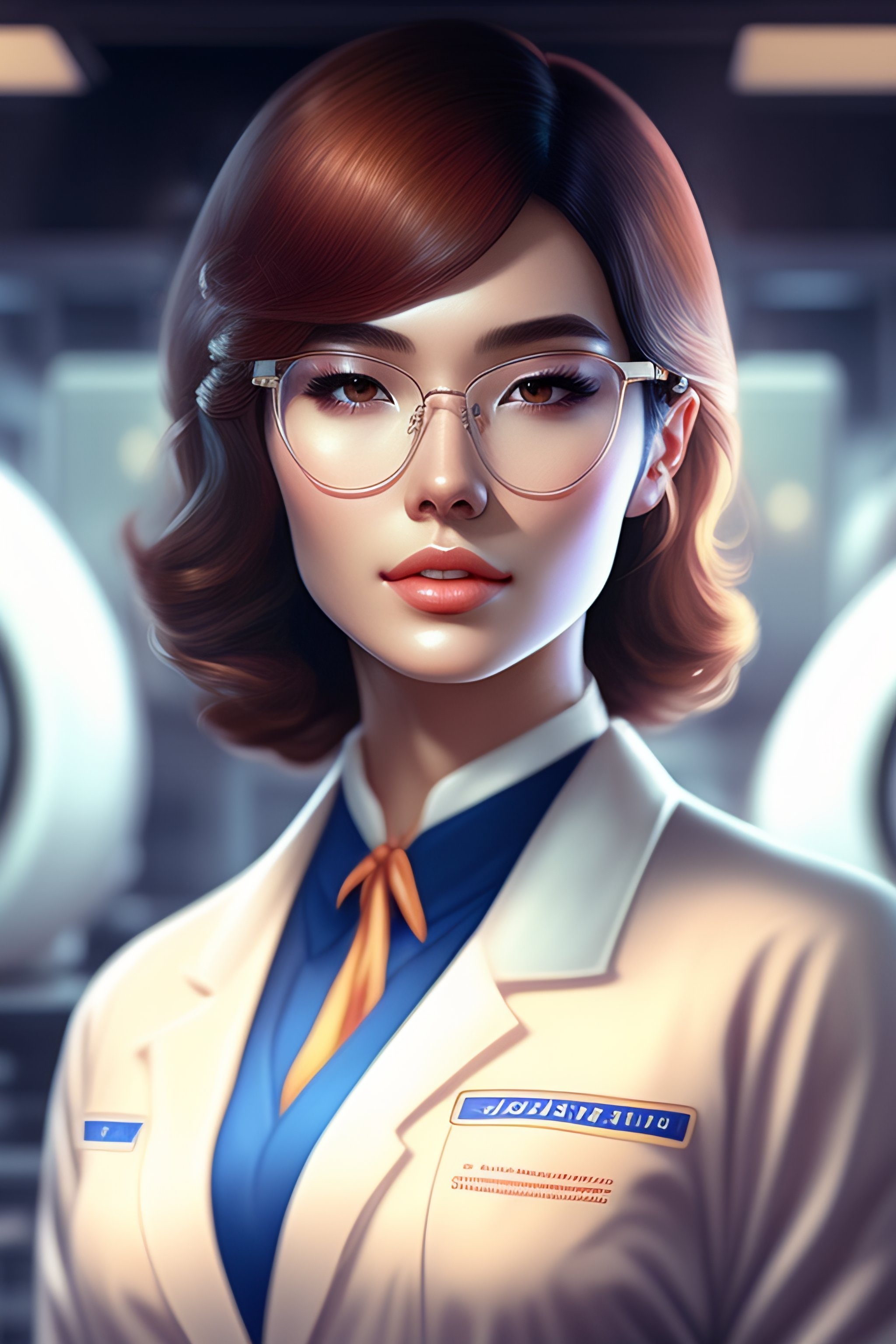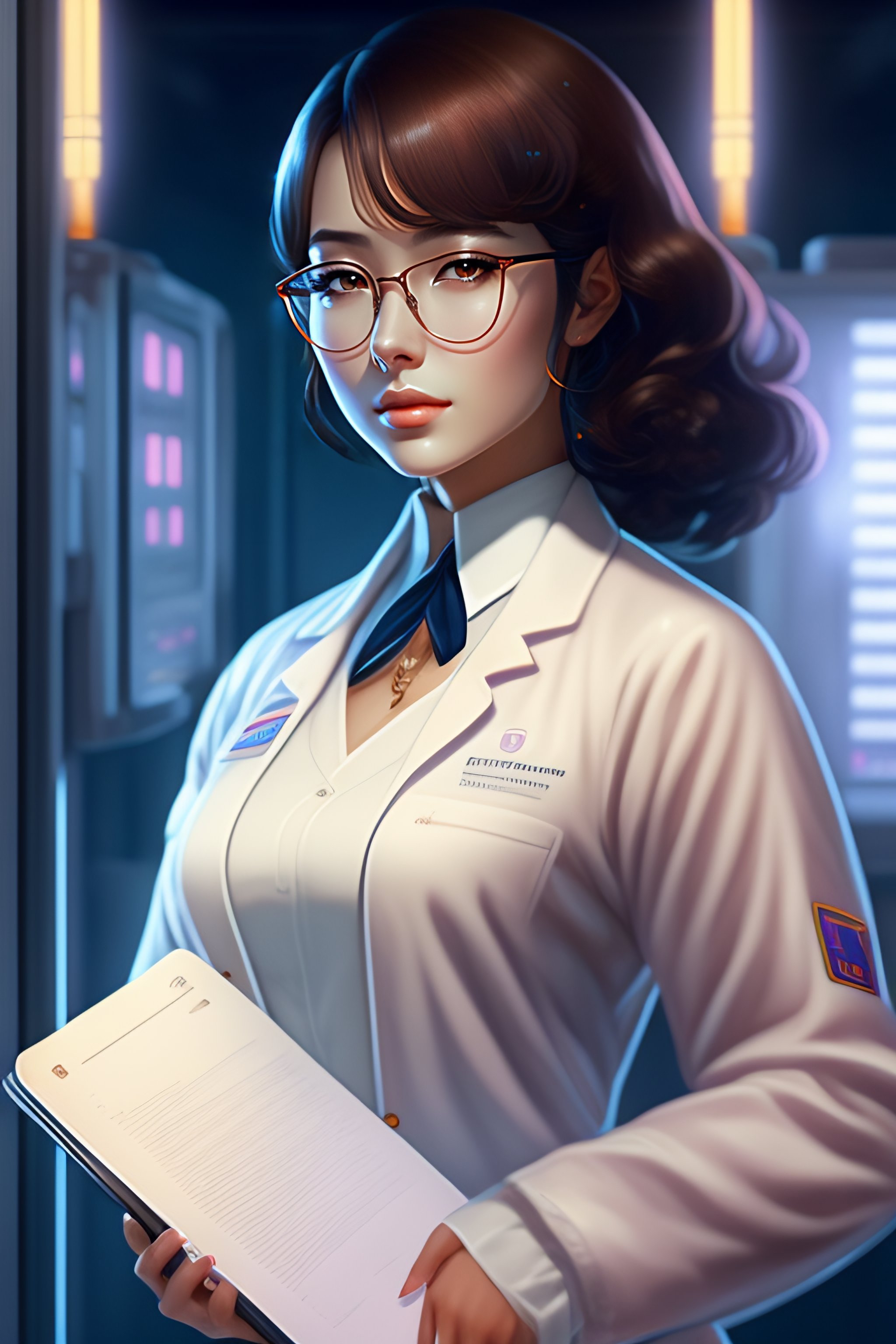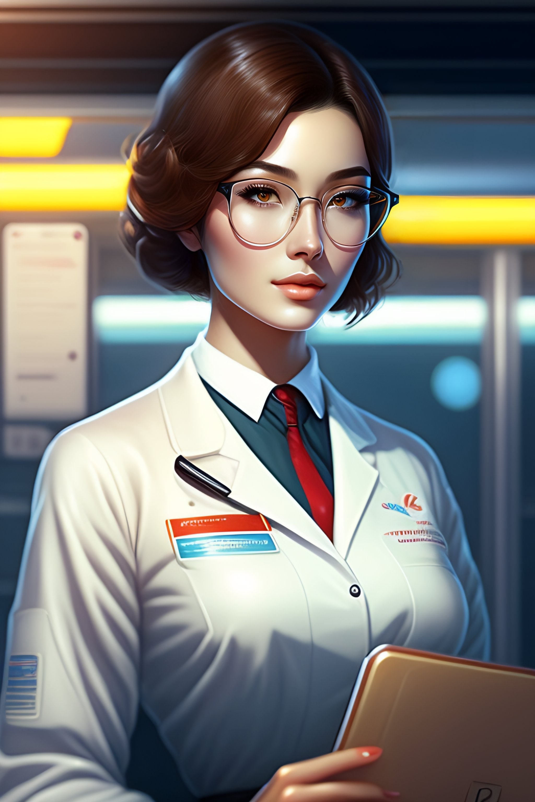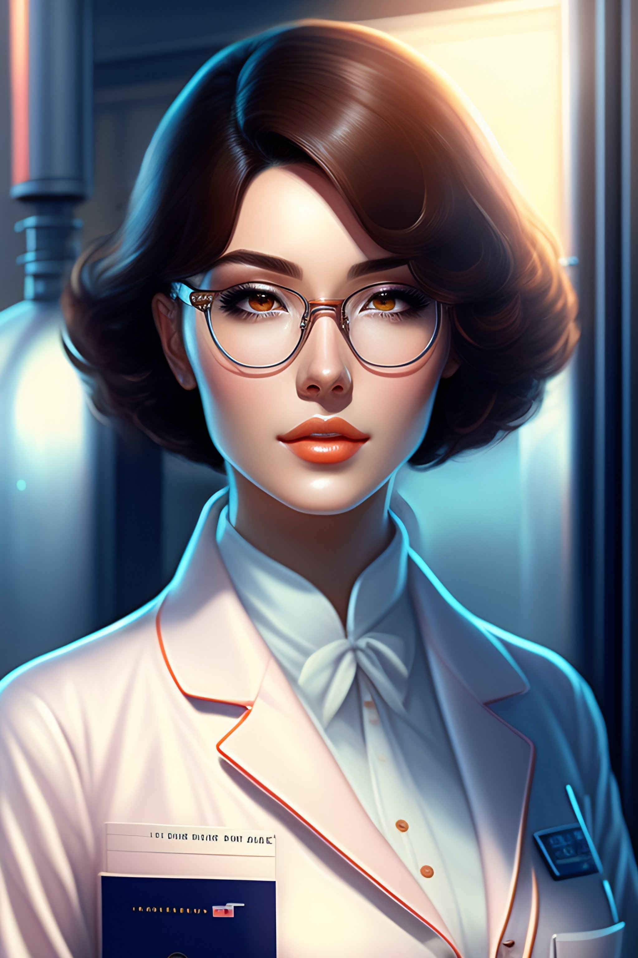 Beautiful anime girl with short brunette hair, wearing lab coat and glasses, holding a clipboard, standing inside a research facility, character portrait, 1 9 6 0 s, long hair, intricate, elegant, highly detailed, digital painting, artstation, concept art, smooth, sharp focus, illustration, art by wlop, charlie bowater and alexandra fomina