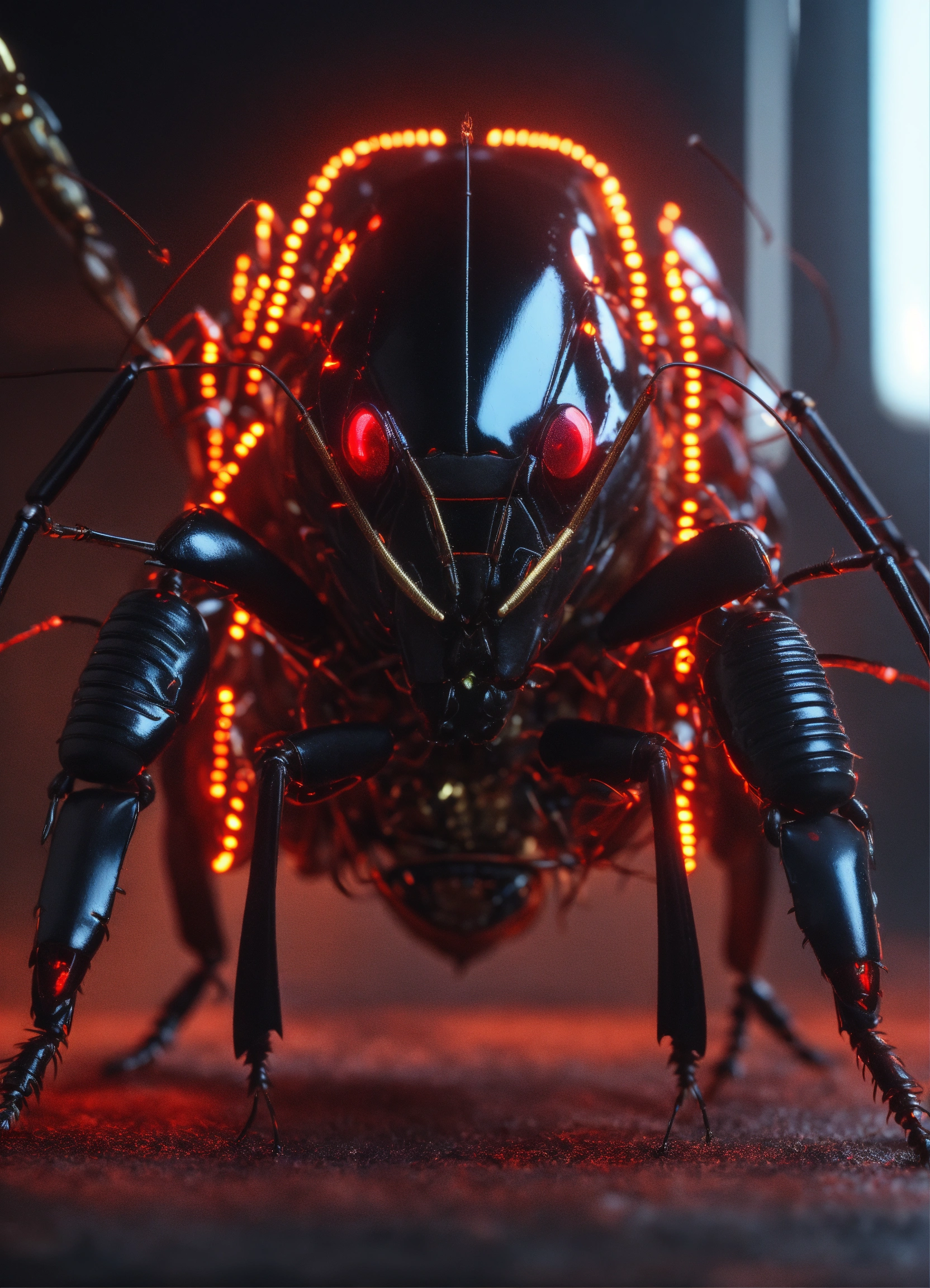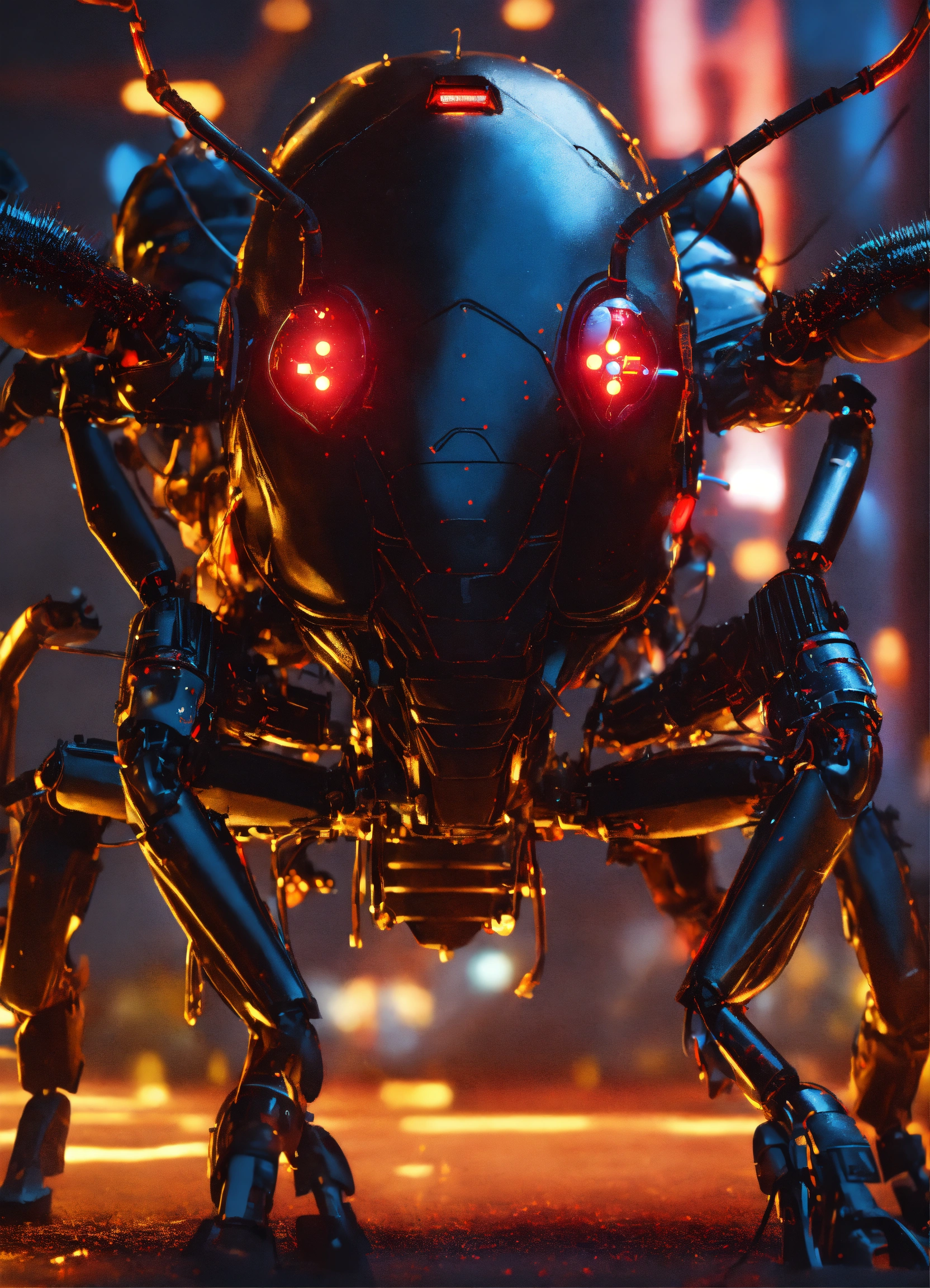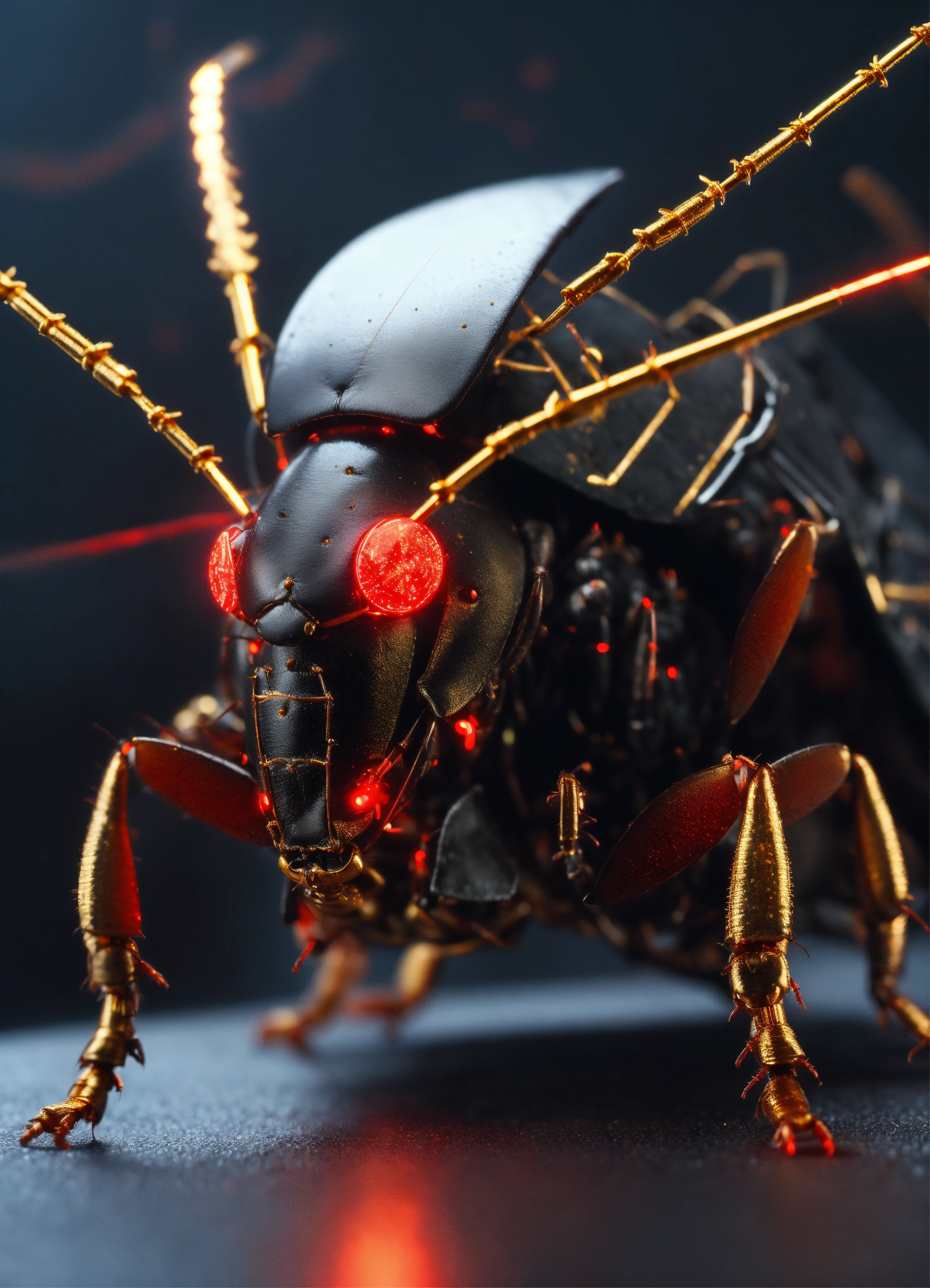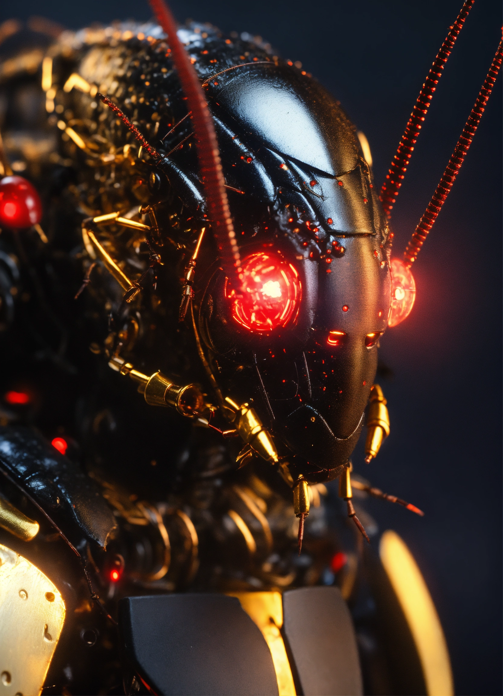 Zoom out of black cockroach faced humanoid with red glowing eyes, gold circuitry. shooting electricity from his powerful antenna attacking, realistic, 8k
