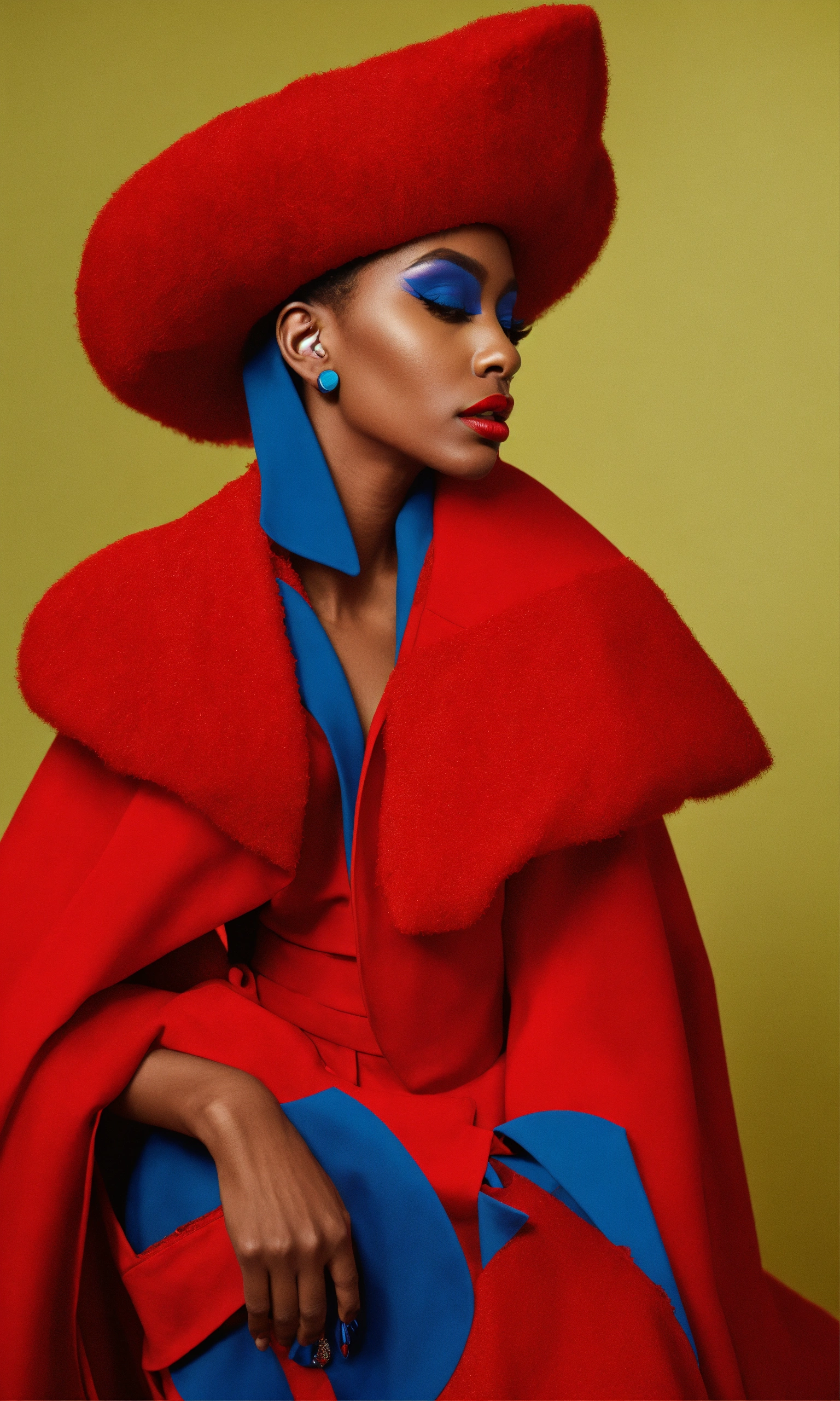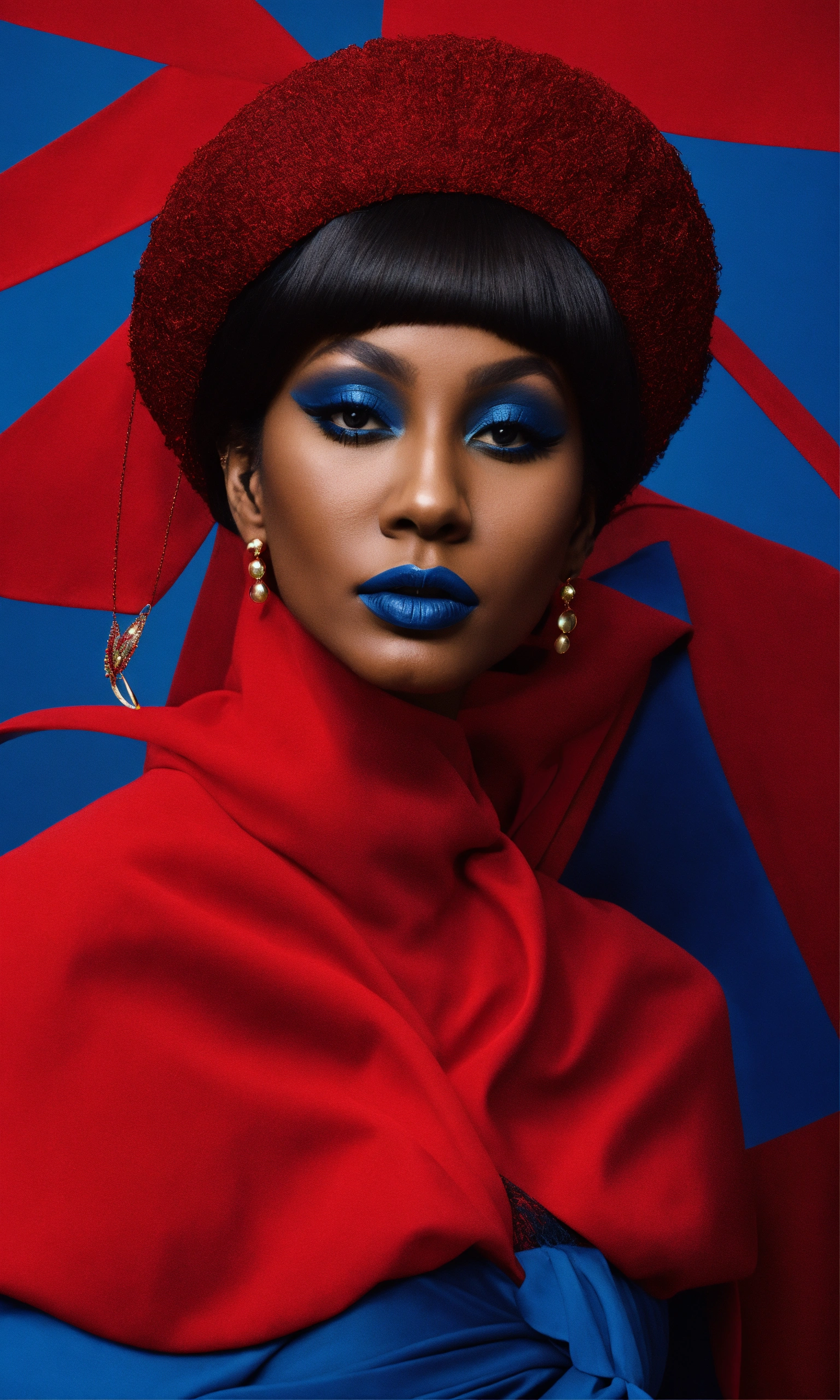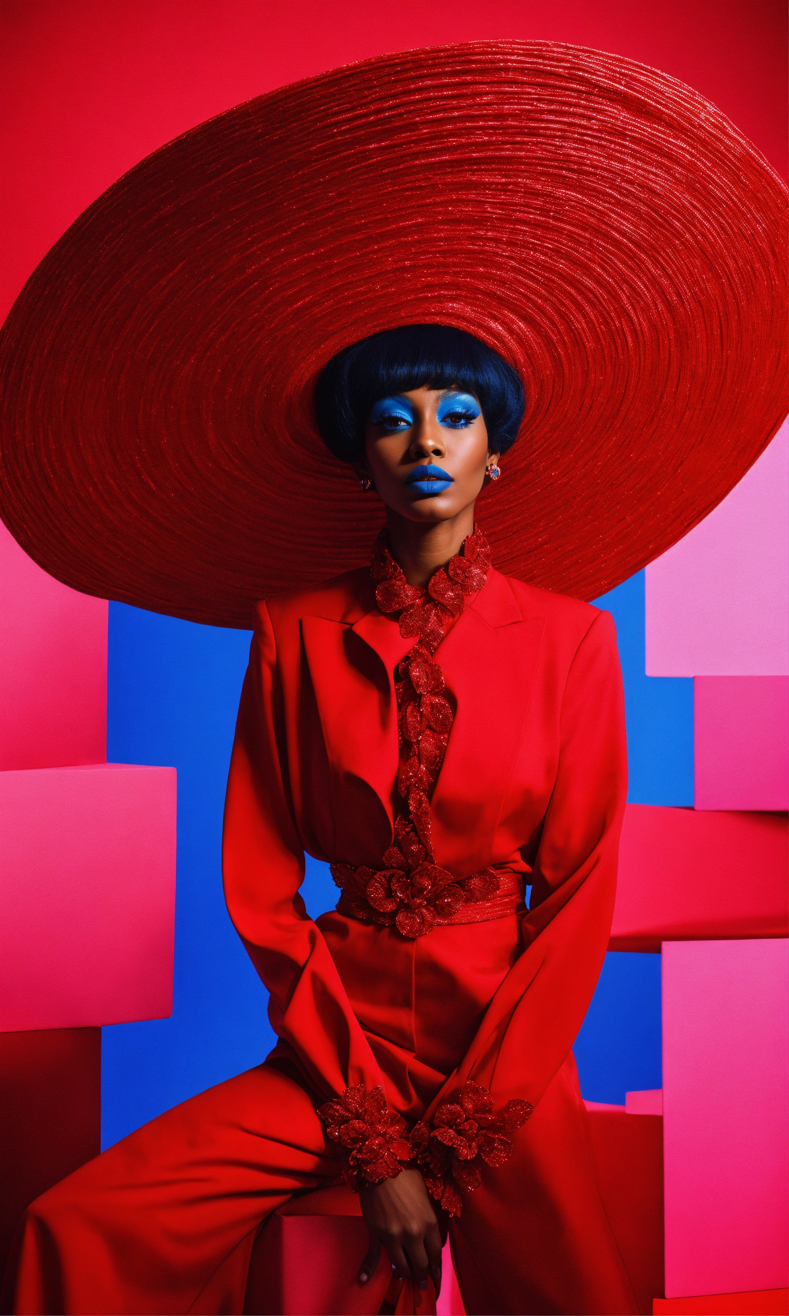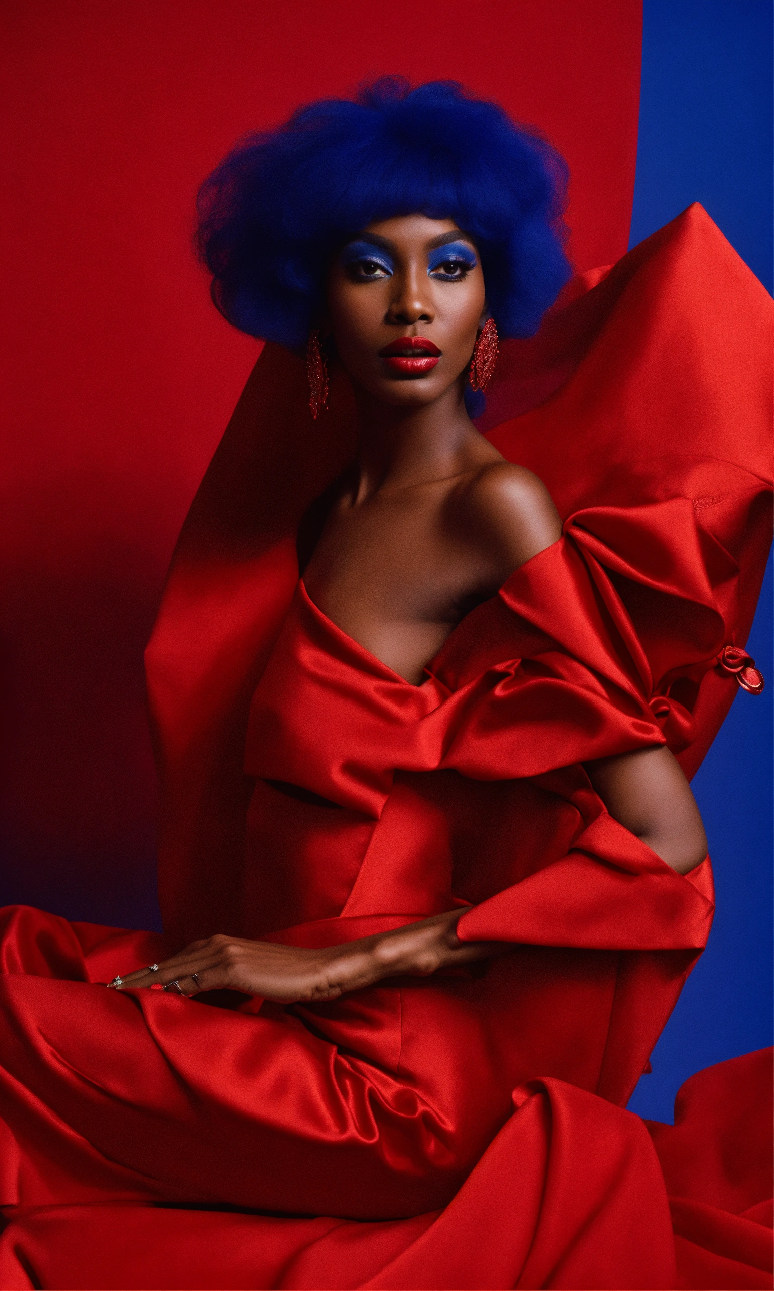 Donyale luna, 2023, avant-garde, simplyrgp, photo shoot spread, dressed in all red, blue background, harpers bizarre, cover