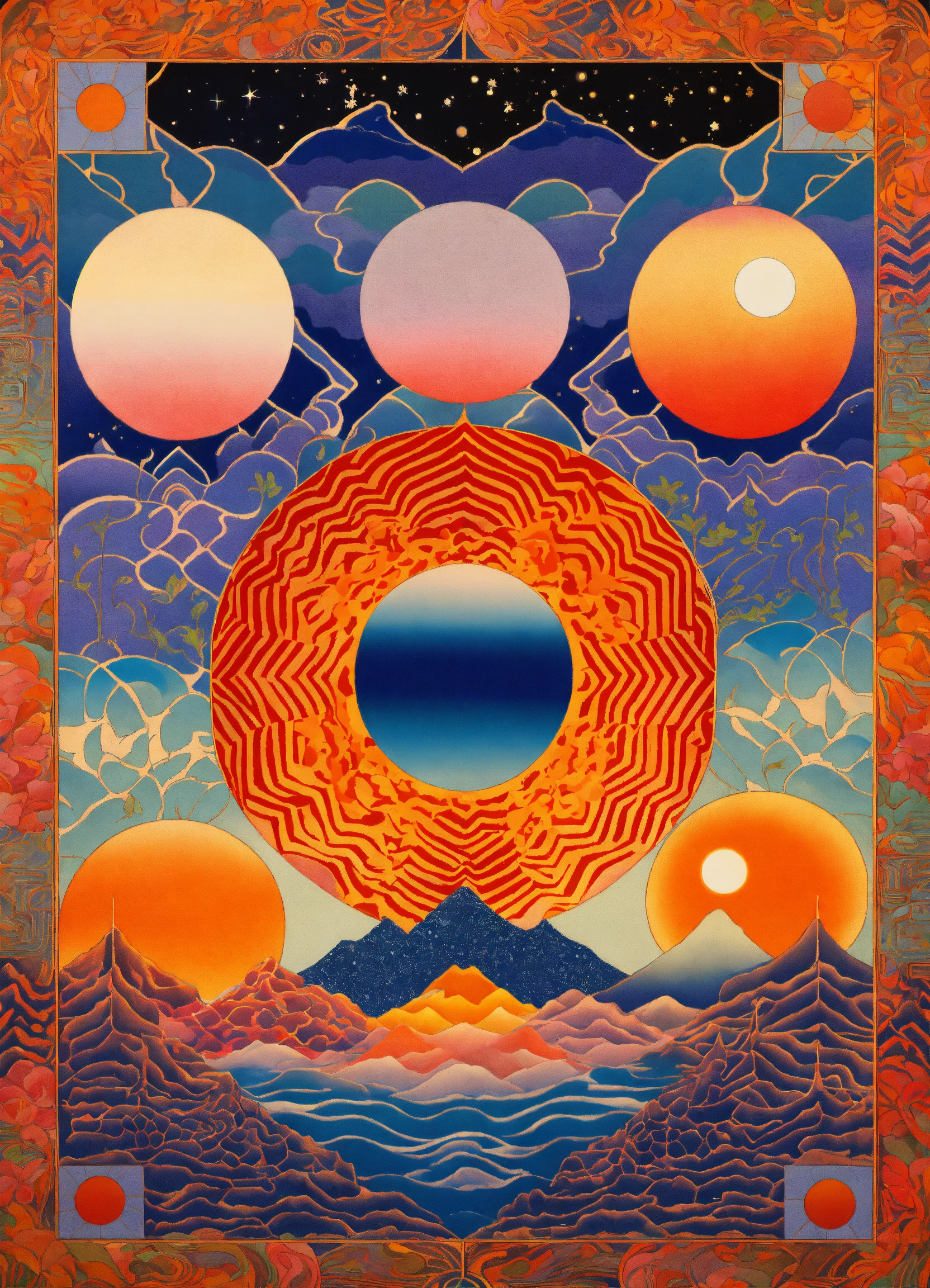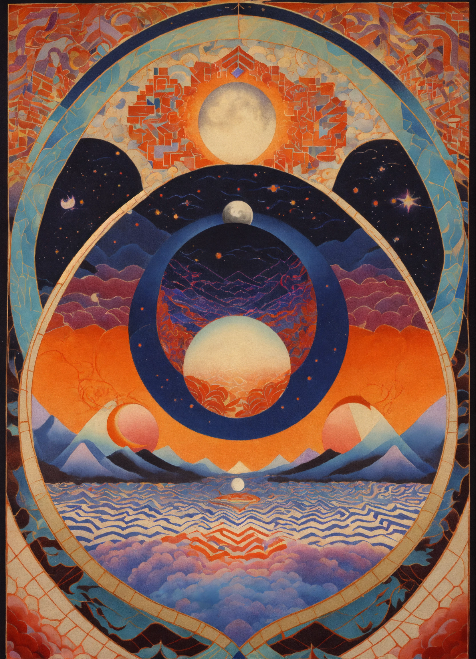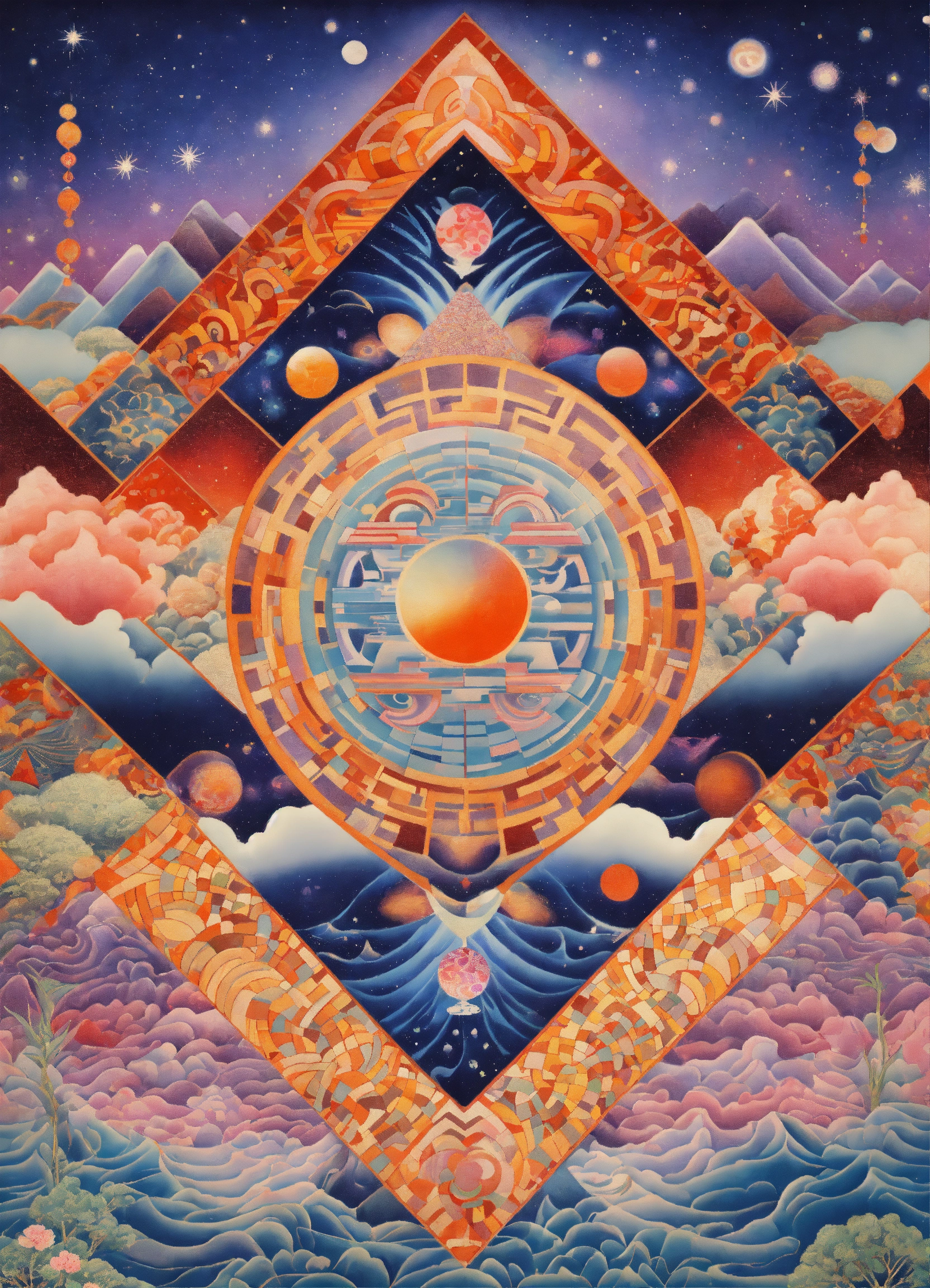 Japanese vintage poster, symmetrical chevron patterns, geometric shapes in the night sky, pastel serenity, zig zag dripping ying yang moon, checkerboard tiles, psychedelic abstract, cosmos merging into zen garden meets fantasy realm by alex grey