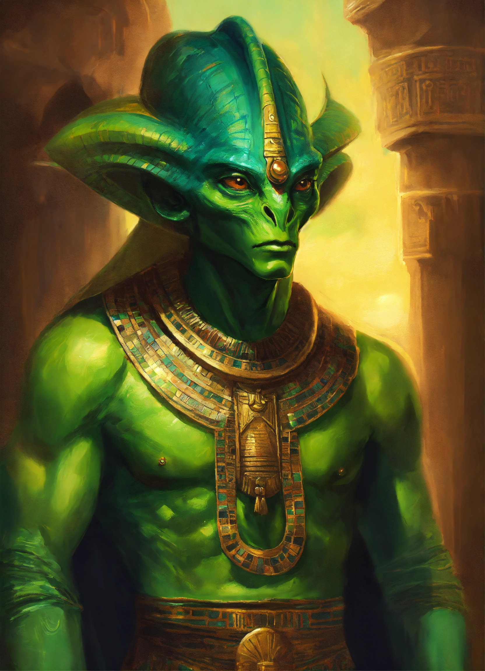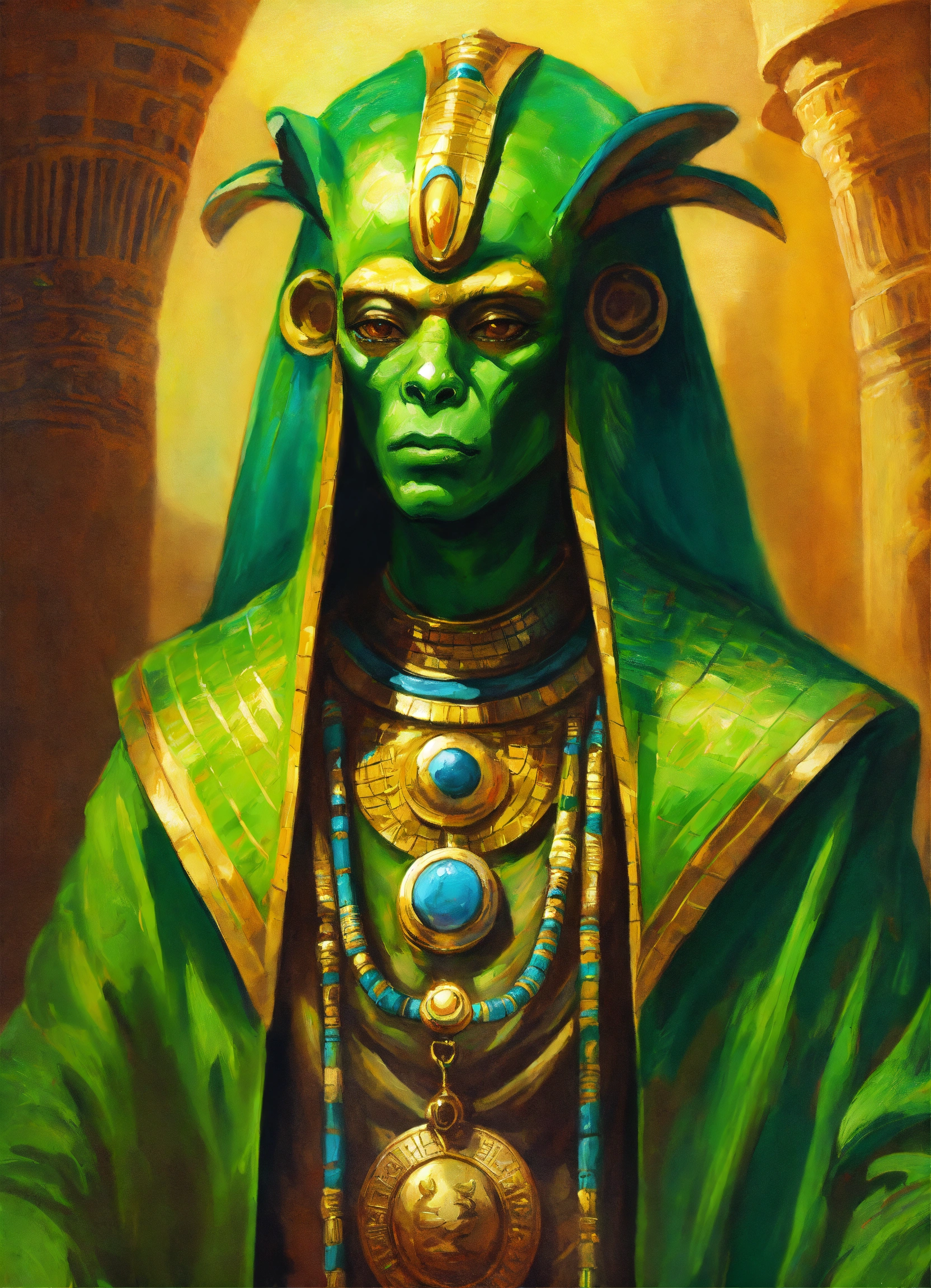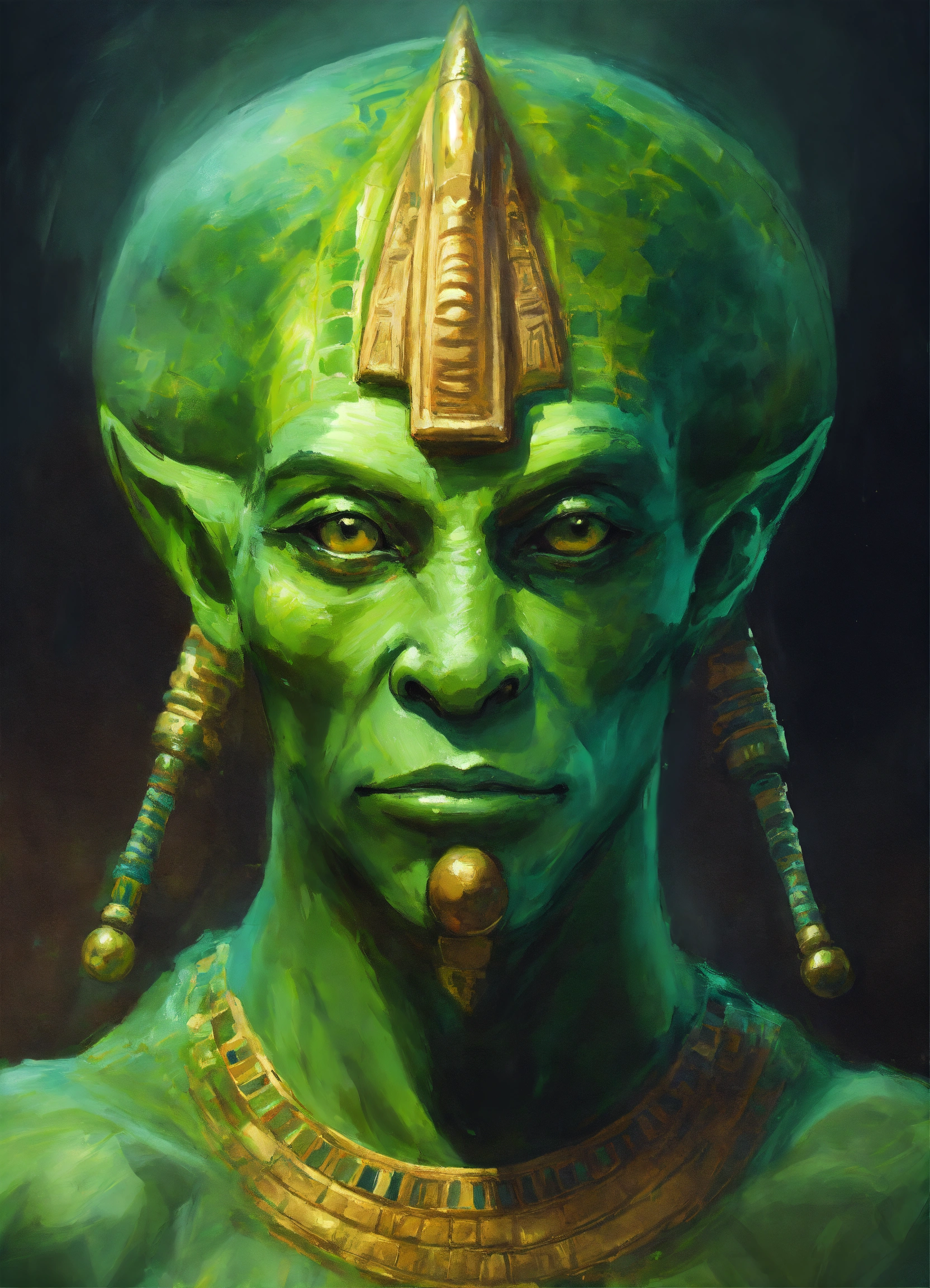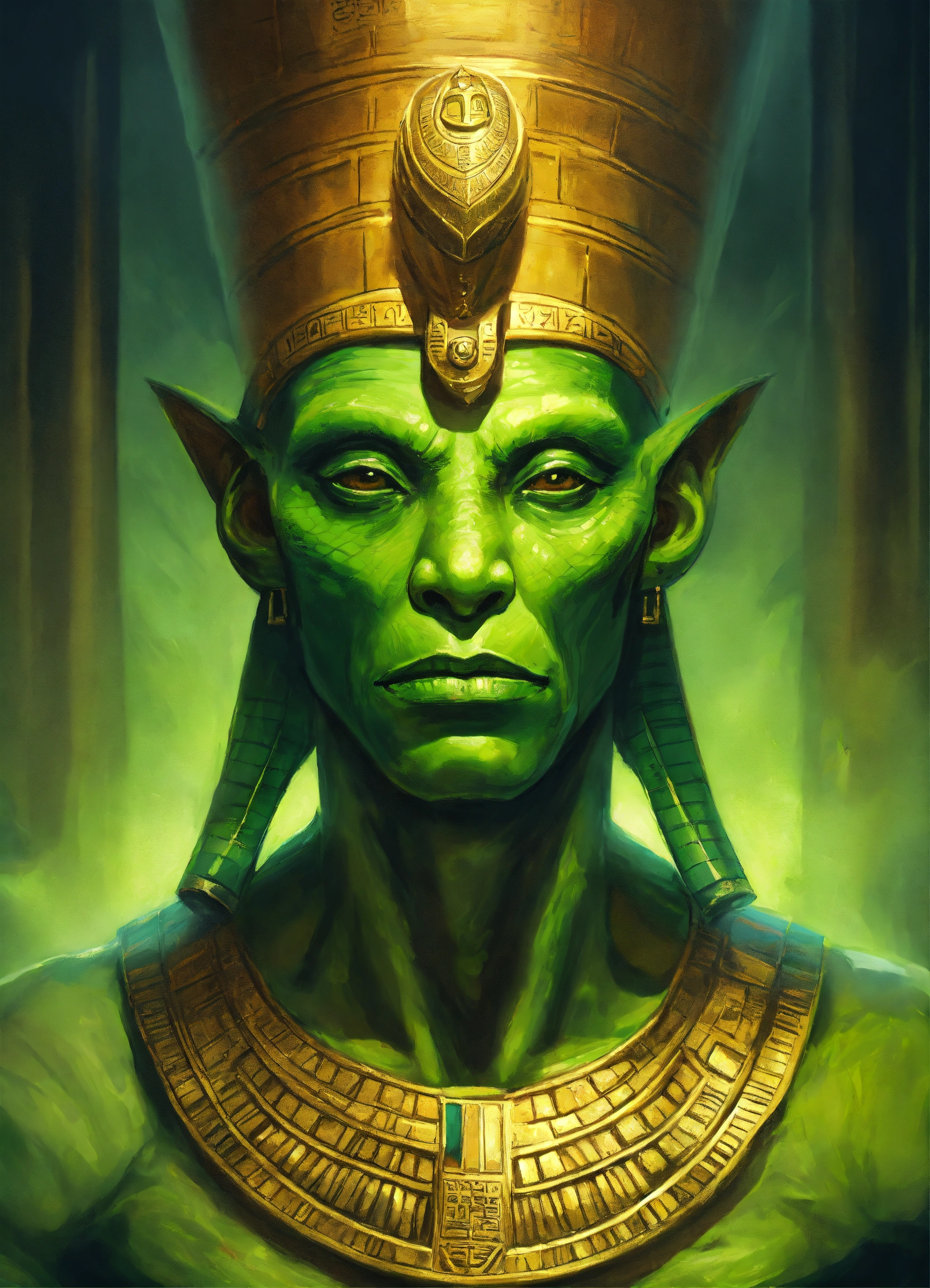 Portrait a green alien monster dressed like a ancient egypt god, oil paint, fantasy illustration --s 750