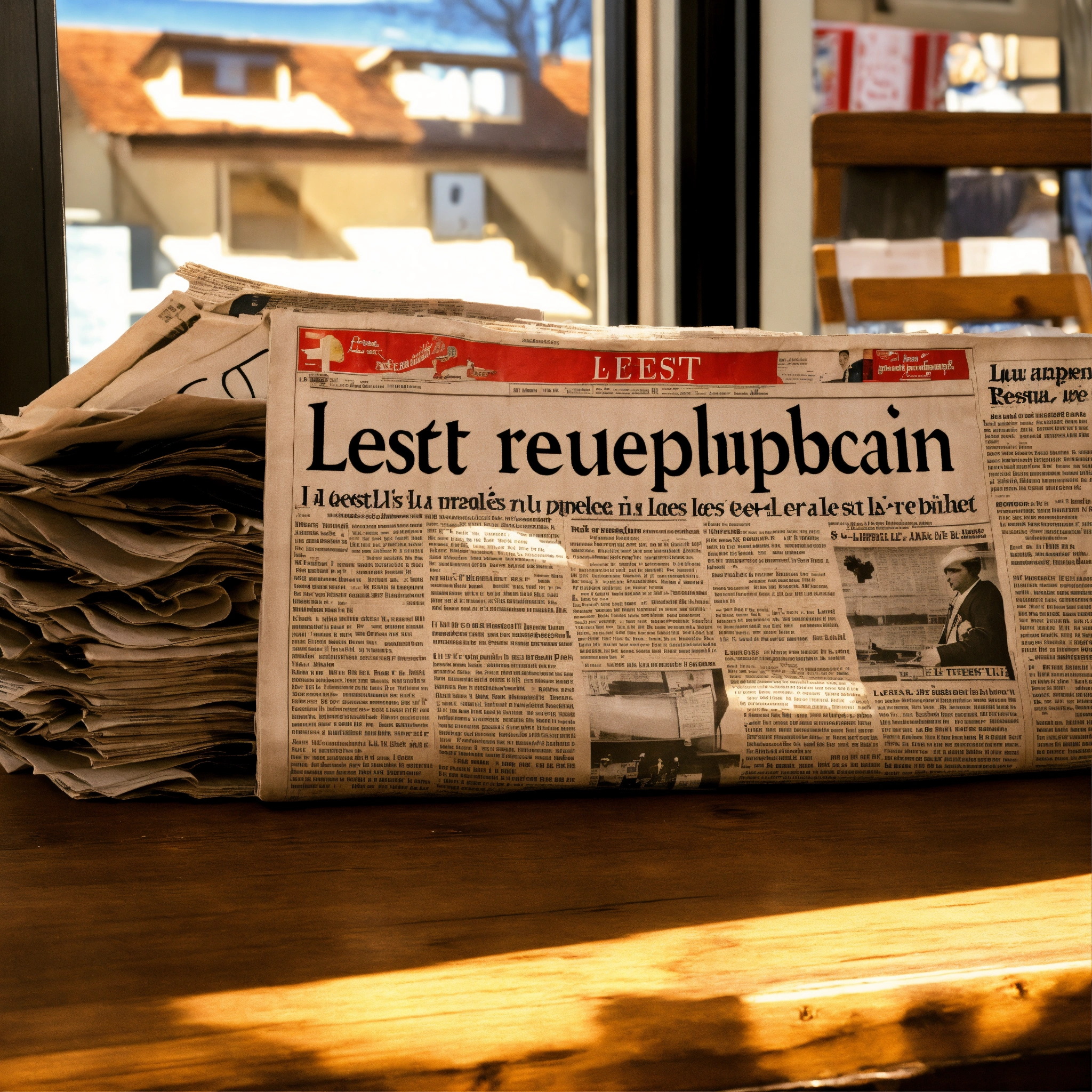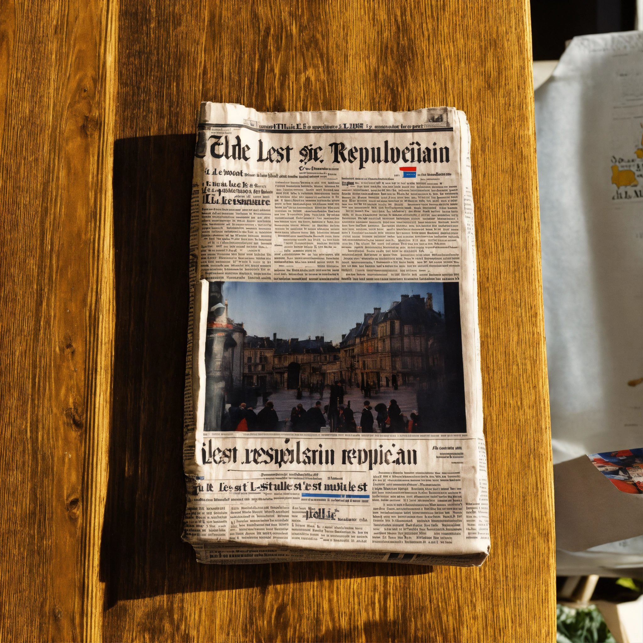 A photo of a newspaper, the newspaper is in french and is titled "l'est républicain", the newspaper is on a wooden table