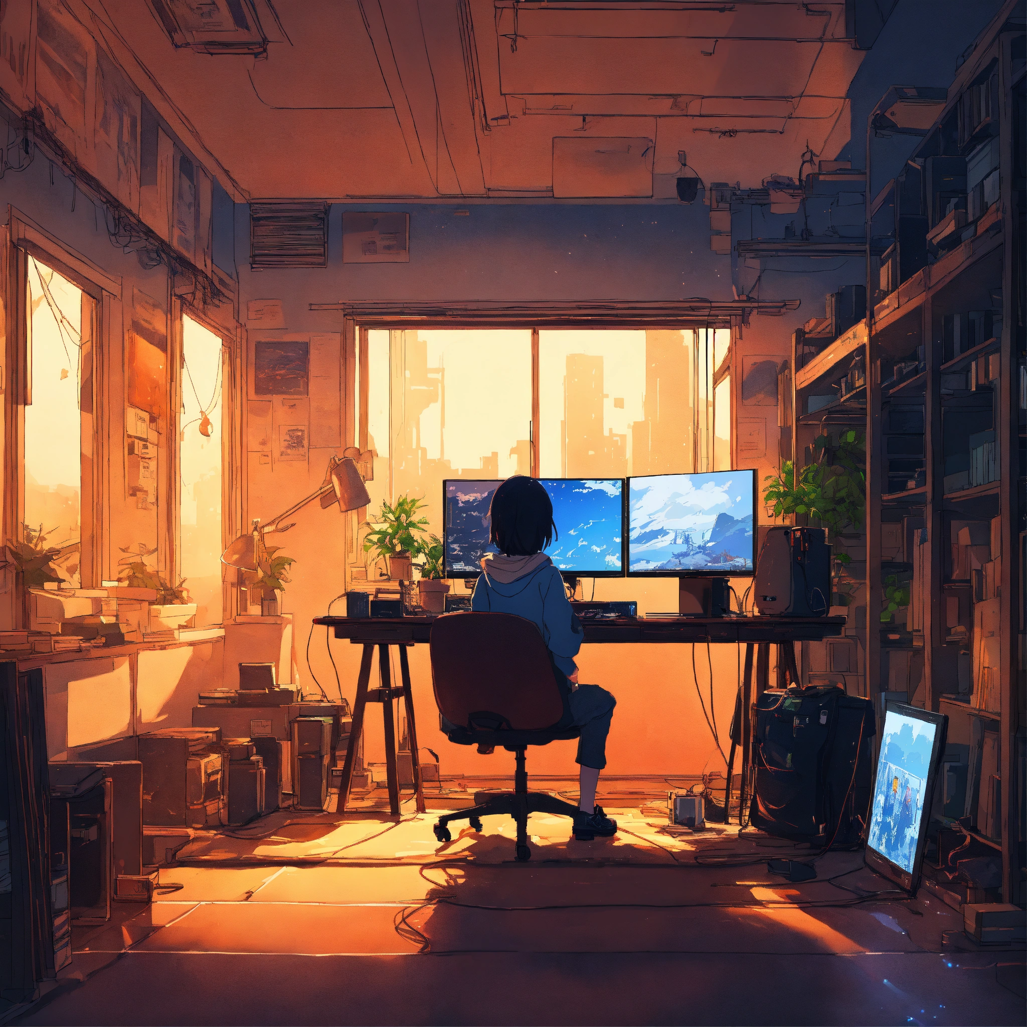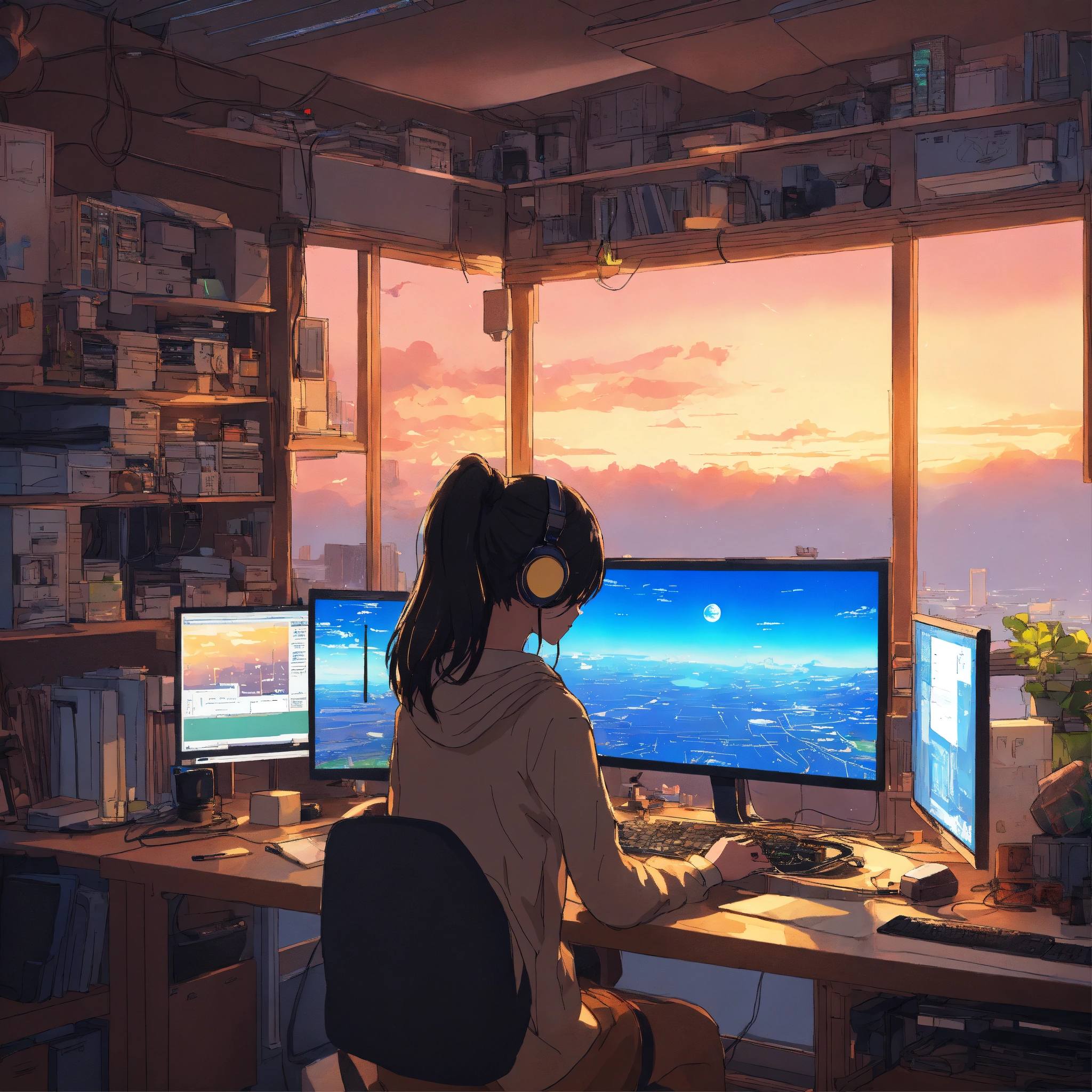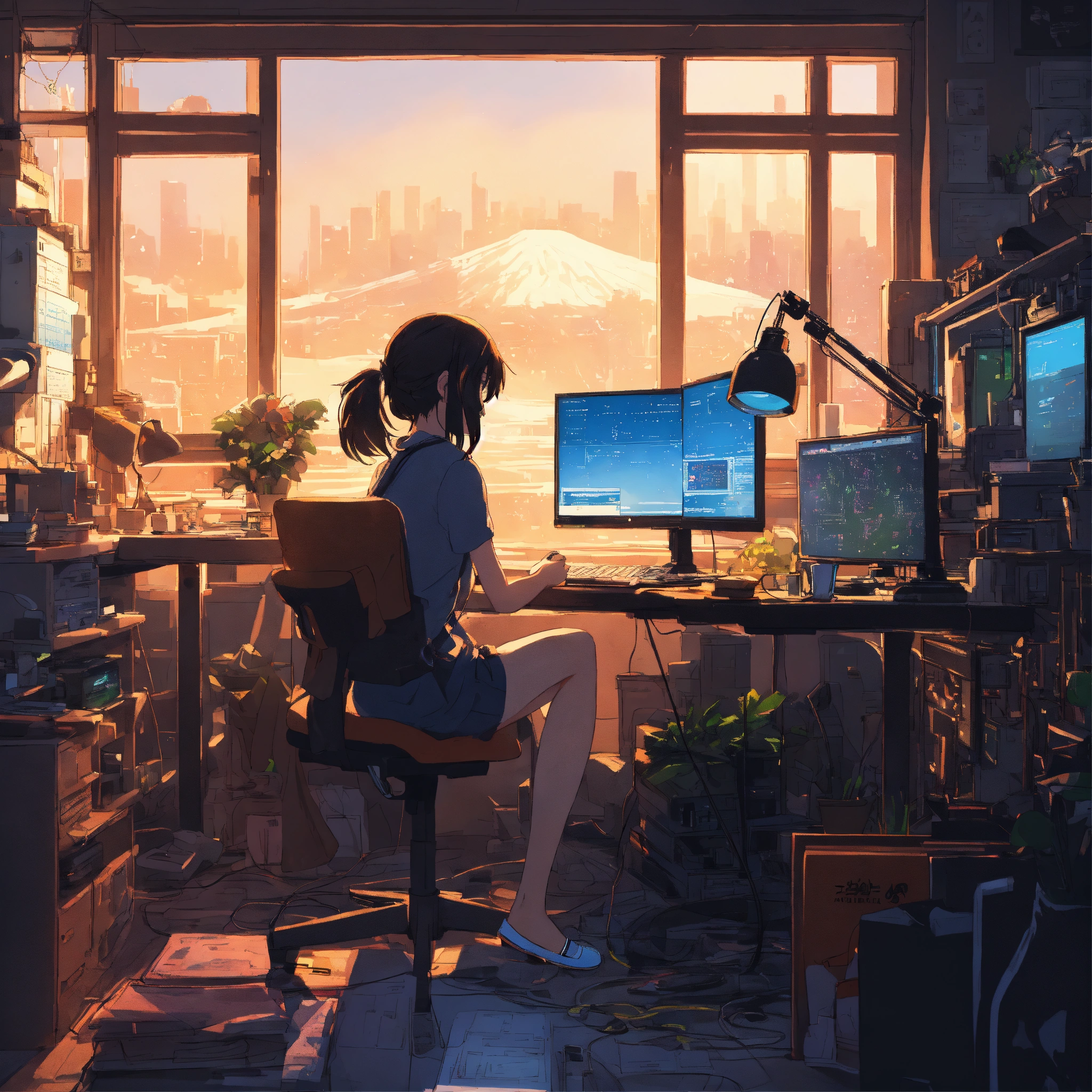 Create a high resolution artwork of lofi, anime girl is programming at a computer in a room full of gadgets, snown, web developer, by makoto shinkai and ghibli studio, outlined silhouettes, dramatic lighting, highly detailed, incredible quality, trending on artstation, masterpiece, 8k, 2 monitors, book and a pen