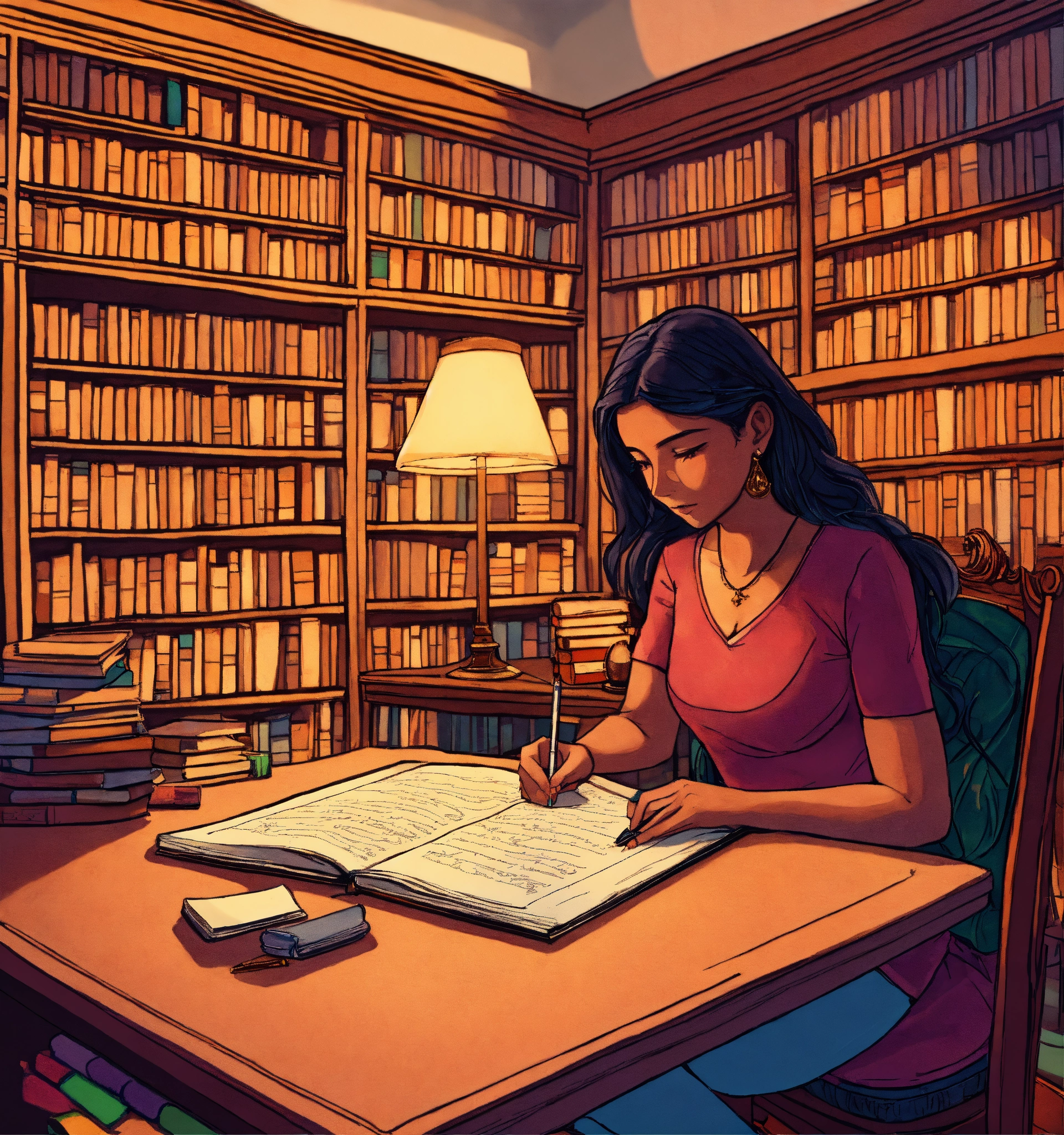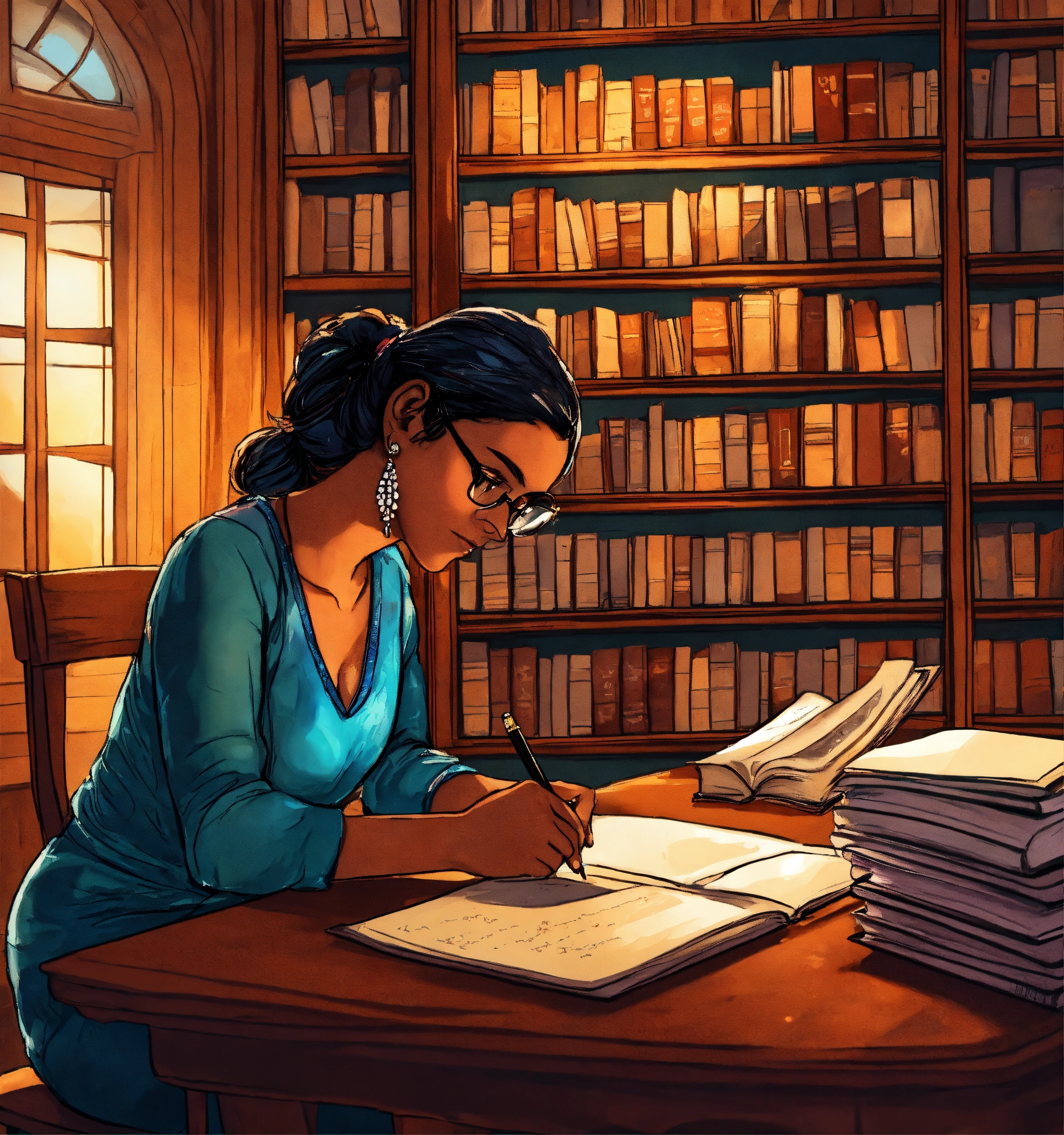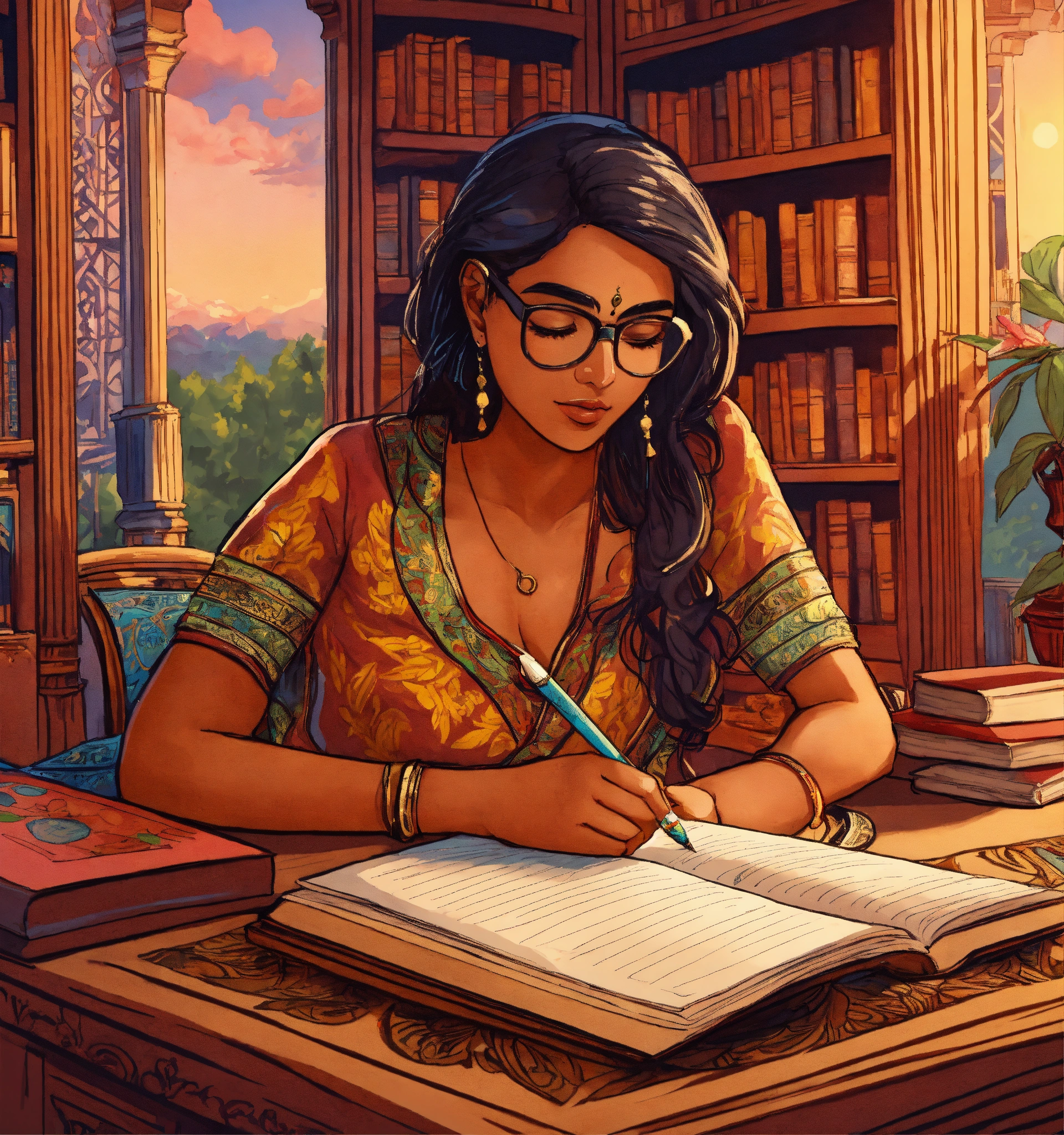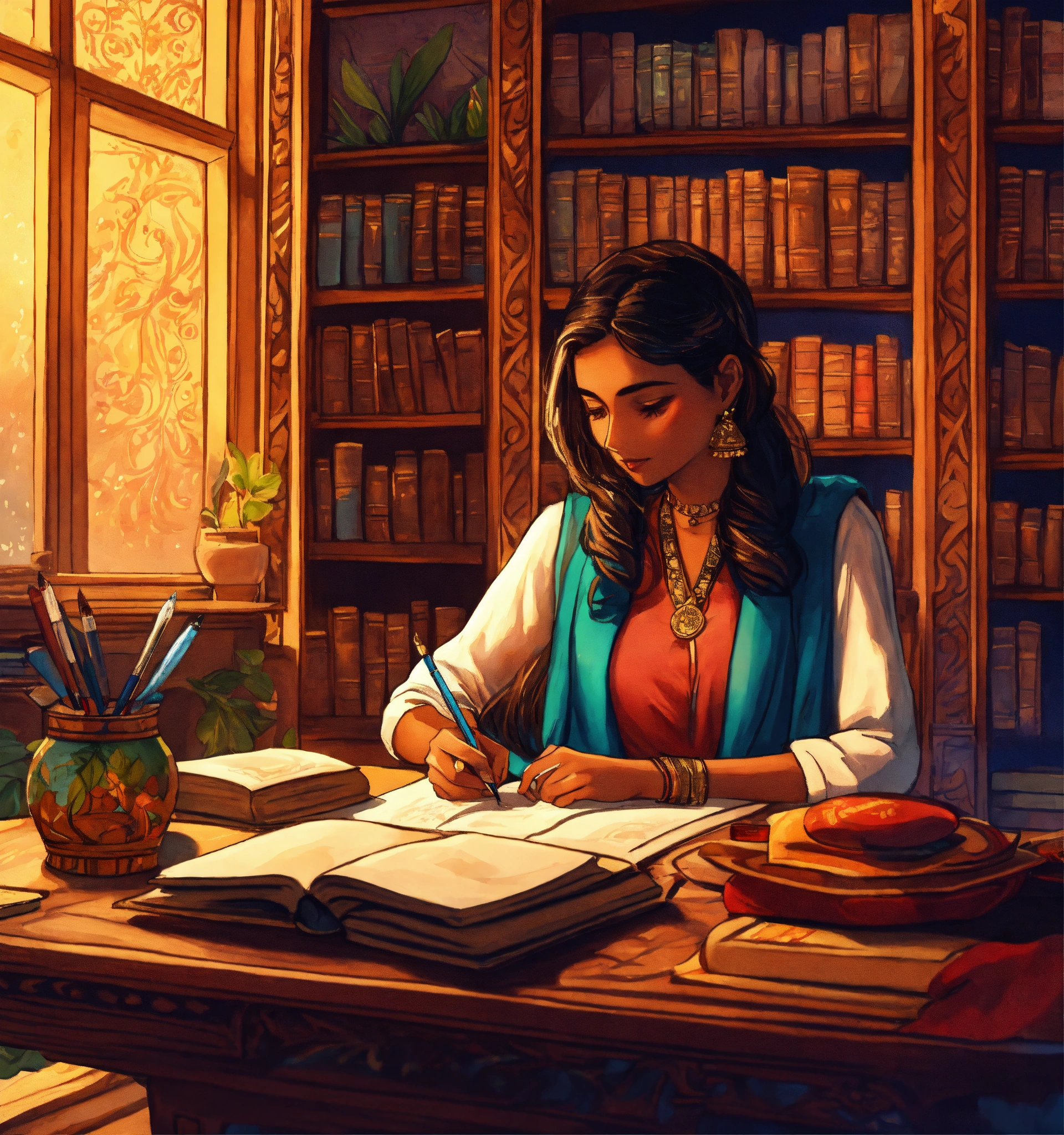 A hand drawn painting of a young indian author writing her new book, manuscript written so far is kept on the table, she is busy in writing, she is sitting on a table and chair inside her large english style library. 8k, wide-angle, sharp, highly detailed, vibrant, vivid