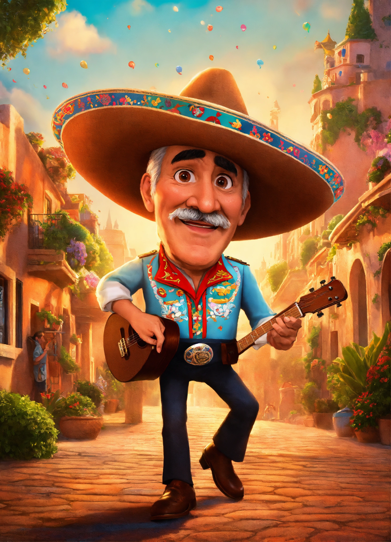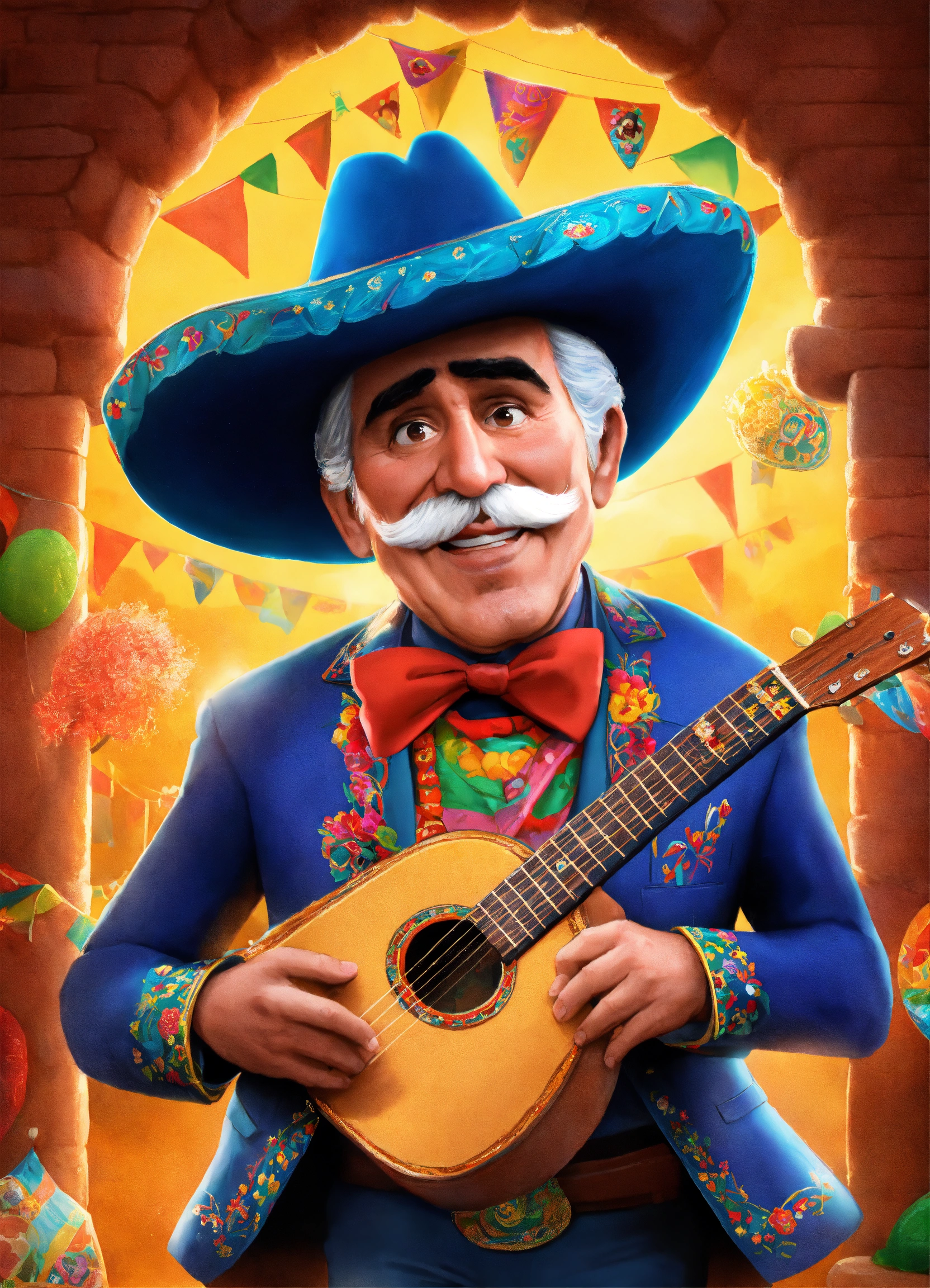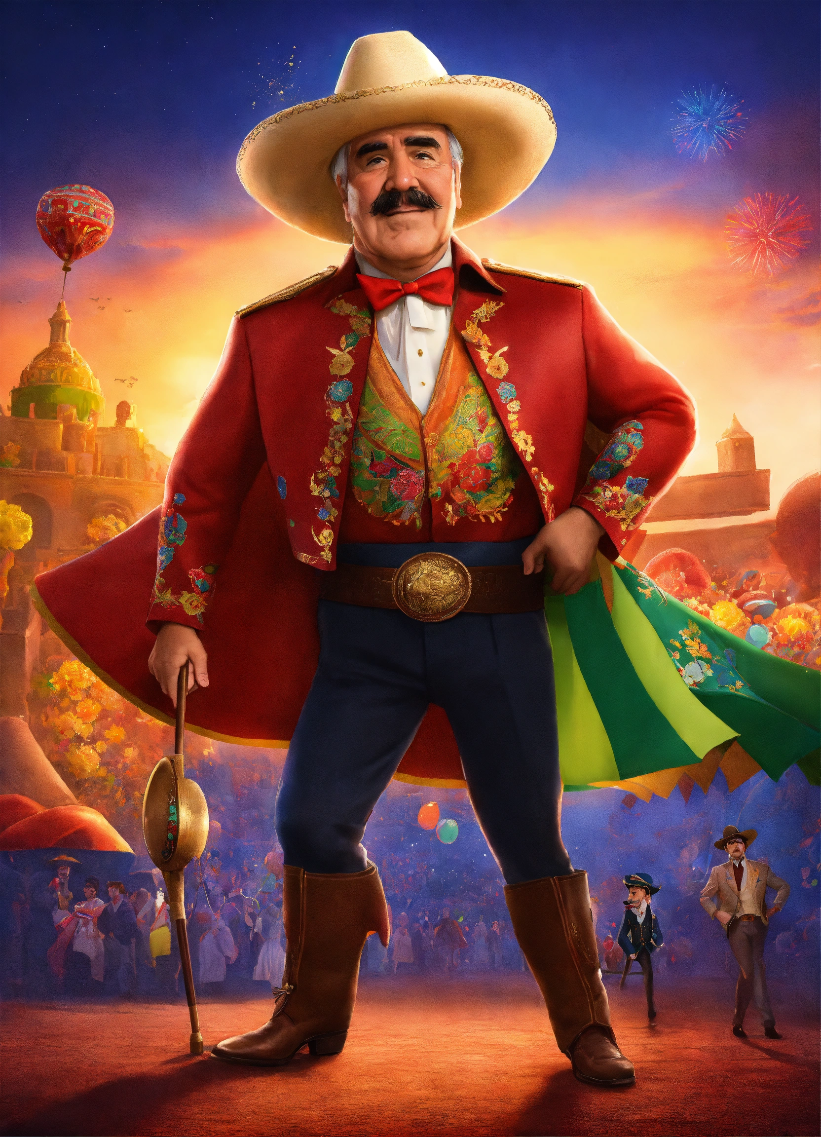 Vicente fernandez caminando hacia una fiesta mexicana, con estilo de poster de película de disney pixar, realista