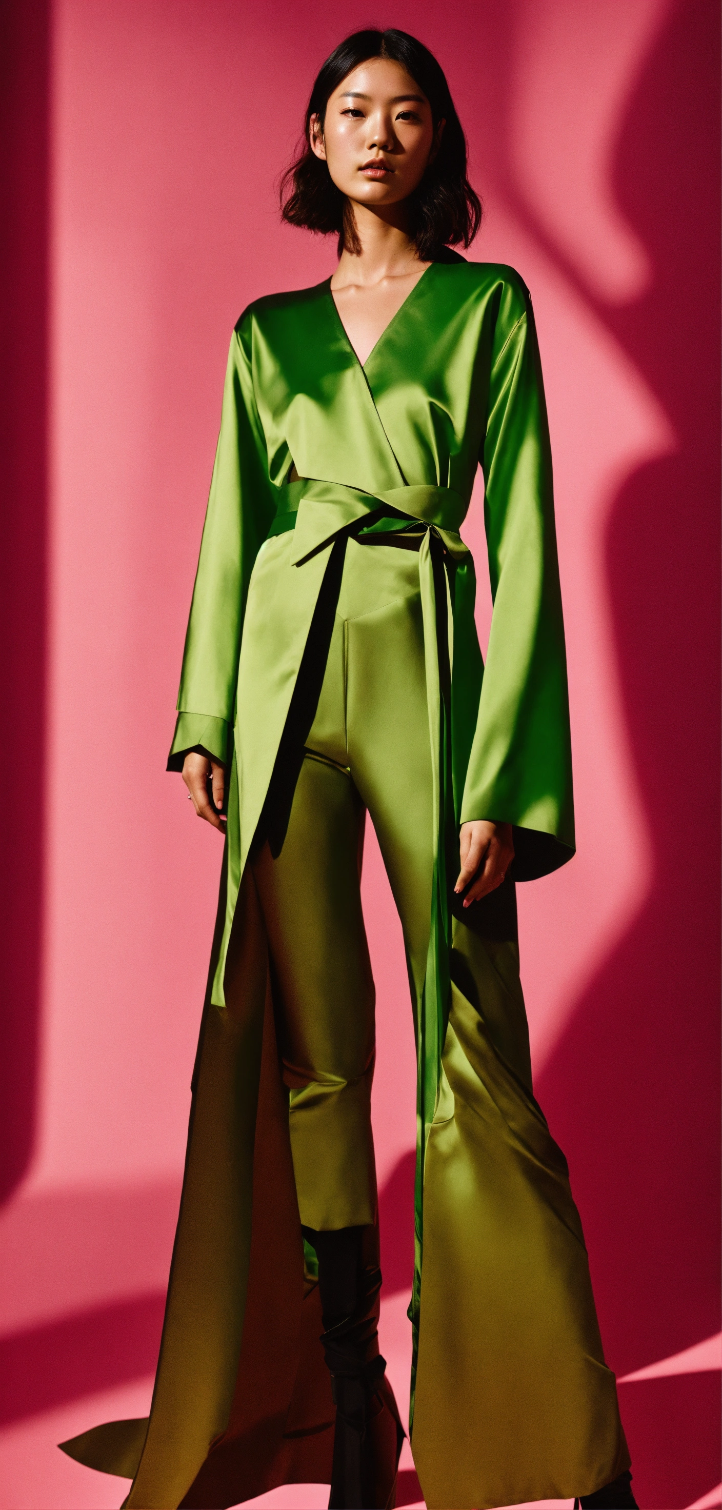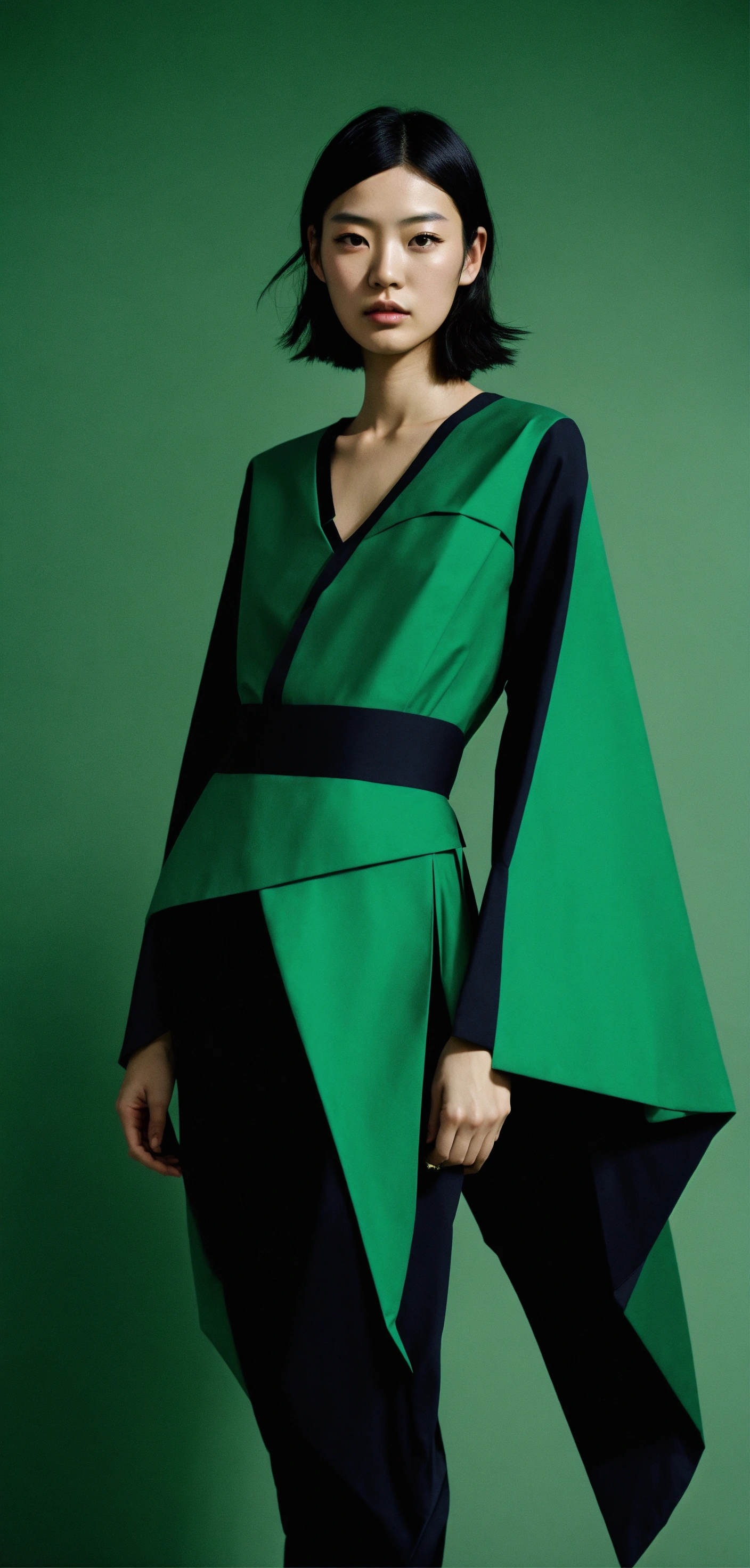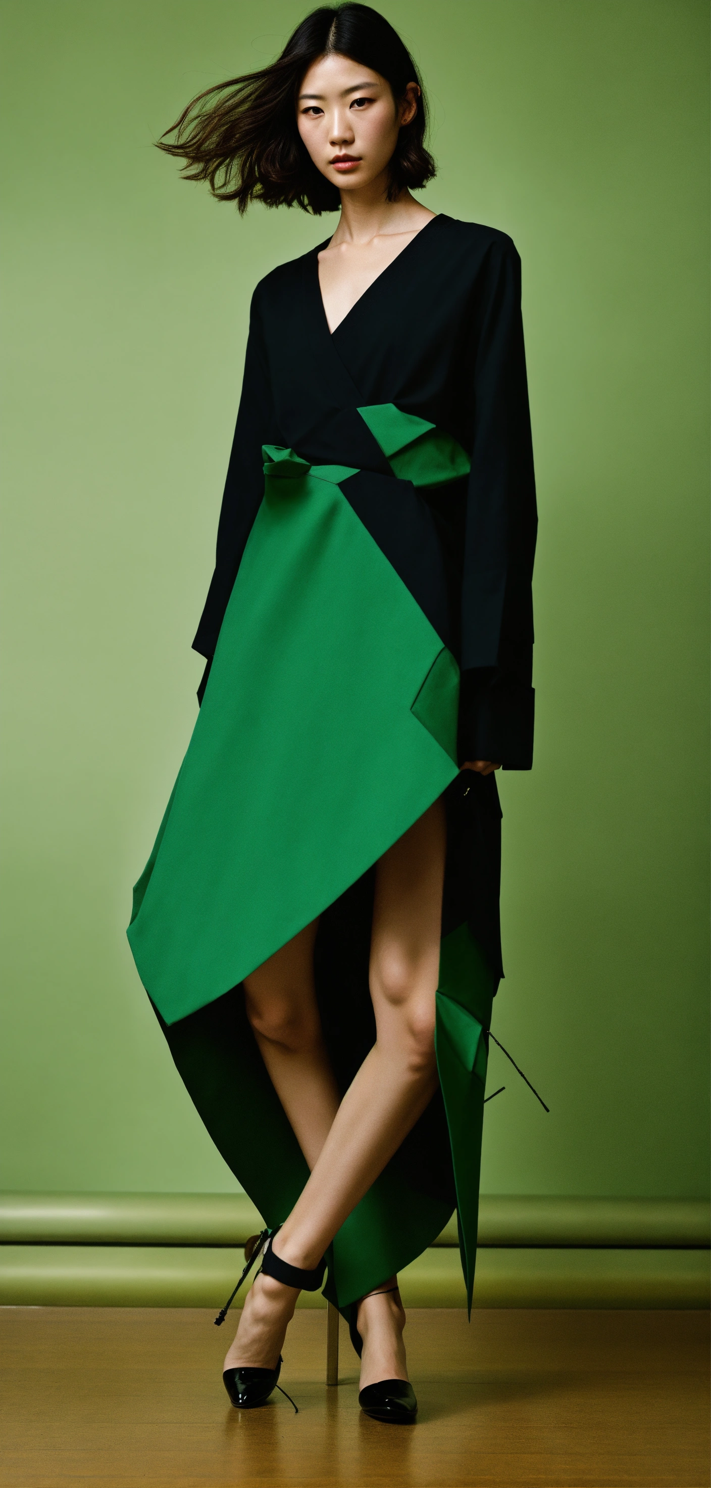 A low-angle wide shot of a japanese model in a black and green, cotton, v-neck, high-low, low in the front with the train, long sleeve inspired by origami, shot in the studio, studio shot, high fashion photography, in a photograph of alasdair mclellan