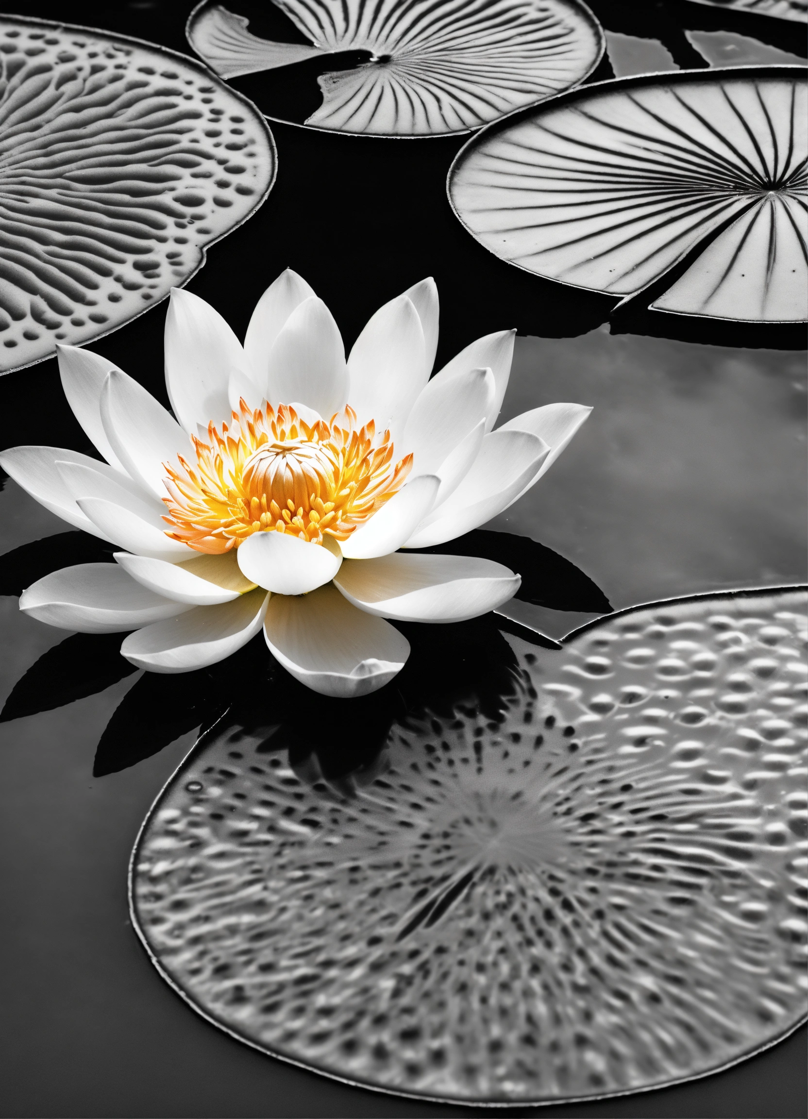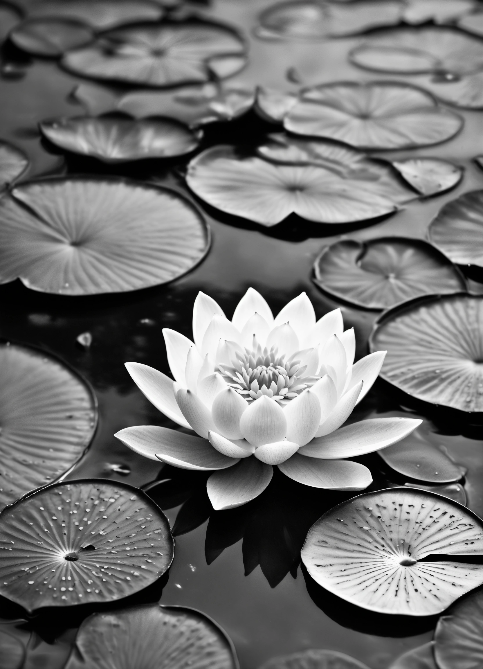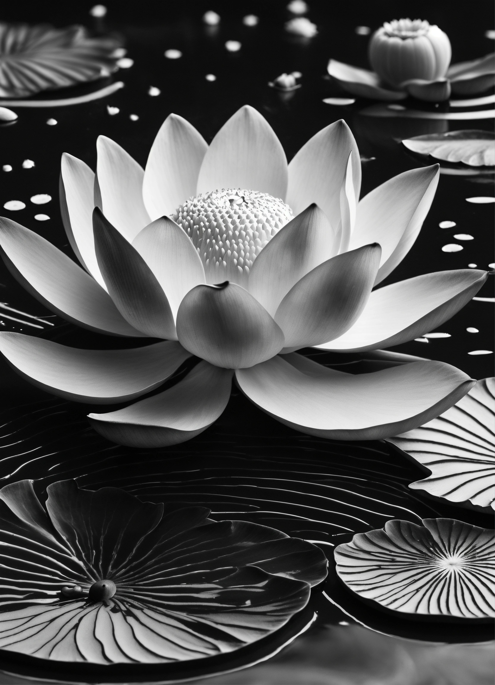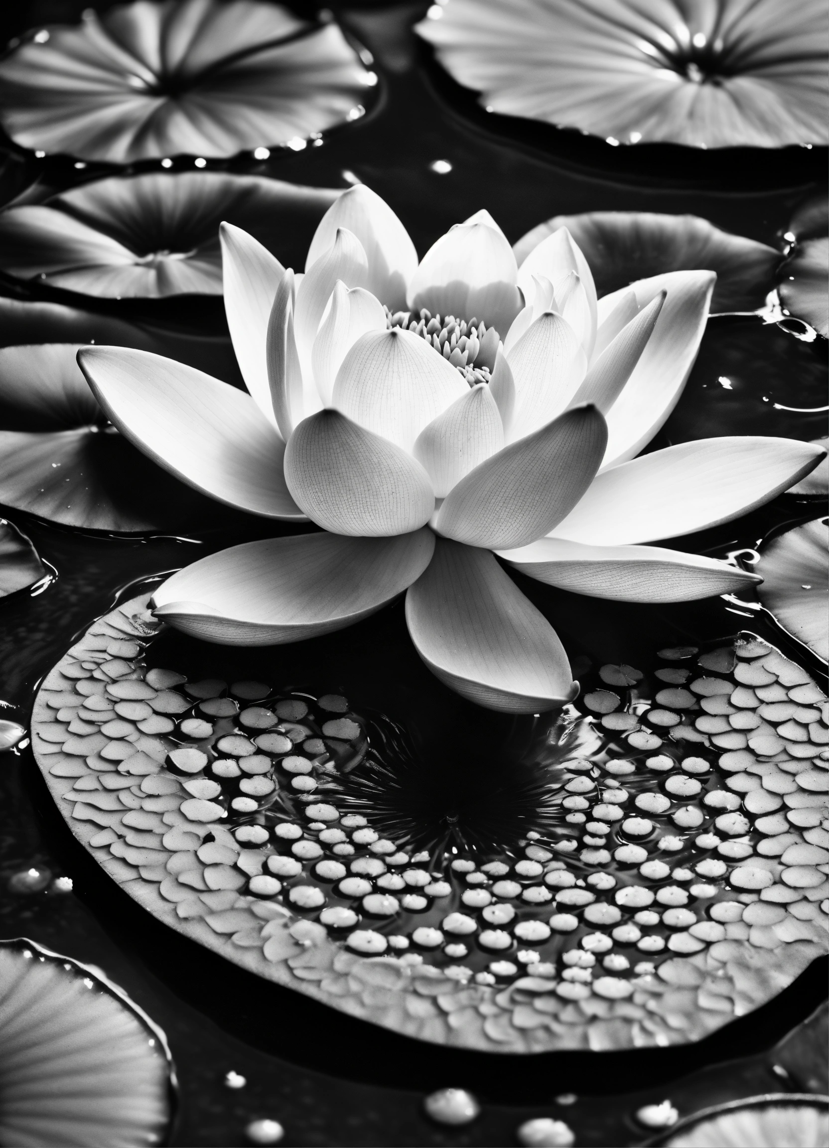 Create embossed stippled 3d art, a single lotus 🪷 in a pond with a koi at the surface for food, embossed dots on white background, greyscale, black and white