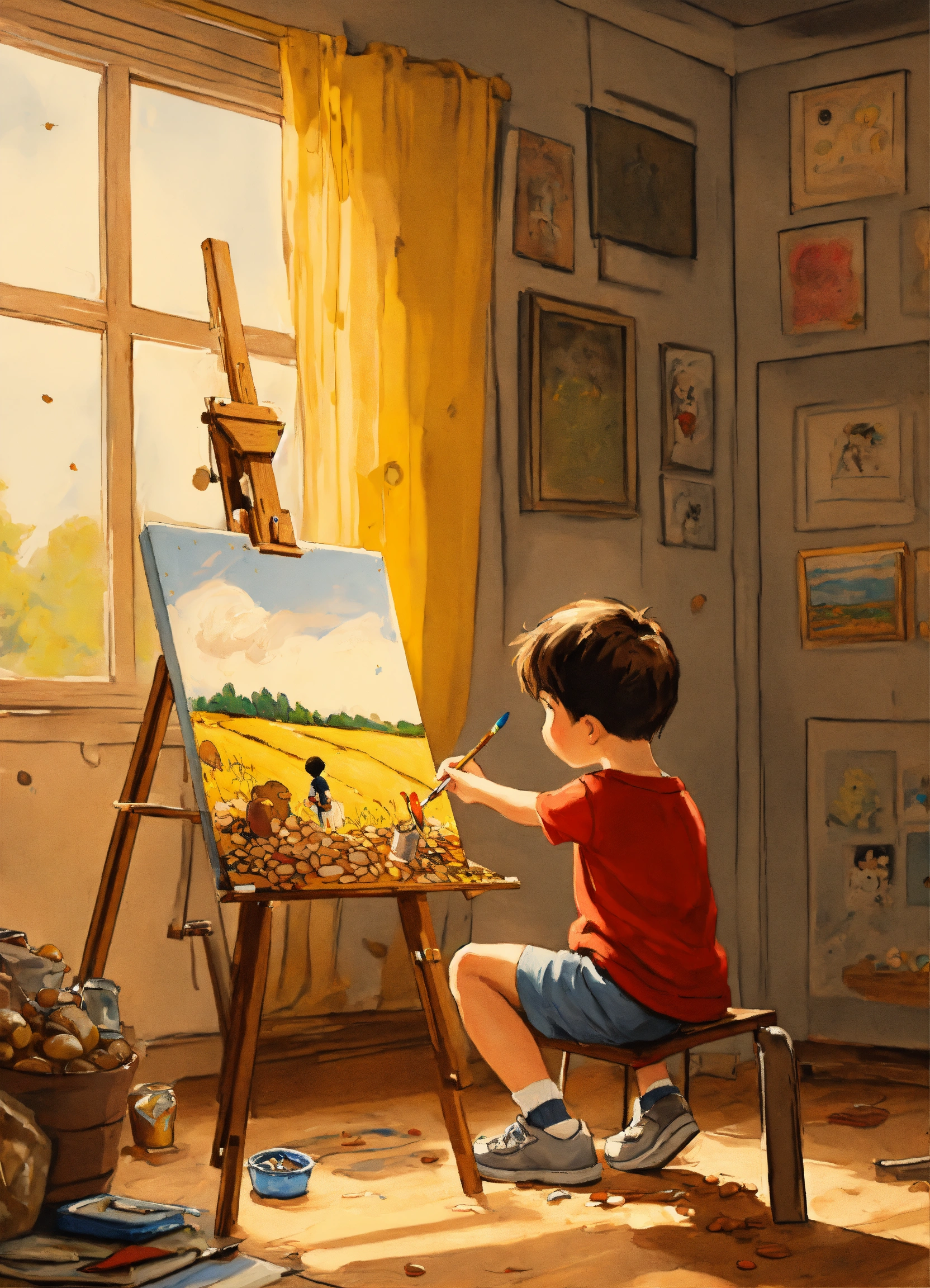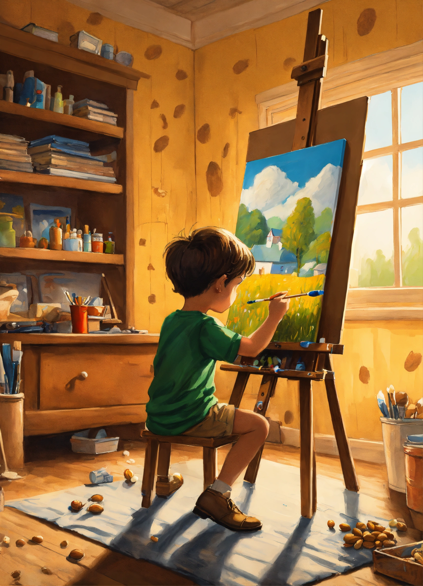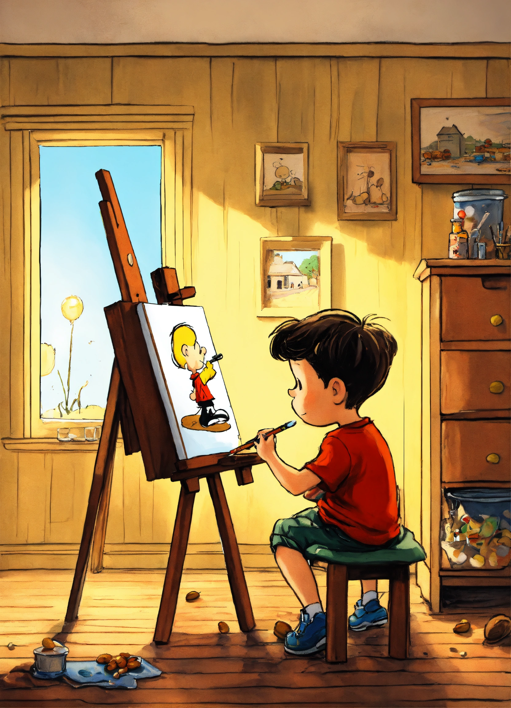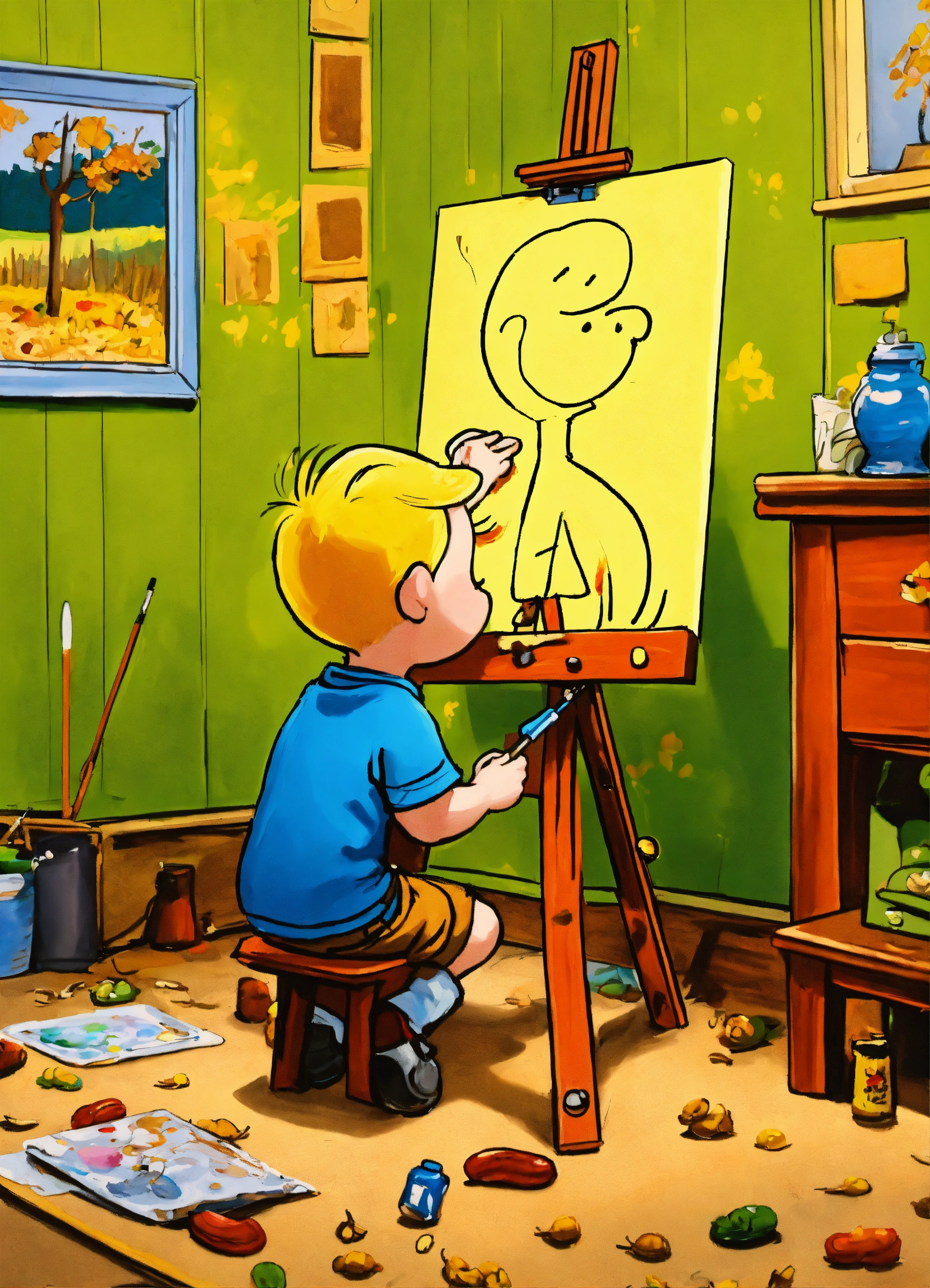 A boy painting on a canvas in his room, easel, oil paint, peanuts style illustration by charles schulz, perfect coloring, 8k