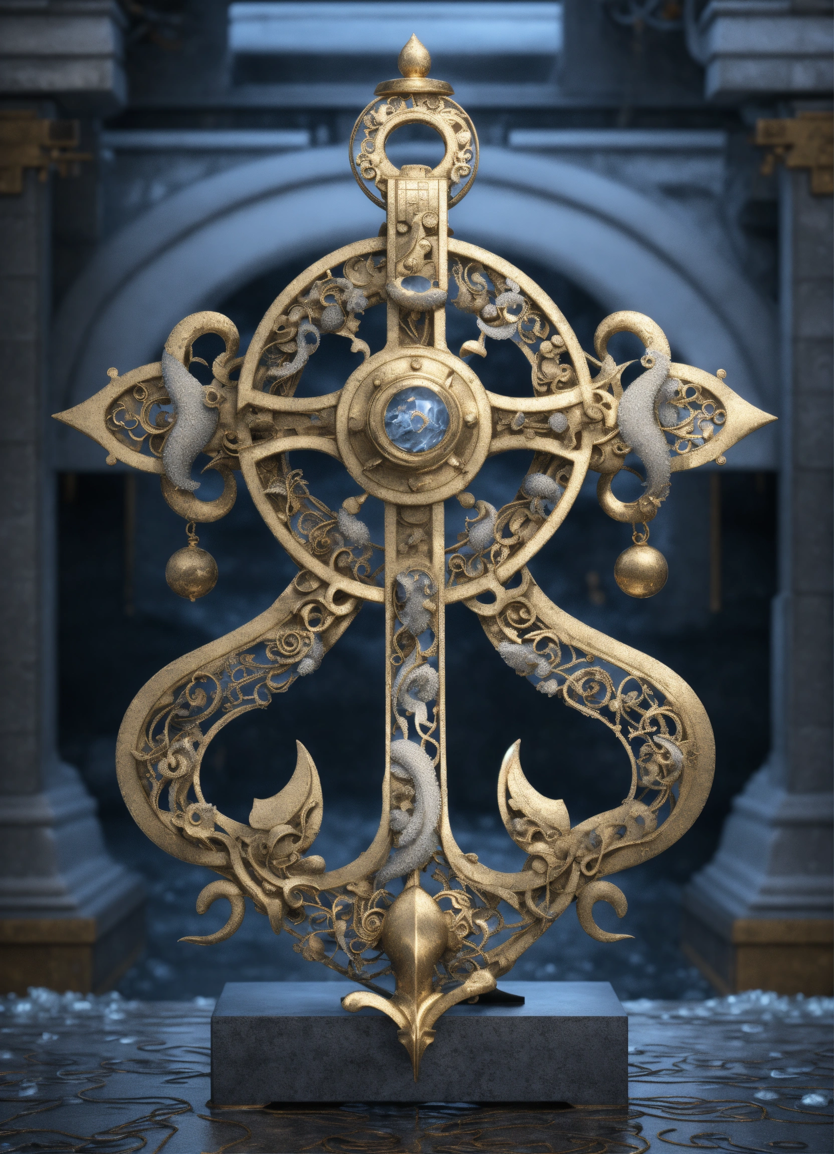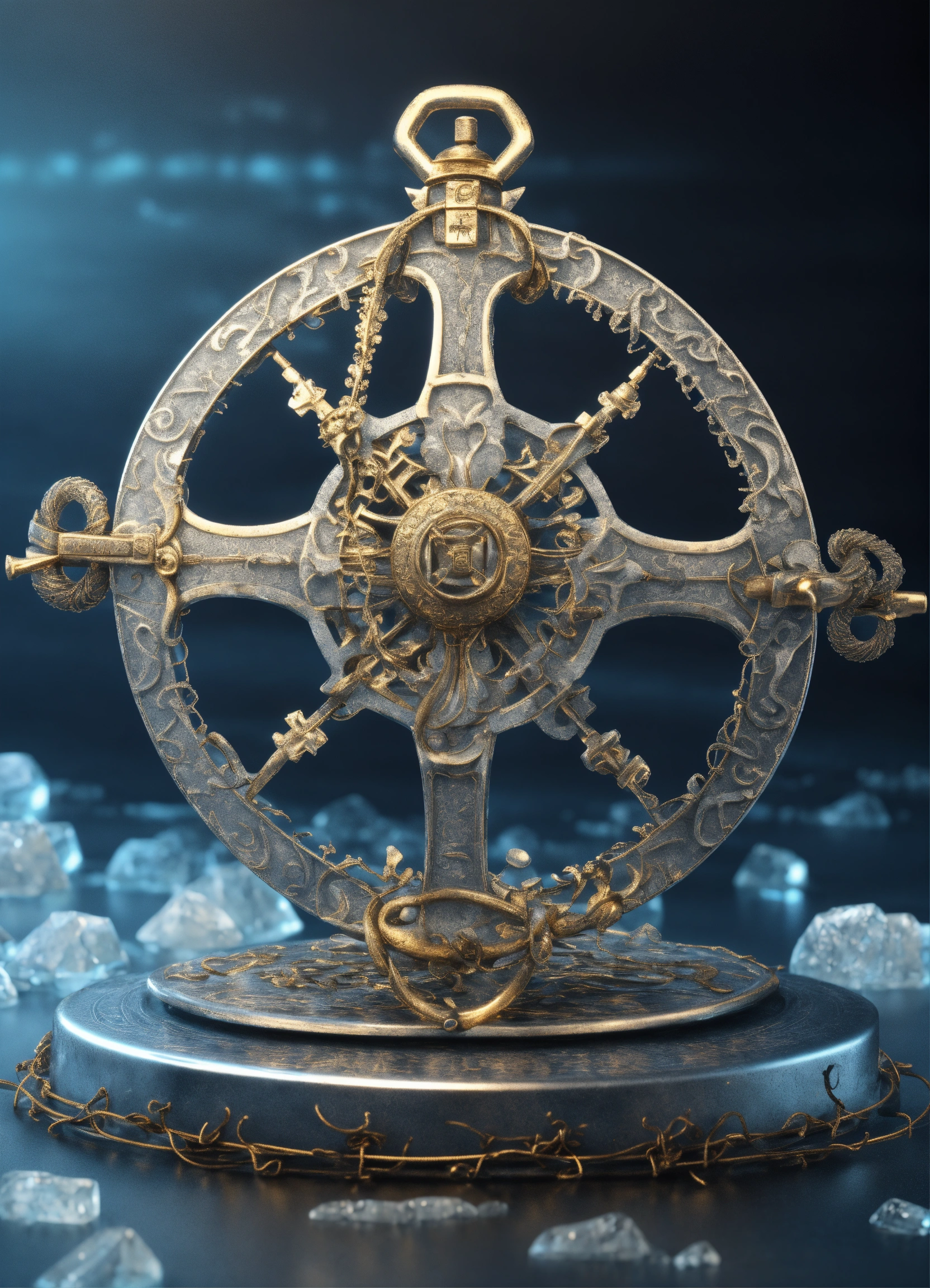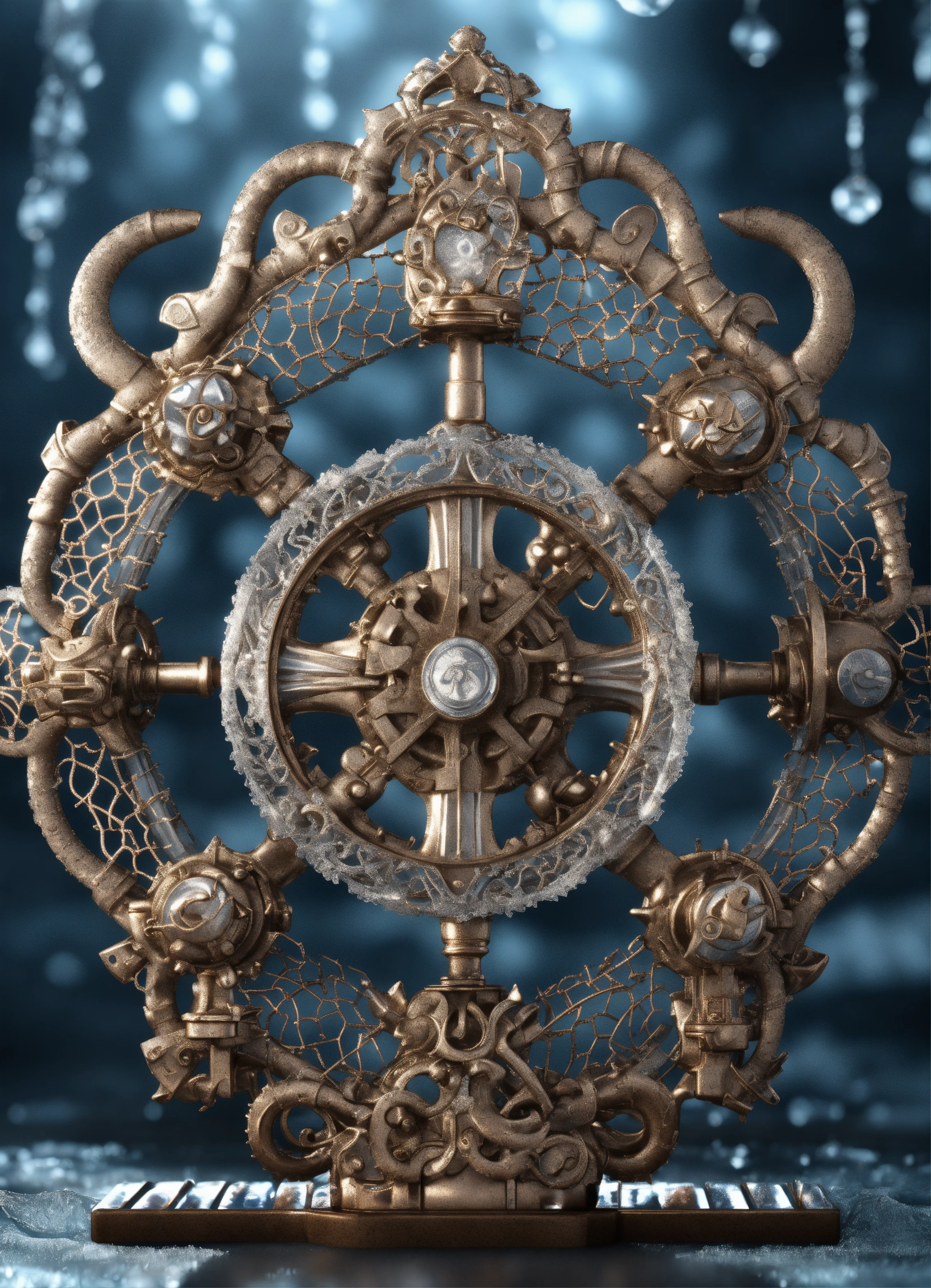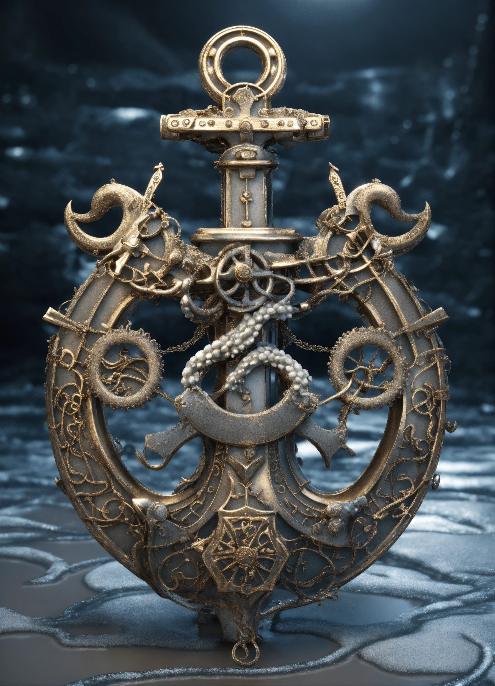 Complex 3d render ultra detailed of an edo period anchor, ice background, ice backdrop, octopus motif, ford hallam style, shibiuchi metal texture, tsuba, iron, silver, silver material, intricate details, mesh wire, mandelbrot fractal, cable wires, microchip, elegant, hyper realistic, ultra detailed, octane render, volumetric lighting, 8k post-production