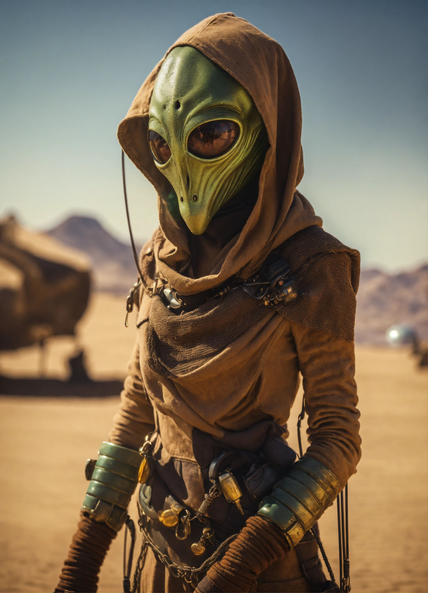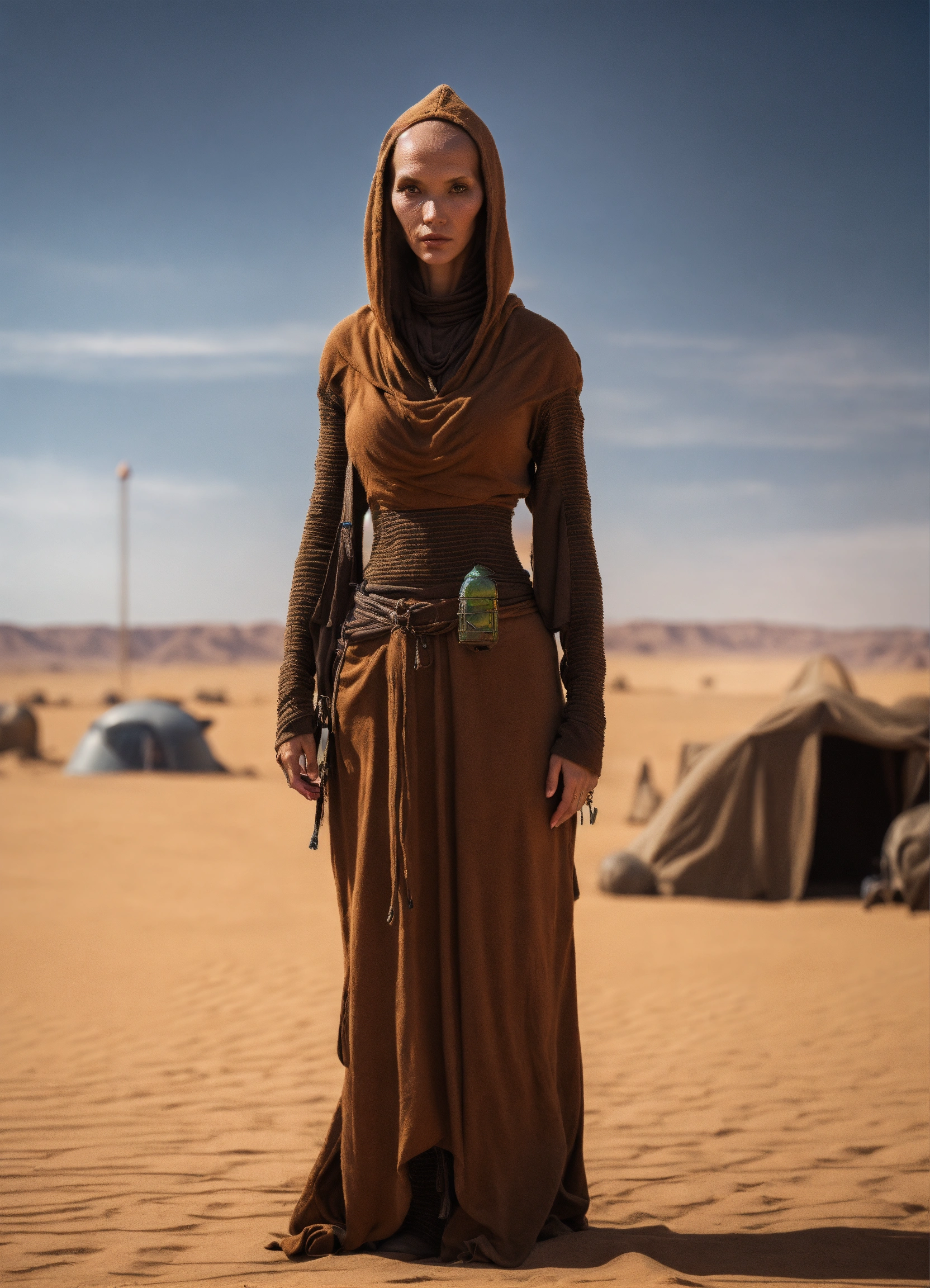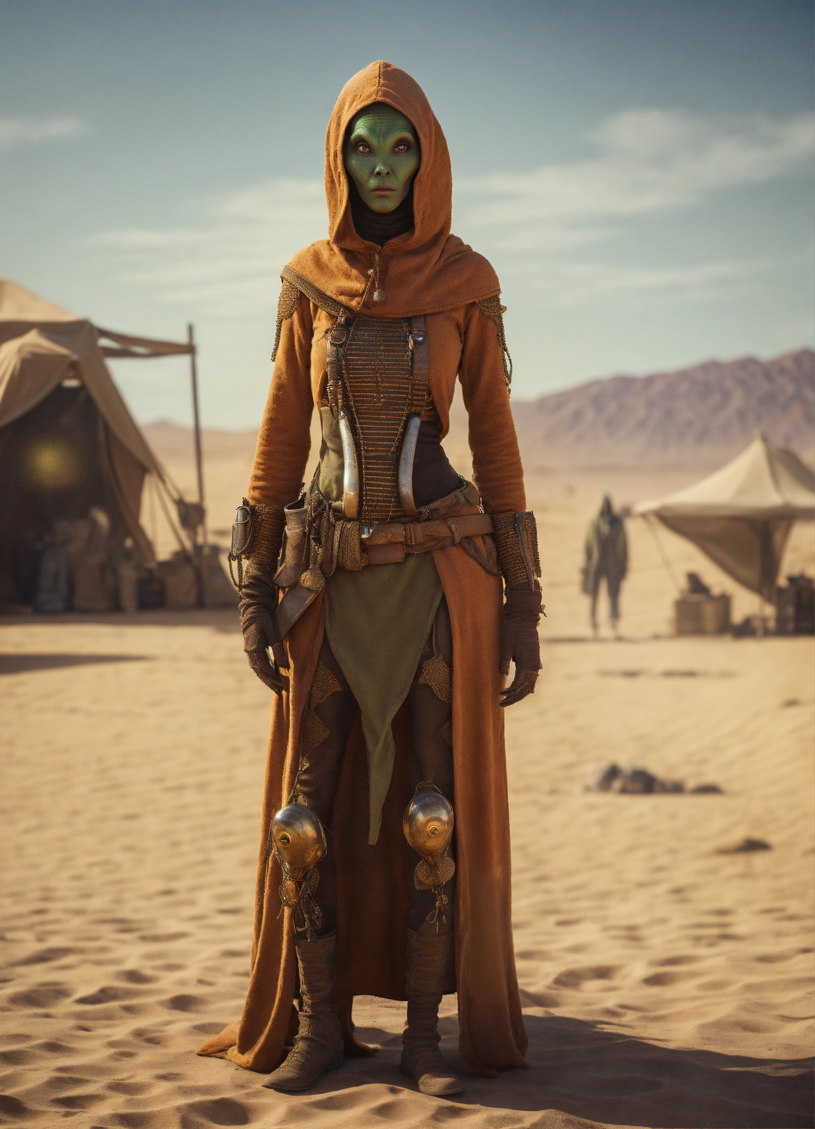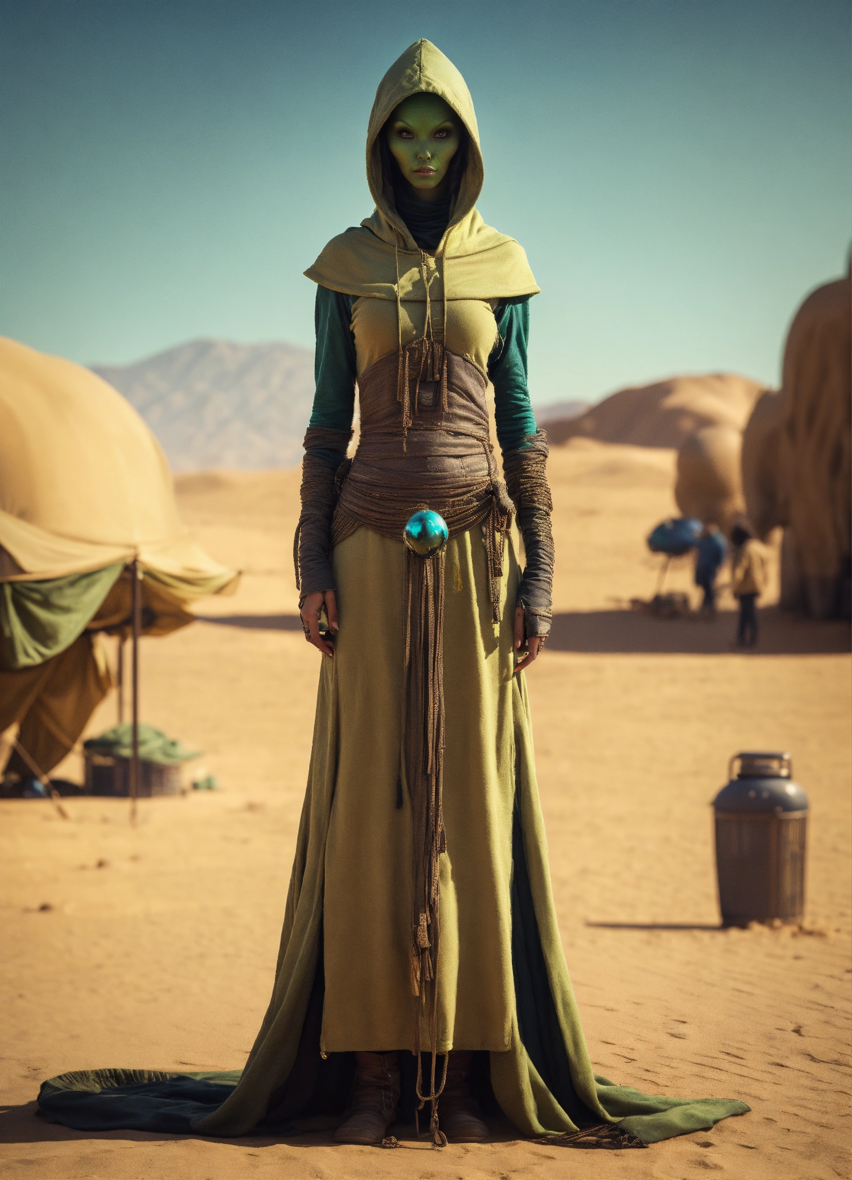 Very slim and tall female alien creature merchant on a desert un the market of a alien planet, suspicious look, hooded, hyperrealistic, selling caged alien vermin, western shot