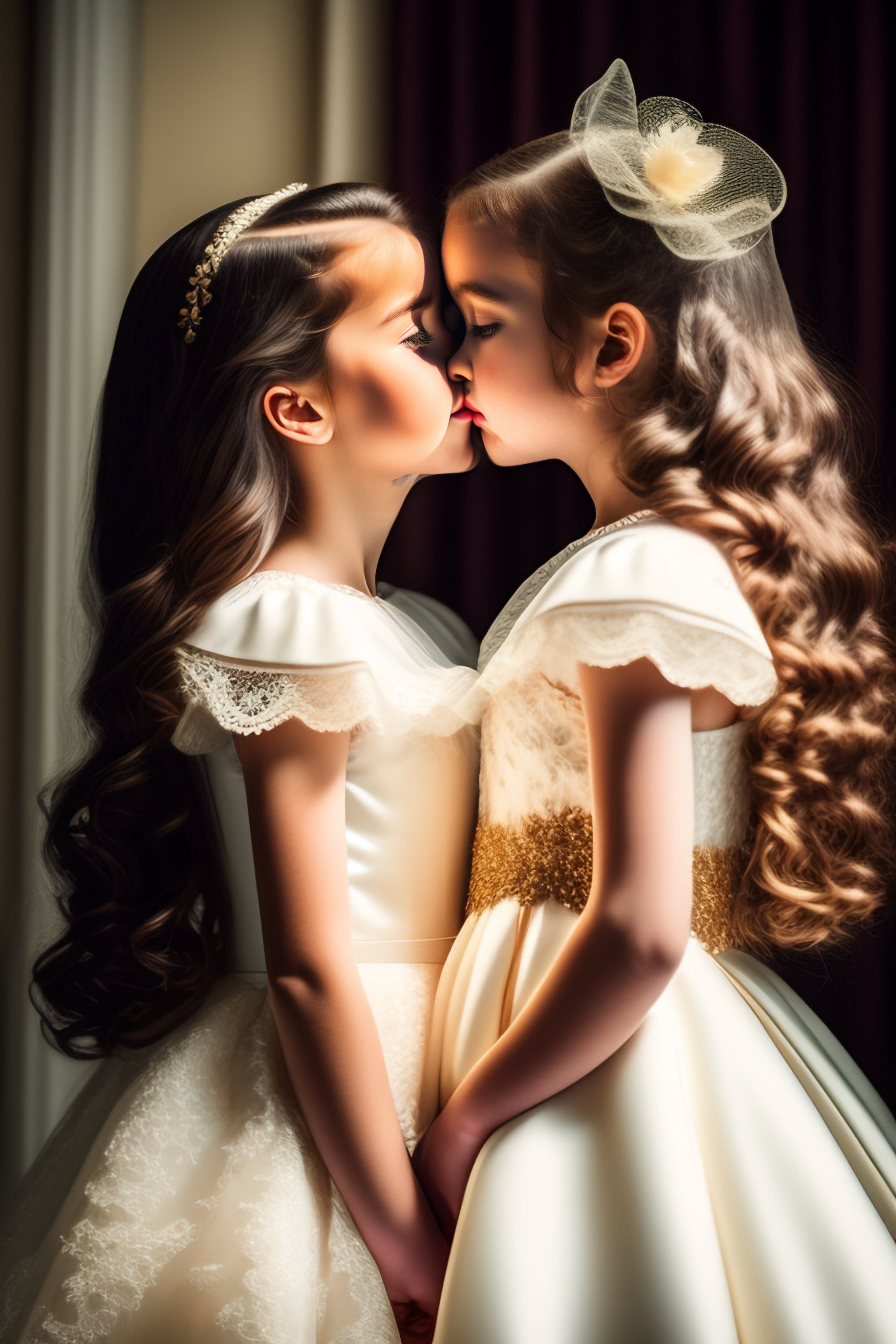 Beautiful, photo-realistic picture of two ten year old girls kissing!, intricate, elegant, highly detailed, photo-realistic, smooth, sharp focus, maid costume, lace, frill, ribbon, tight princess outfit