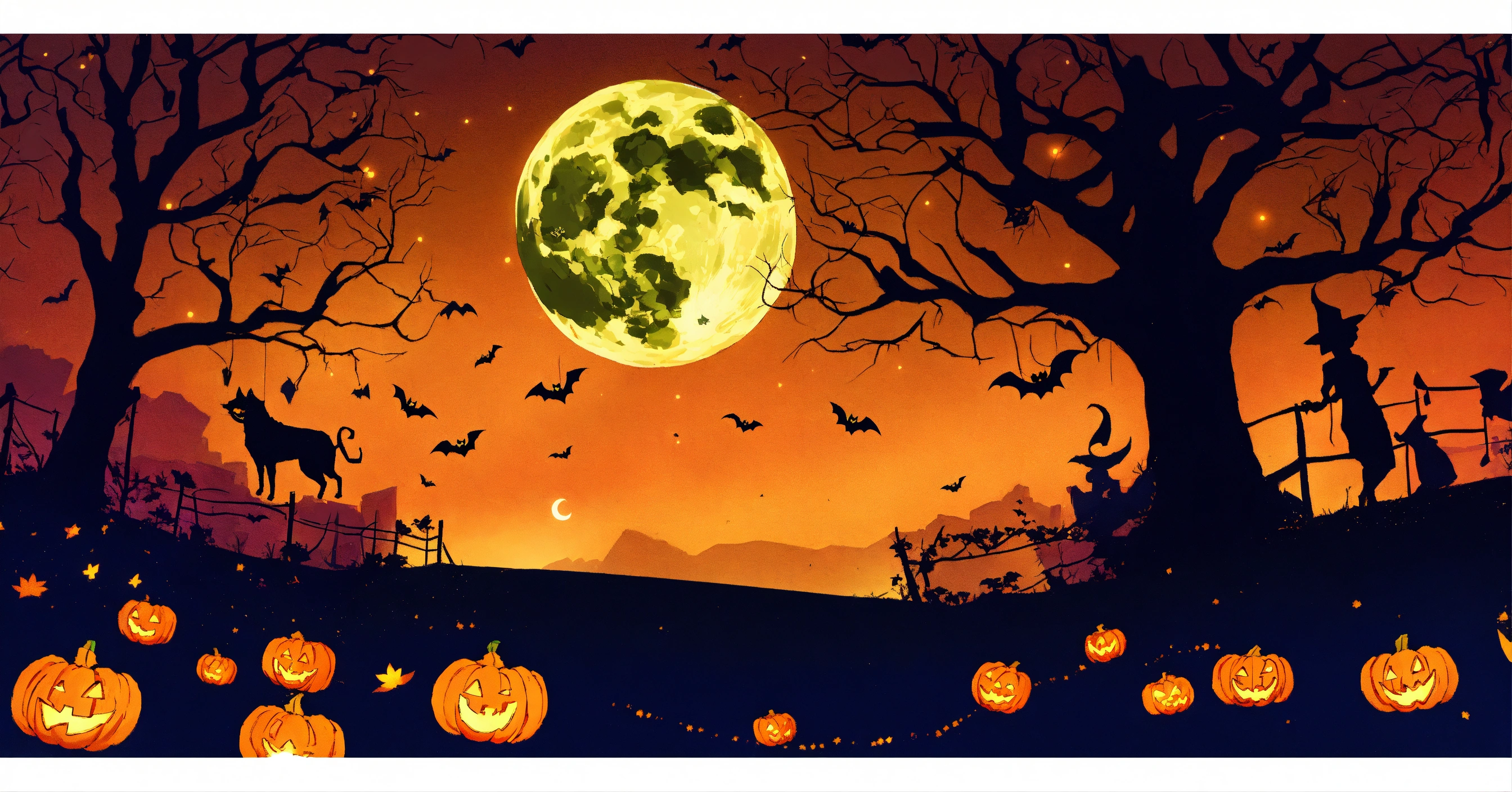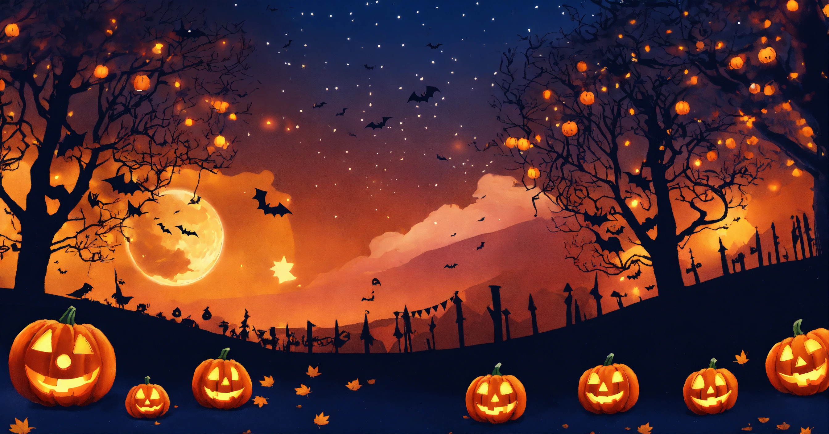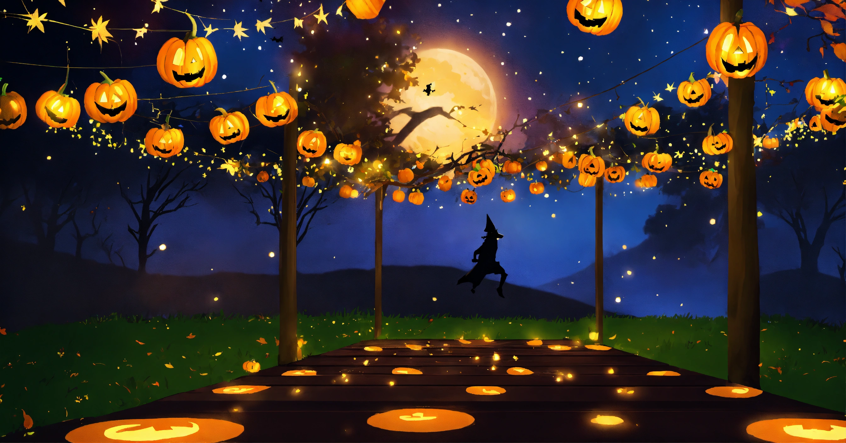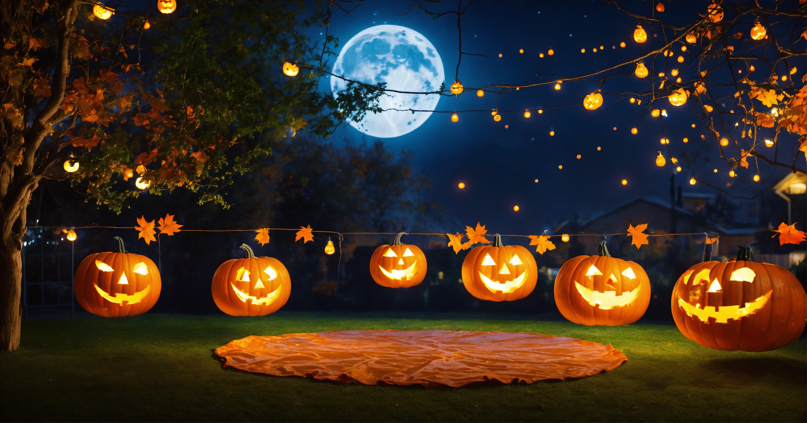 Outdoor halloween party theme, night sky stars moon, dance floor, hanging pumpkins, trees, leafs, fun