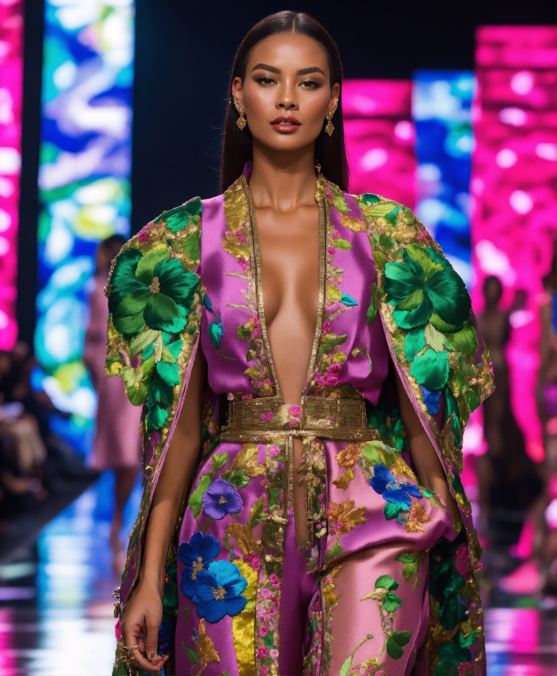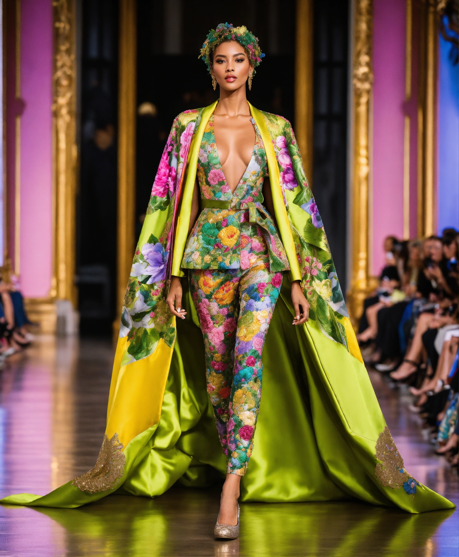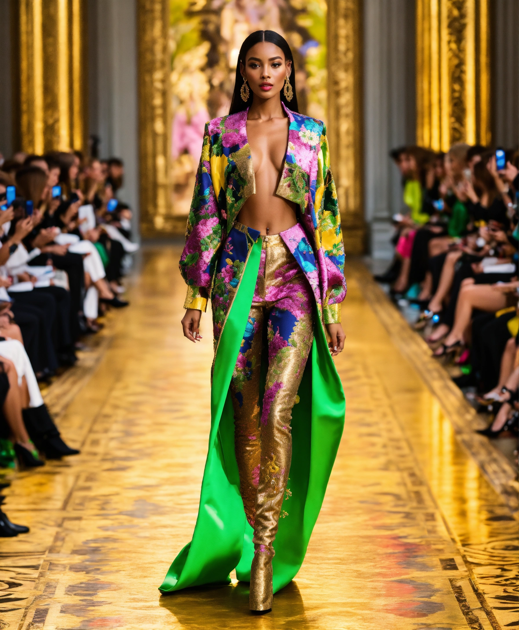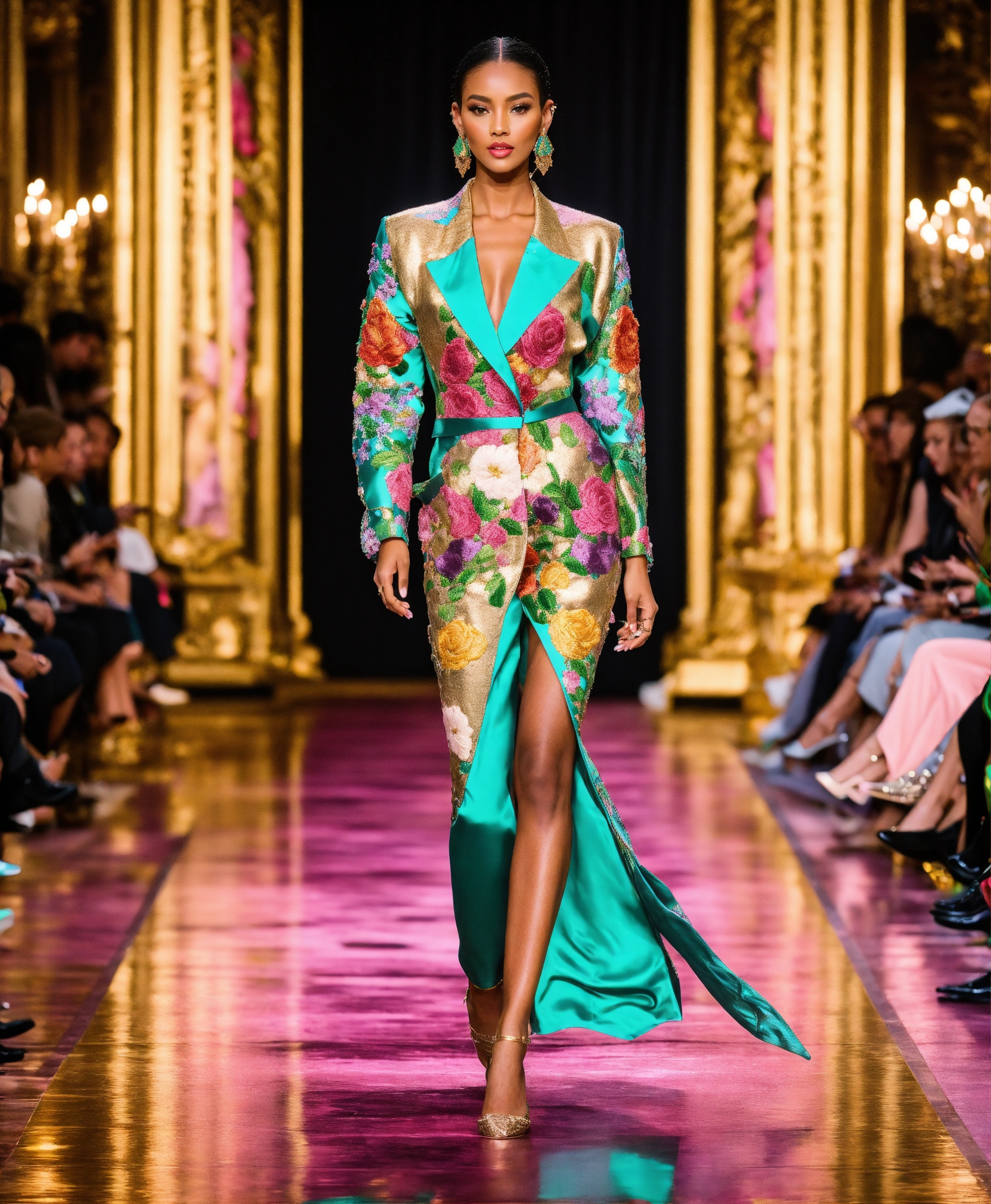 Ultra realistic full body photo of a stylish beautiful model walking the runway modeling summer designer cruise wear dolman sleeve outfit brave, paris versailles details cutouts and gold geometric pattern floral structured tailored jacket pink gold green lilac peridot silver magenta lime fuchsia yellow blue black gray copper mauve bronze haute couture embroidered contrasting colors vvivid bold vibrant glamorous ultimate elegance beautiful luxurious awesome wealthy opulent exquisite resplendent magnificent sublime 12k