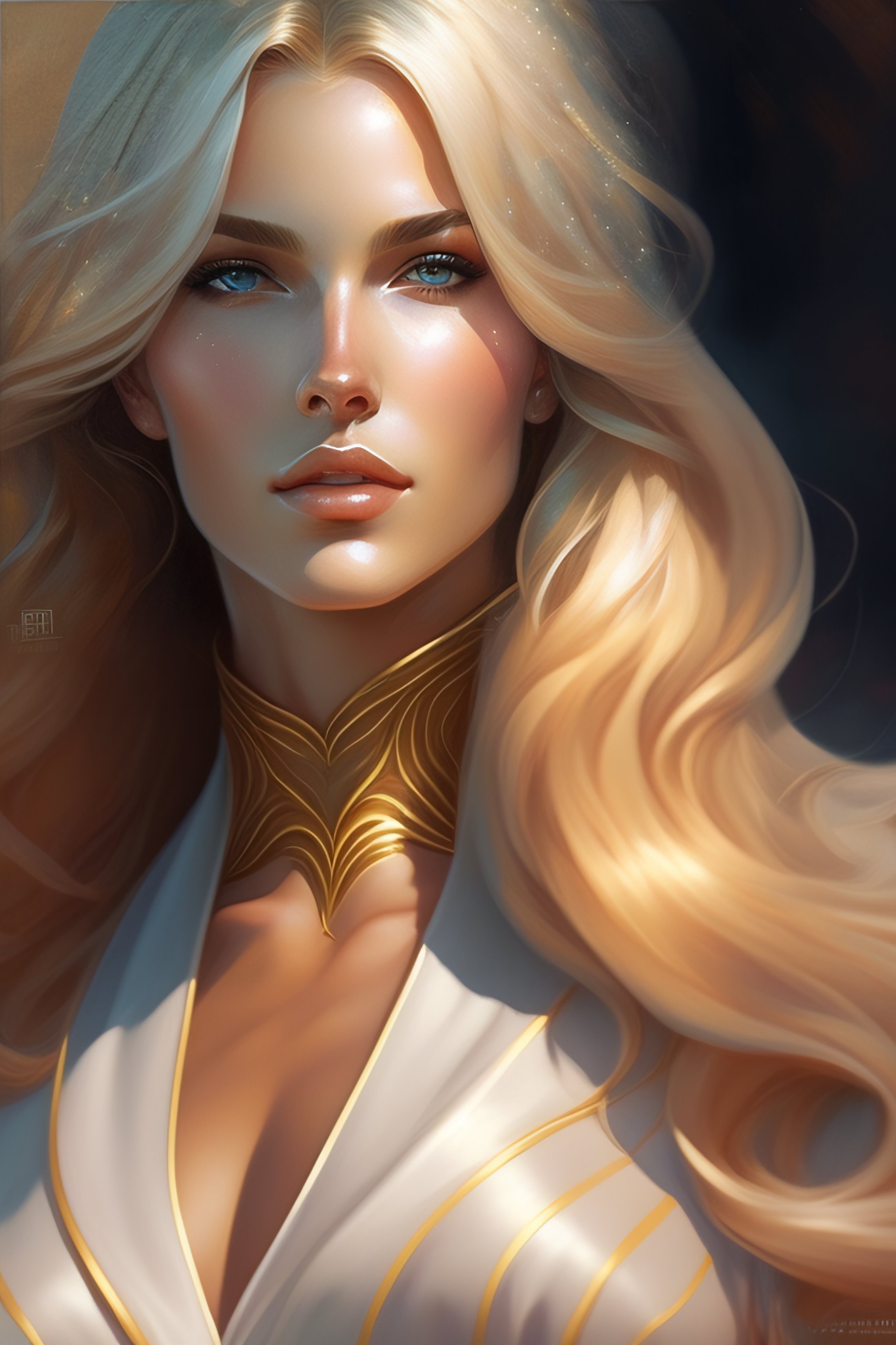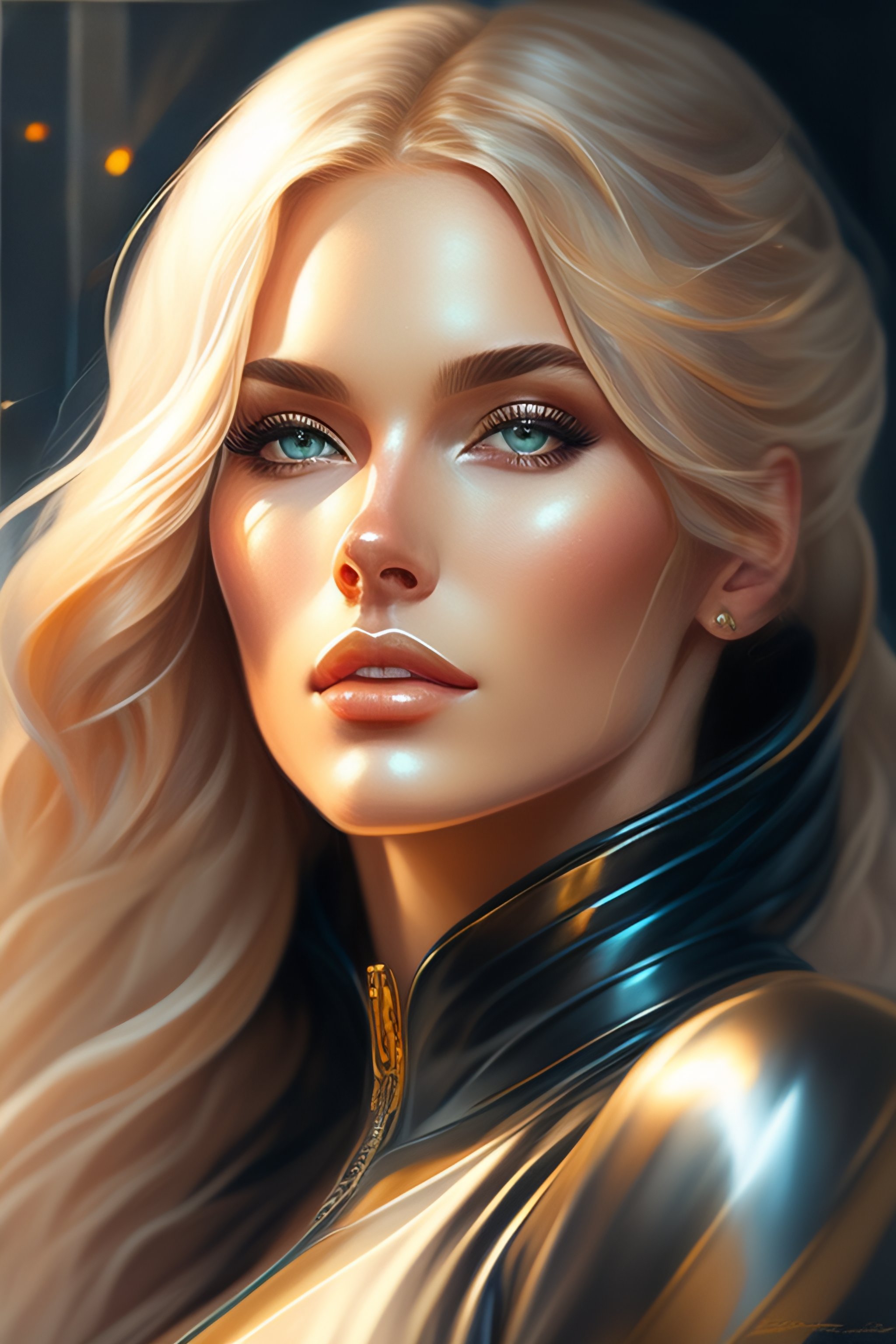 Portrait of blonde girl, jump suit, vivid eyes, real life skin, intricate, elegant, highly detailed, artstation, concept art, smooth, sharp focus, art by artgerm and greg rutkowski and alphonse mucha
