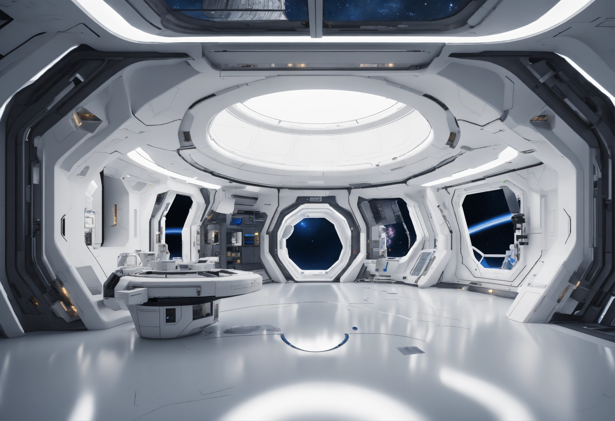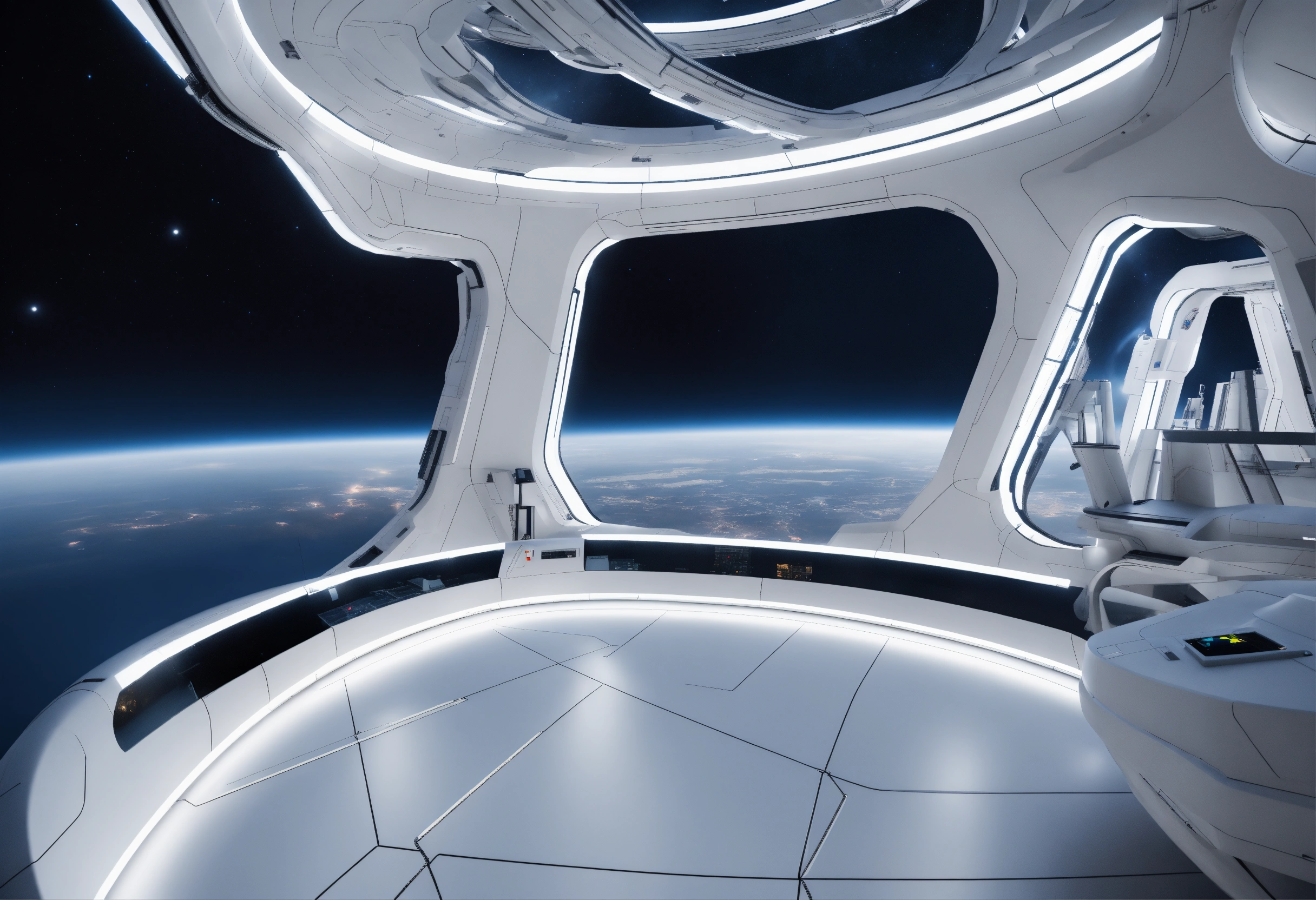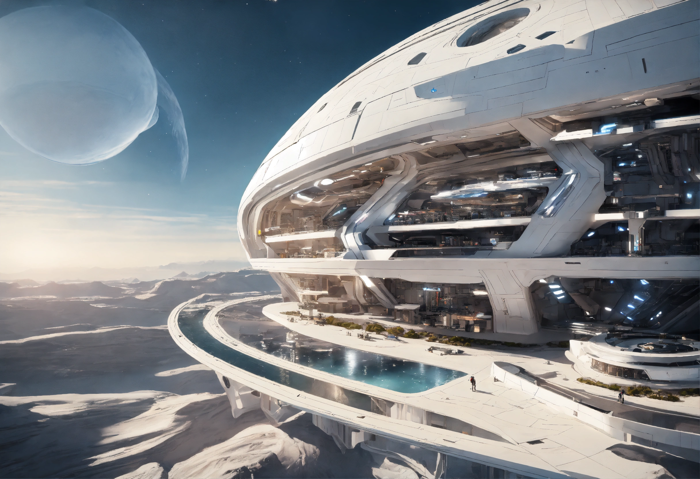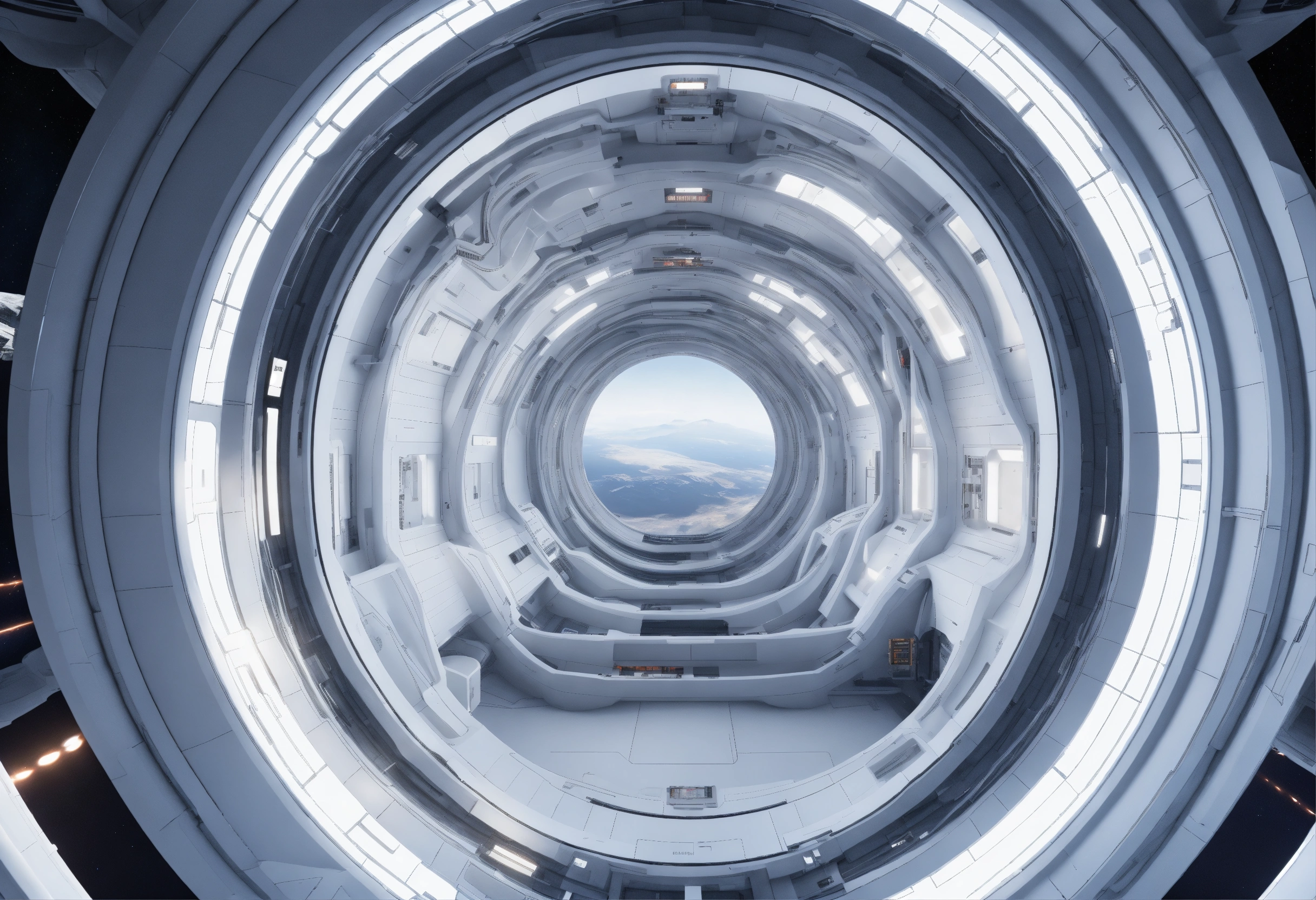 Zoom out on the outside of an incredible modern white 360° space station view from space, zaha hadid, modern, realistic, futuristic, sci-fi, 8k, unreal engine, pixar