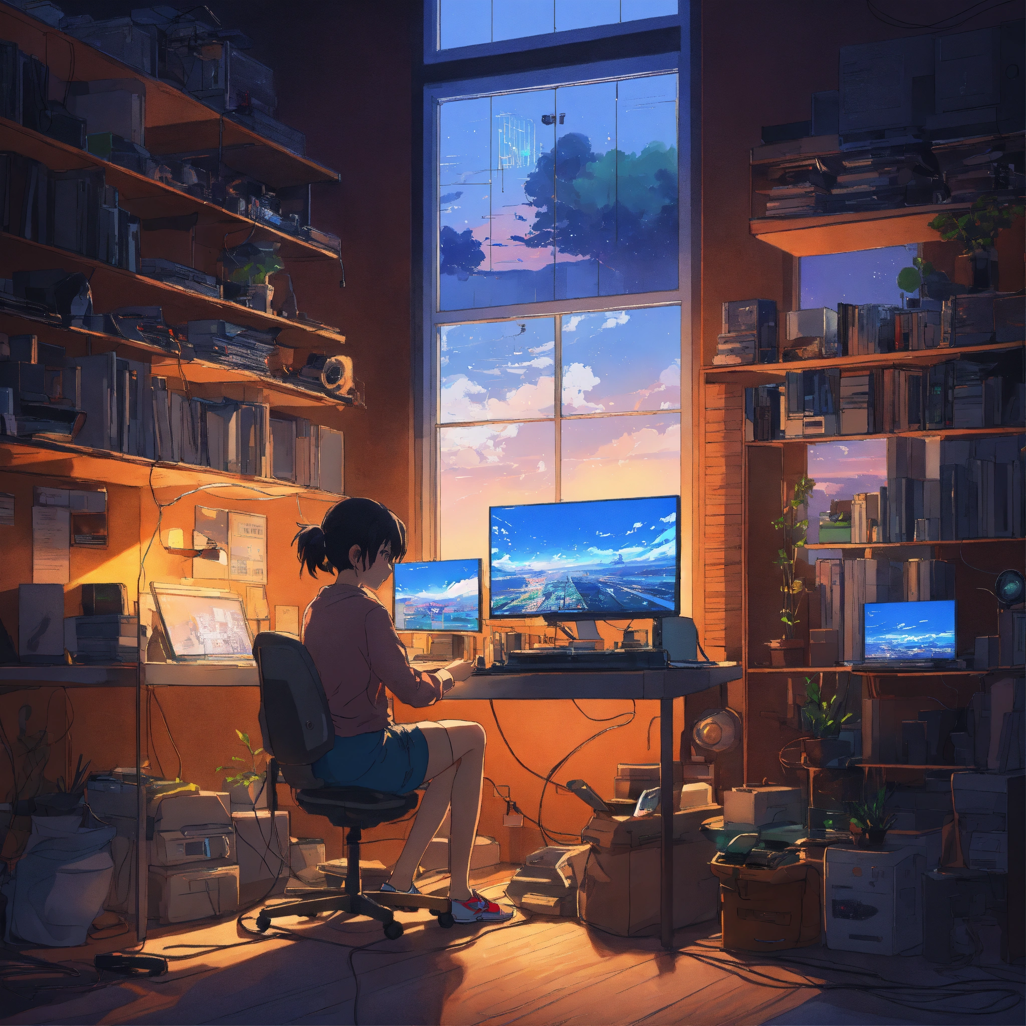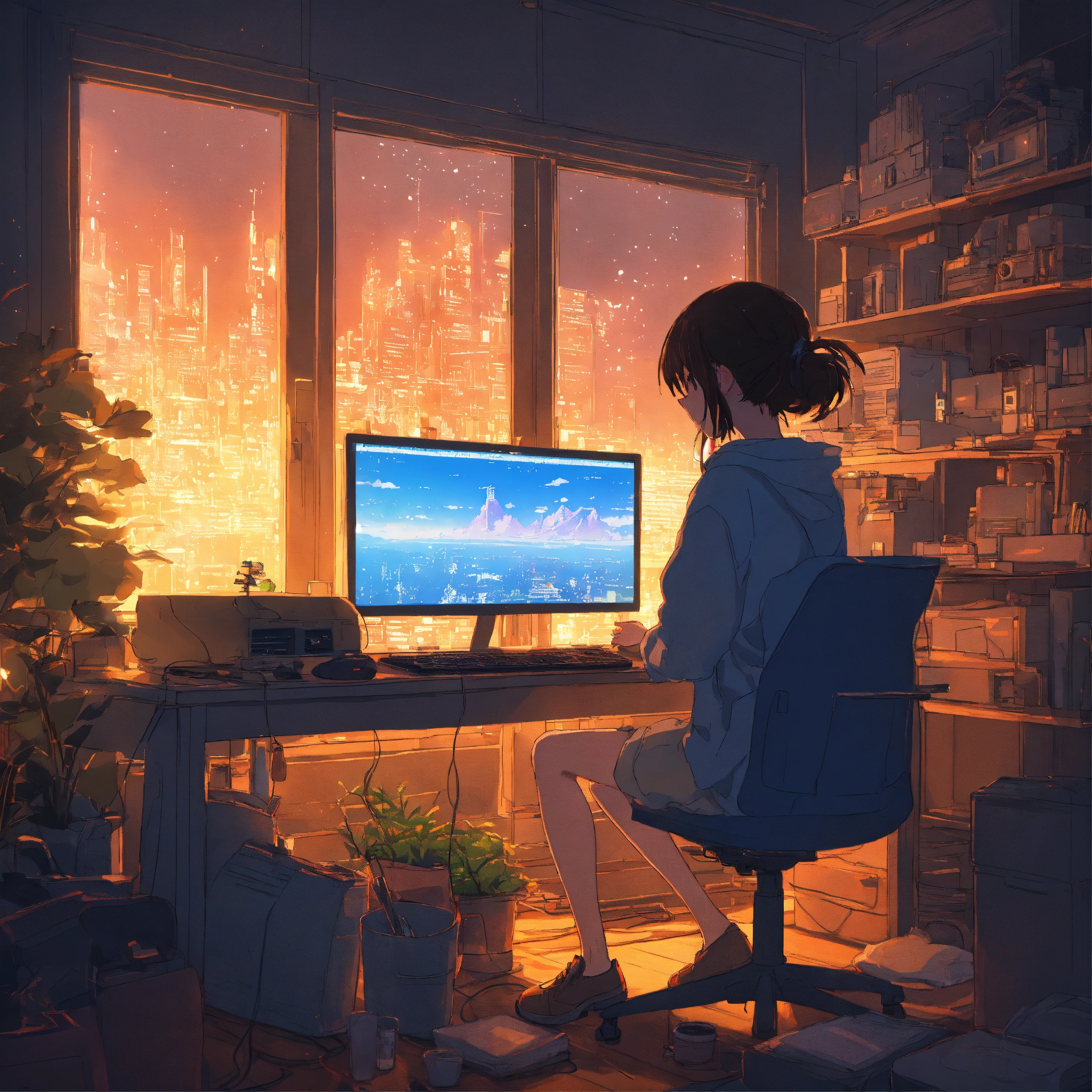 Create a high resolution artwork of lofi, anime girl is programming at a computer in a room full of gadgets, snown, web developer, by makoto shinkai and ghibli studio, outlined silhouettes, dramatic lighting, highly detailed, incredible quality, trending on artstation, masterpiece, 8k