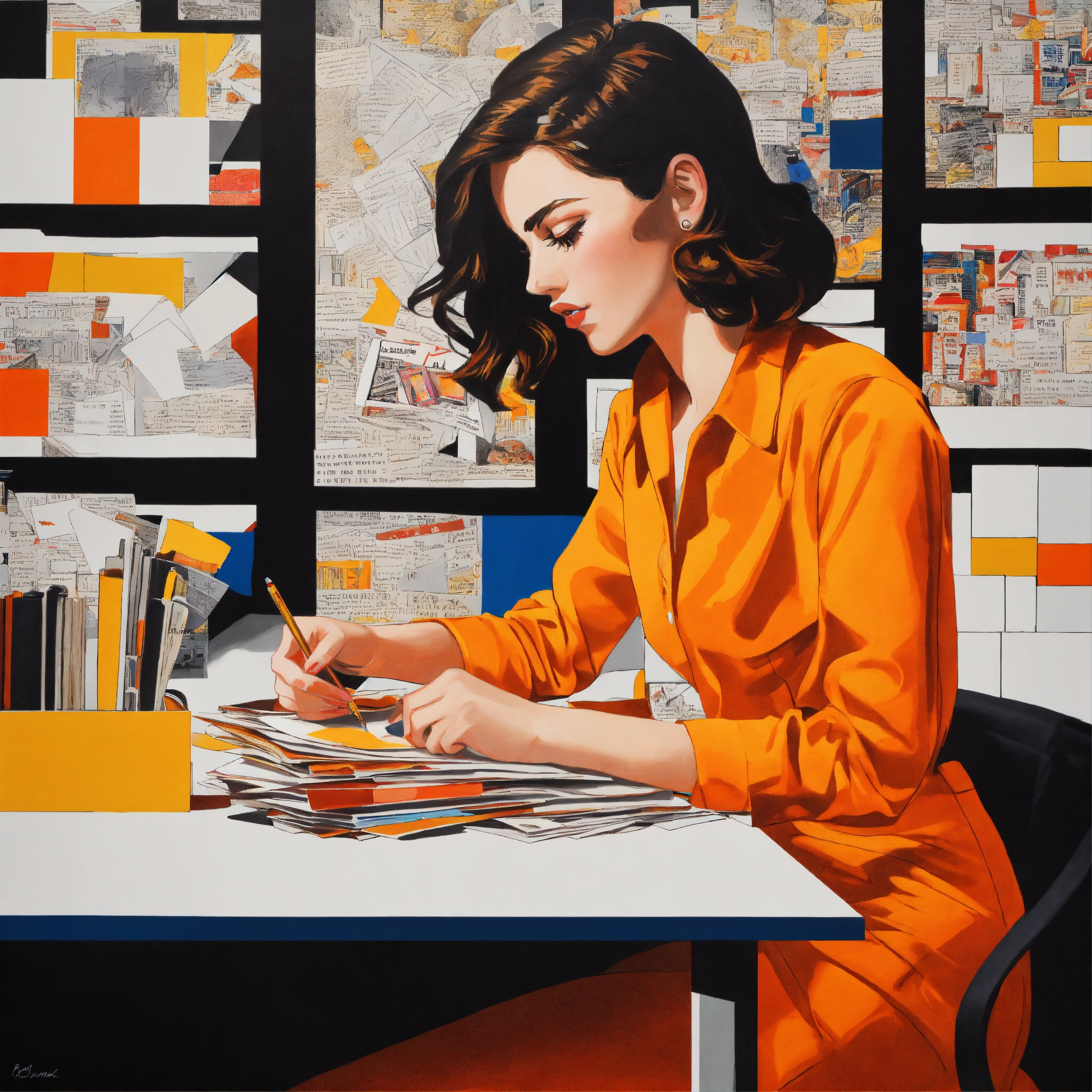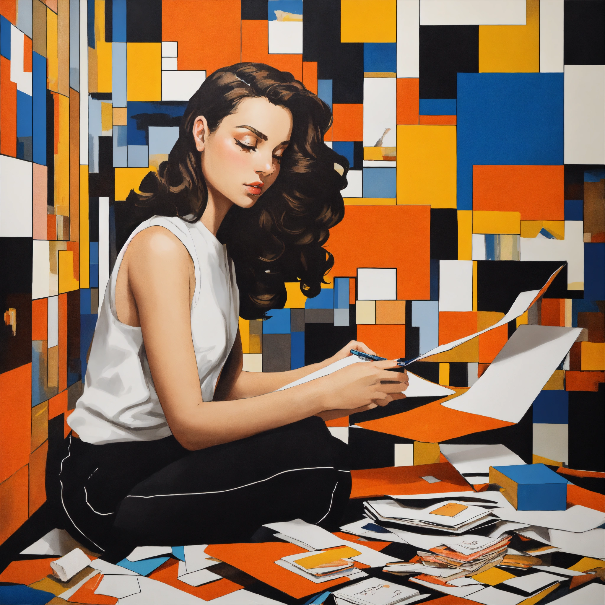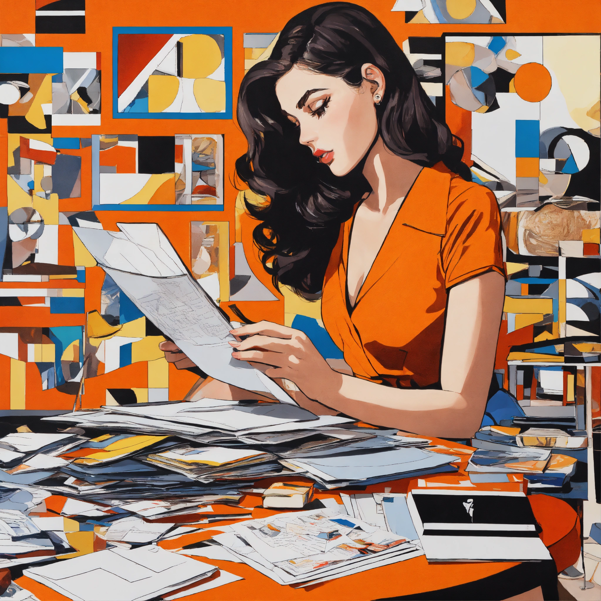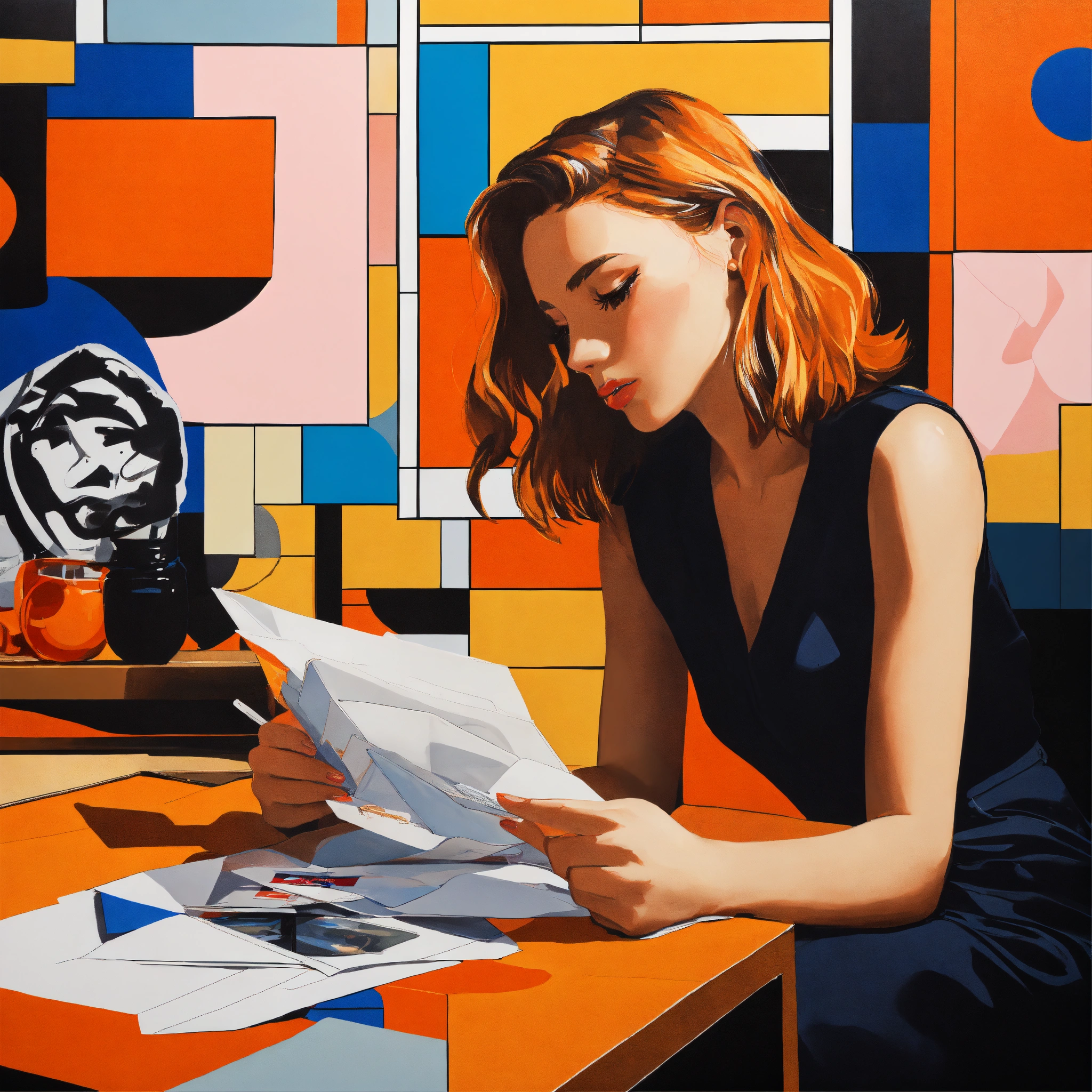 A beautiful young woman is sorting through her correspondence, the style is modern, bright, with the use of visual charms. style pop art, minimalism, hyperrealism, roy lichtenstein, piet mondrian, chuck close. colors black, bright orange