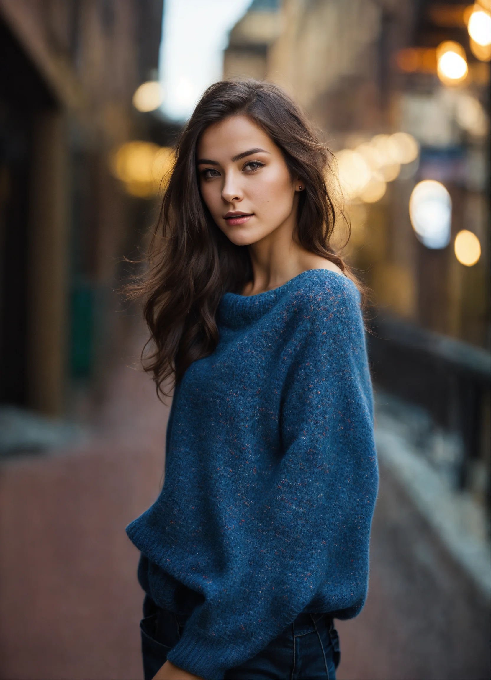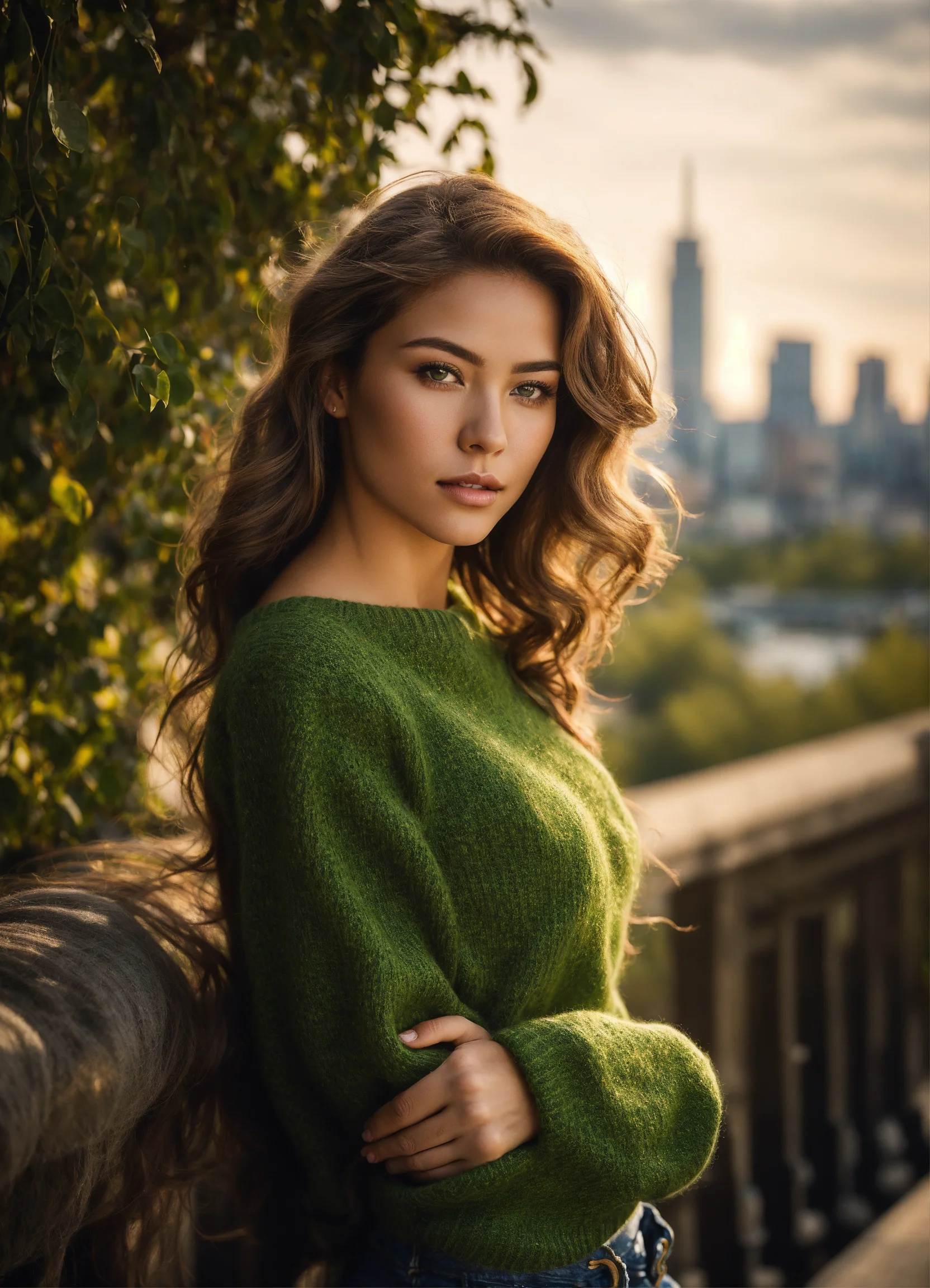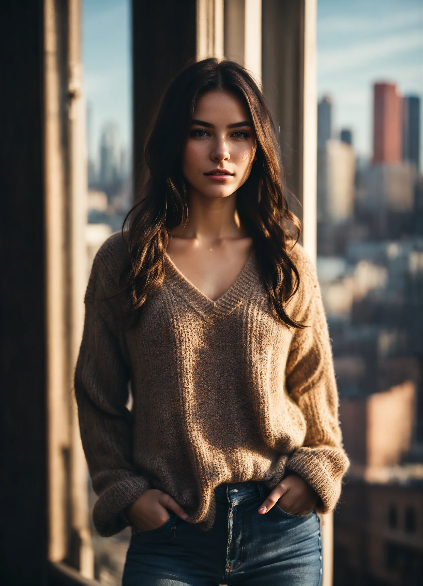 An ultra detailed photo of a 22 years old brunette girl, with mid-short loose hair, natural beauty, calm expression, strong body and medium brest, wearing a wool sweter and jeans, modern city skyline in the background. ethernal vibe. no jewelry, no makeup.
