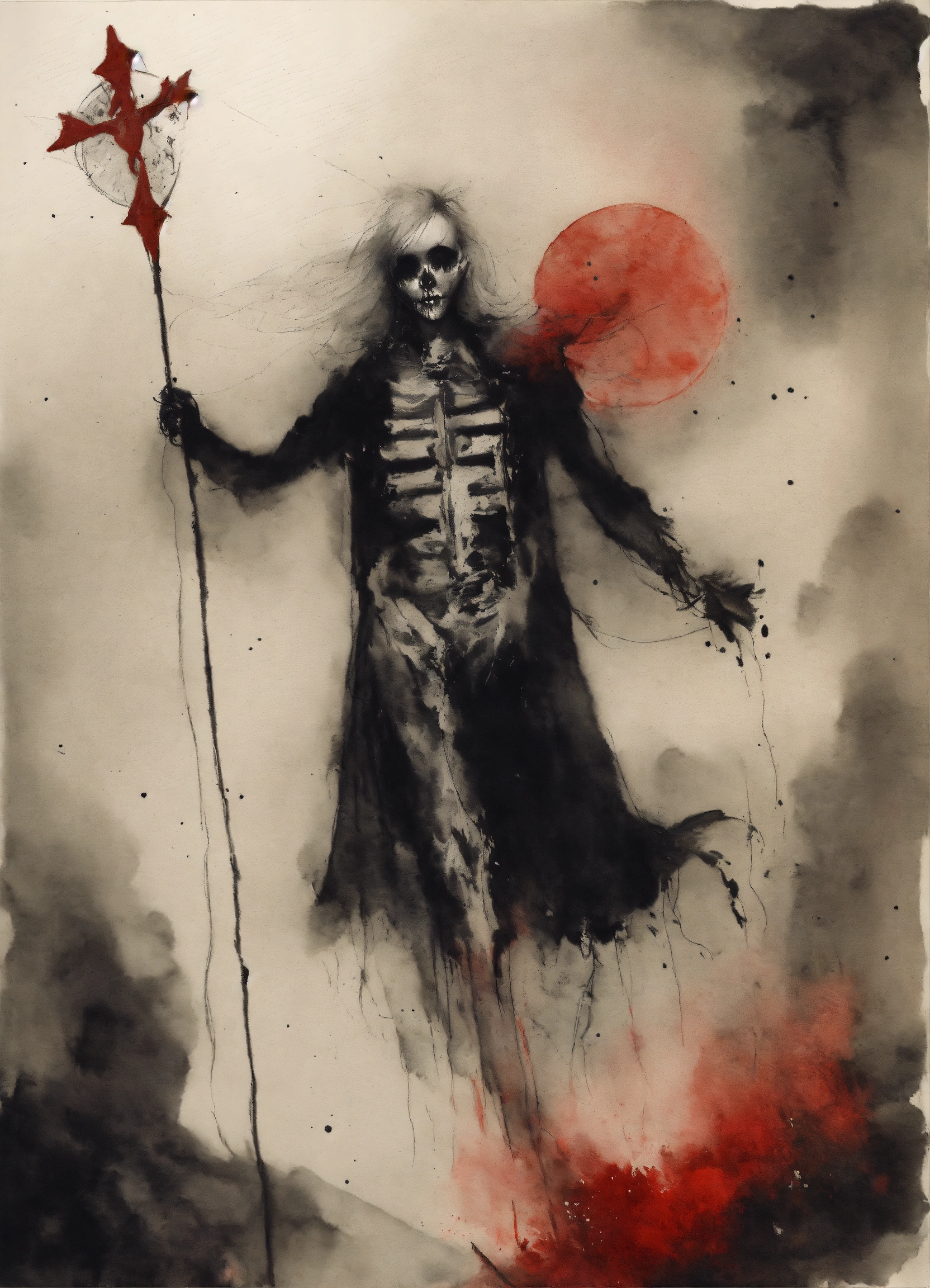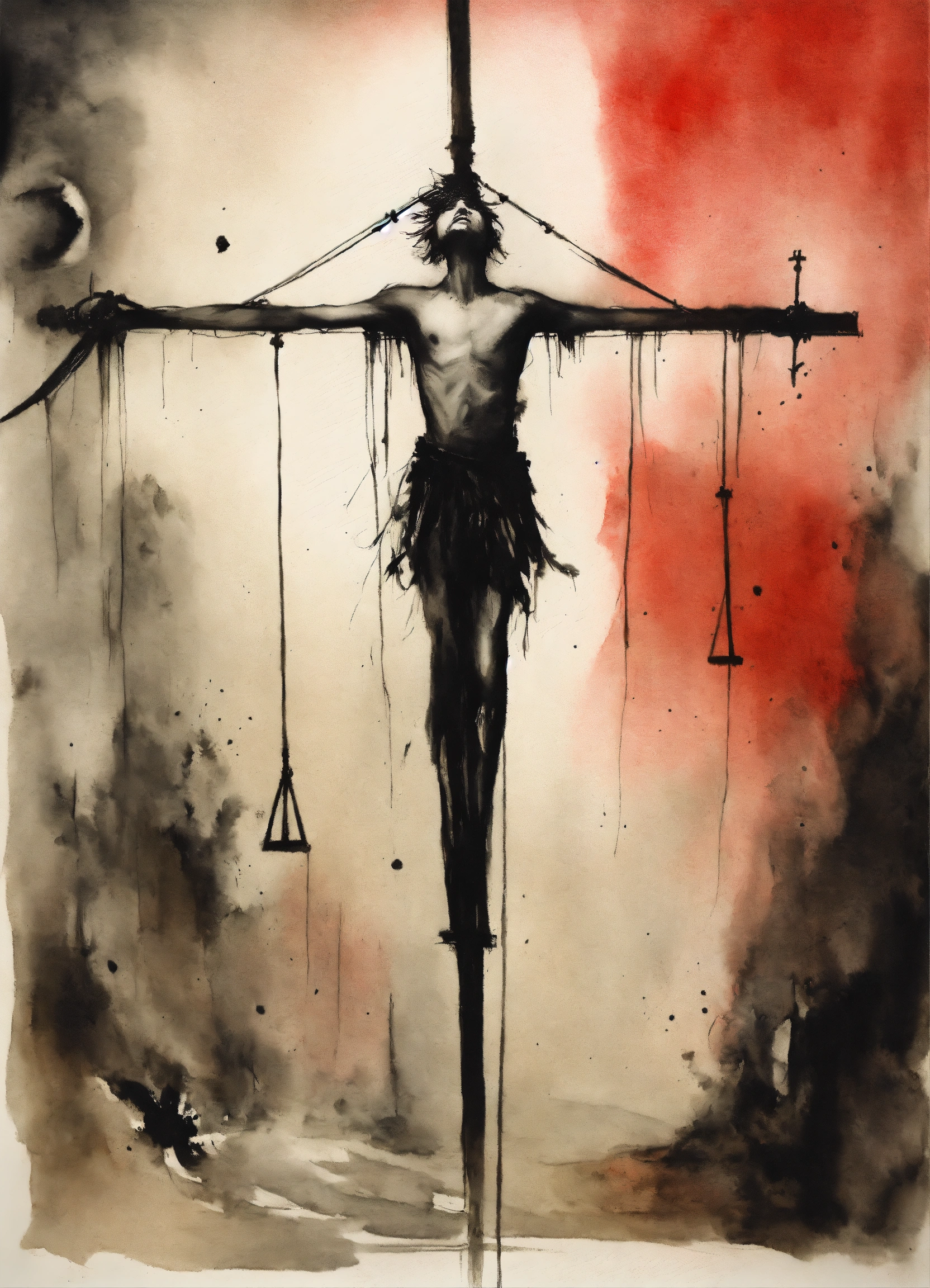 Stephen gammell style, dessin, aquarelle, aquarelles, noir et blanc et rouge, de marais, de sombres créatures, dégoulinant, representation of the hanged man in the tarot card game