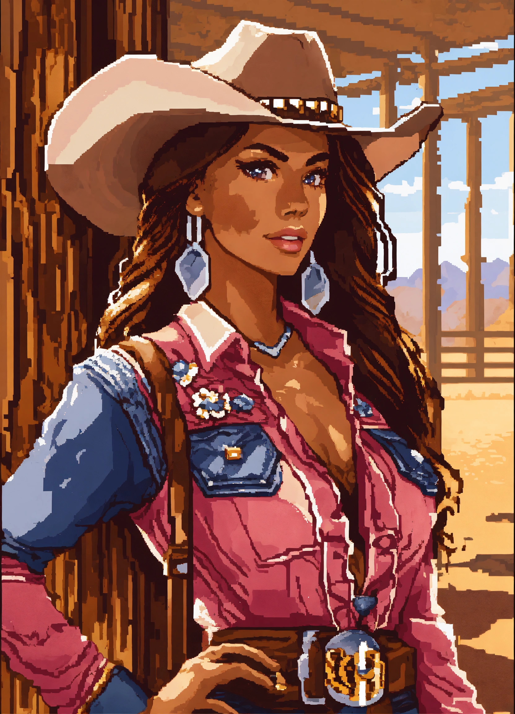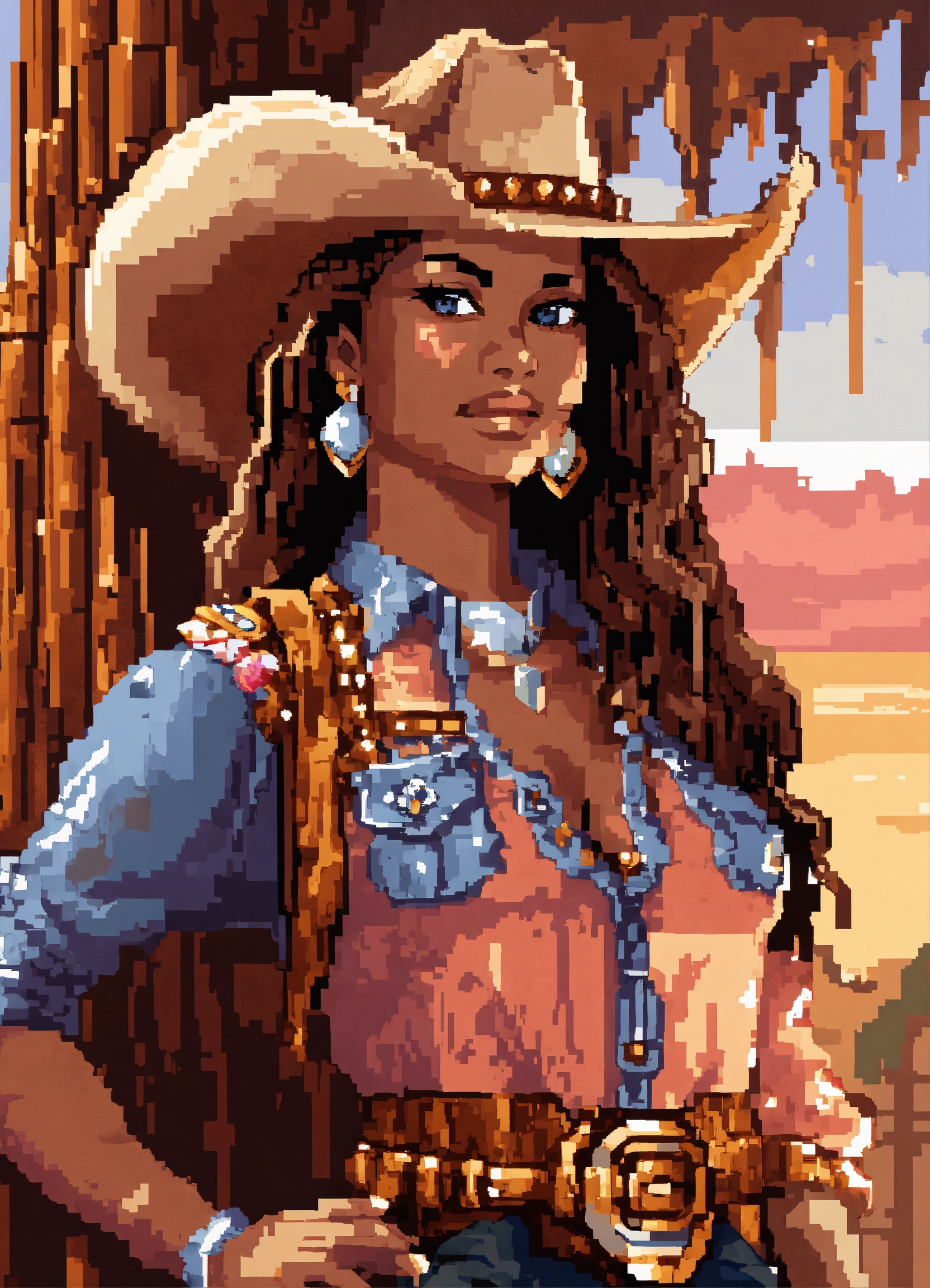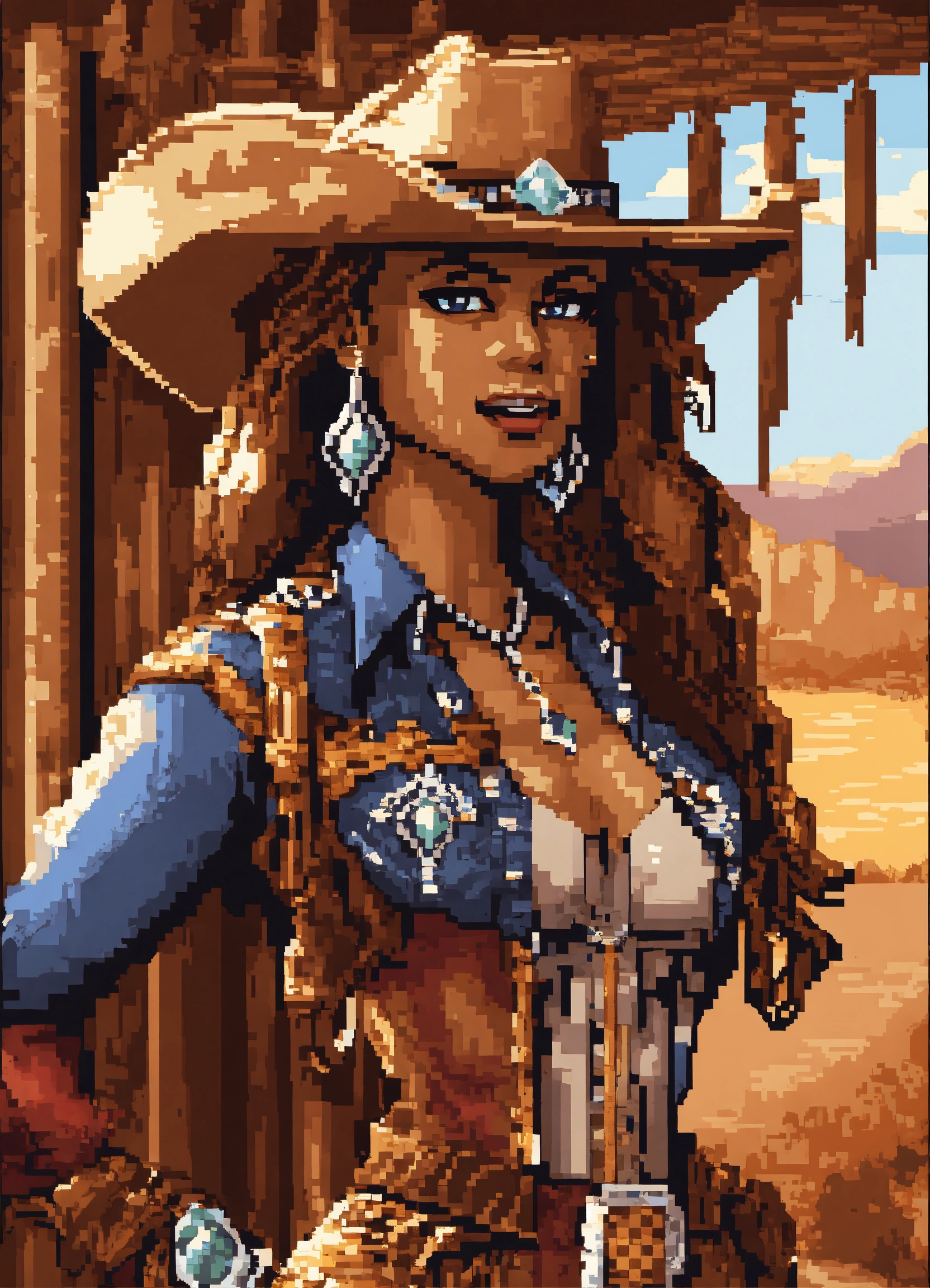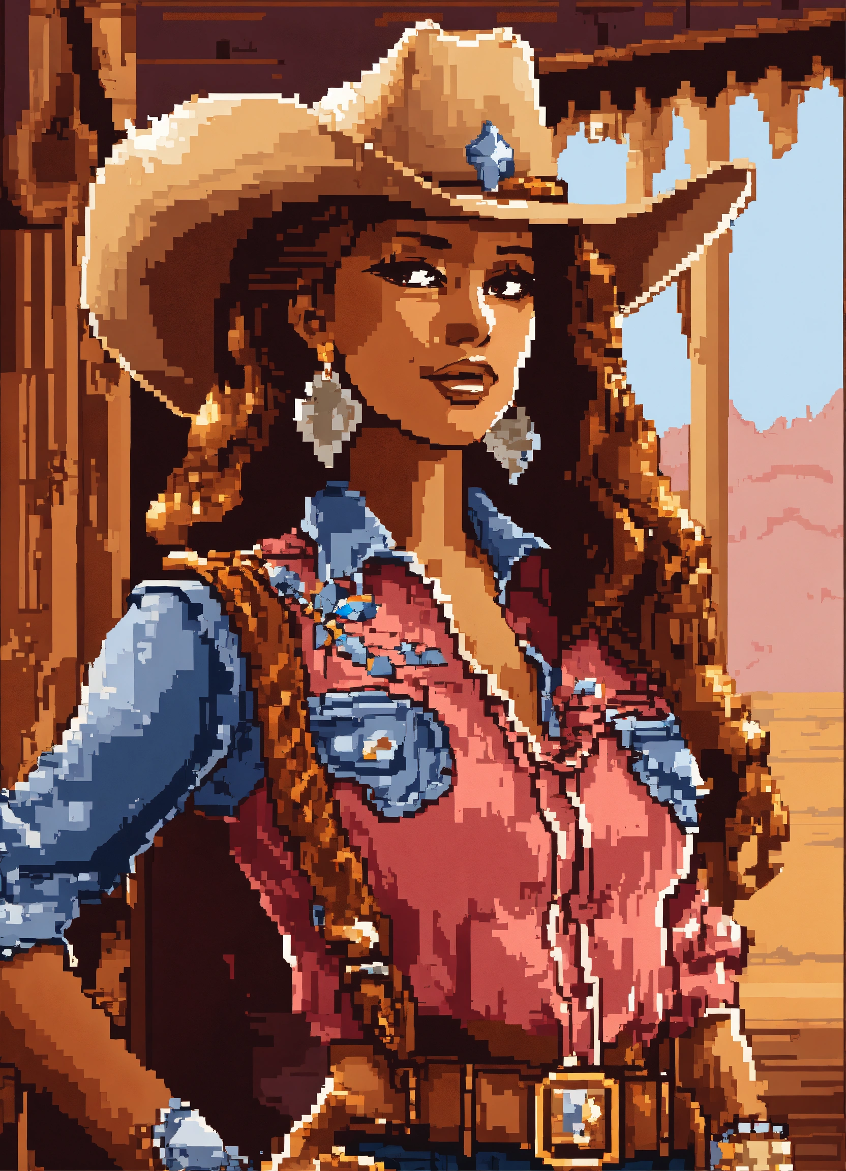 16 bit pixel art of a southern beauty queen wearing a denim wild west outfit and cowboy hat, 16 bit graphics