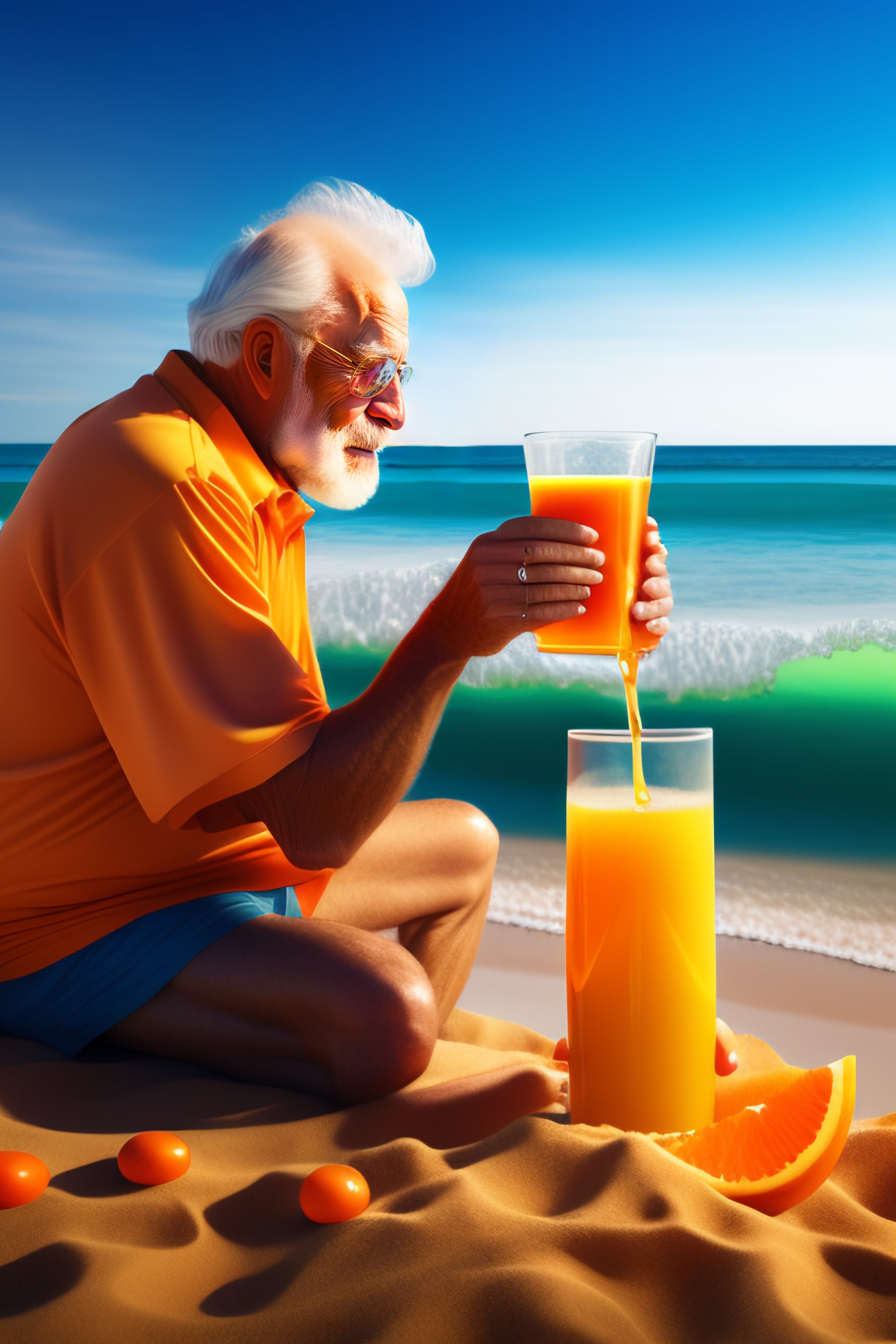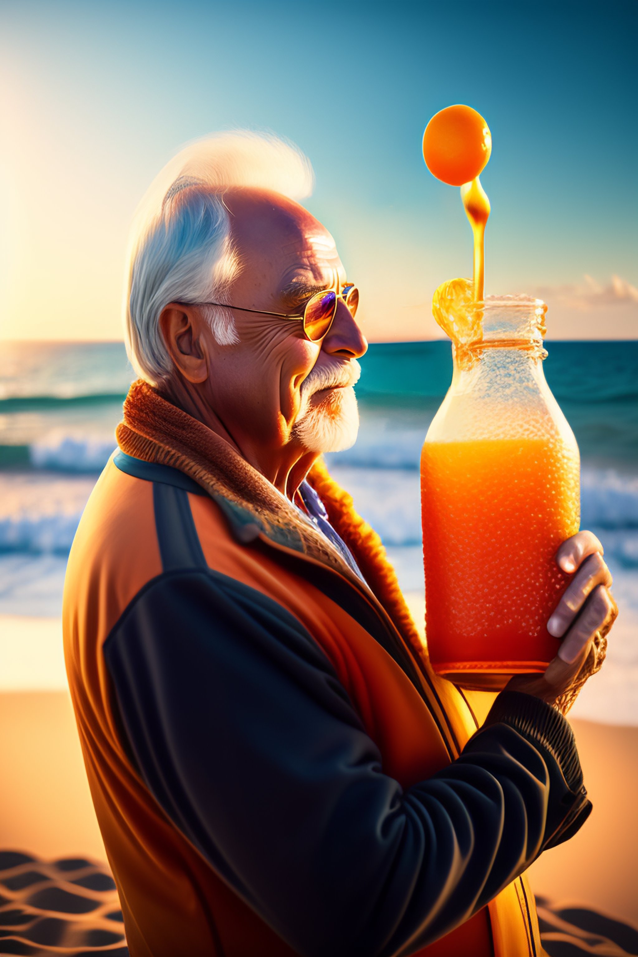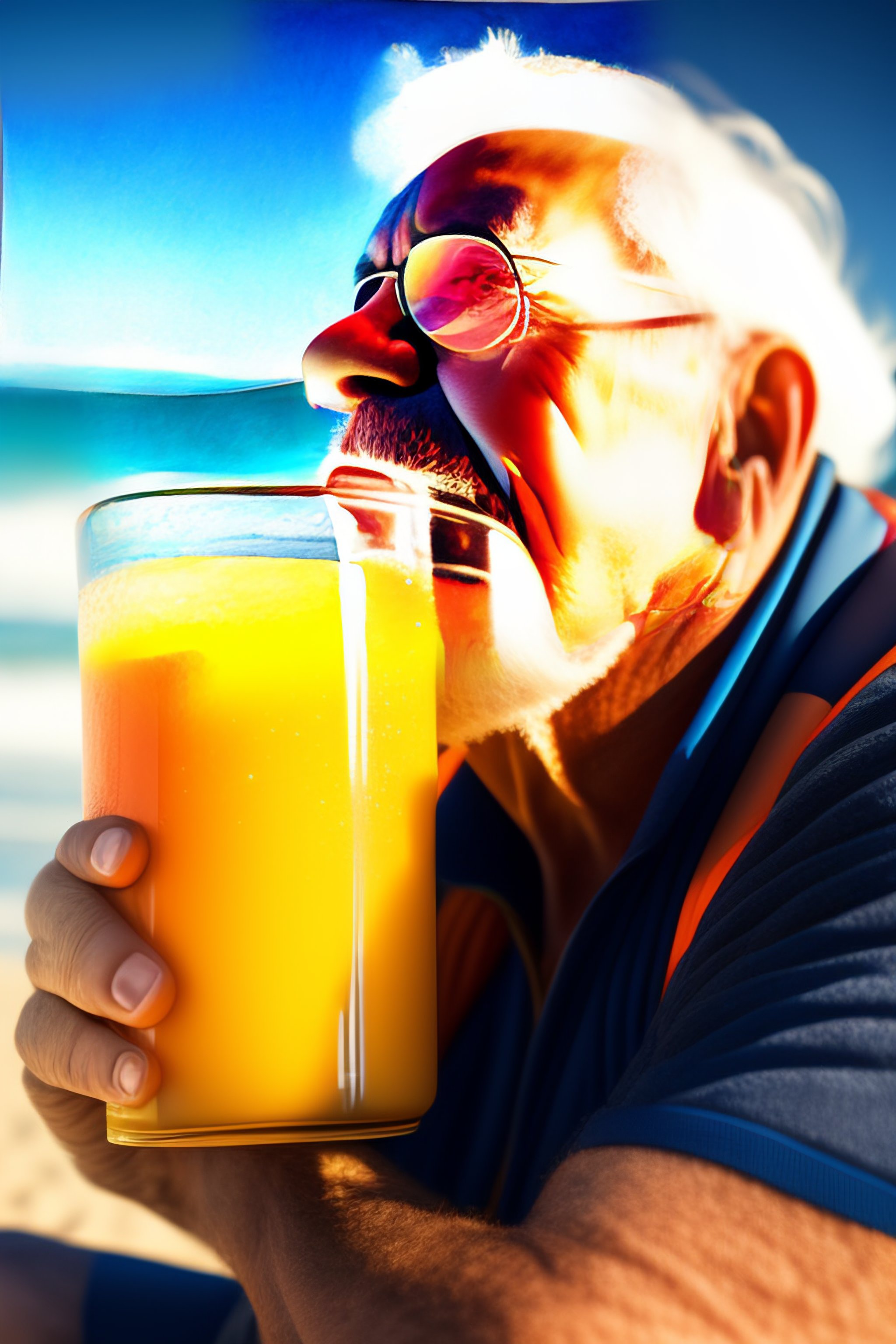 Old man drinking juice on a beach