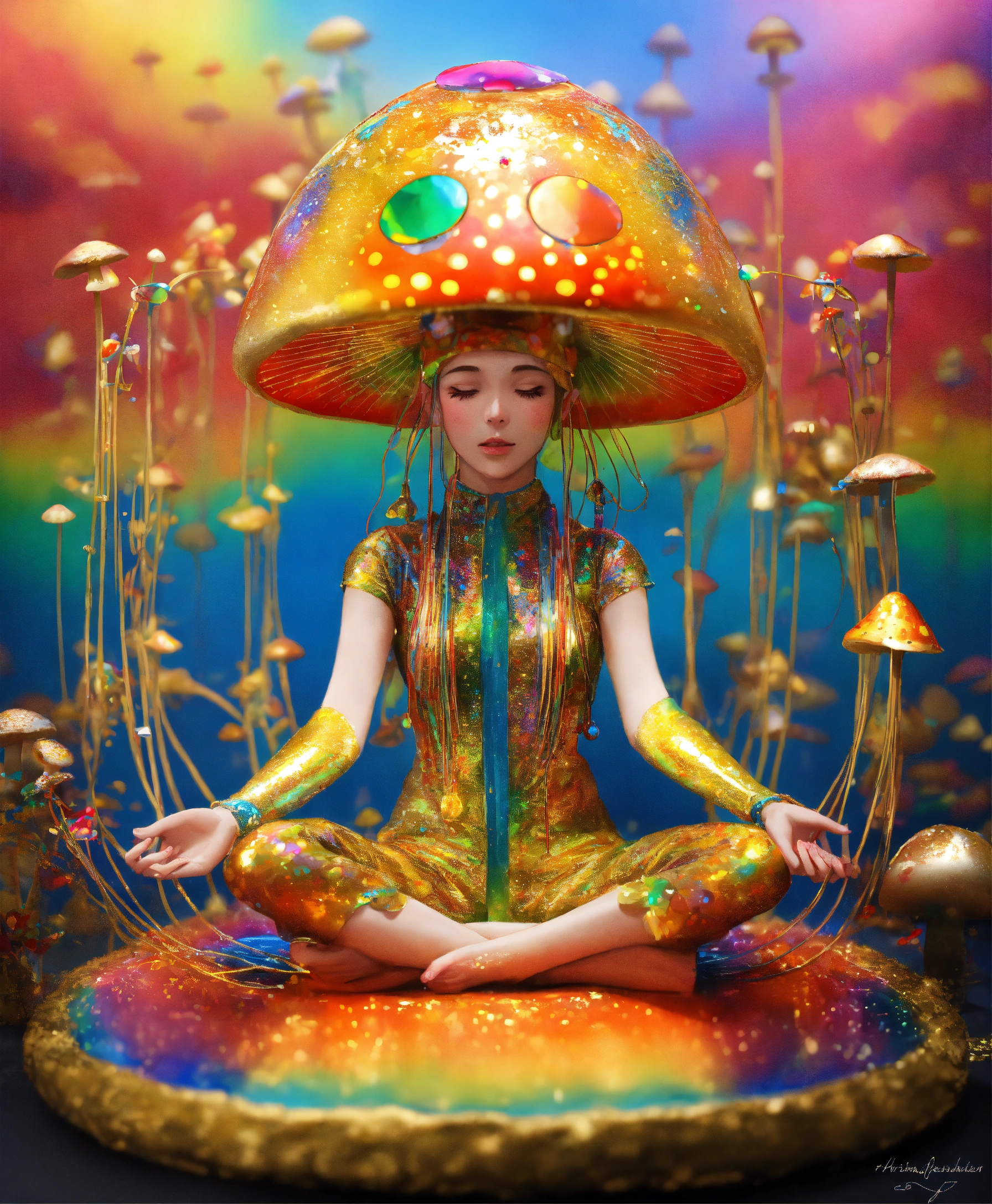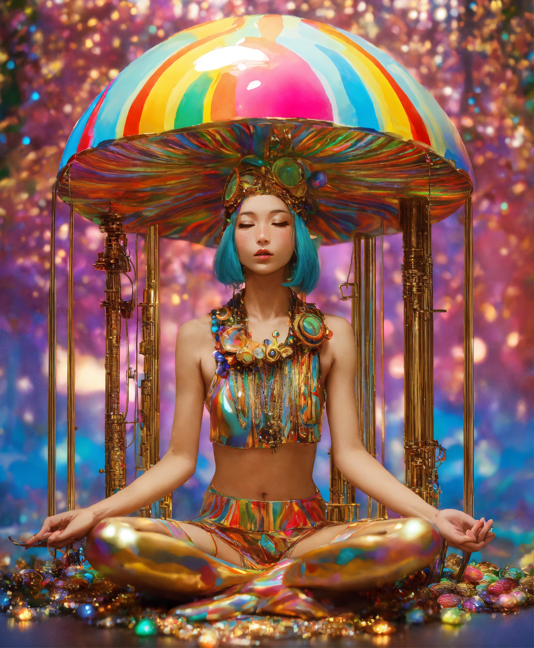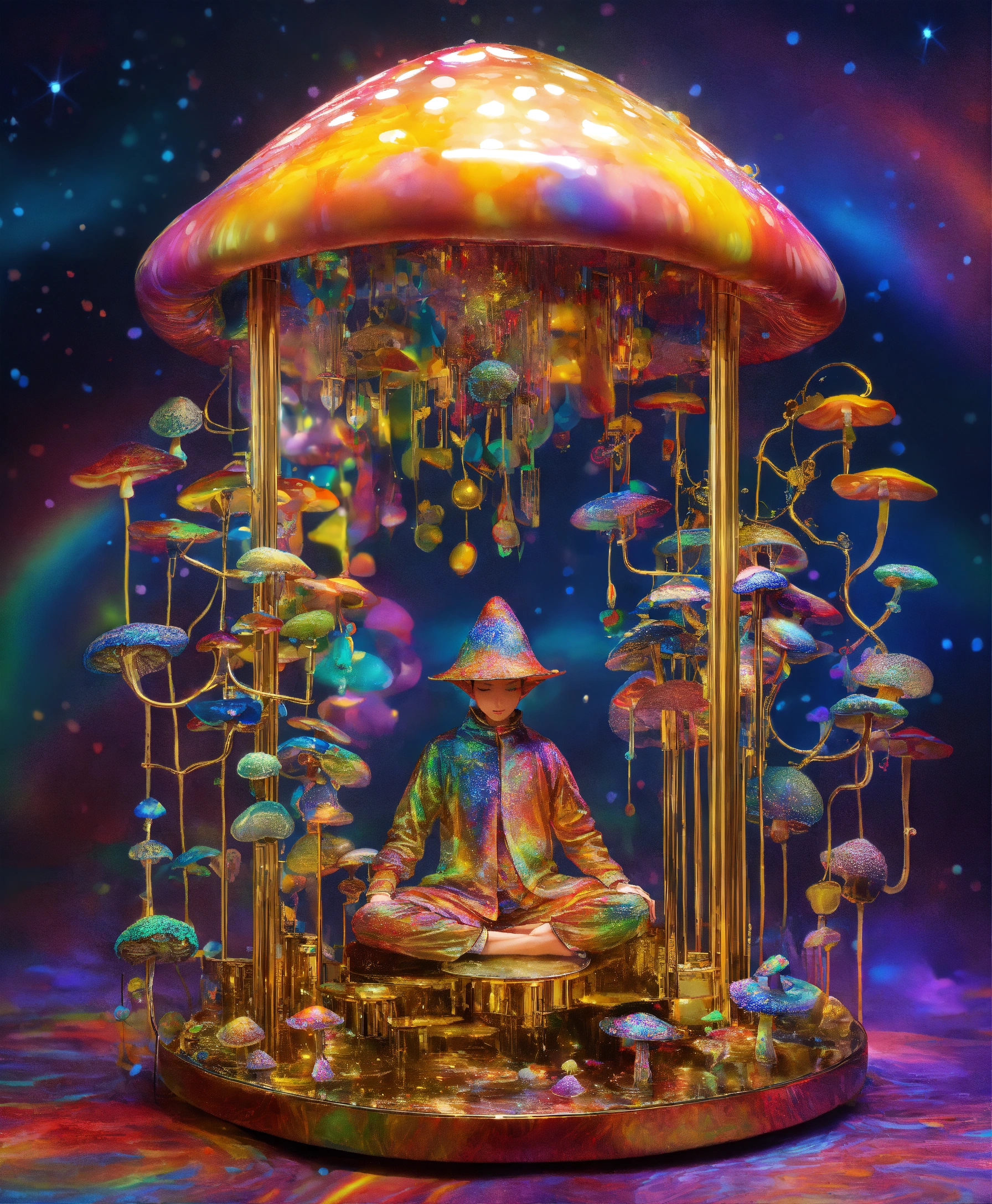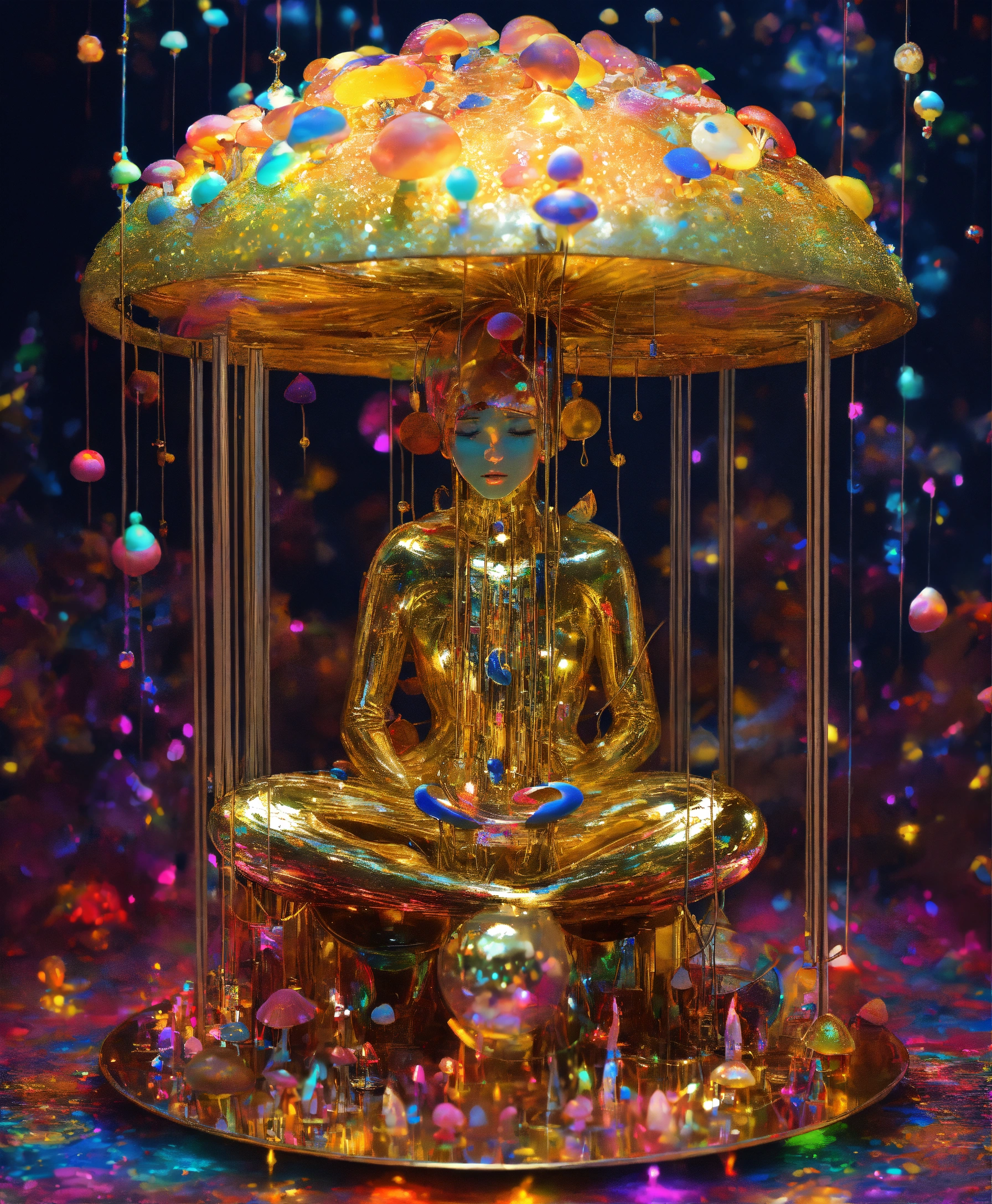 The most psychedelic magic mushroom machine elf meditating in the style of a mirror, gold speckles, rainbow tubing, metallic wires by shushed nagaoka
