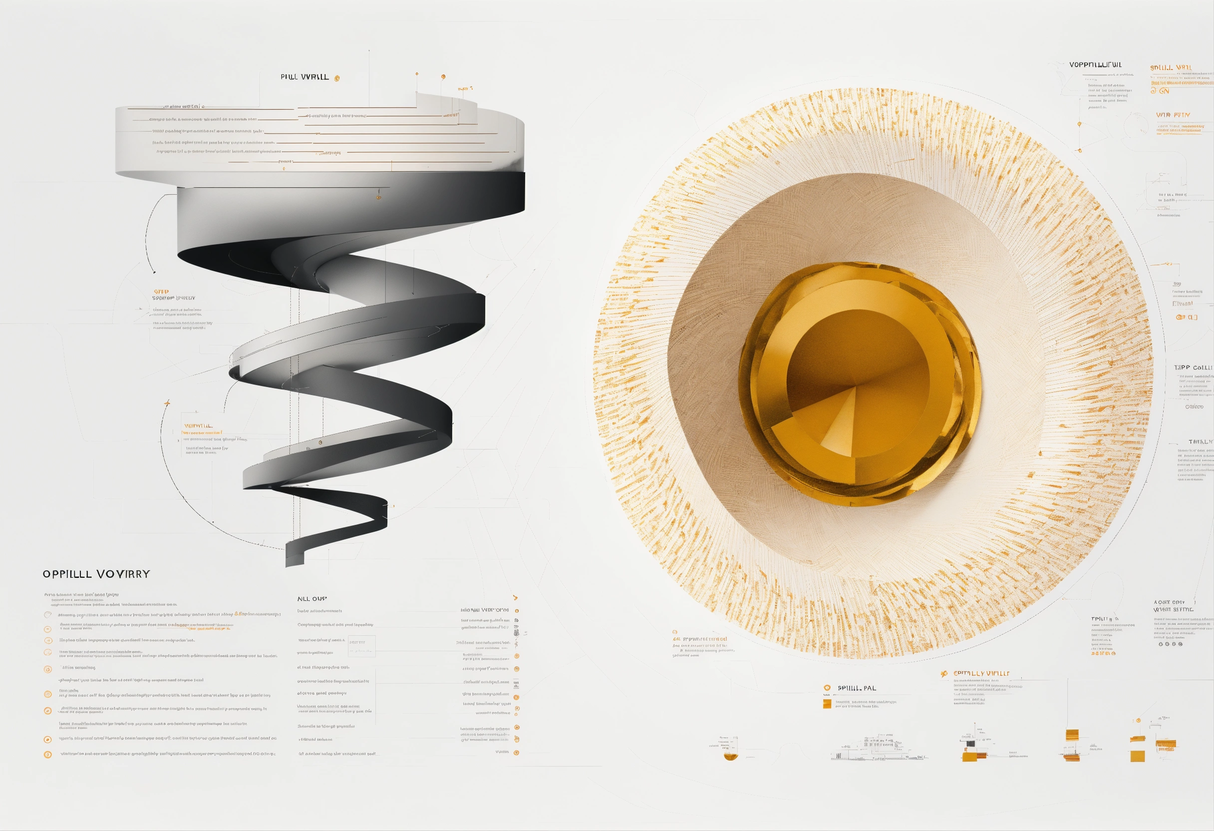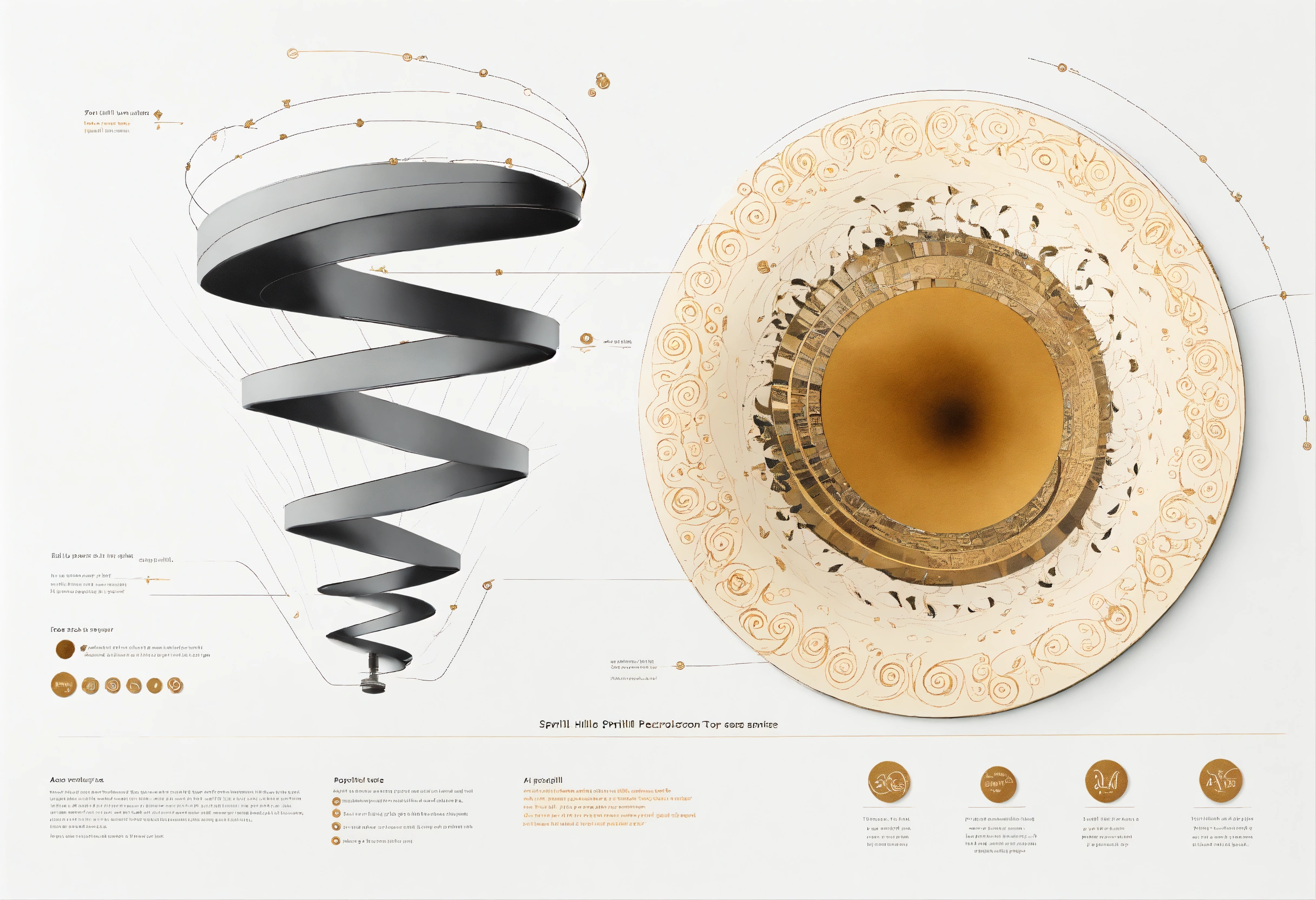 A full page design of a spiral vortex with top view, black and bronze paper, intricate, highly detailed, epic, infographic