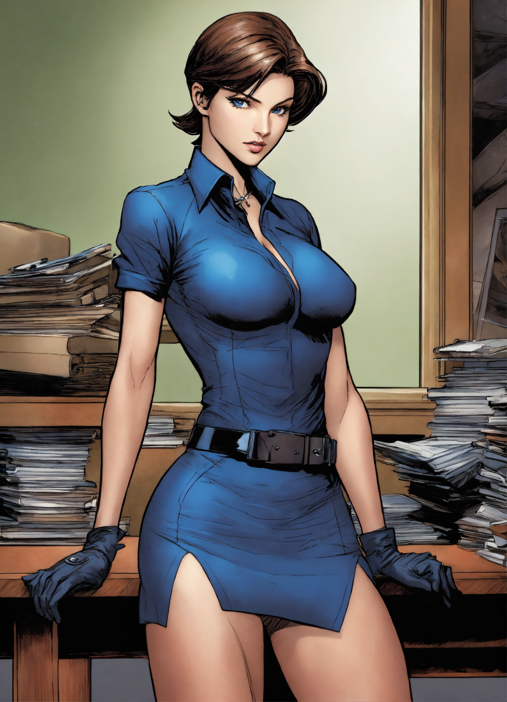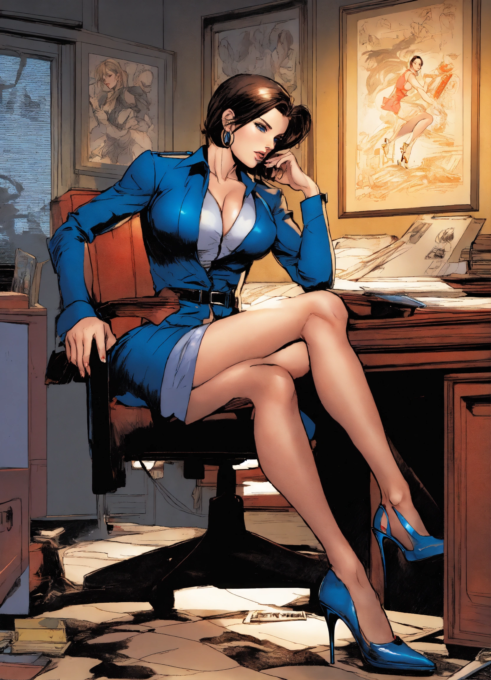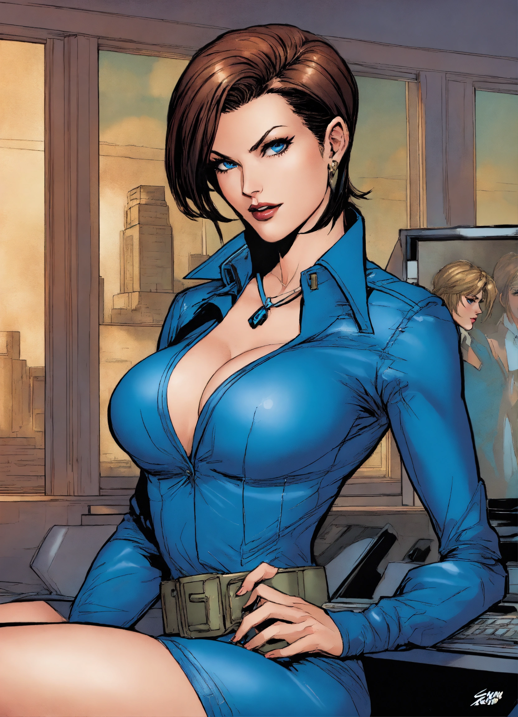 Older jill valentine as a secretary, and stiletto high heels, art by jim lee, art by j. scott campbell, dark hair