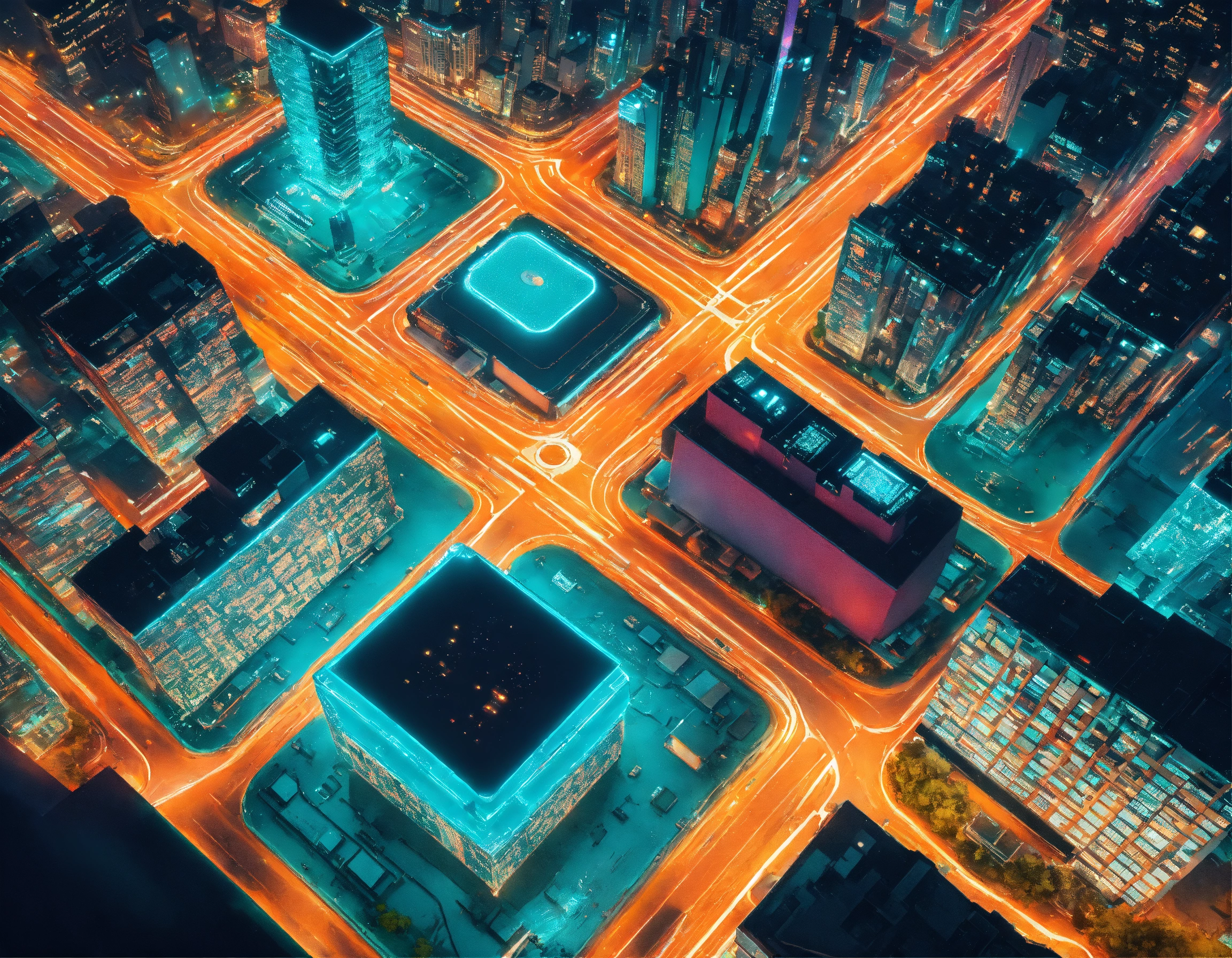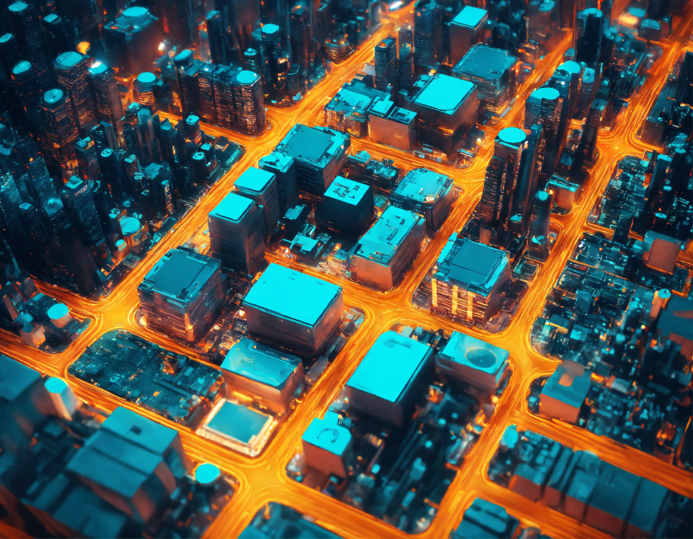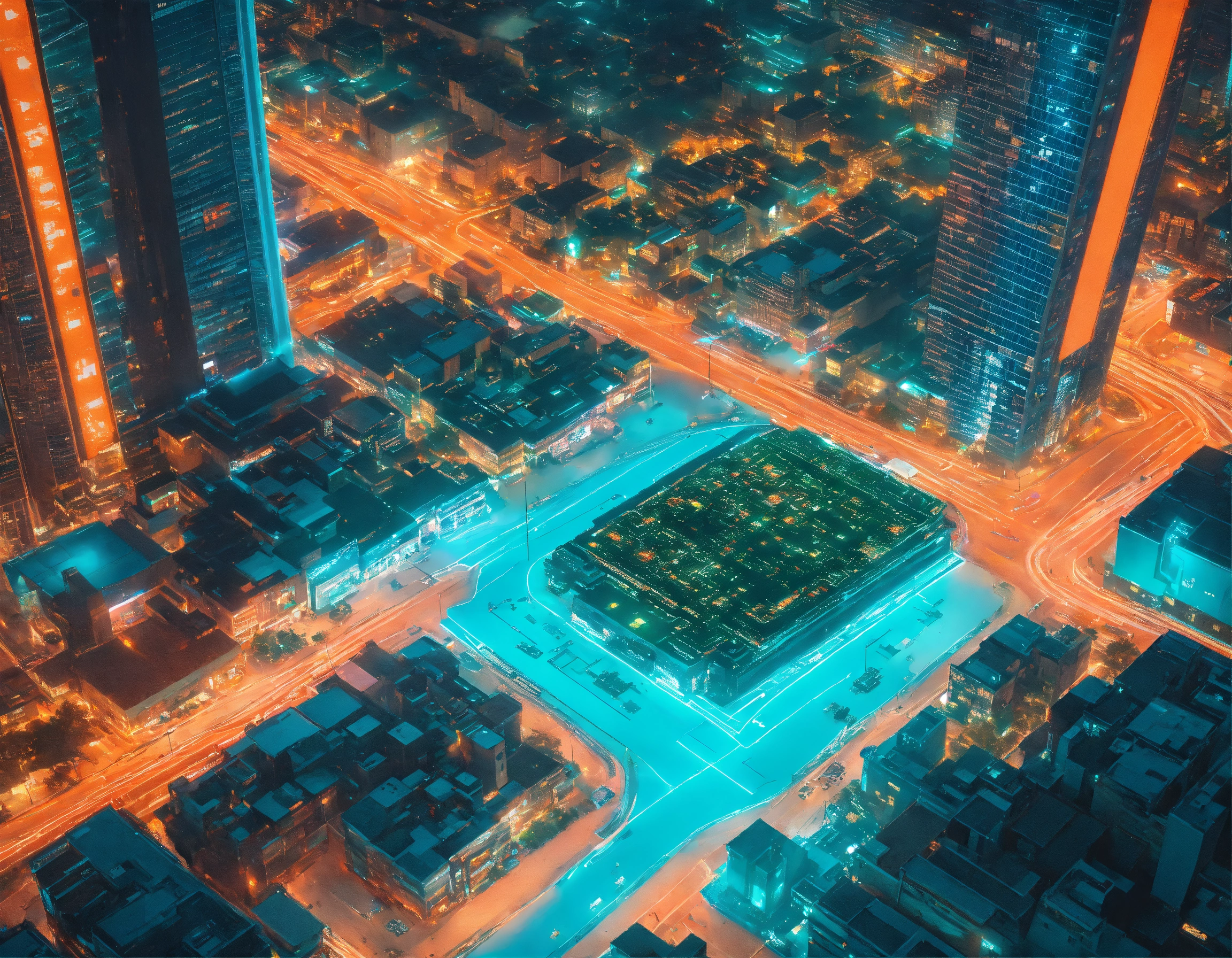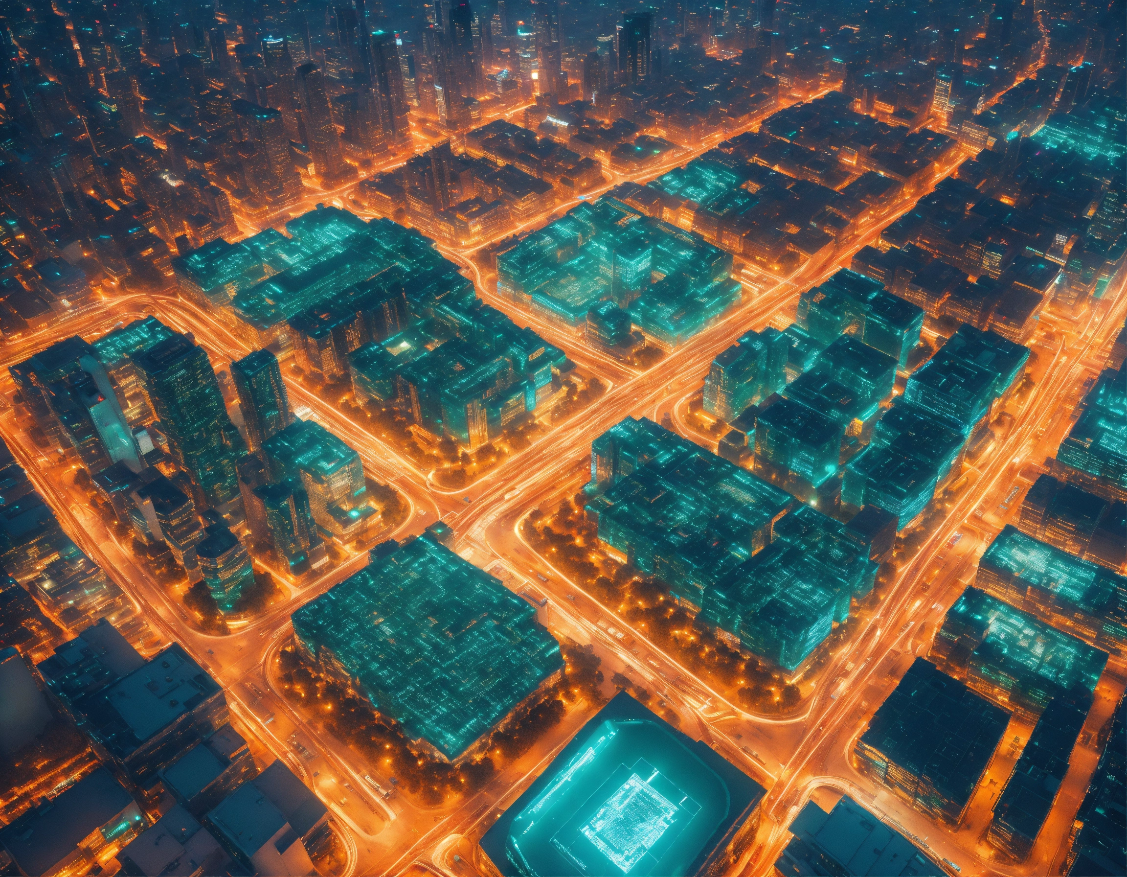 Ultra realistic straight down view of a computer motherboard from movie hackers looking like a teal colored megapolis downtown, streets lit with orange street light