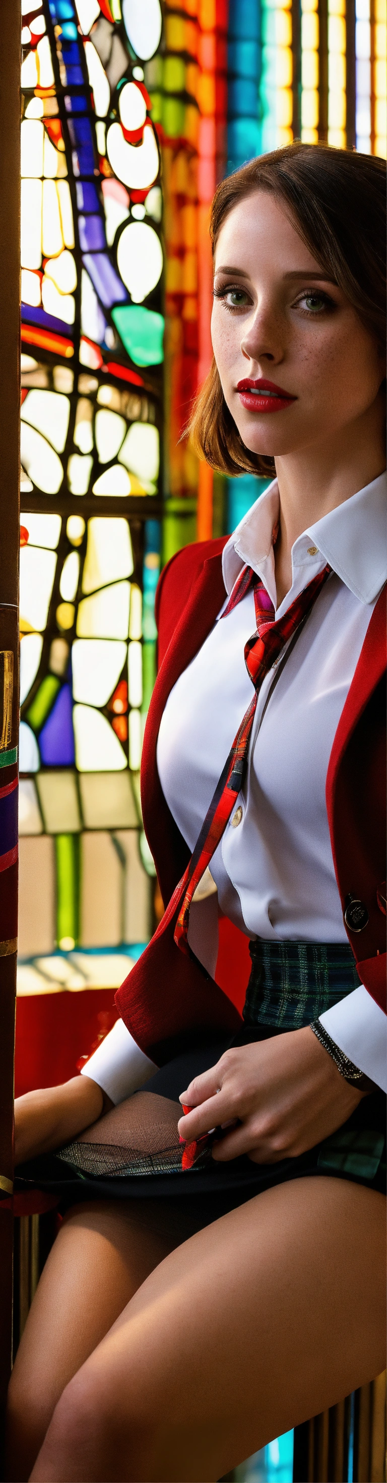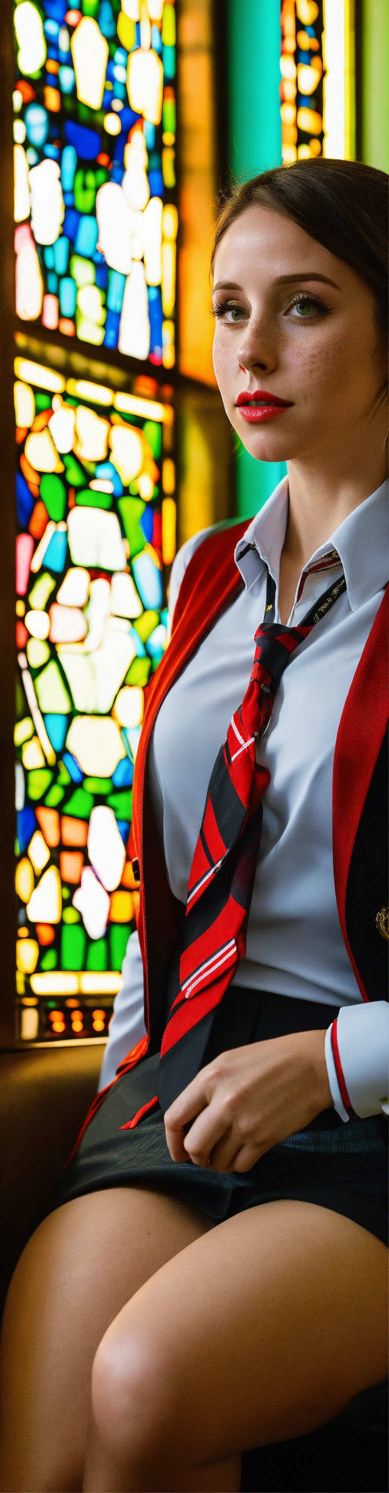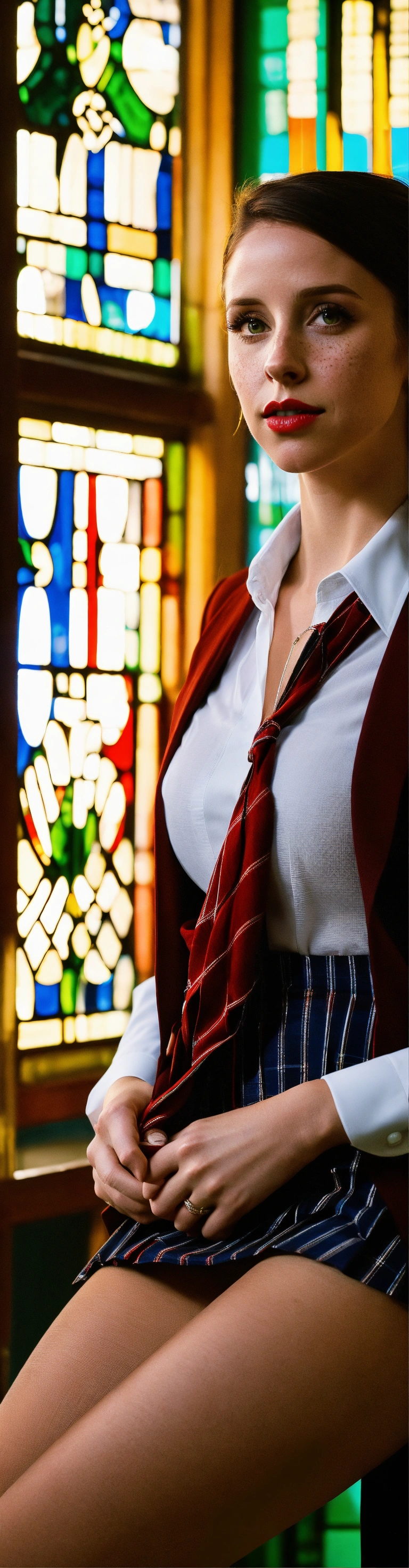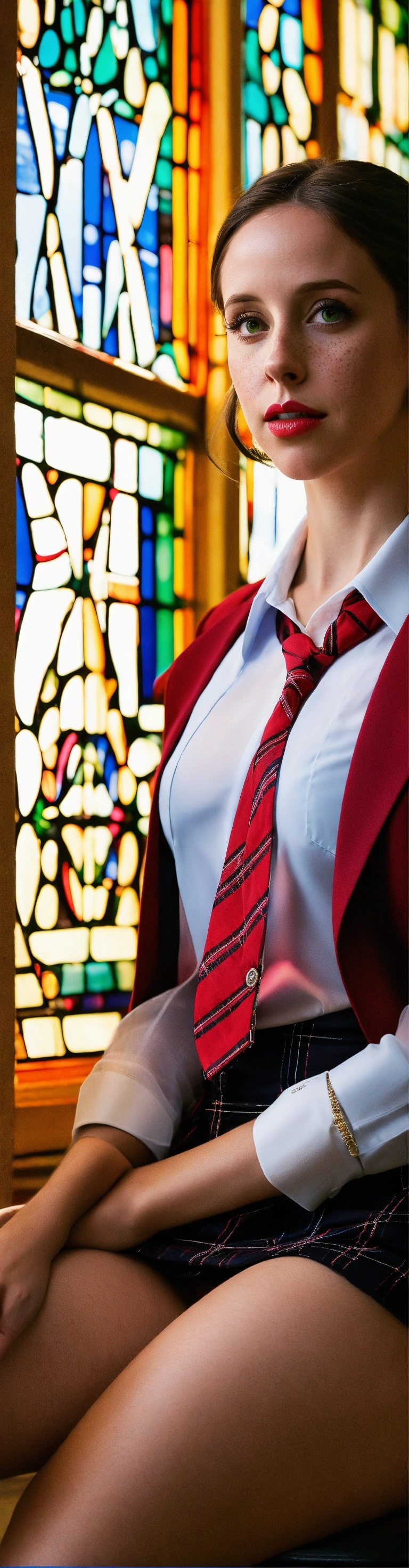 A young version of alison brie with jennifer love hewitt photographic portrait of a youthful woman with neck lengthened, she is 25 years old, greater bust, tight shirt, wide bust, she has green eyes, freckles on her face and red lipstick, form-fitting, curve-hugging, snug, tailored, close-cut, sculpted, defined, pronounced curves, shapely, casual, relaxed, laid-back, undone, informal, nonchalant, easygoing, disheveled, carefree, unbuttoned, unstructured, effortless, she wears a black suit jacket with a white shirt and black tie. her head is triangle shaped, preppy, elite, well-dressed, polished, sophisticated, form-fitting shirt, pleated, knee-length, a-line, high-waisted, pencil skirt, hosiery, knee-high socks, thigh-high stockings, nylon, opaque, sheer, tartan, uniformed, dress code, academic attire, preppy, classic, traditional, schoolgirl.