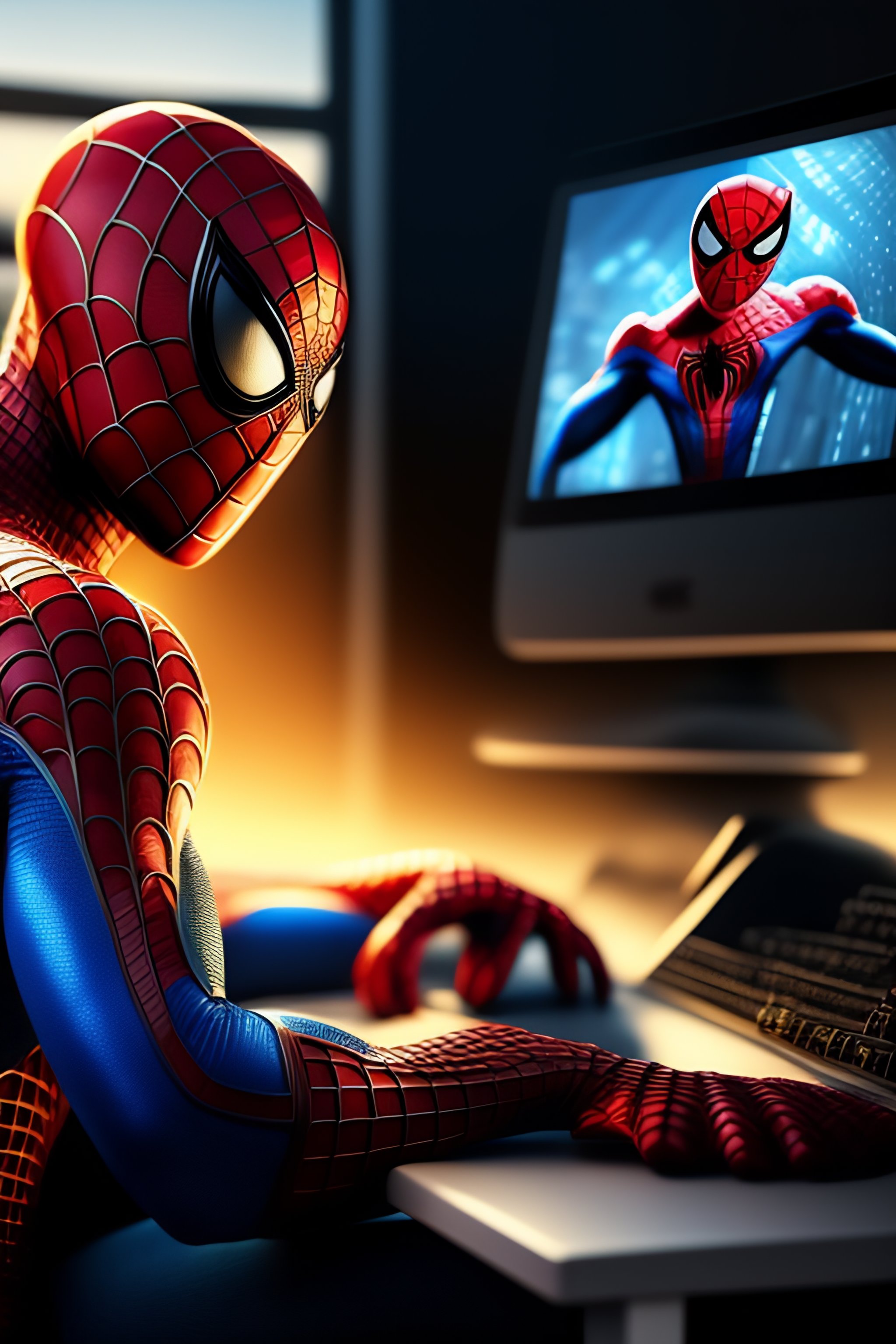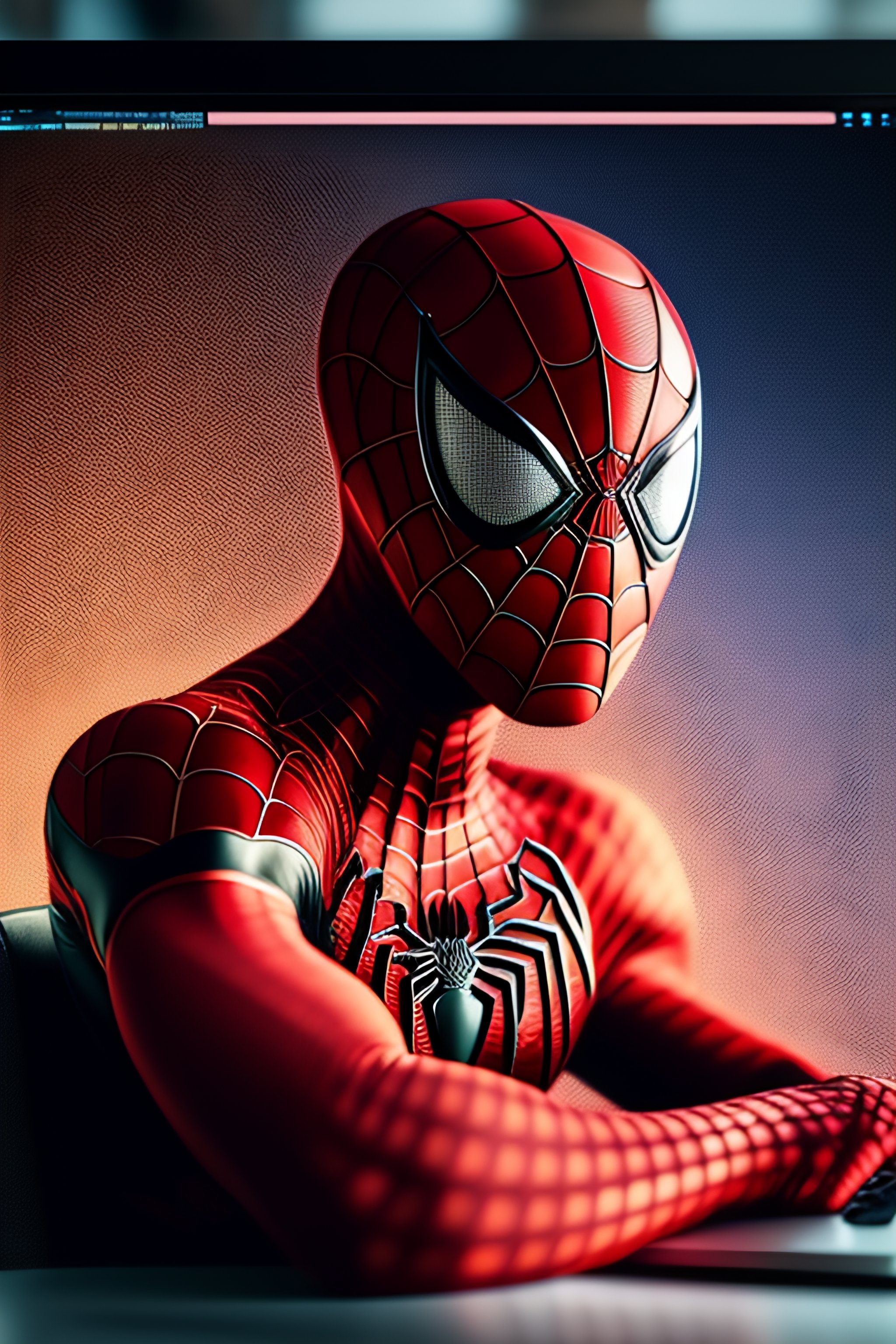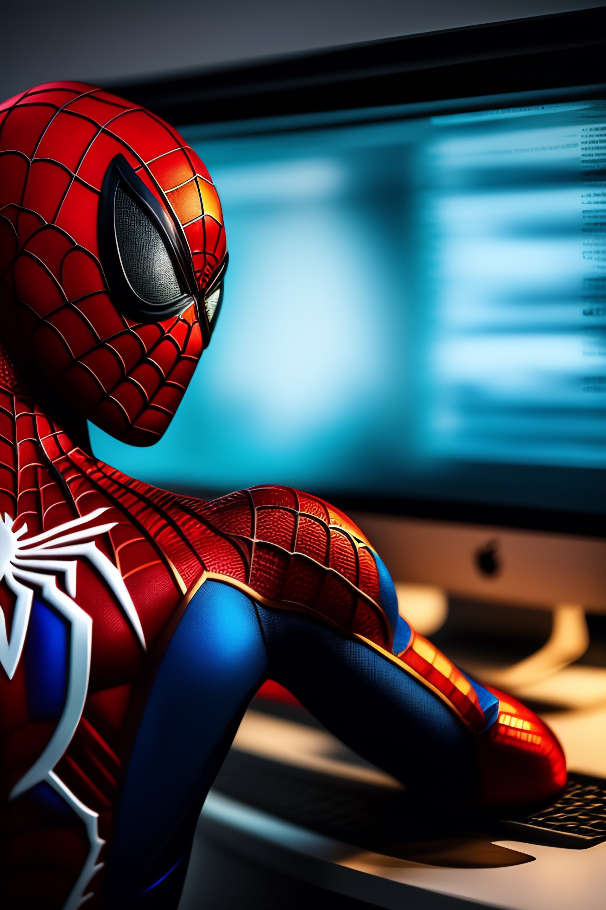 Digital art image of a spiderman-look-alike sitting in front of a computer, on the computer screen is an image of spiderweb as ascii art
